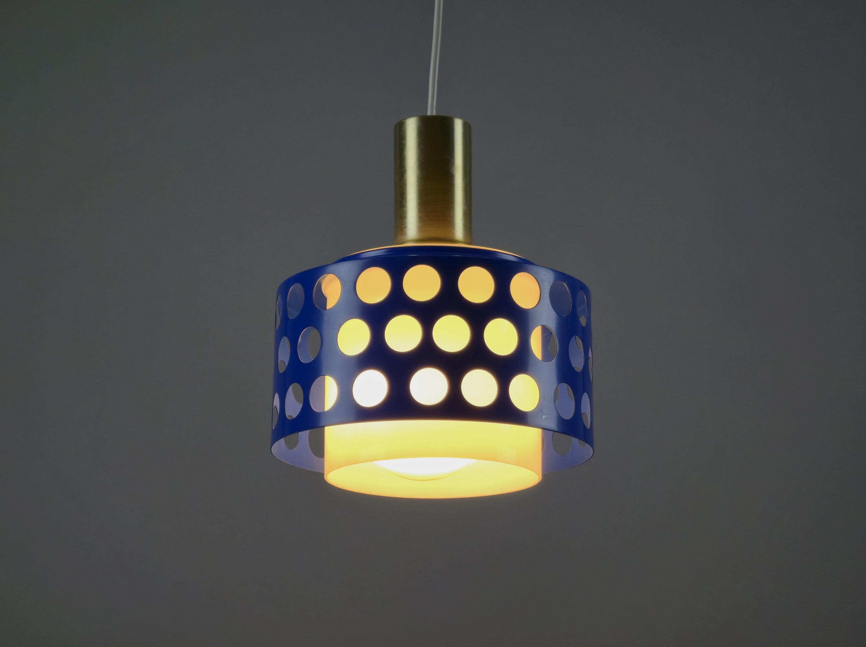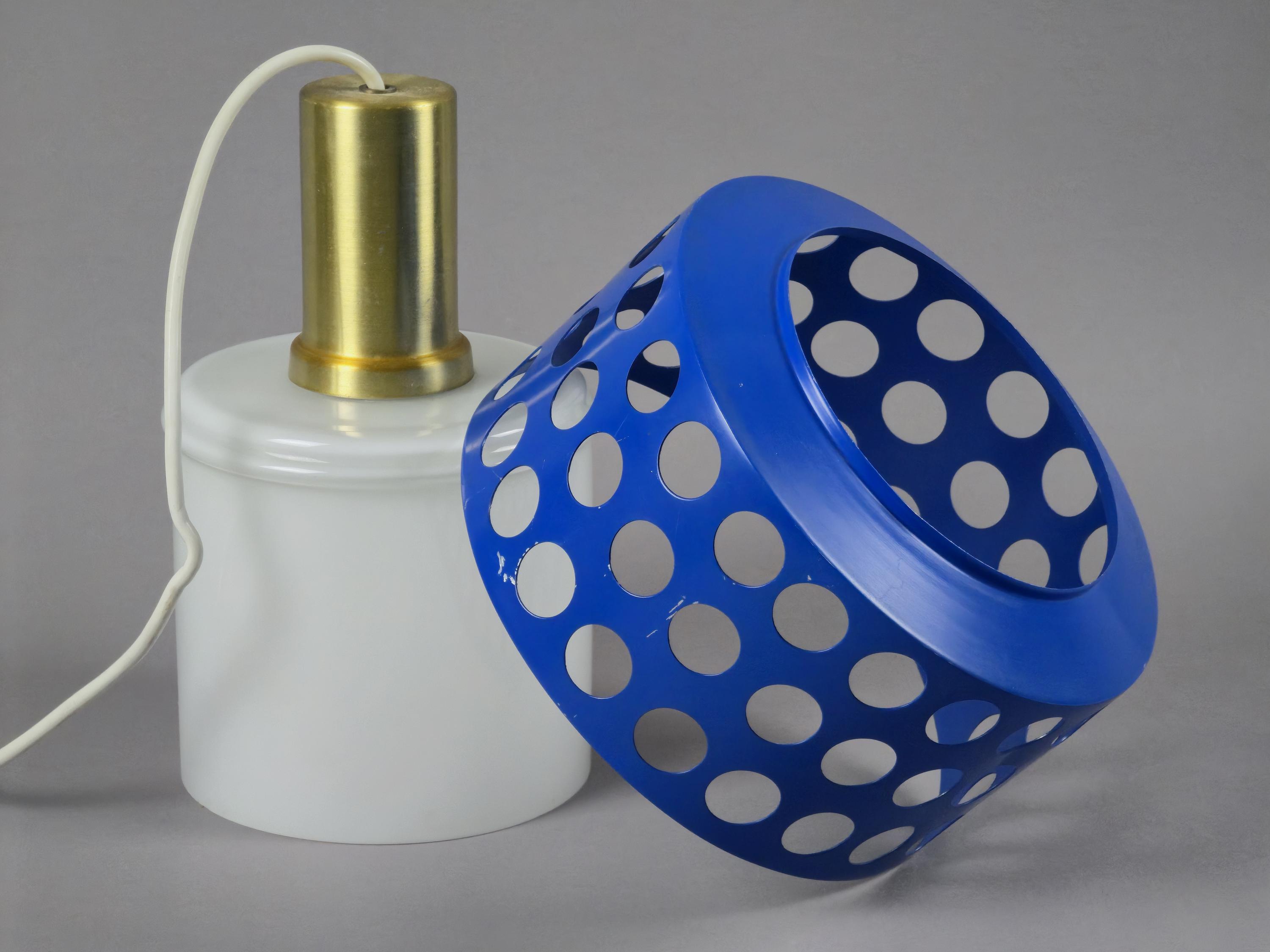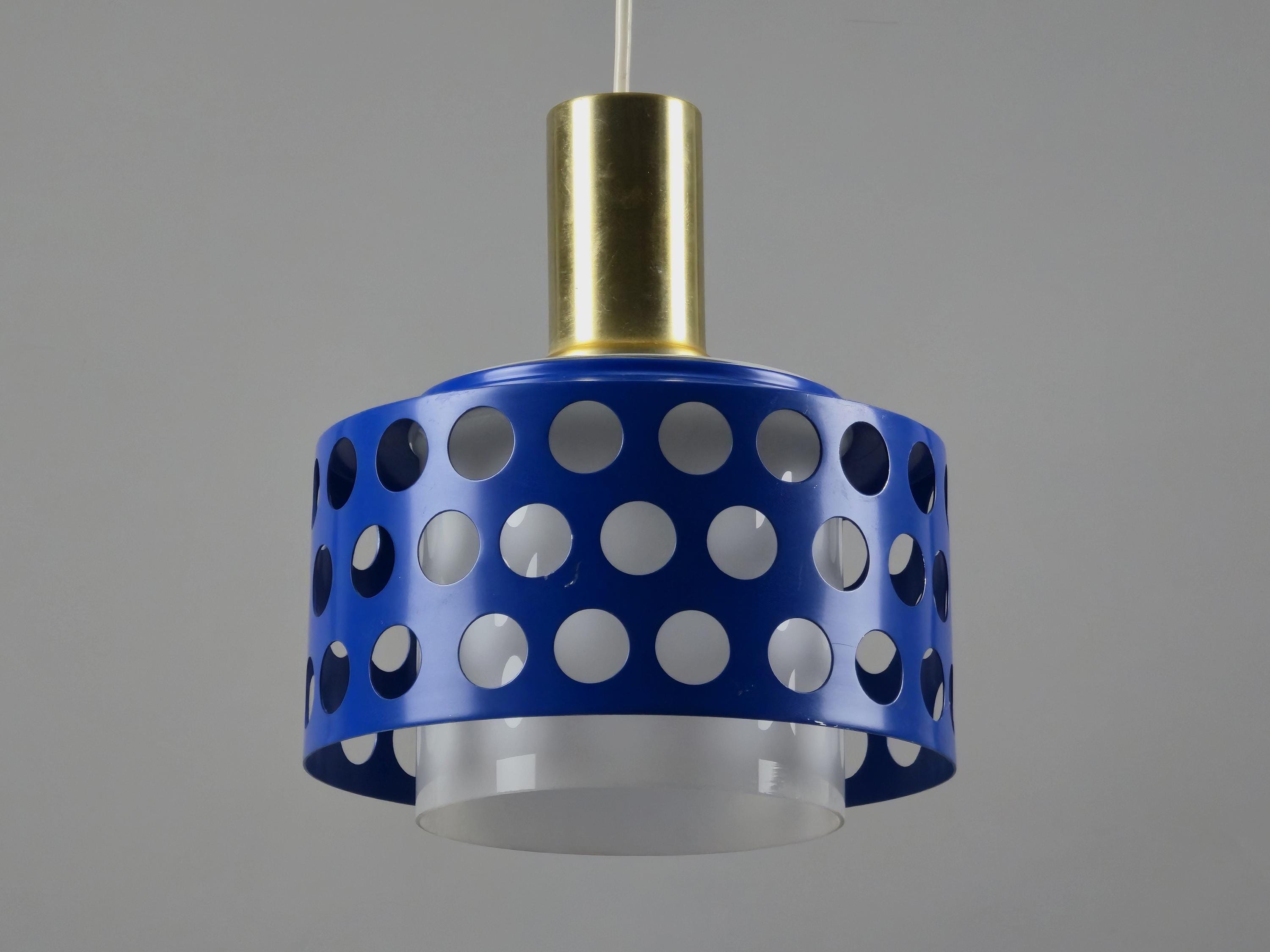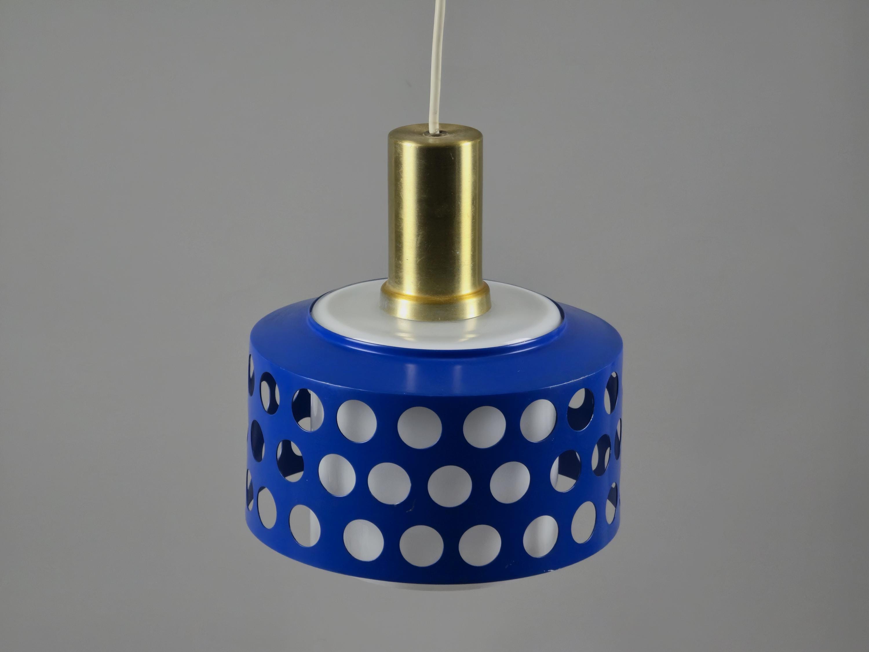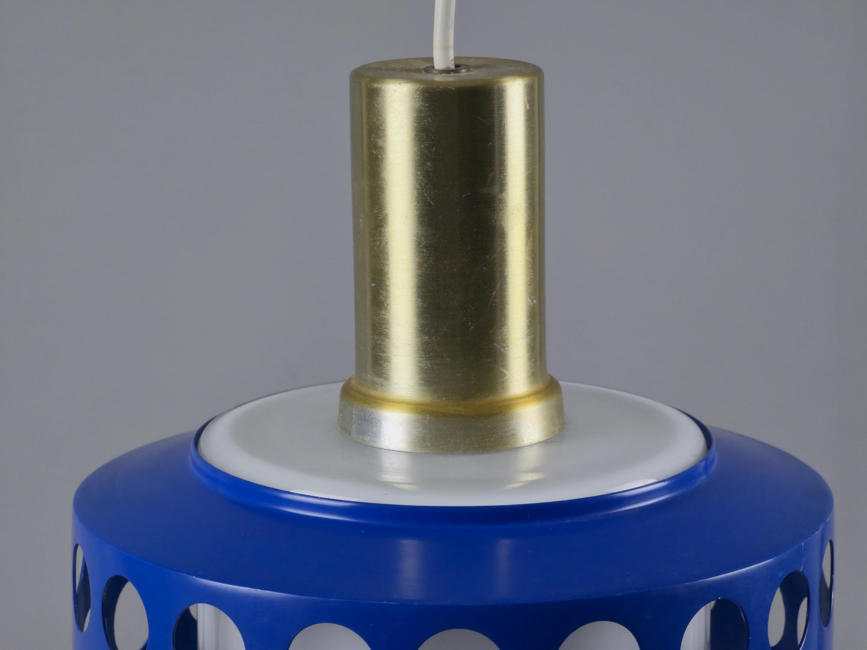 A true icon from Finland, vintage pendant lamp by Kai Finnmark (Kai Ruokonen) for Lynx, Finland. This iconic piece features a deep blue enameled metal shade with a geometric cut-out pattern, creating a dramatic interplay of light and shadow when illuminated.
