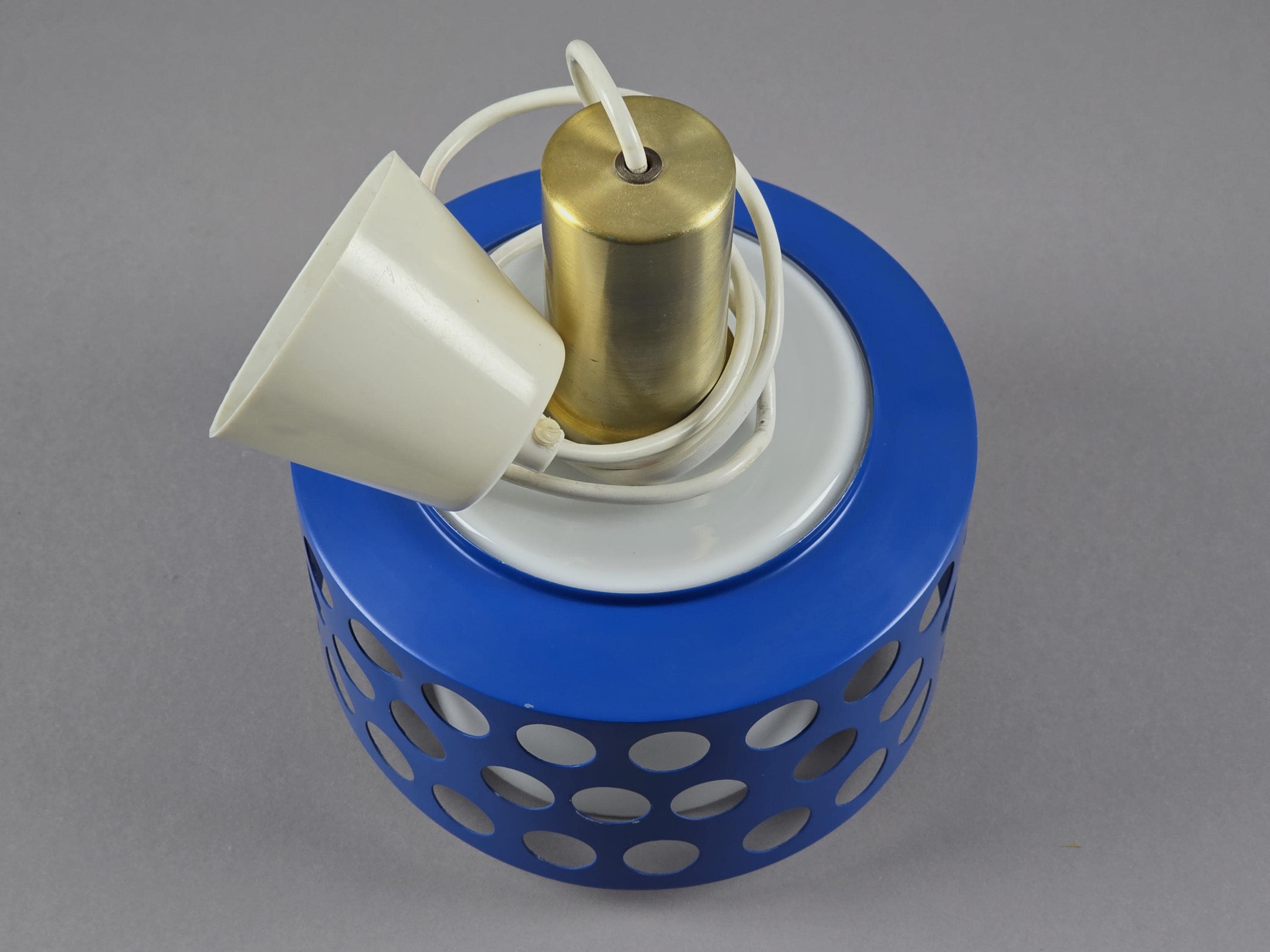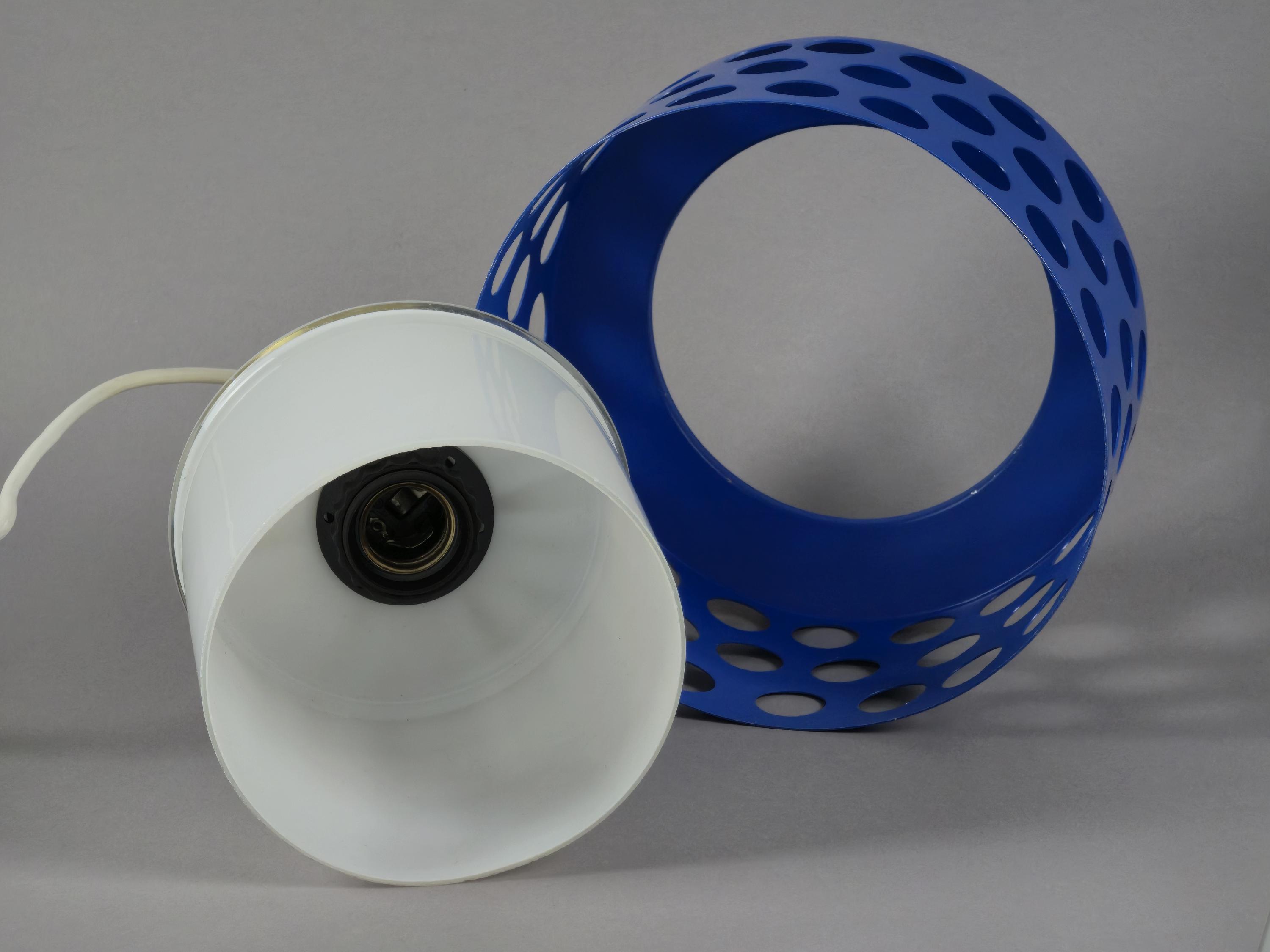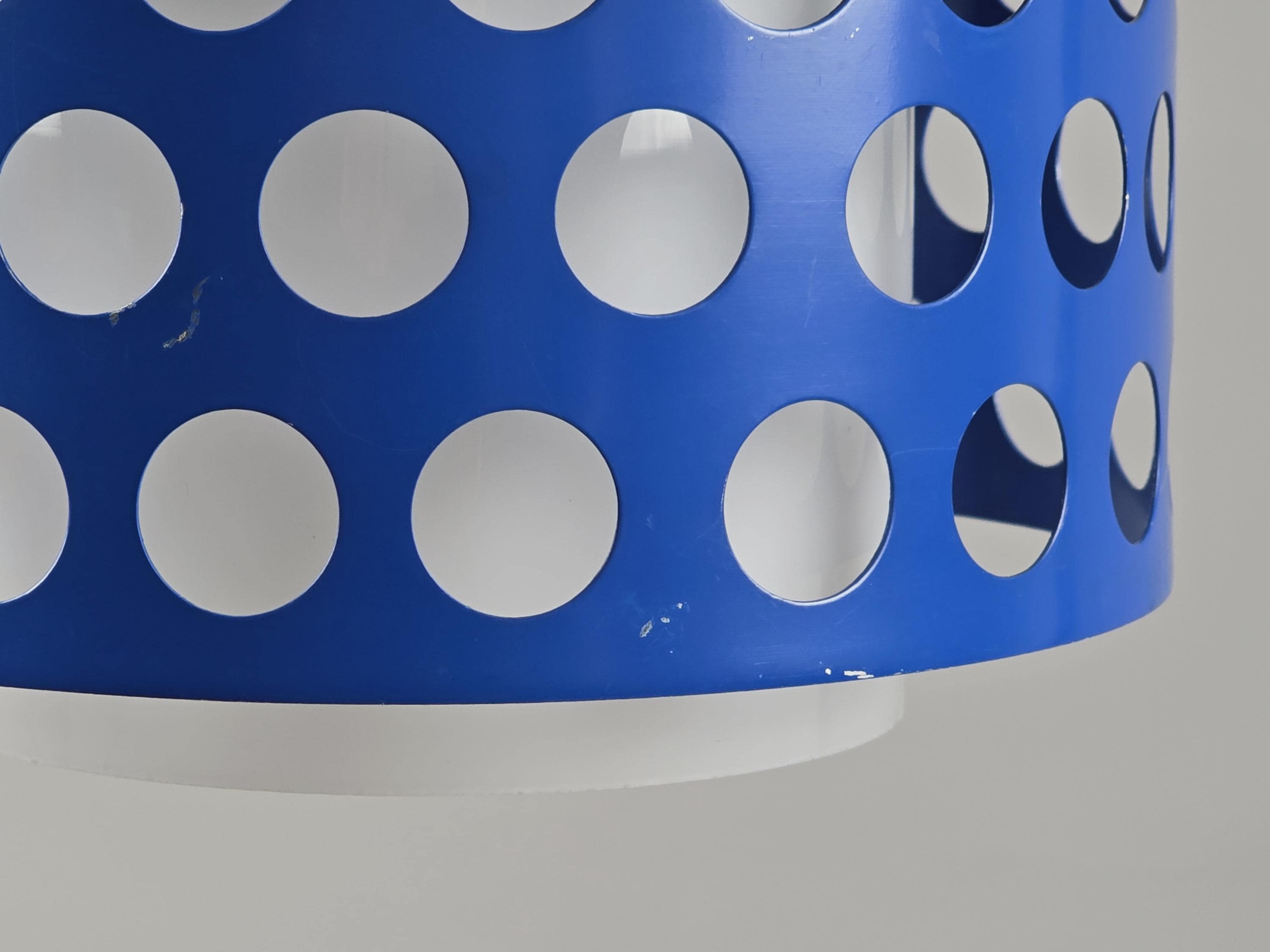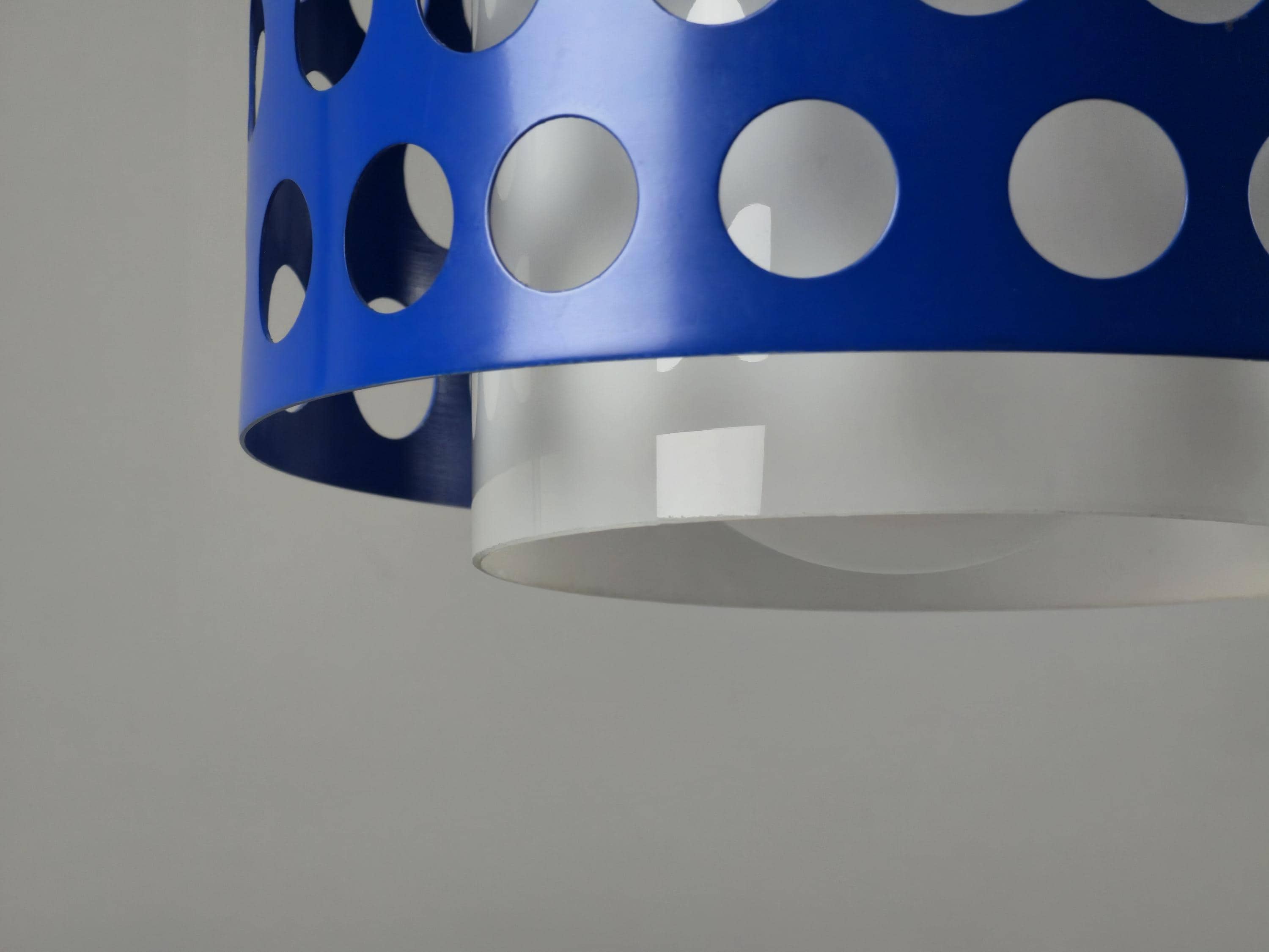 A true icon from Finland, vintage pendant lamp by Kai Finnmark (Kai Ruokonen) for Lynx, Finland. This iconic piece features a deep blue enameled metal shade with a geometric cut-out pattern, creating a dramatic interplay of light and shadow when illuminated.