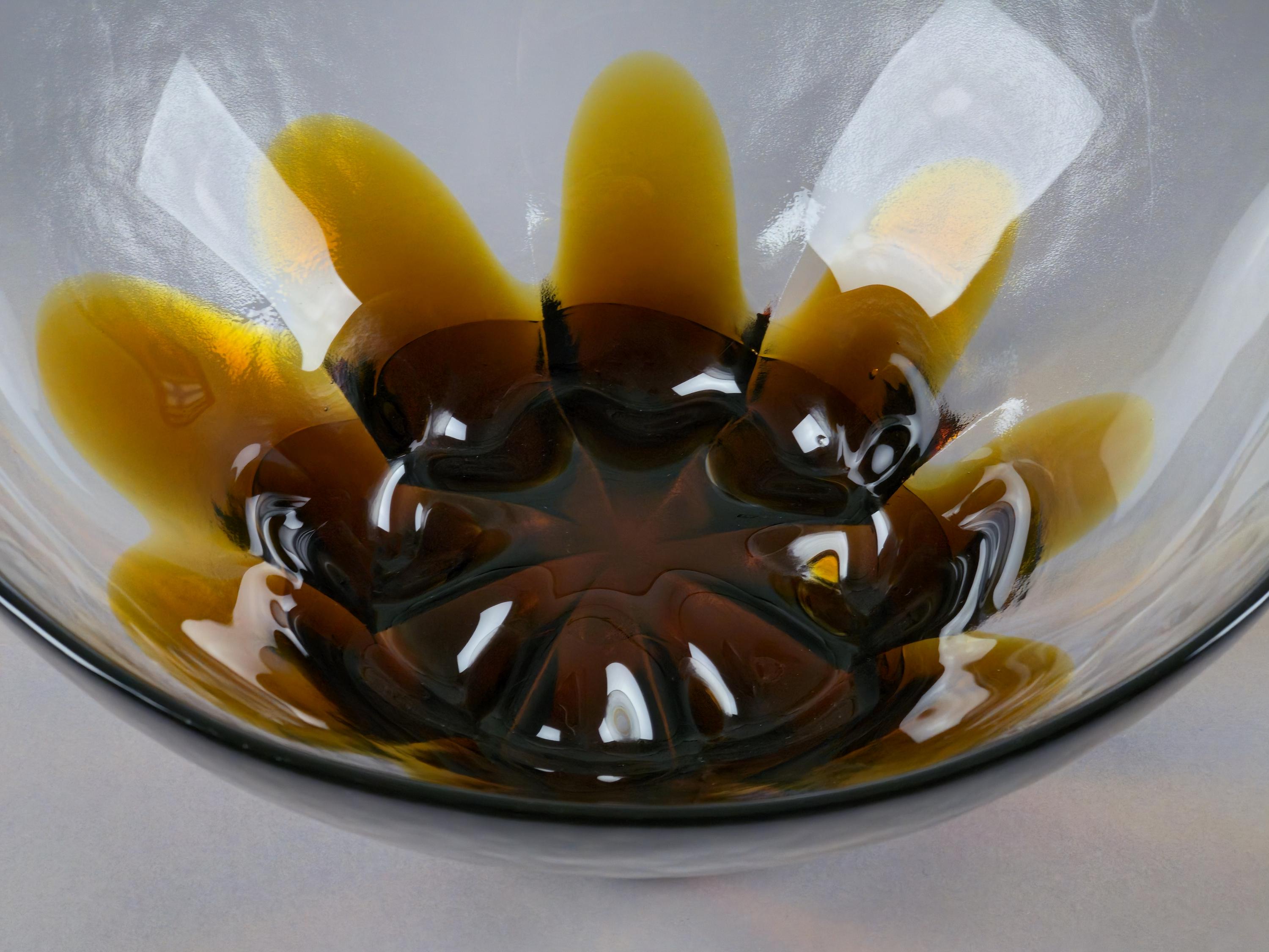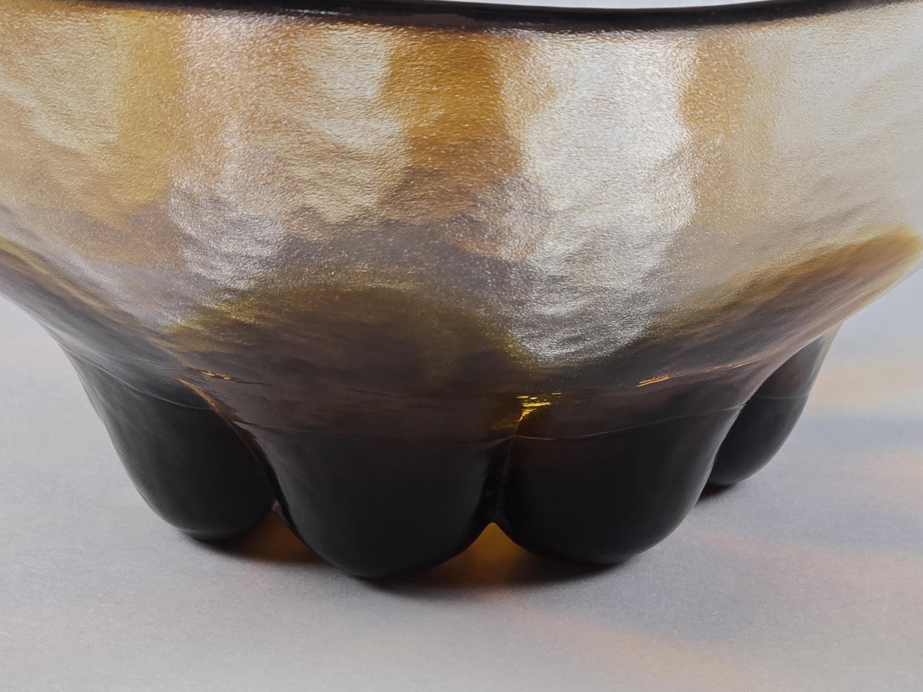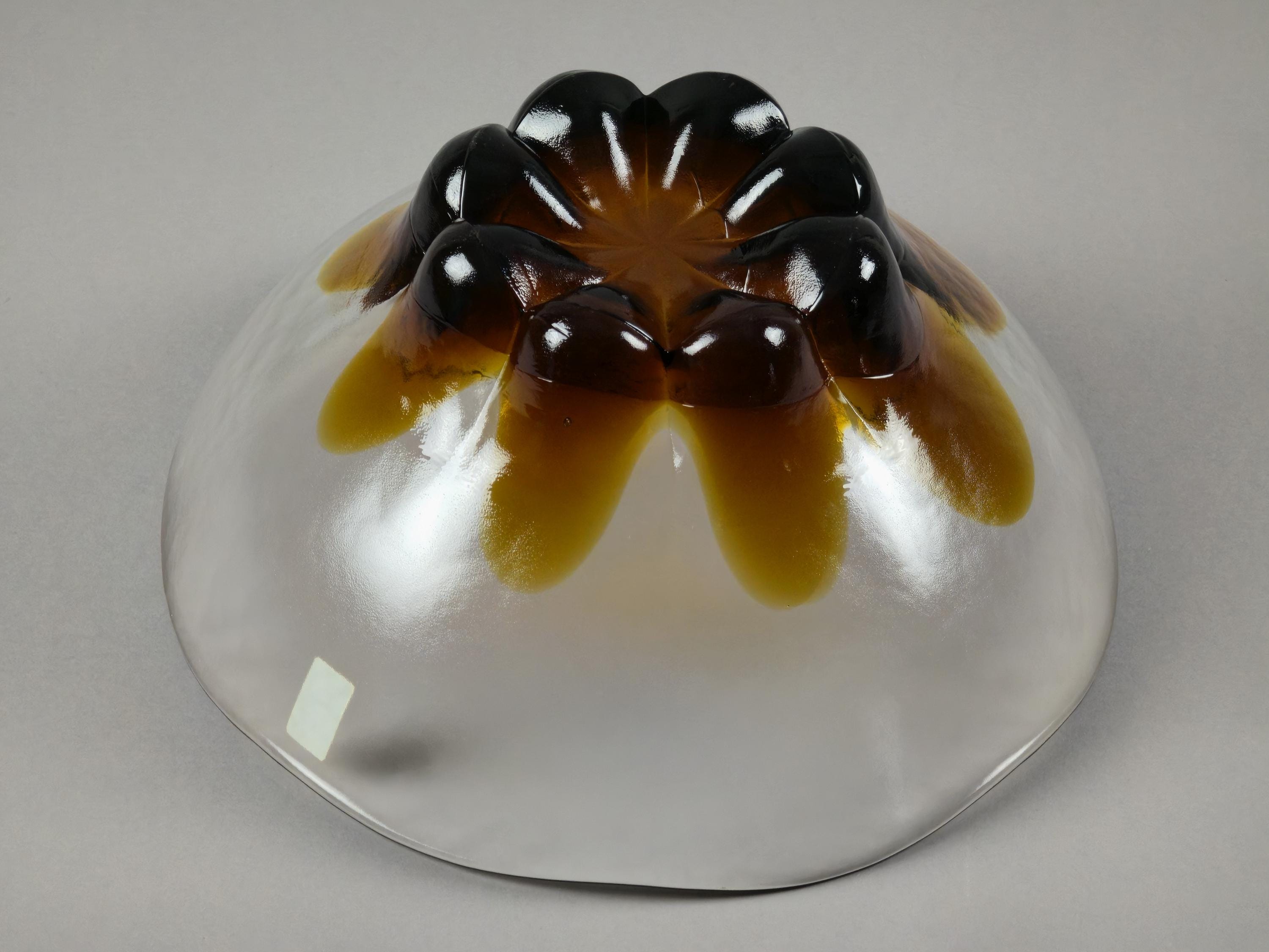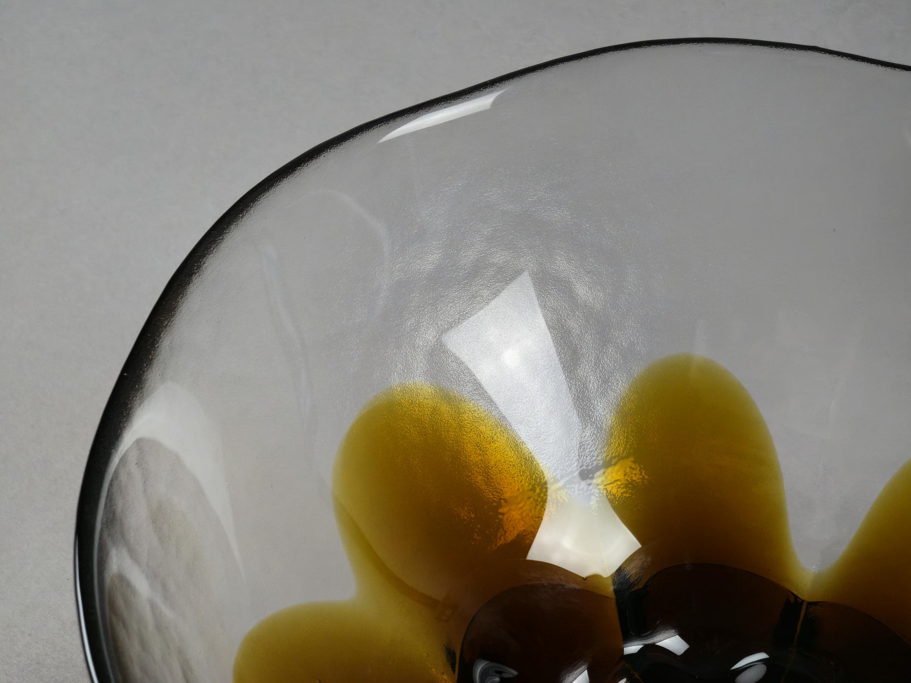 Stunning 1970s vintage art glass bowl by Humppila Lasi Finland. The design features a deep amber hue that transitions to clear glass towards the rim. It has a scalloped, wavy rim and a heavily fluted or "bubbly" textured base that catches the light.