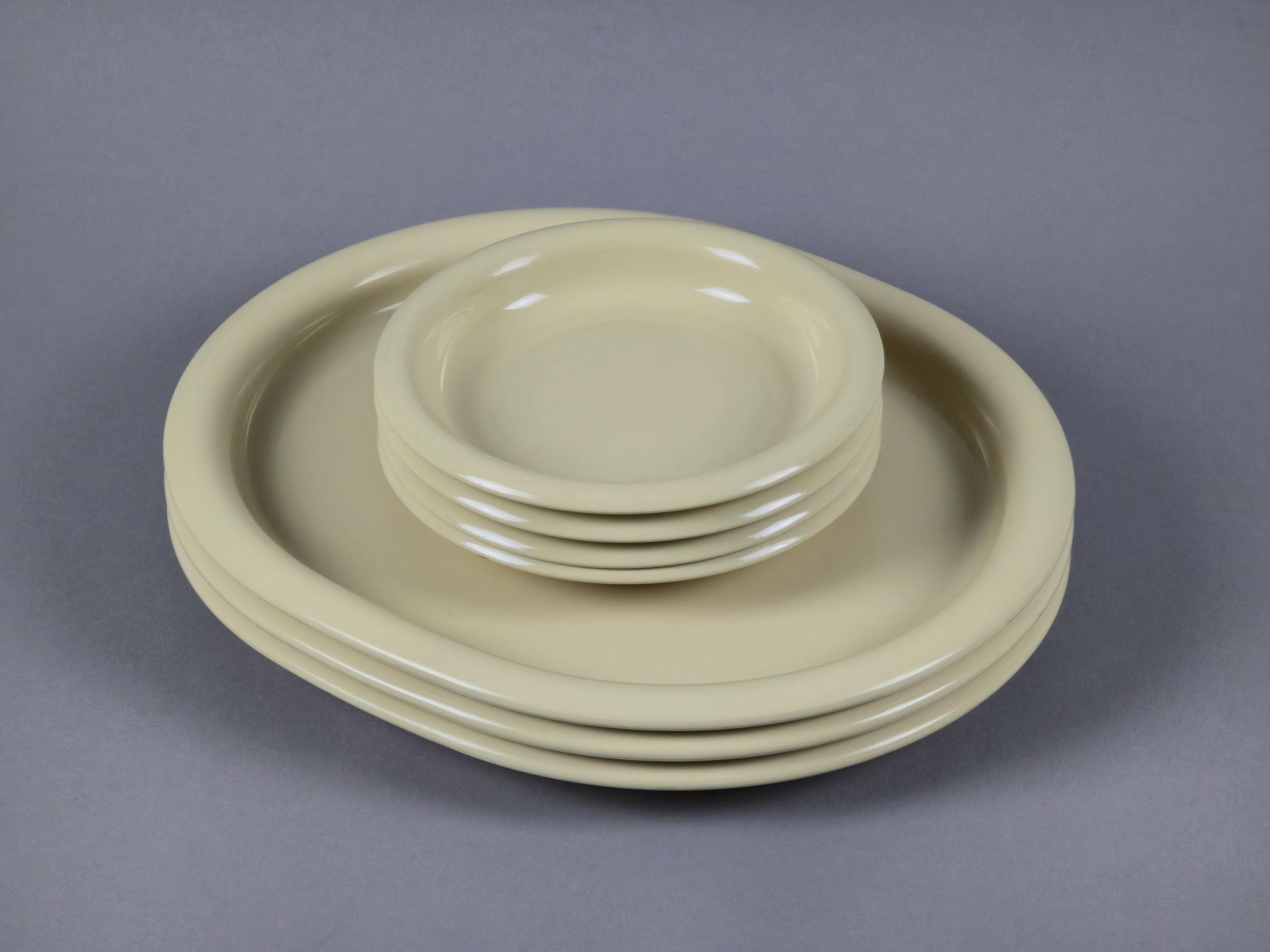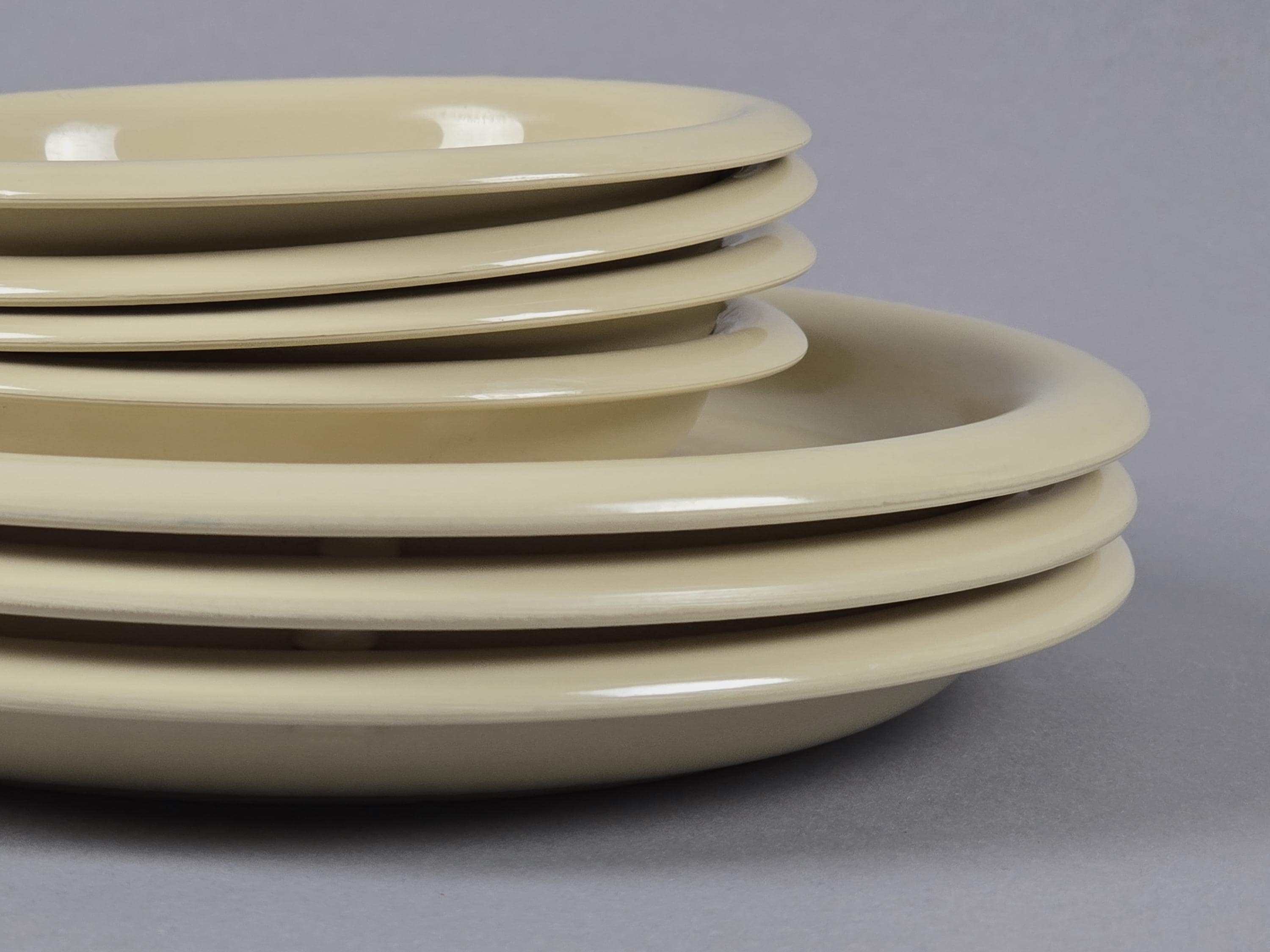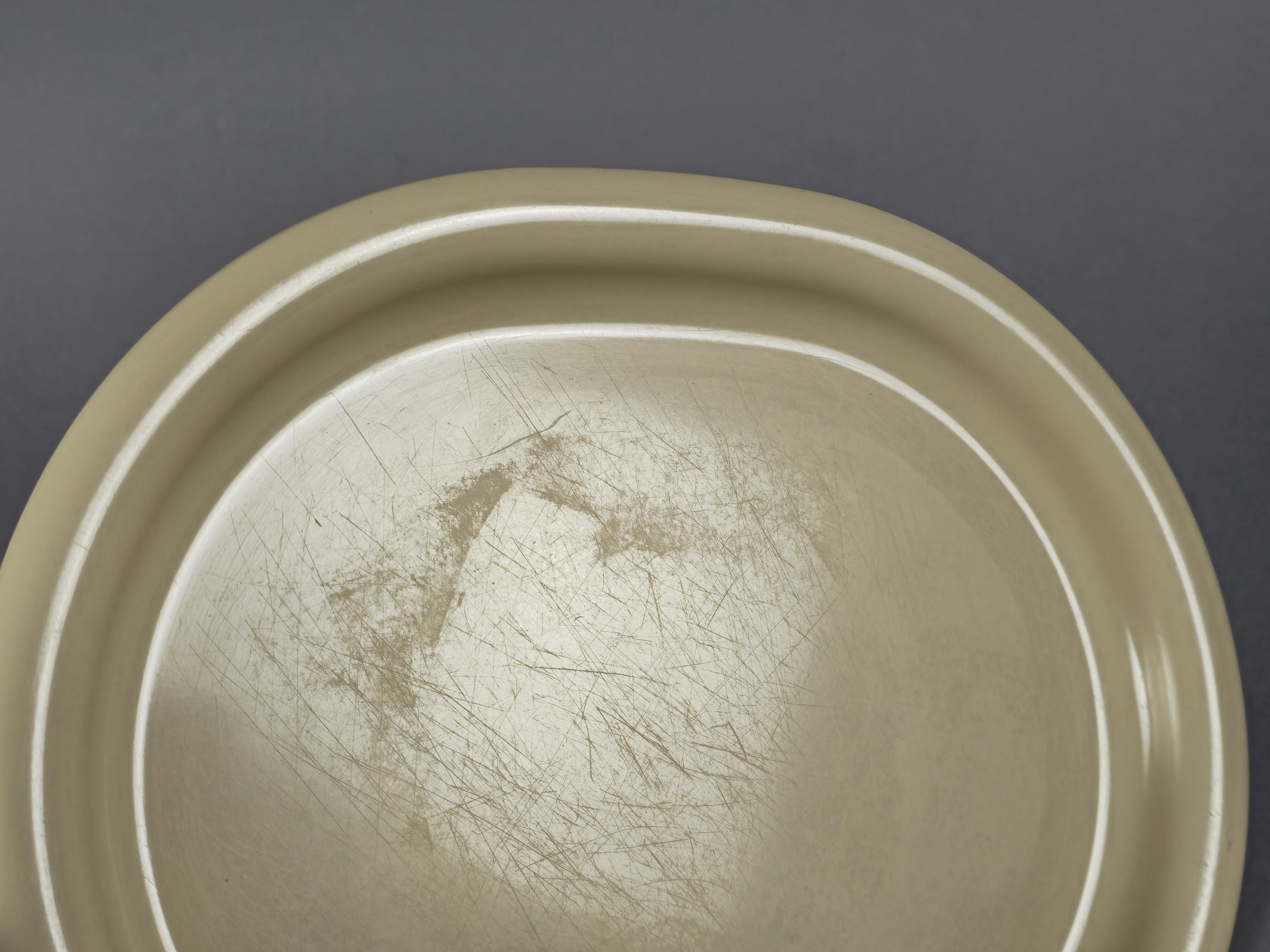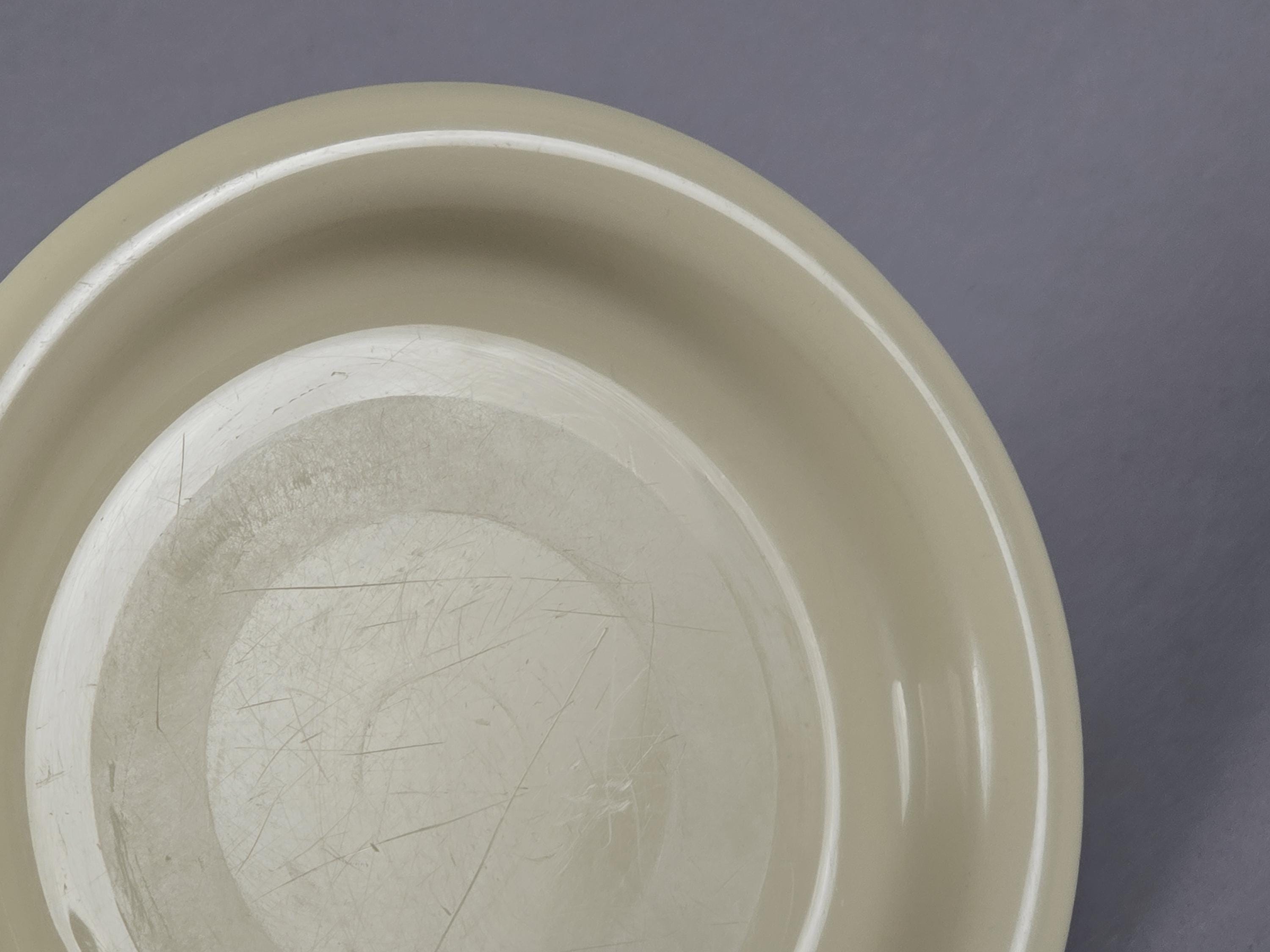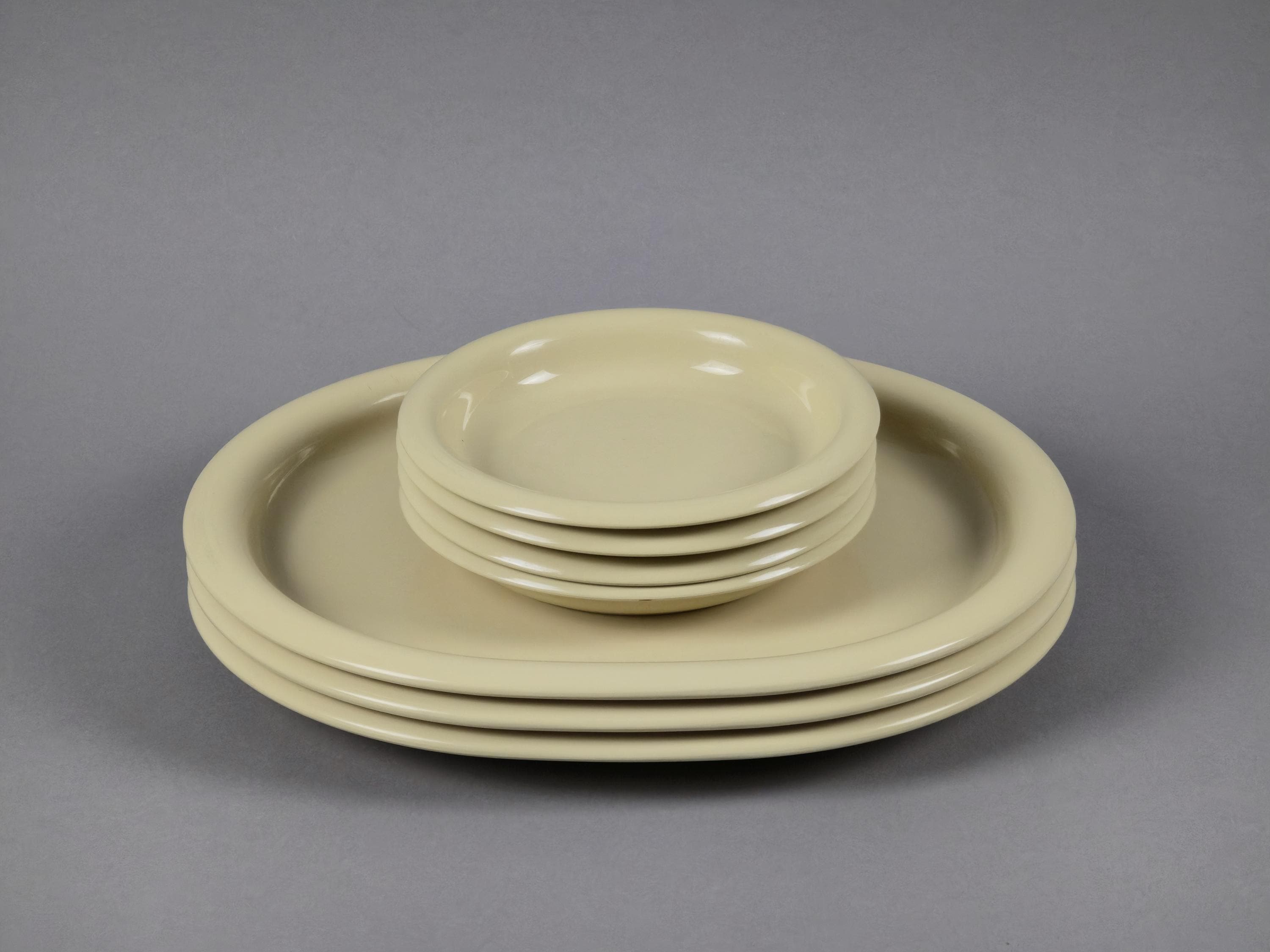 Vintage 1970s set of 7 beige melamine plates by MF Sarvis Finland.