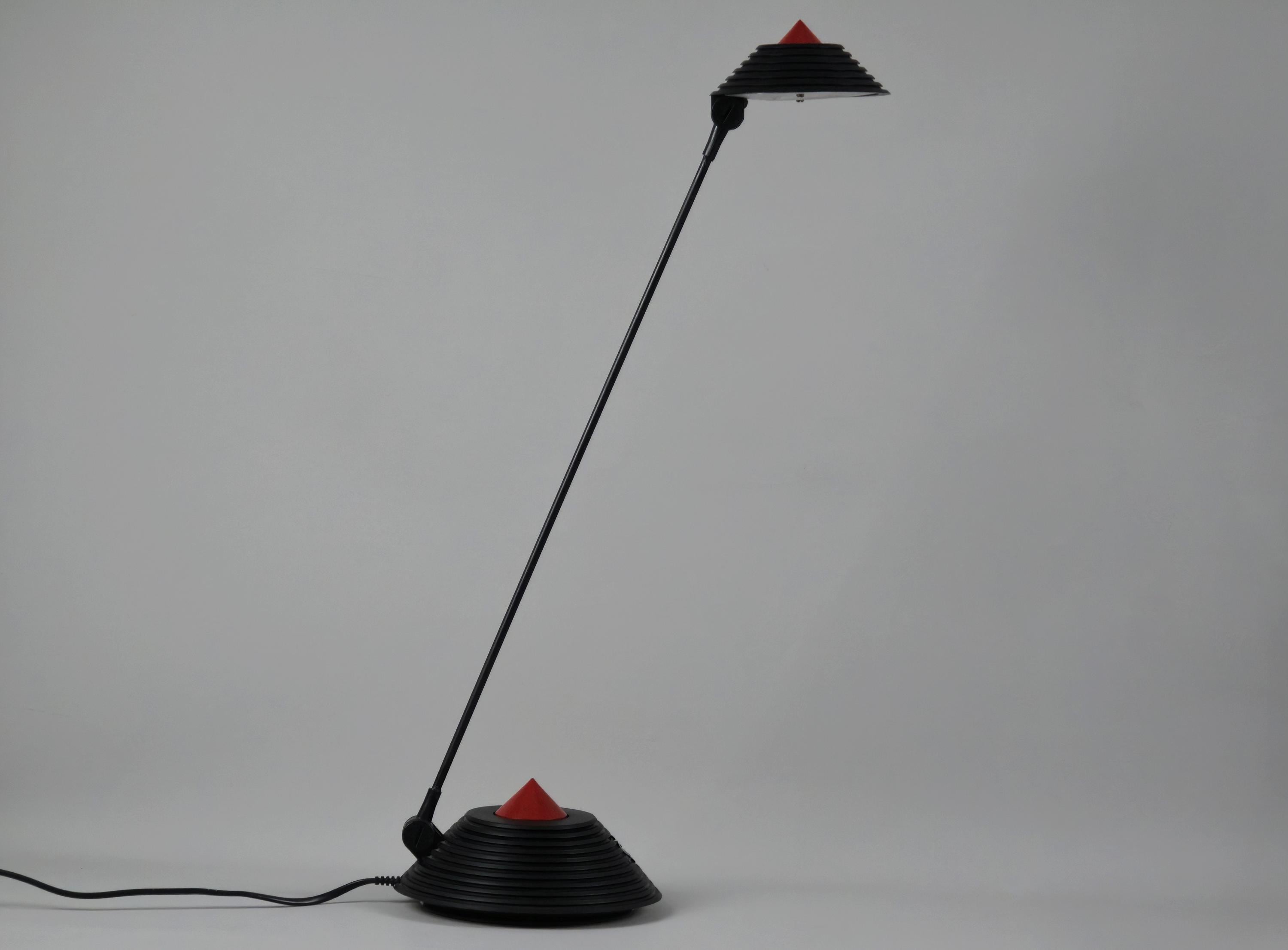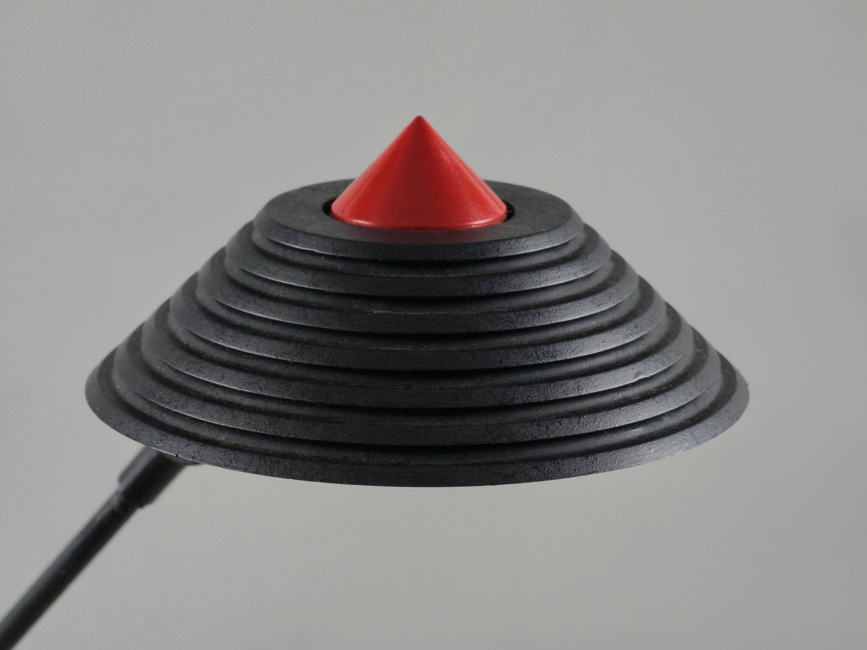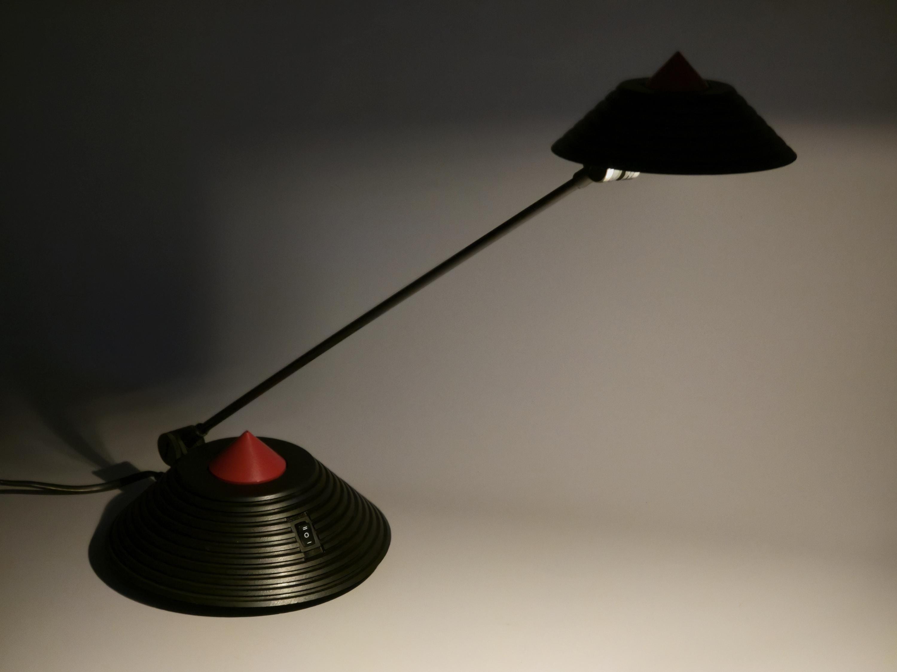 Vintage 1980s Memphis Design black plastic desk halogen desk lamp by Herst, Germany. The lamp features a black conical base and an adjustable, thin black rod leading to a black conical lampshade. It is accented with red plastic details on the base and head. It uses a low-voltage G5 halogen bulb with a transformer built into the base. The head rotates, and the arm can be angled.