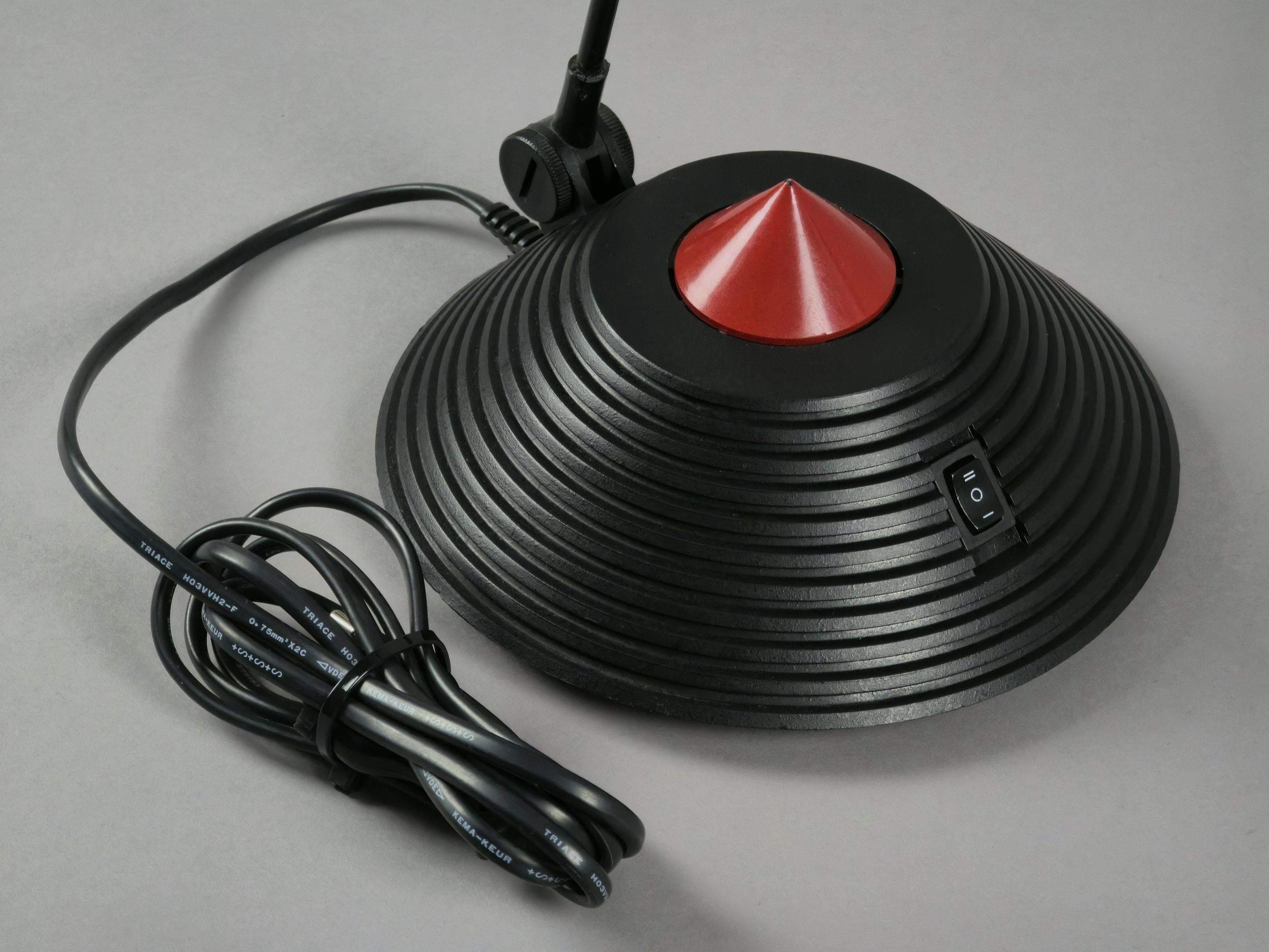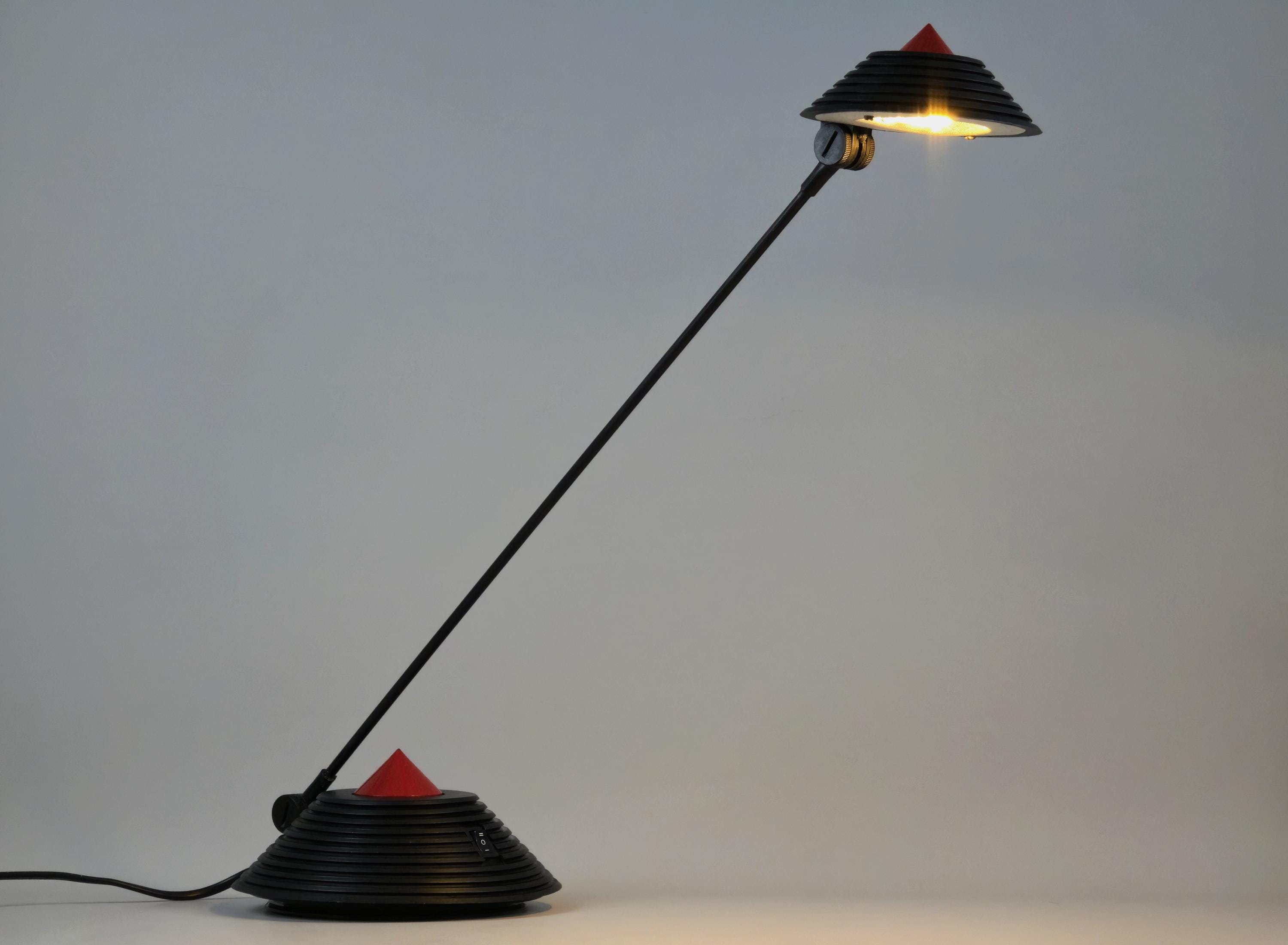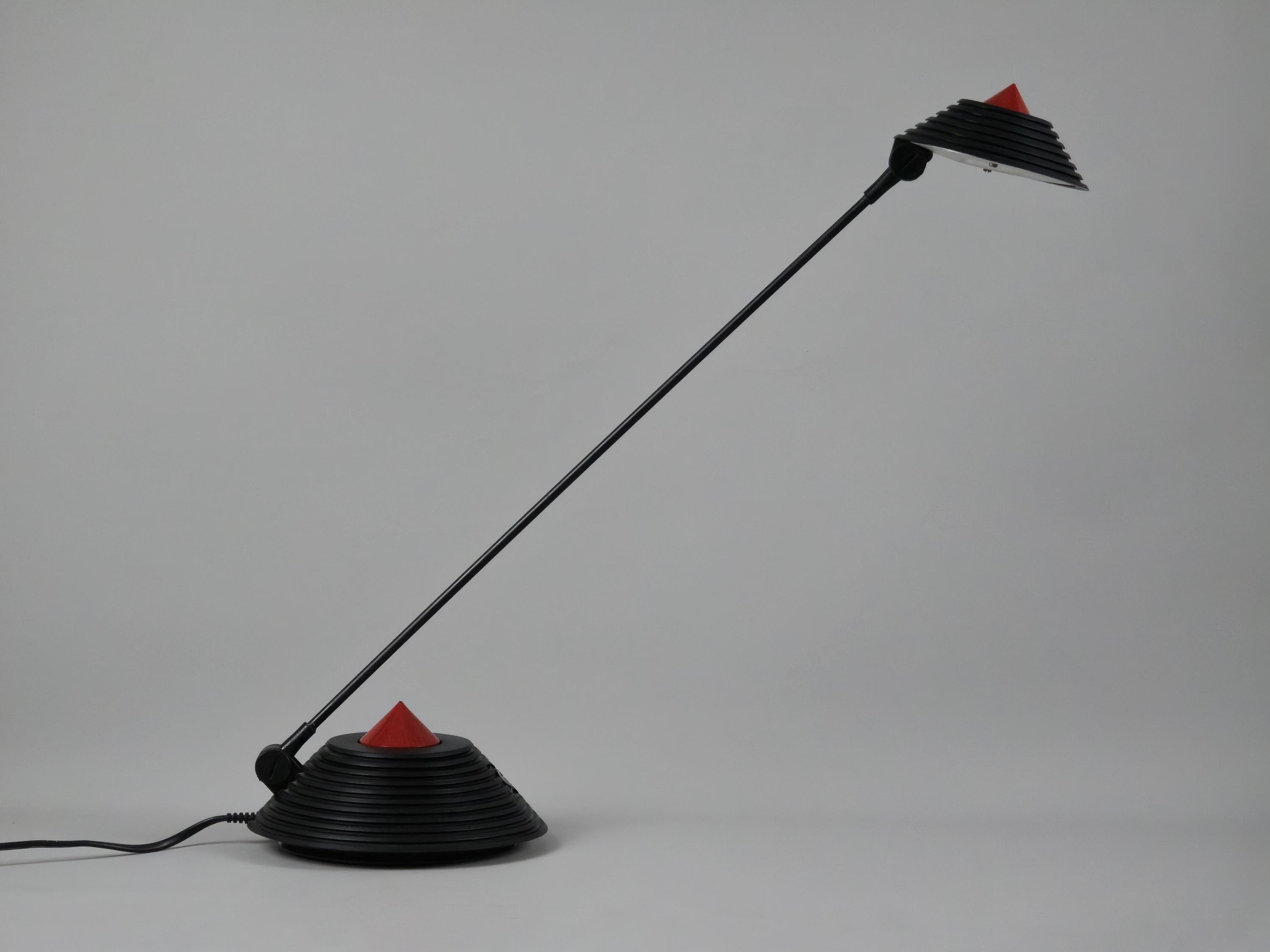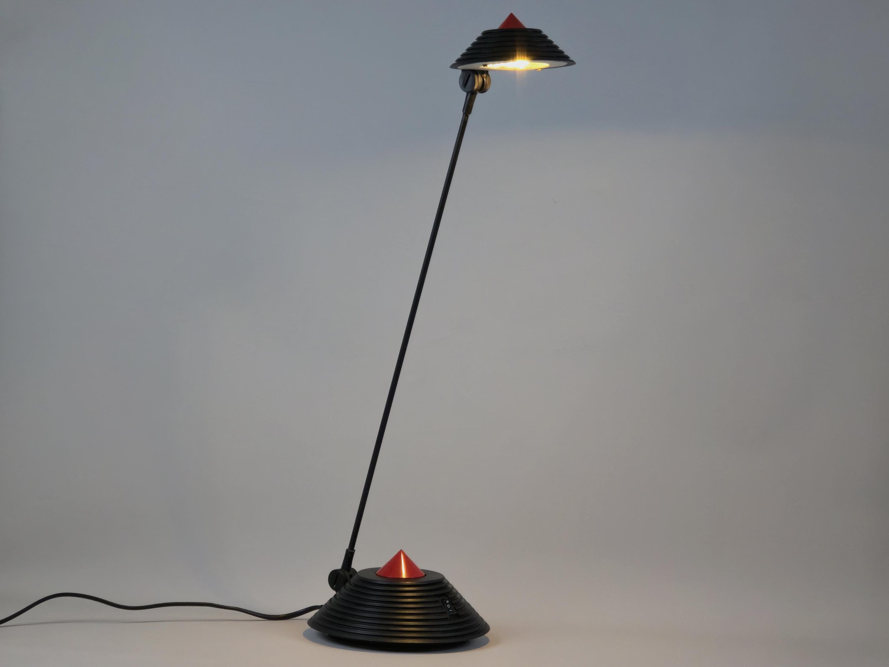 Vintage 1980s Memphis Design black plastic desk halogen desk lamp by Herst, Germany. The lamp features a black conical base and an adjustable, thin black rod leading to a black conical lampshade. It is accented with red plastic details on the base and head. It uses a low-voltage G5 halogen bulb with a transformer built into the base. The head rotates, and the arm can be angled.