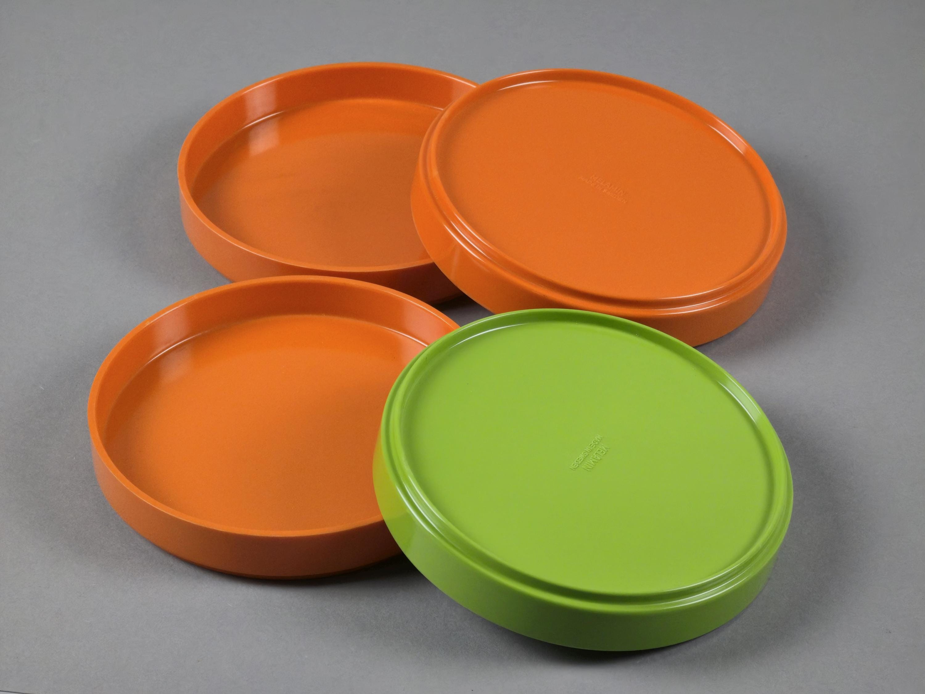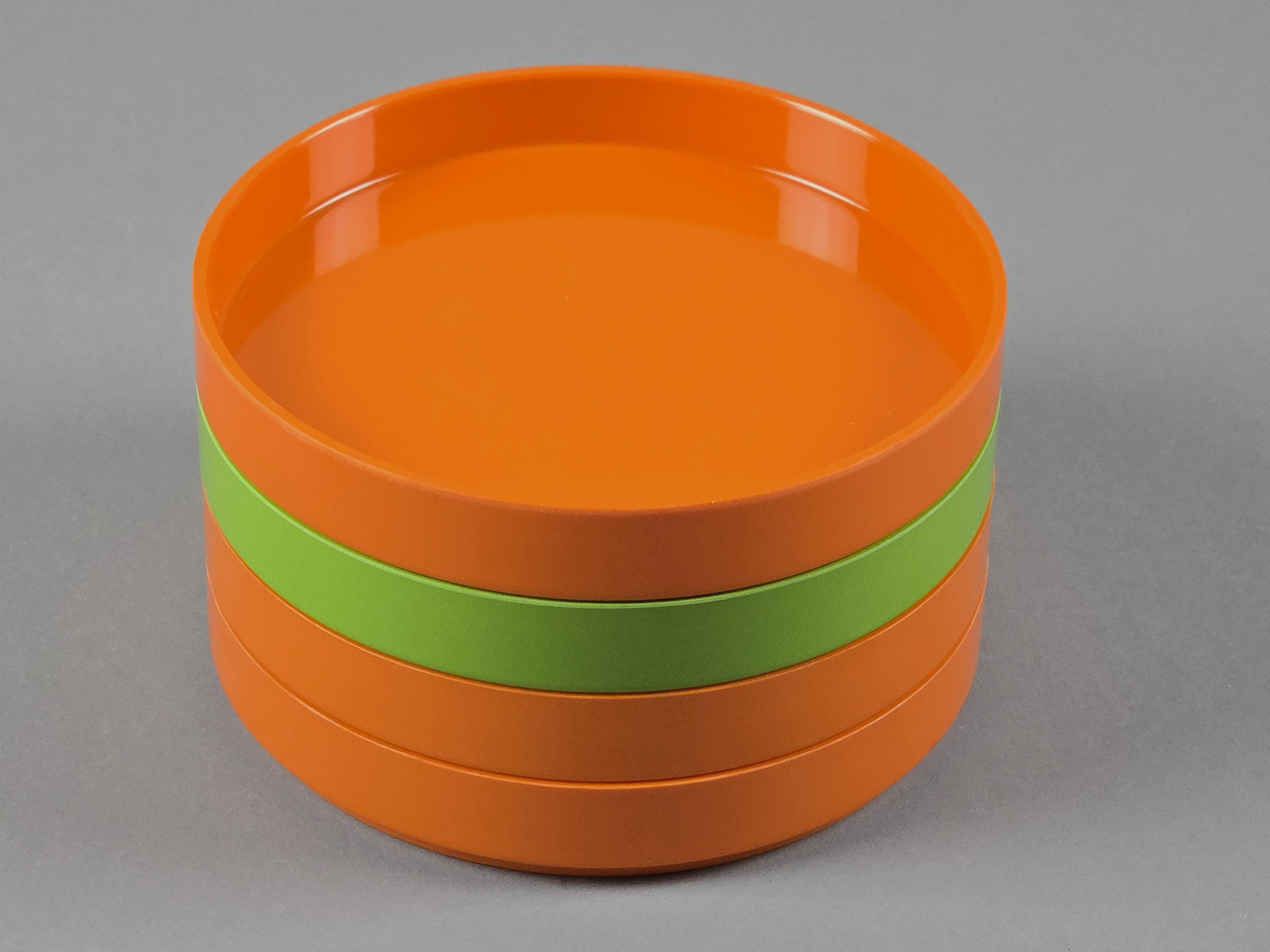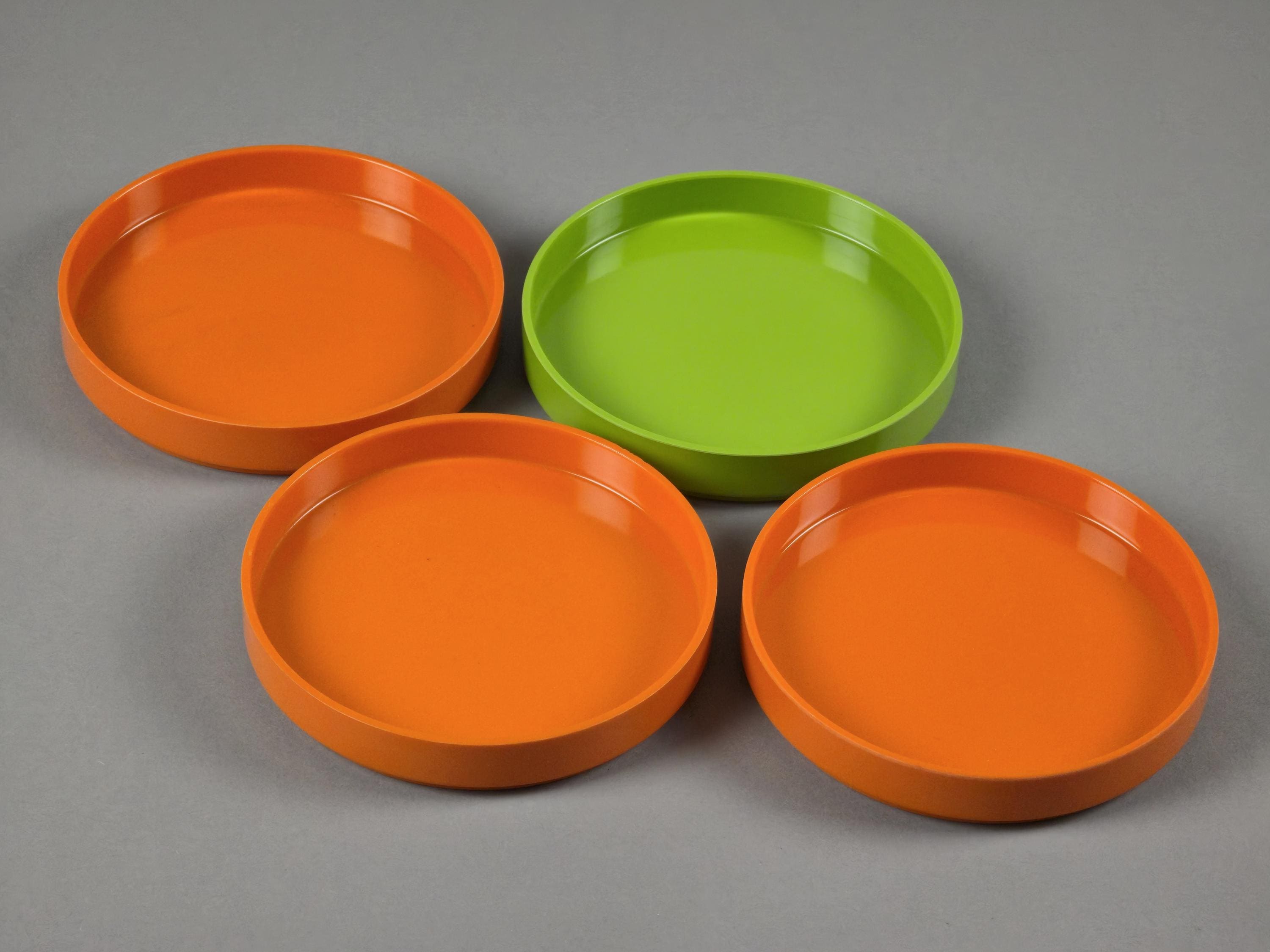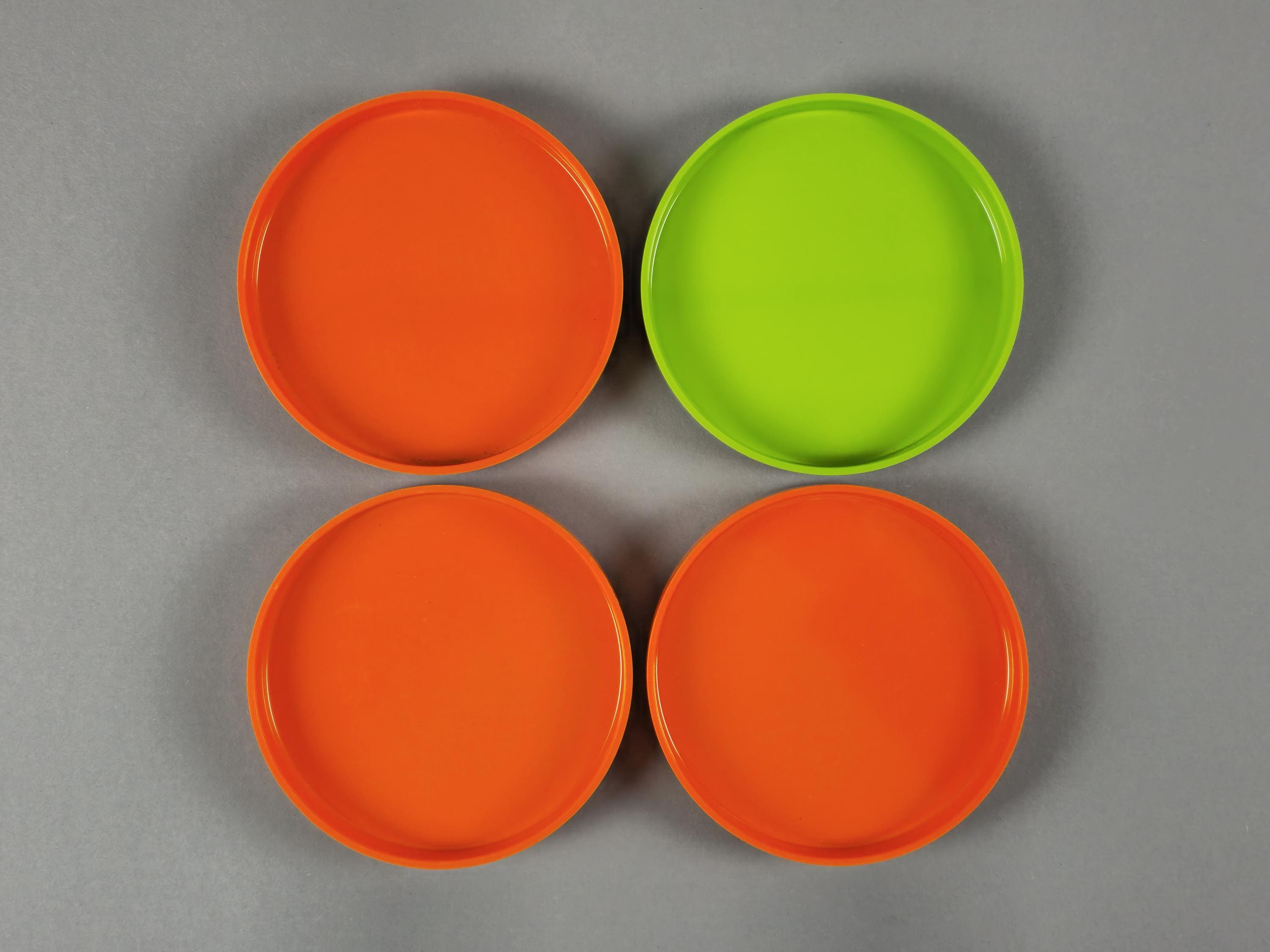 Vintage 1970s set of 4 melamine trays from Sweden in green and orange.
