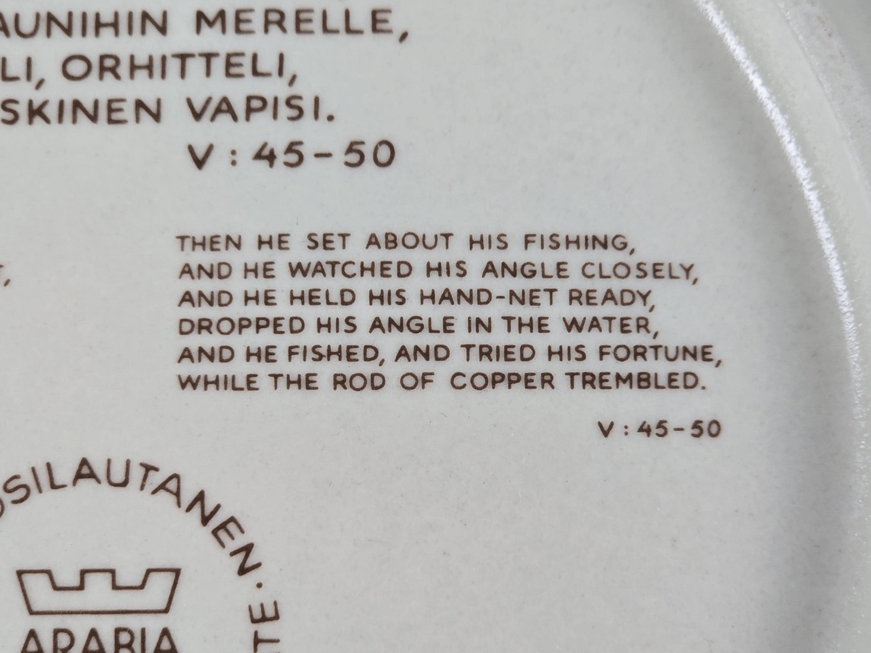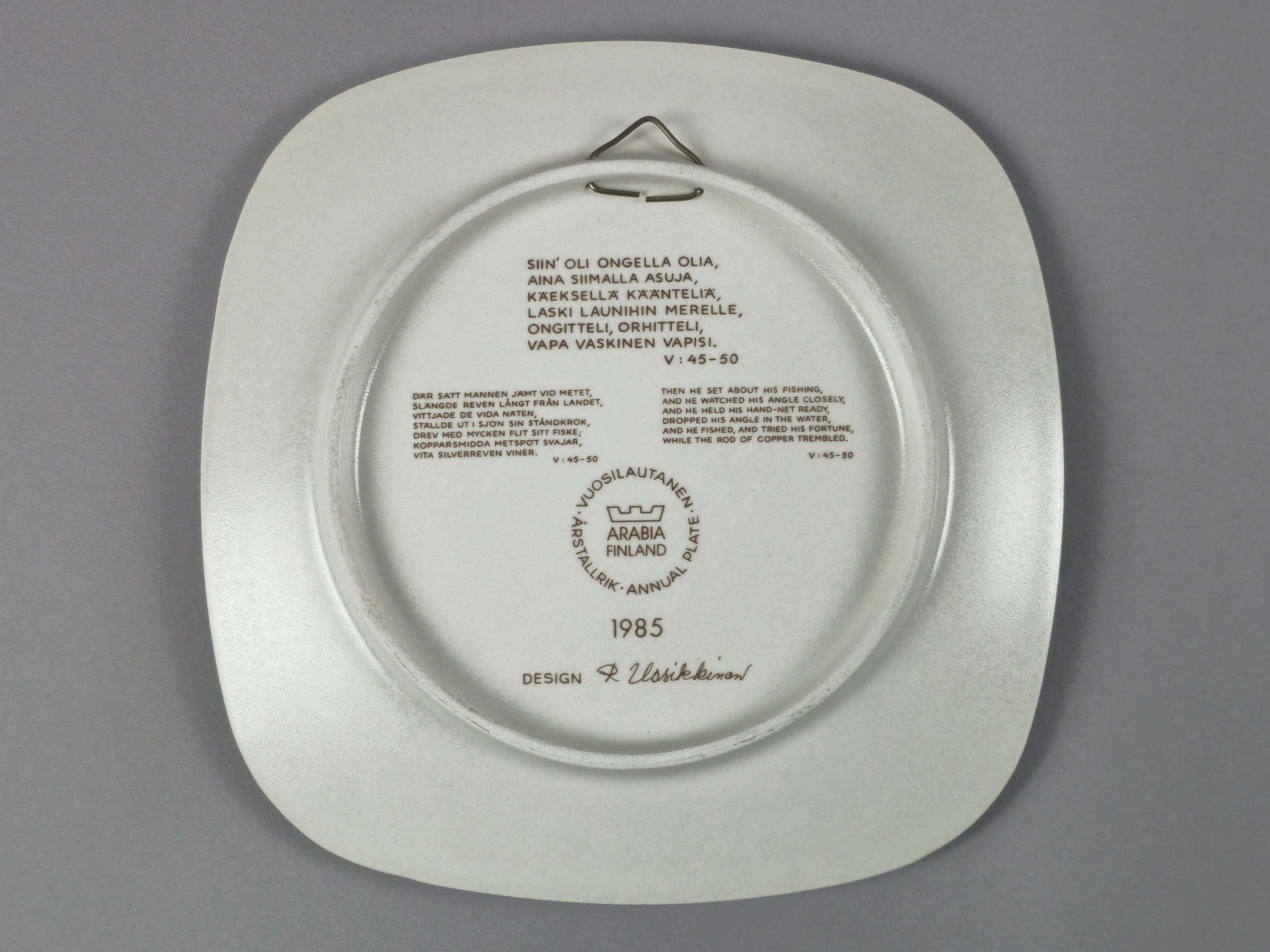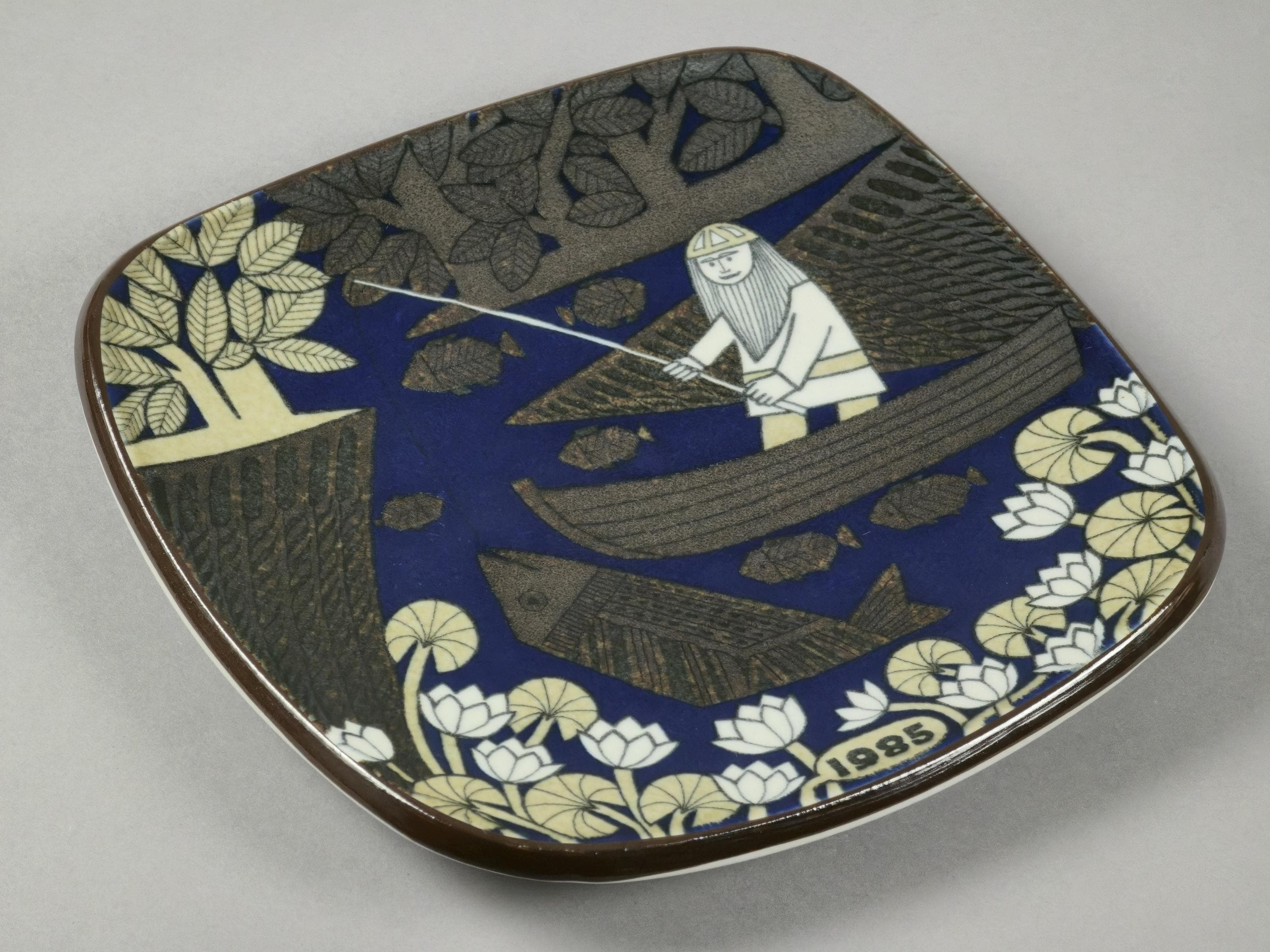 1985 Arabia “Kalevala” annual plate by Raija Uosikkinen. It illustrates the old hero Väinämöinen seated in his boat, holding a fishing rod or angle, with a large fish visible in the water.
