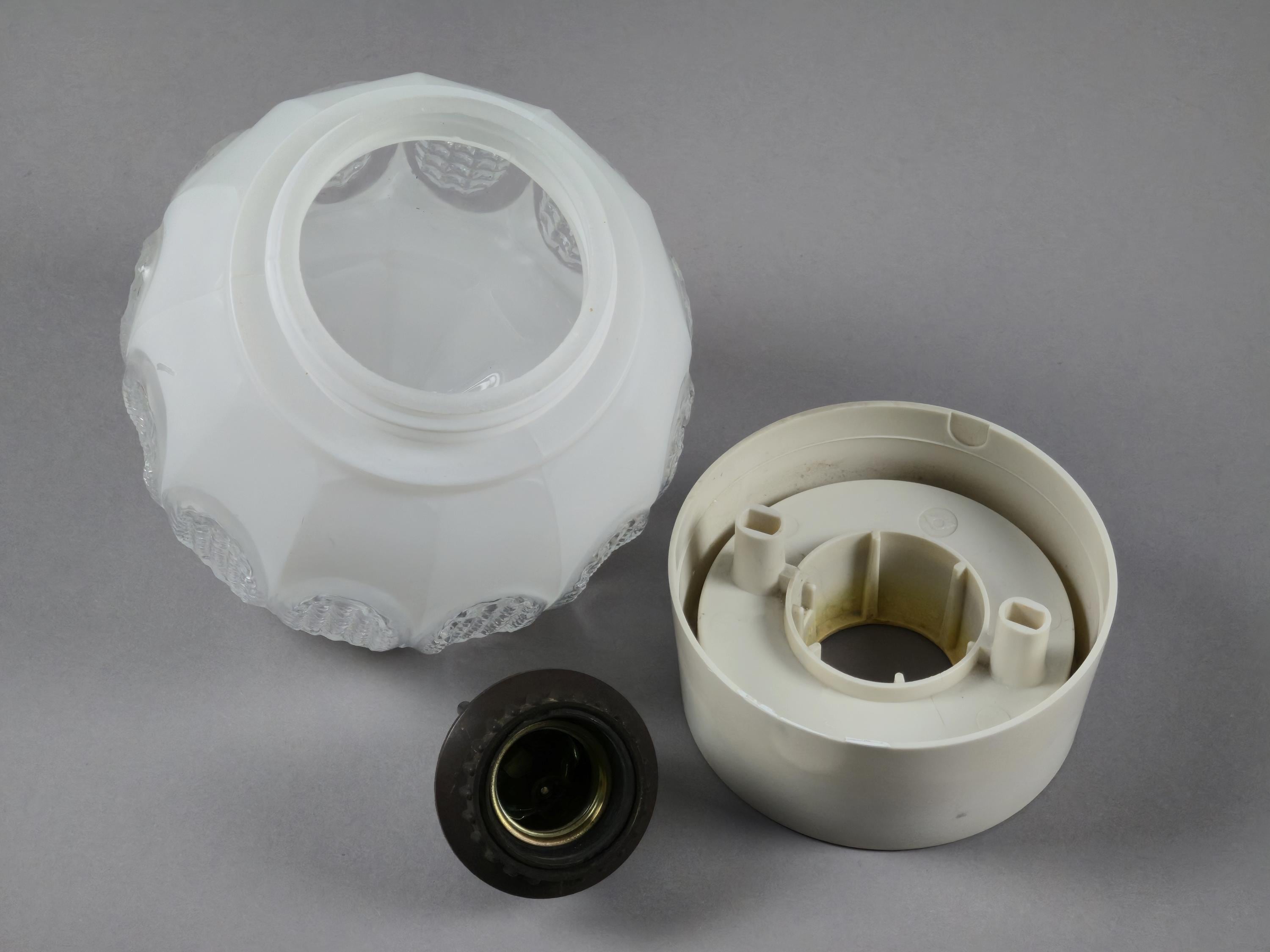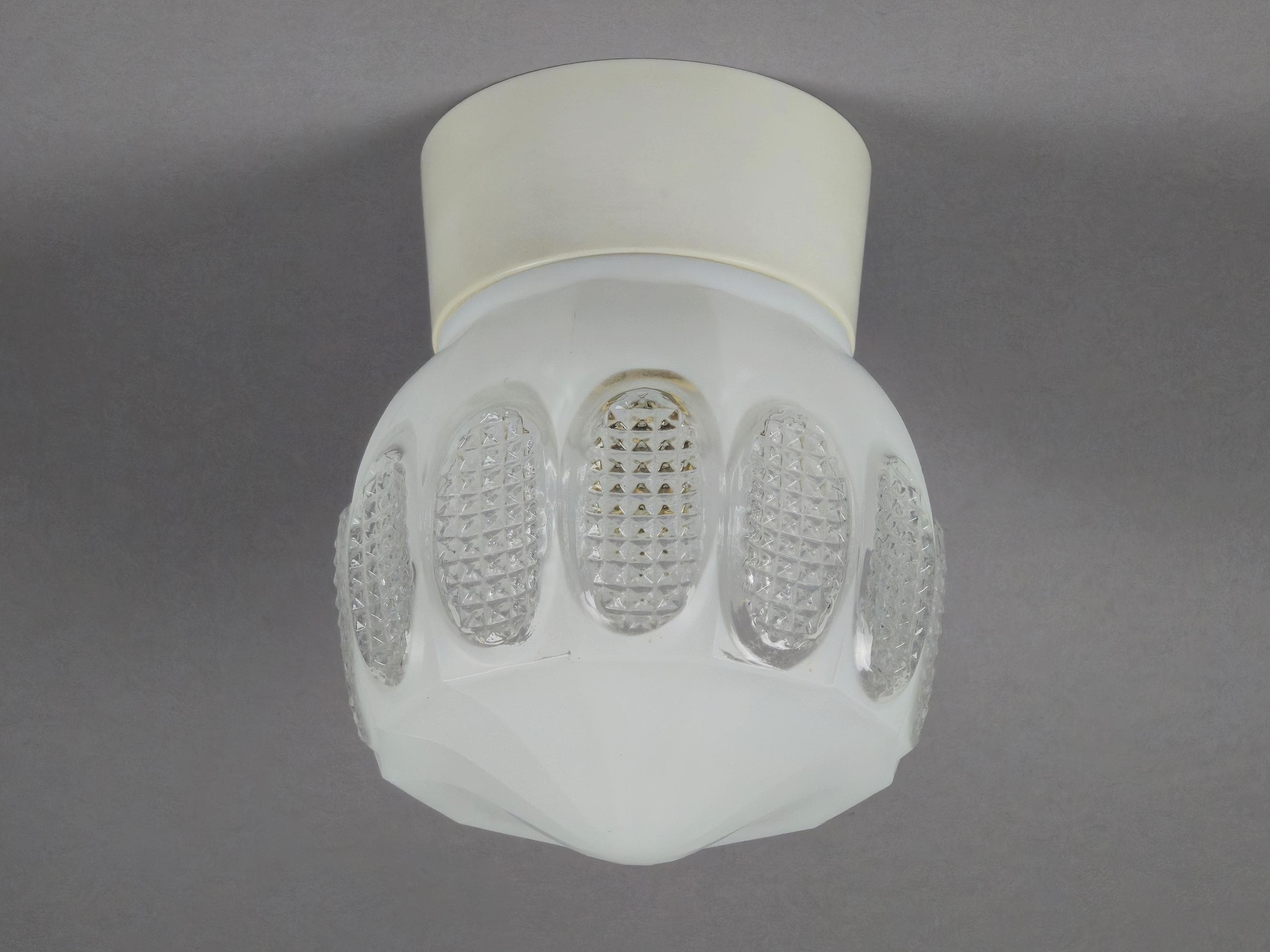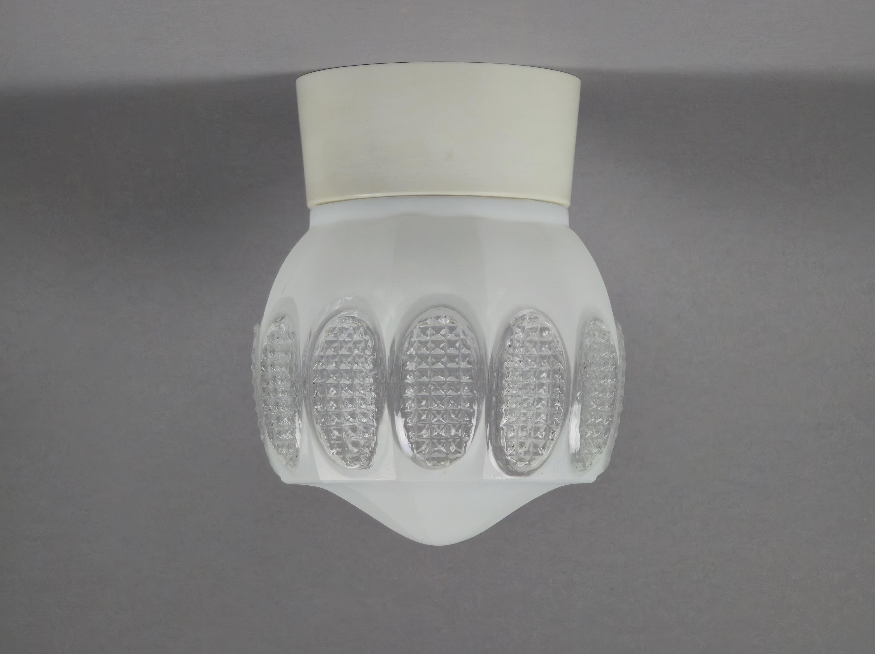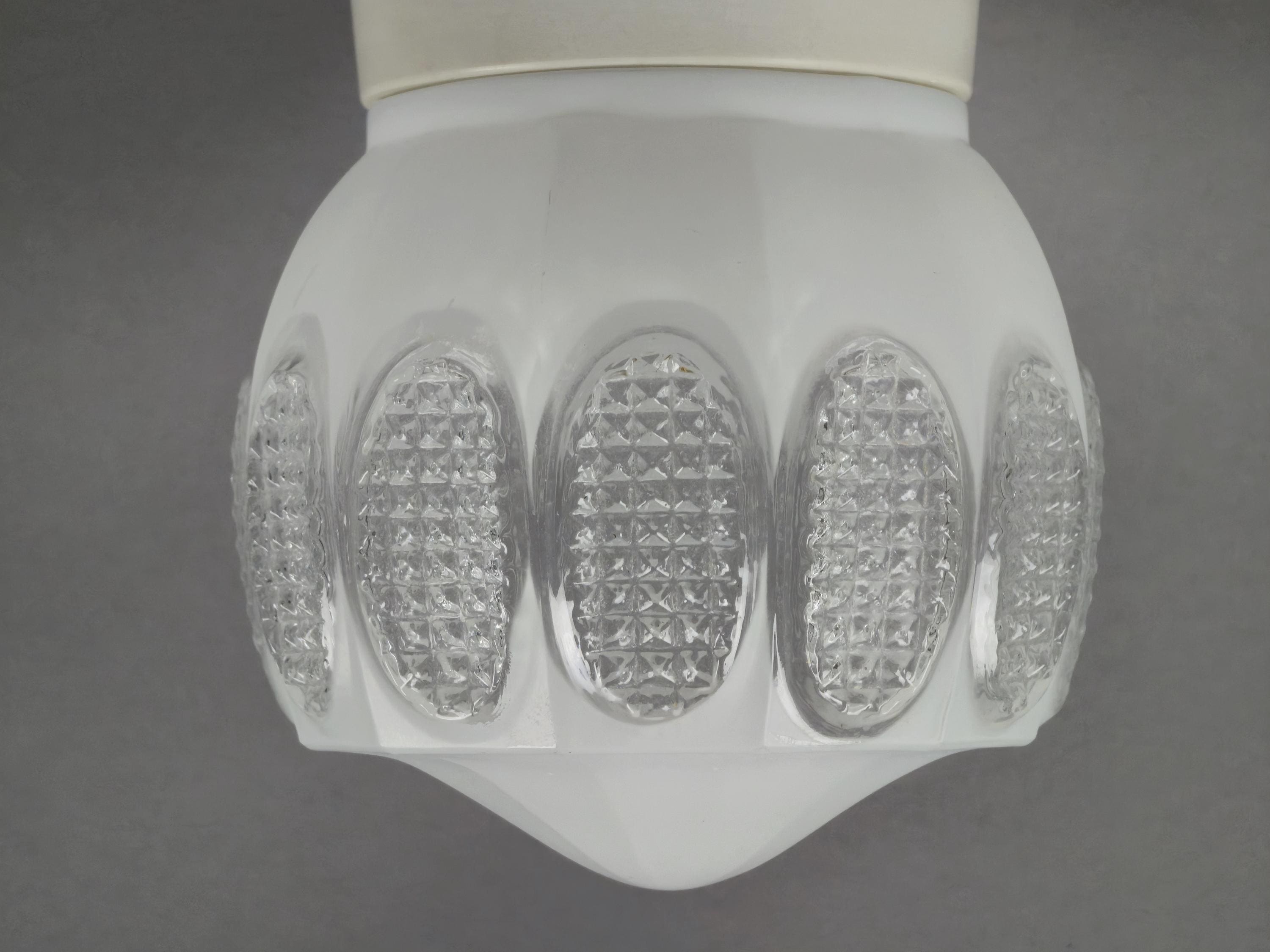 Vintage 1960s Art-Deco ceiling or wall light fixture. It can be installed on both ceilings and walls, and comes with a beige bakelite base and a white opaline glass ball shade, with pressed glass details.