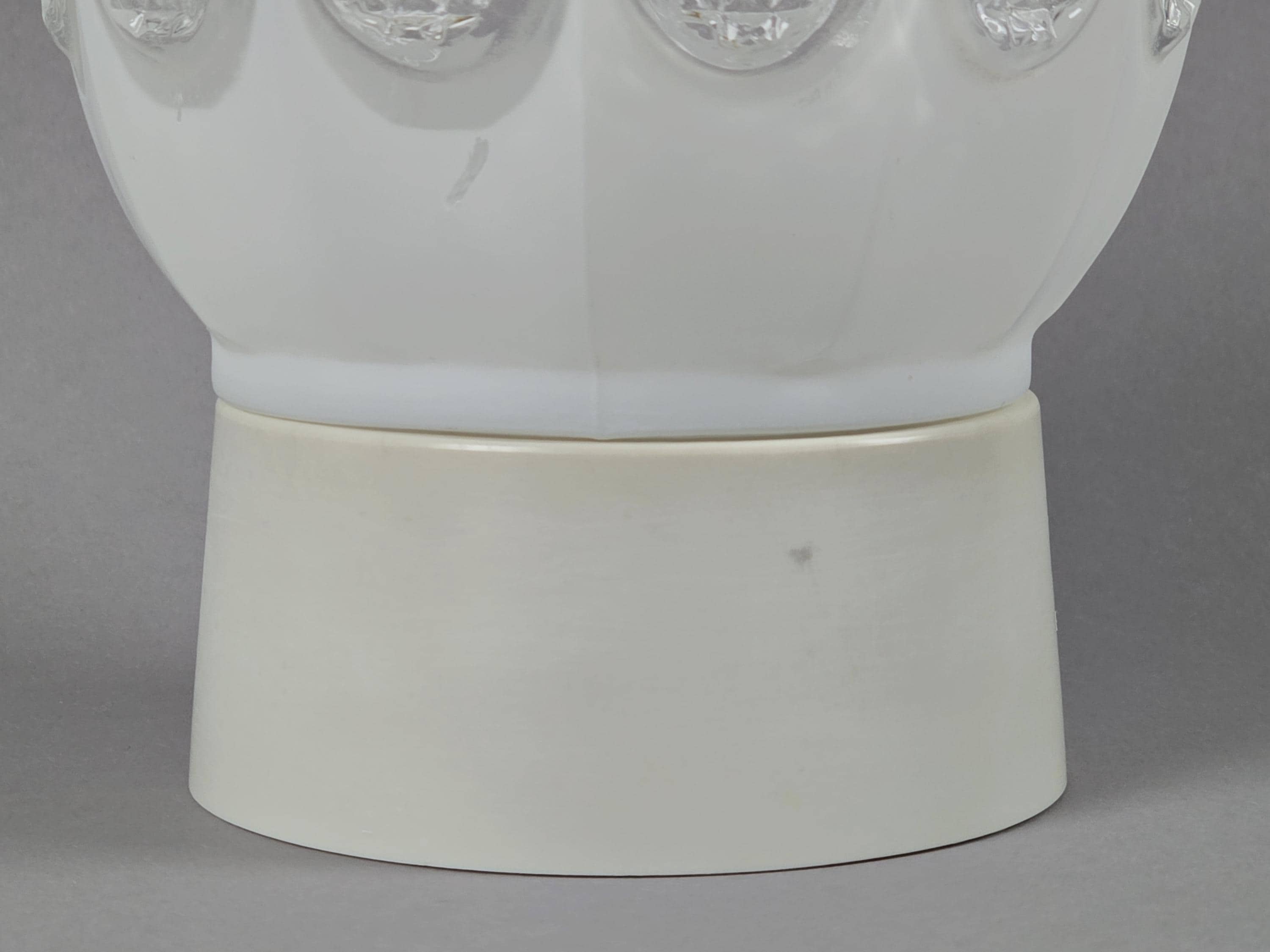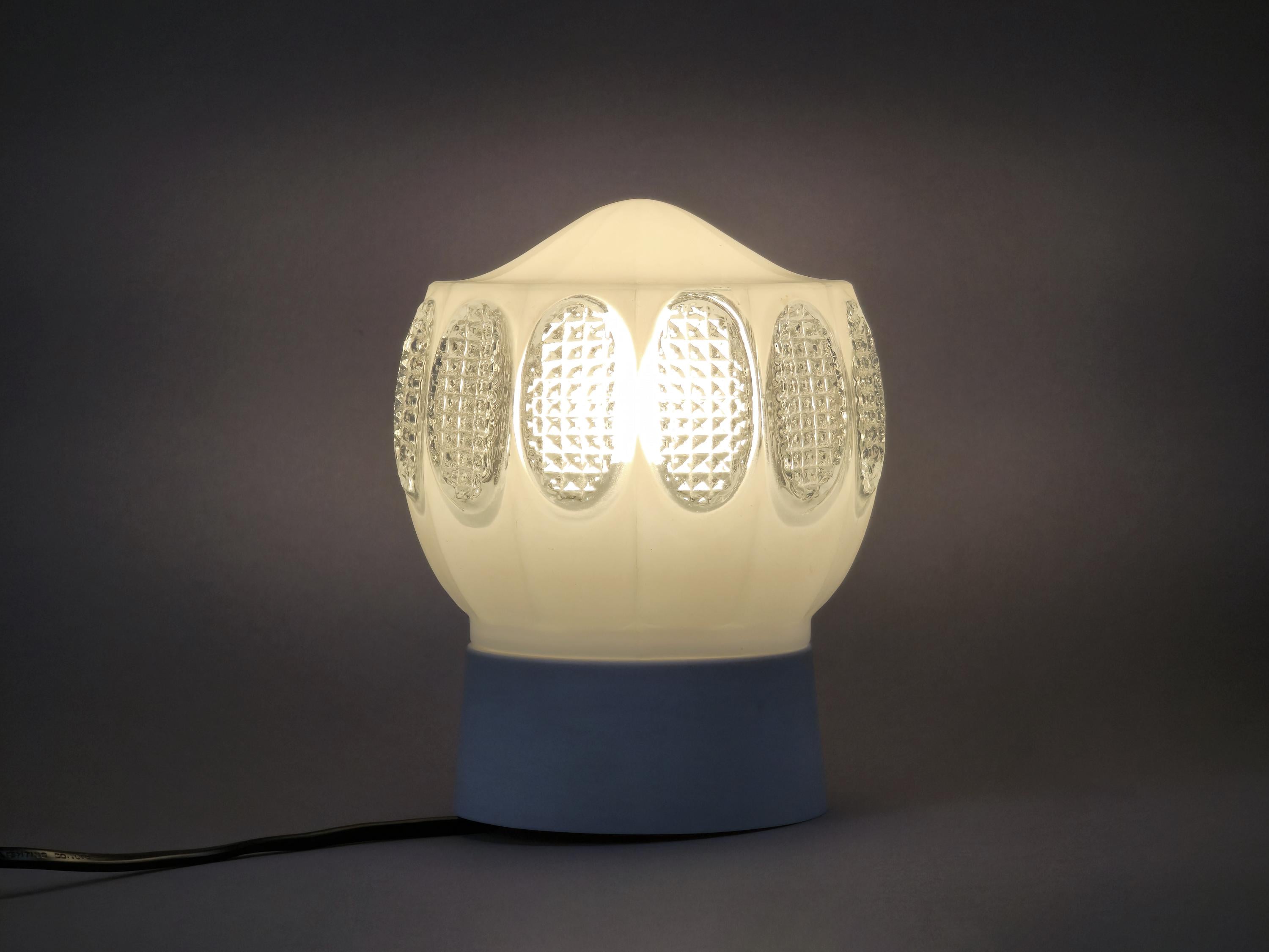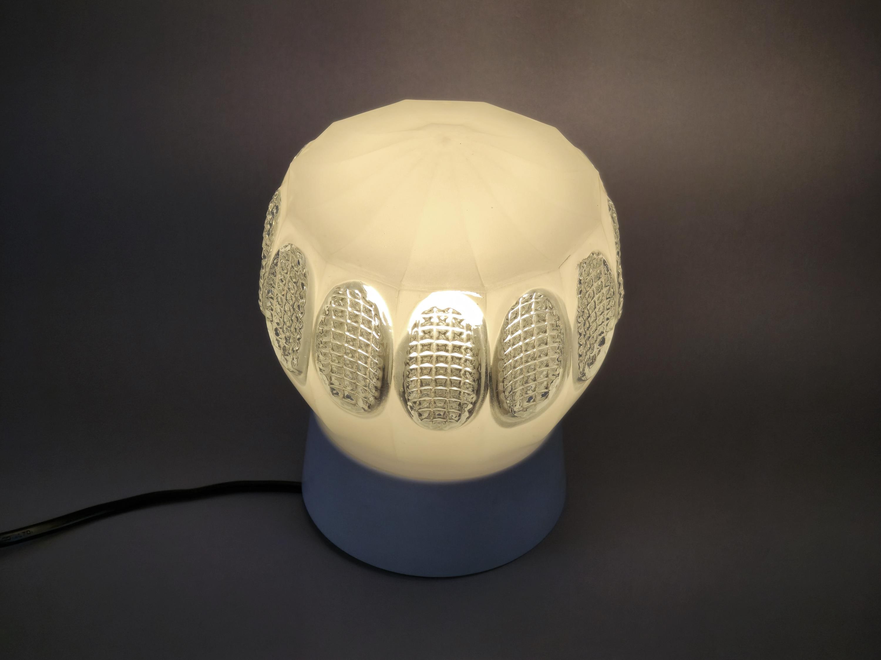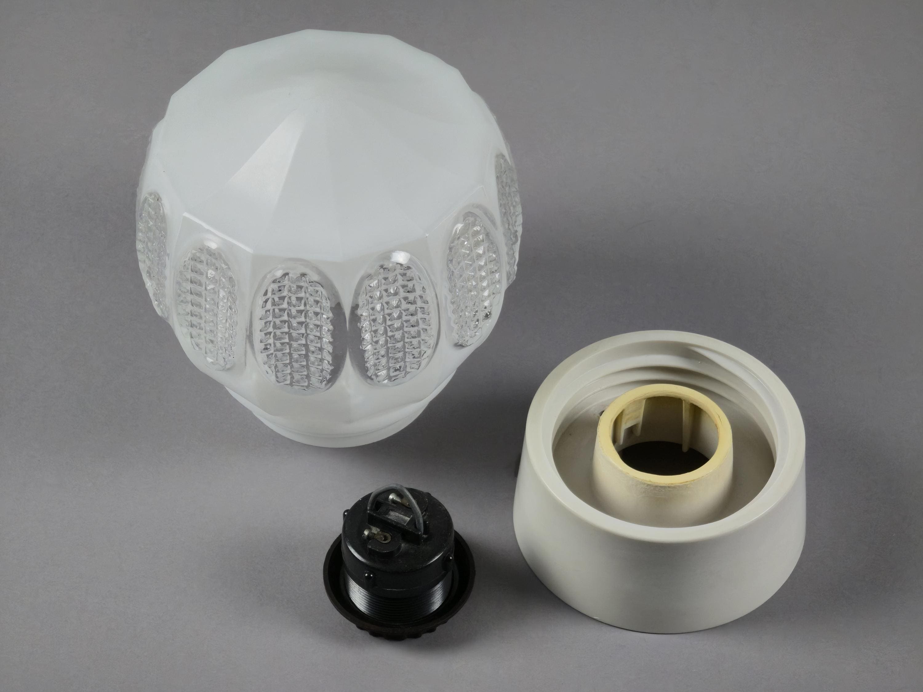 Vintage 1960s Art-Deco ceiling or wall light fixture. It can be installed on both ceilings and walls, and comes with a beige bakelite base and a white opaline glass ball shade, with pressed glass details.