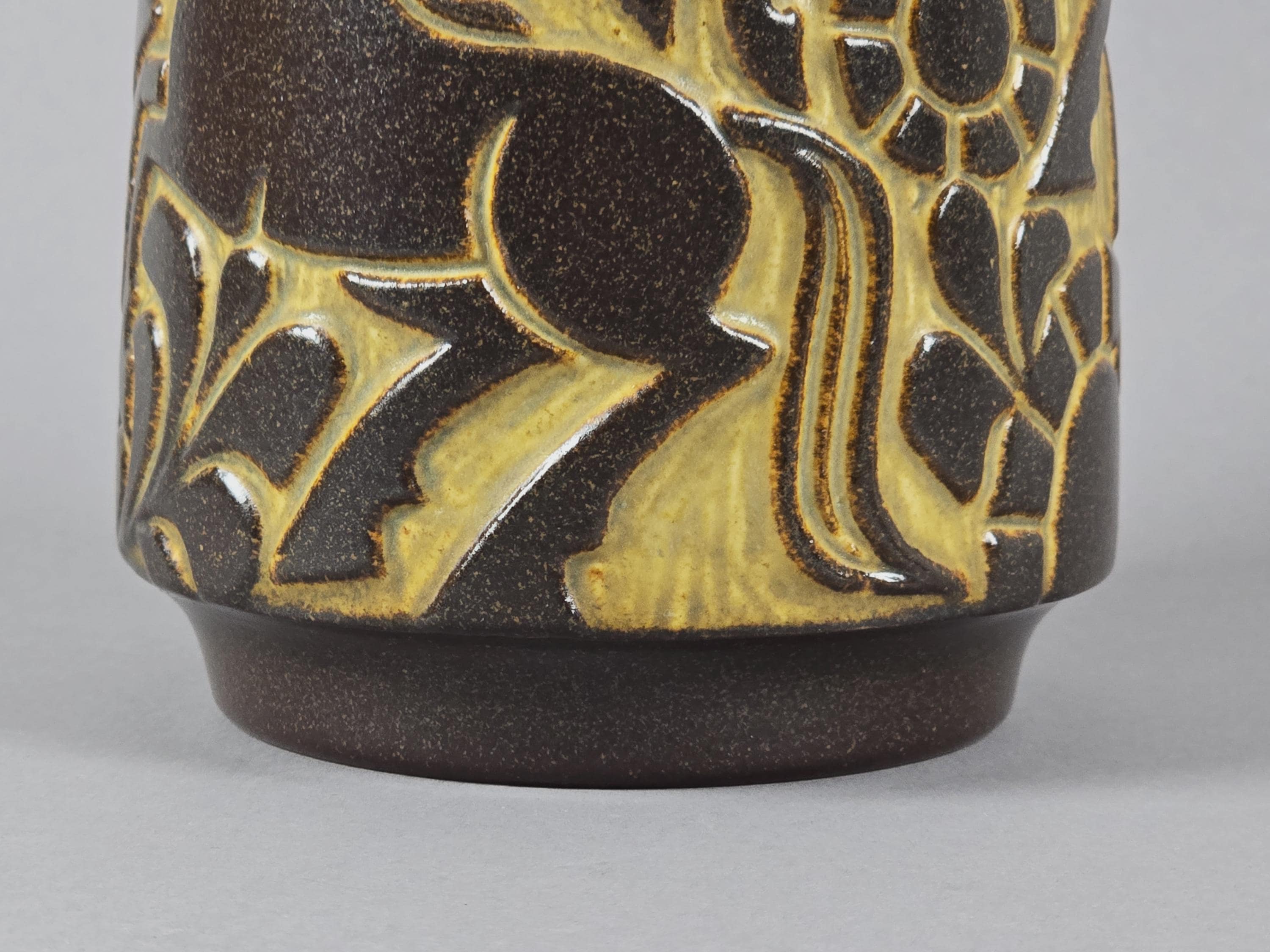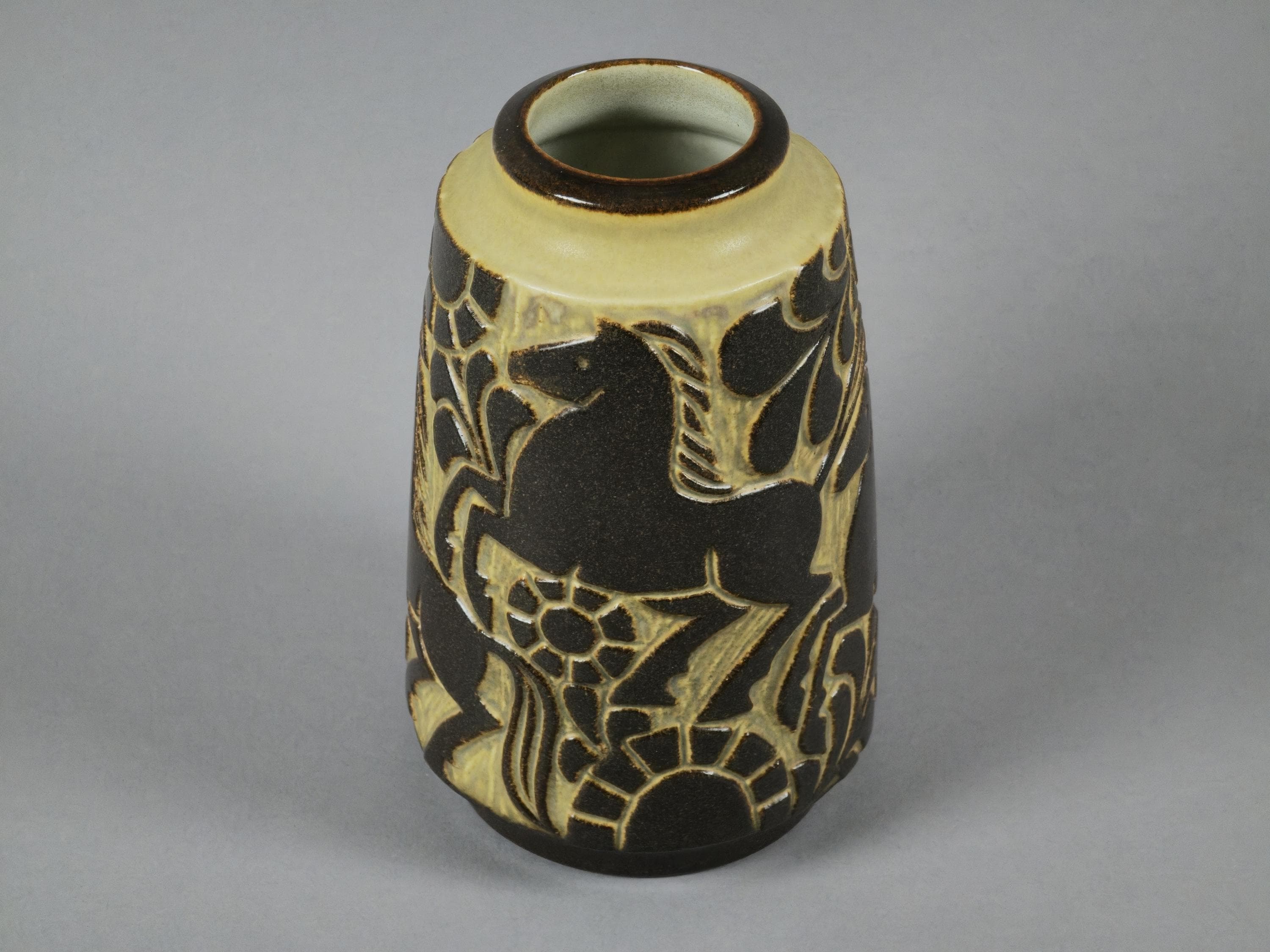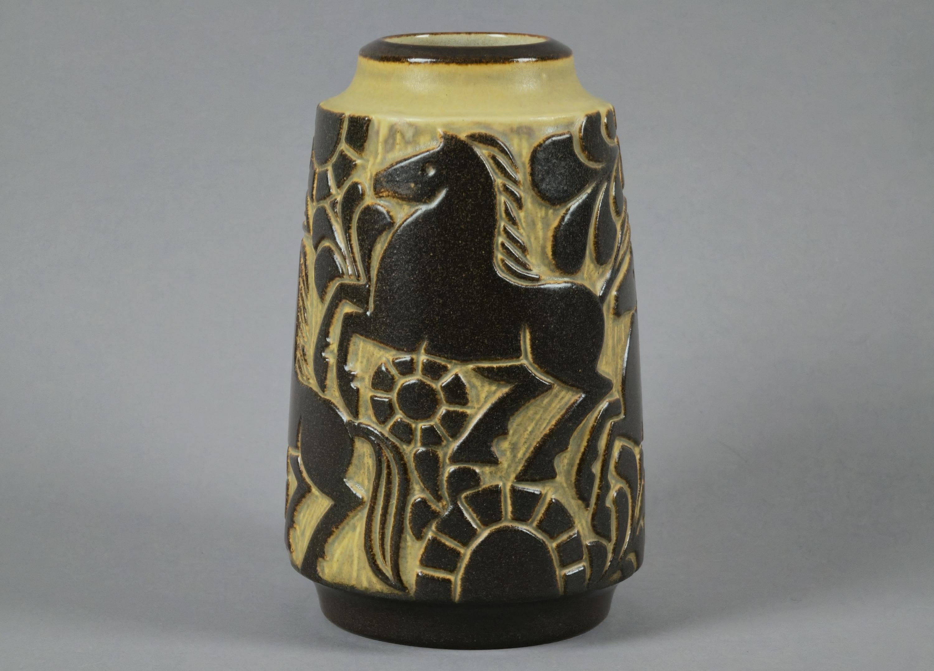 Vintage 1970s handmade stoneware vase by Marianne Starck for the renowned Danish pottery studio Michael Andersen & Son on the island of Bornholm, Denmark. The vase features a distinctive relief pattern of stylized horses, suns, and leaves. The design is highlighted in a dark brown glaze set against a matte beige or lighter background.