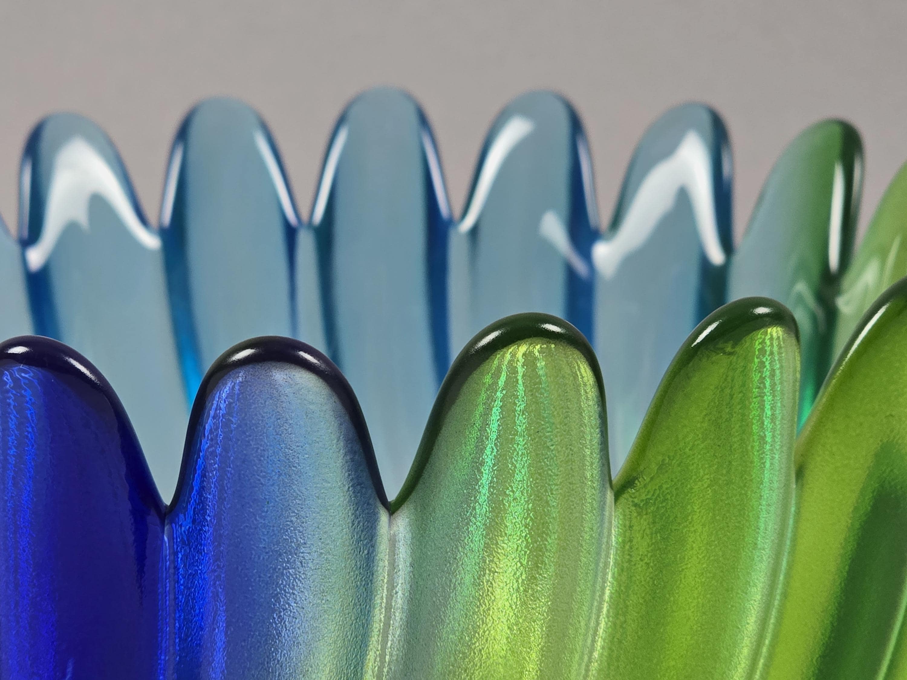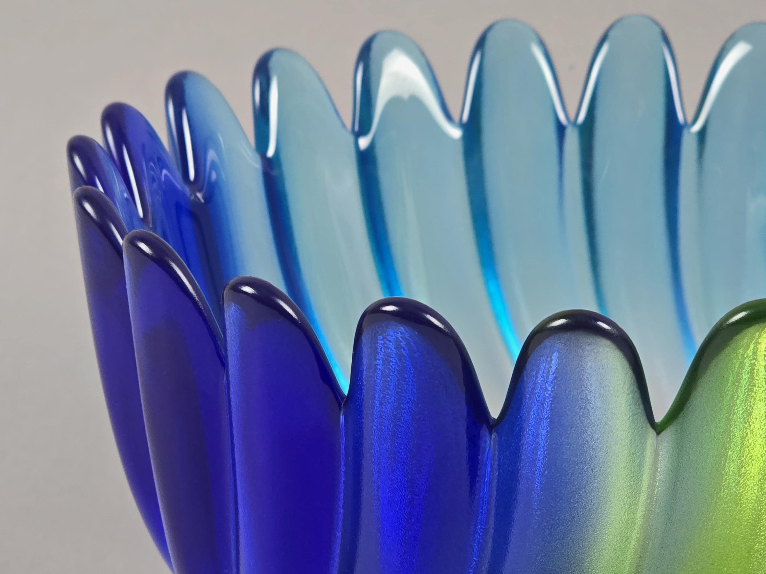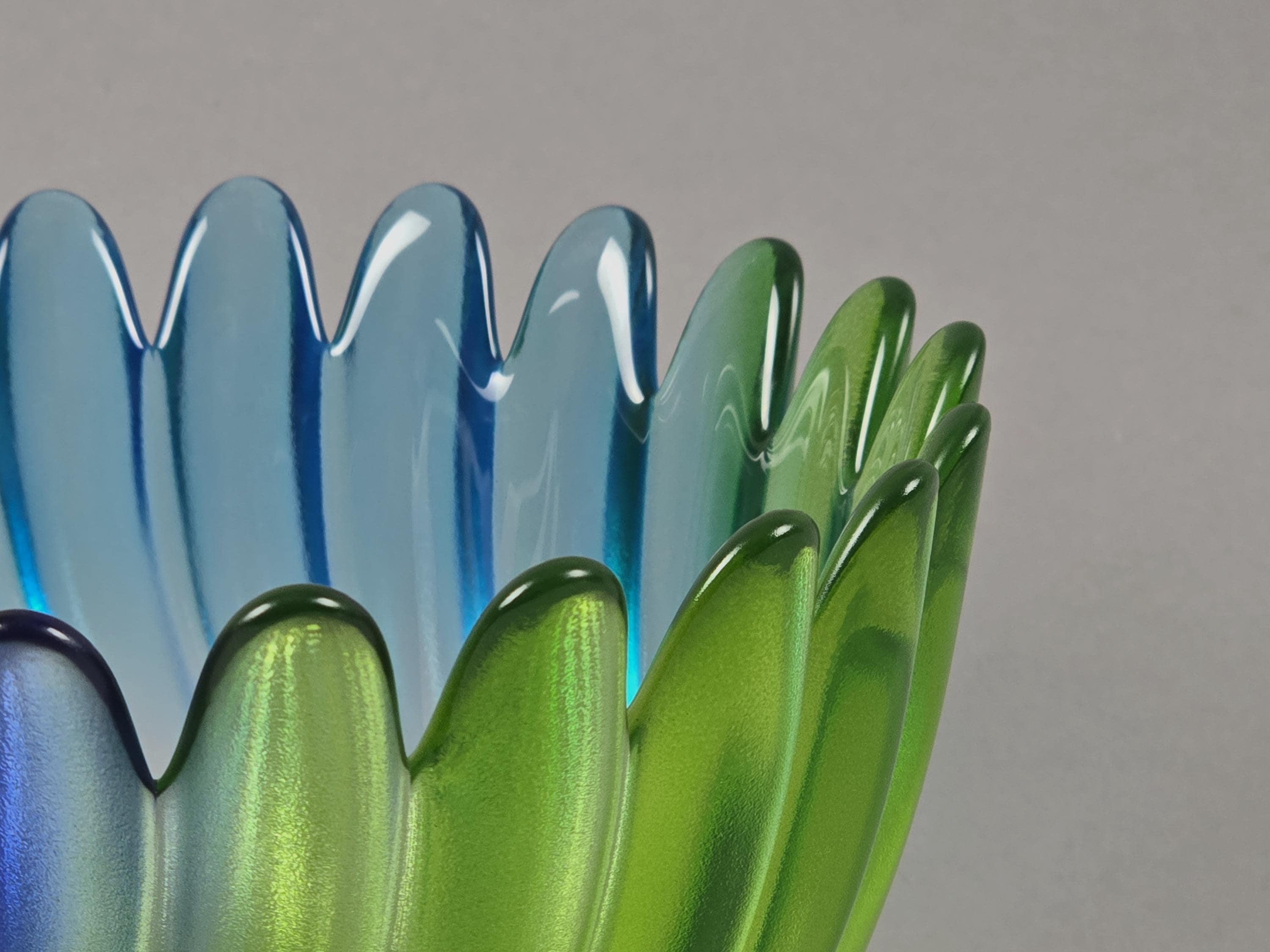 Vintage 1980s Walther Glas art glass swirl bowl 'Solaris' in blue & green ombré by Walther Liebenstern. The bowl features a dramatic, flared, and scalloped rim that gives it a "petal" or "flower" appearance. The entire piece is sculpted with a swirling, twisted relief pattern. The interior of the bowl has a smooth, glossy finish, while the exterior has a lightly textured or frosted surface.