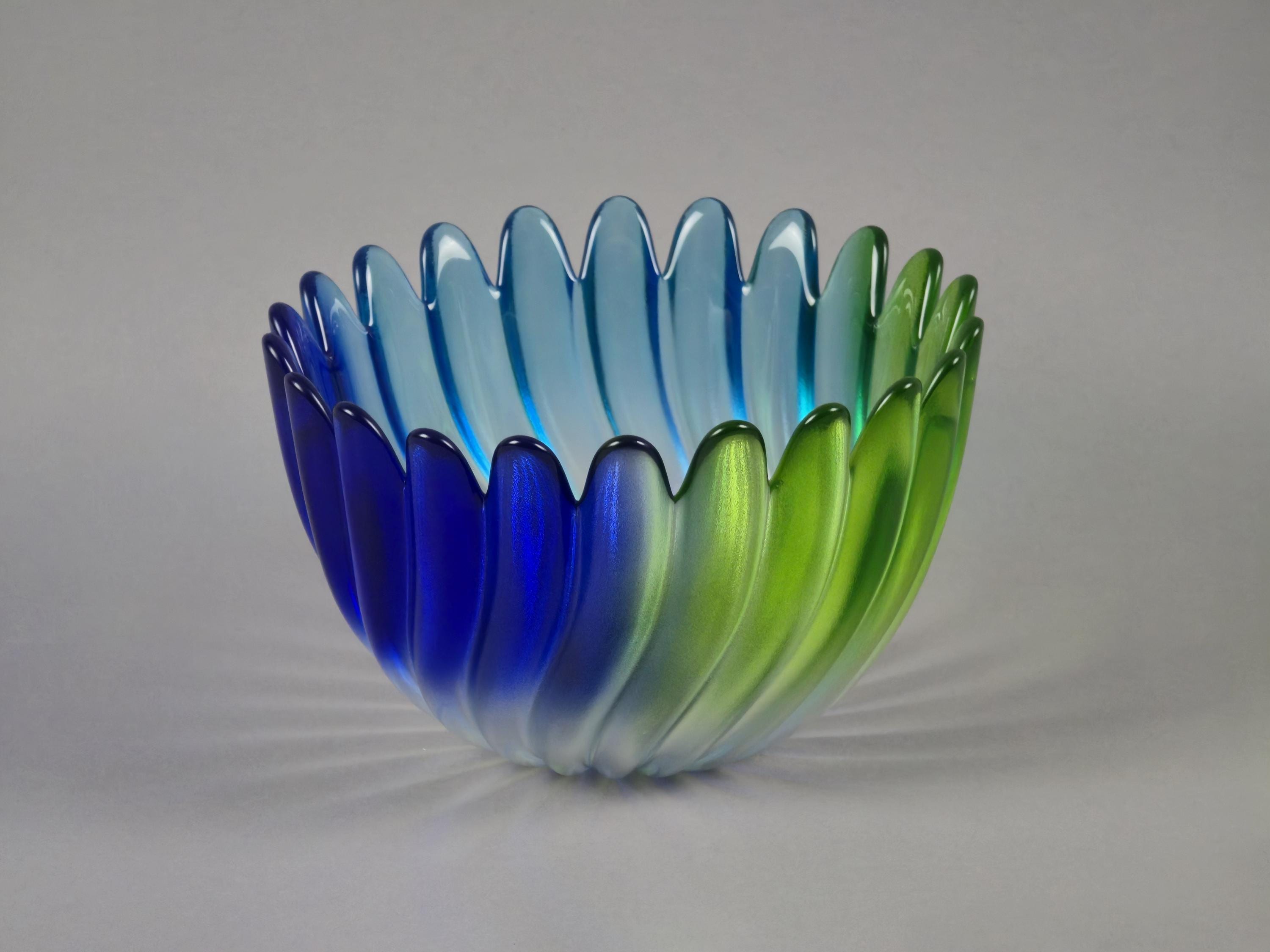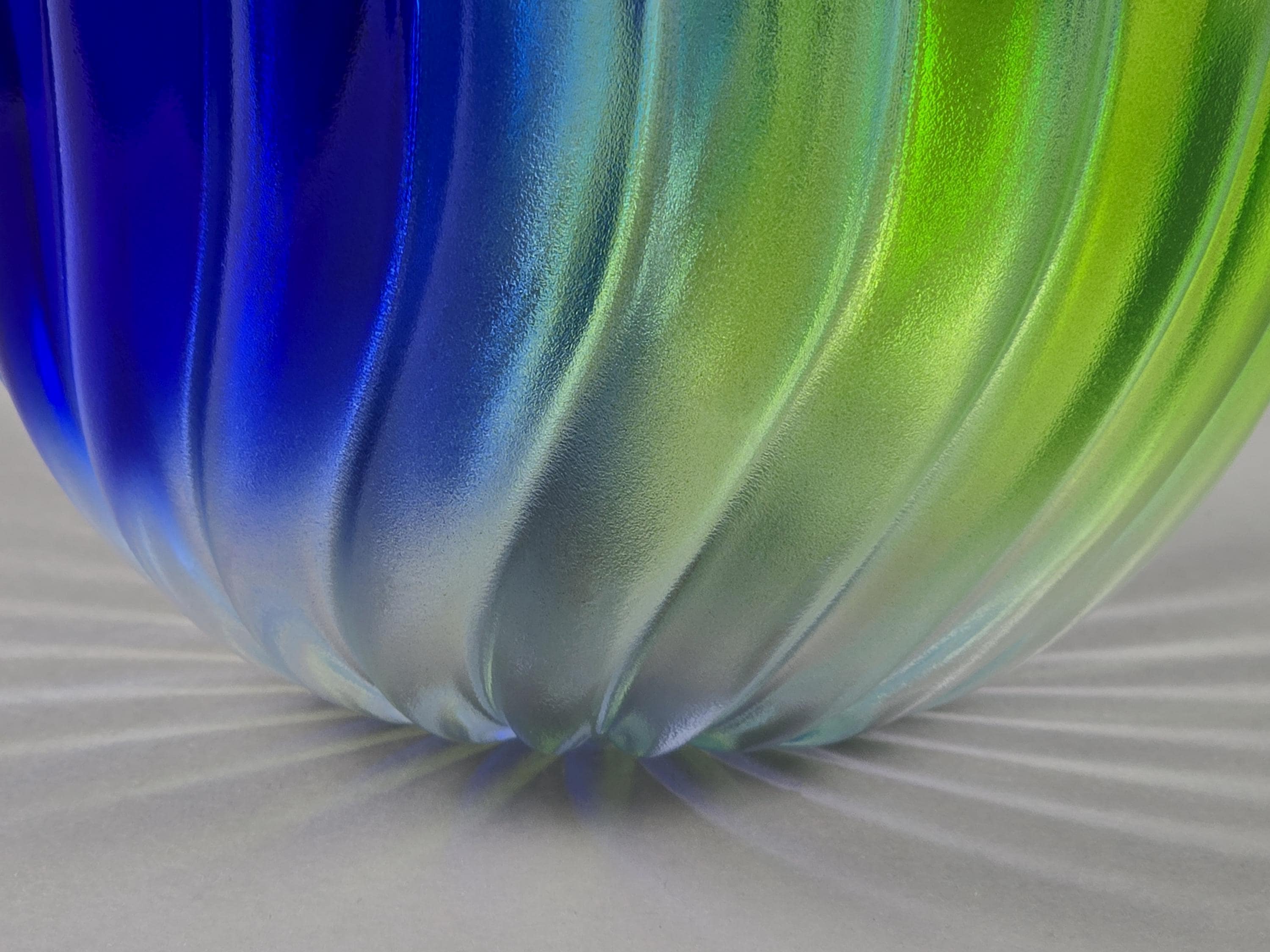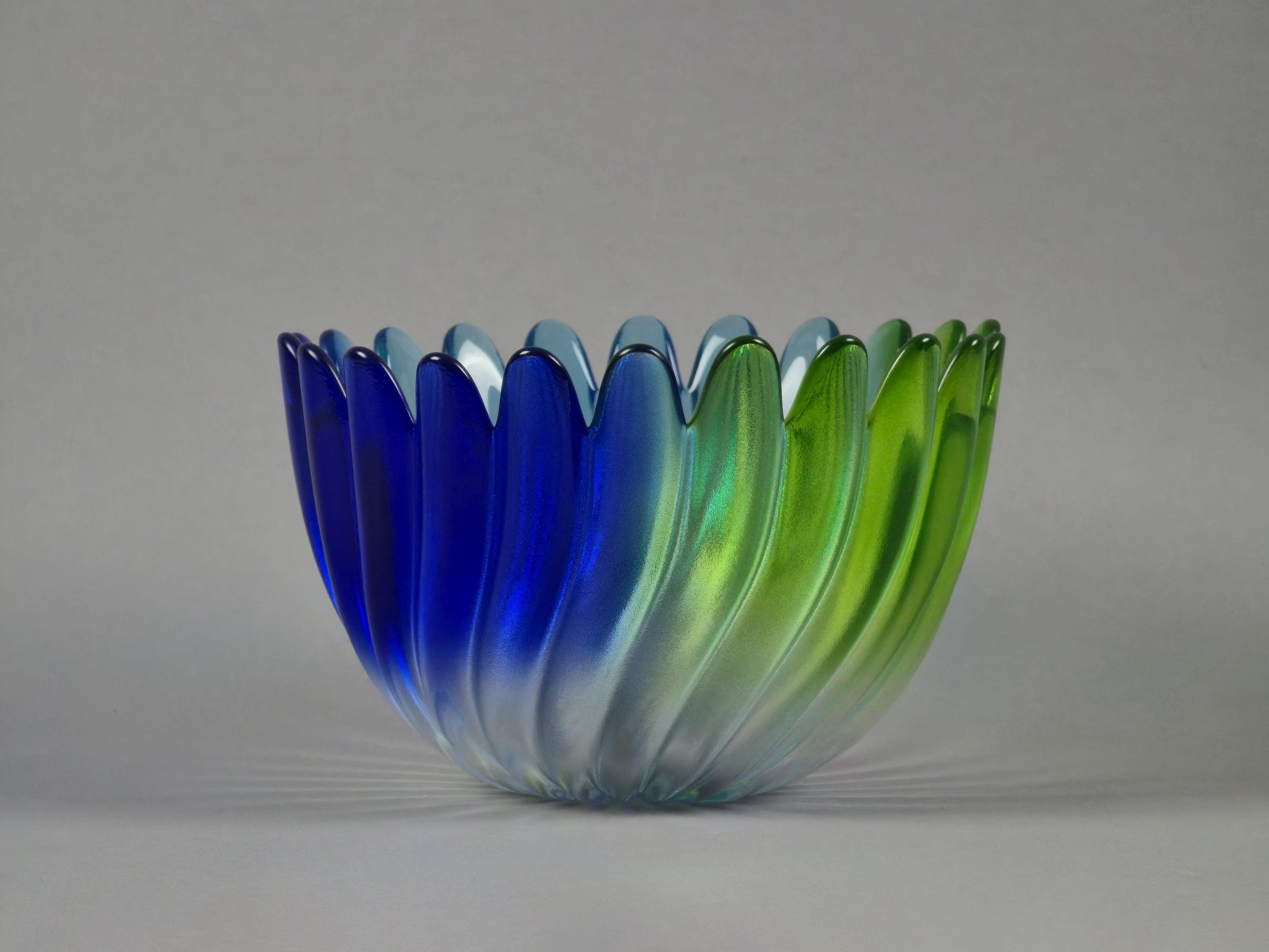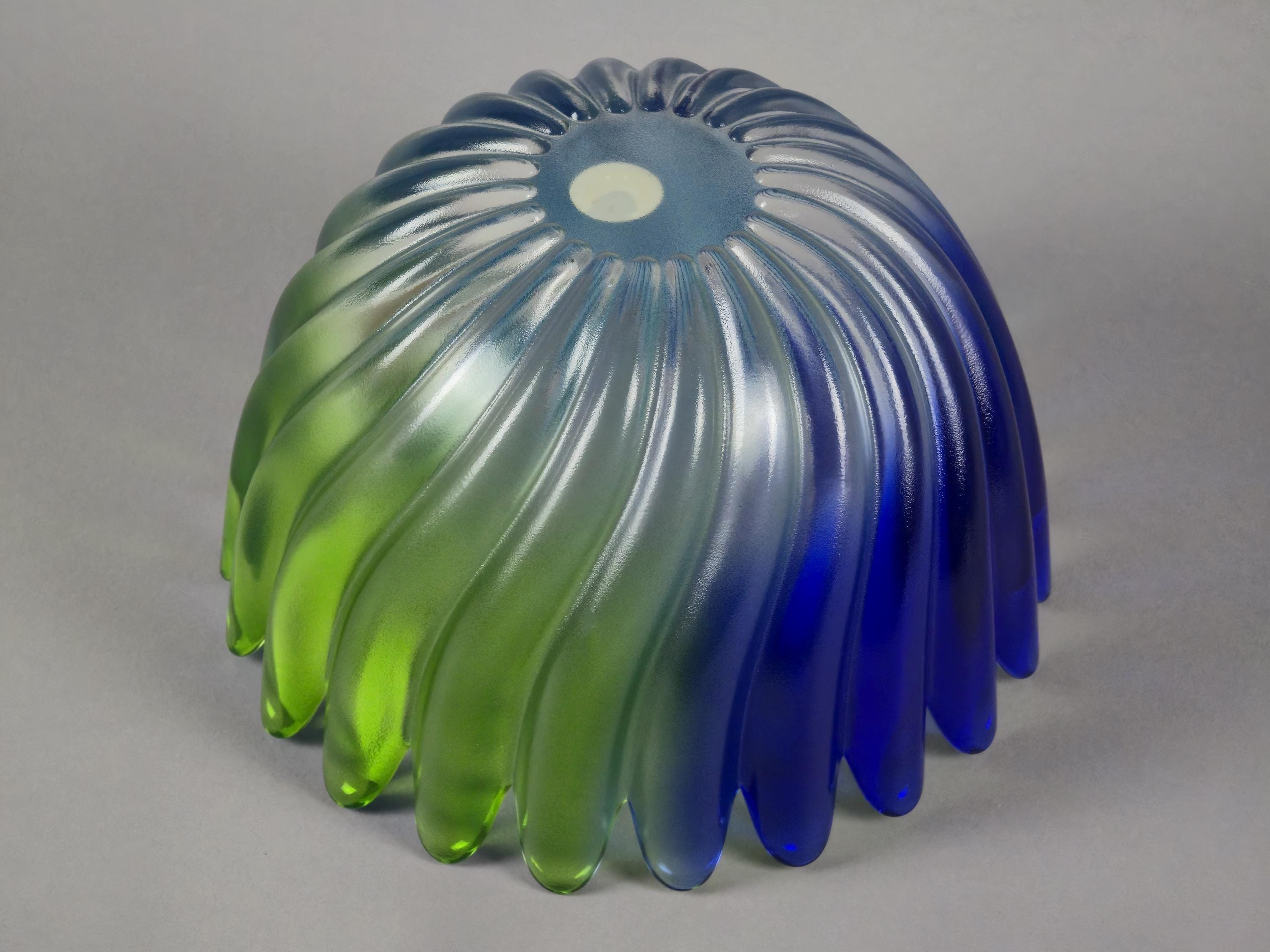 Vintage 1980s Walther Glas art glass swirl bowl 'Solaris' in blue & green ombré by Walther Liebenstern. The bowl features a dramatic, flared, and scalloped rim that gives it a "petal" or "flower" appearance. The entire piece is sculpted with a swirling, twisted relief pattern. The interior of the bowl has a smooth, glossy finish, while the exterior has a lightly textured or frosted surface.