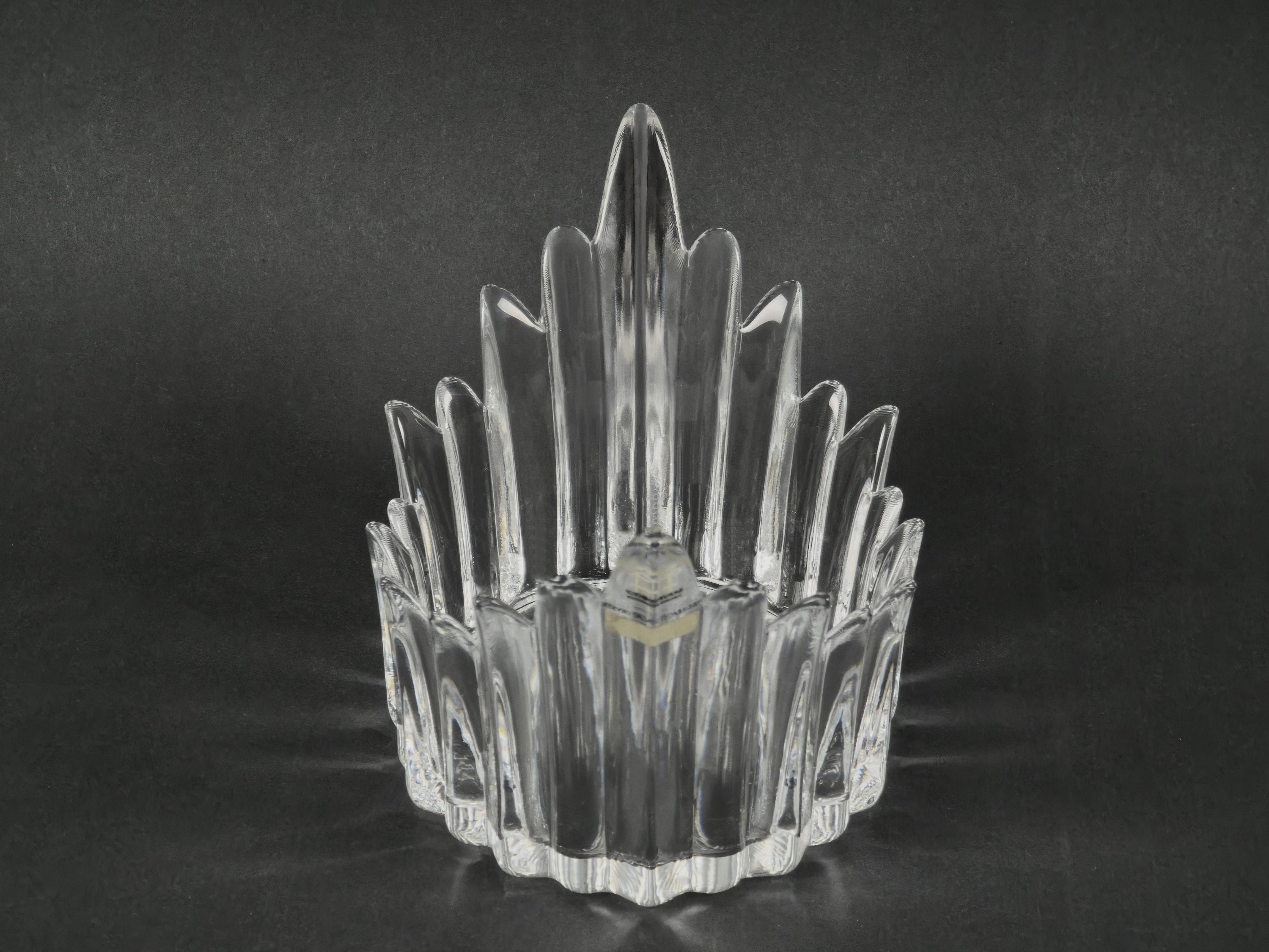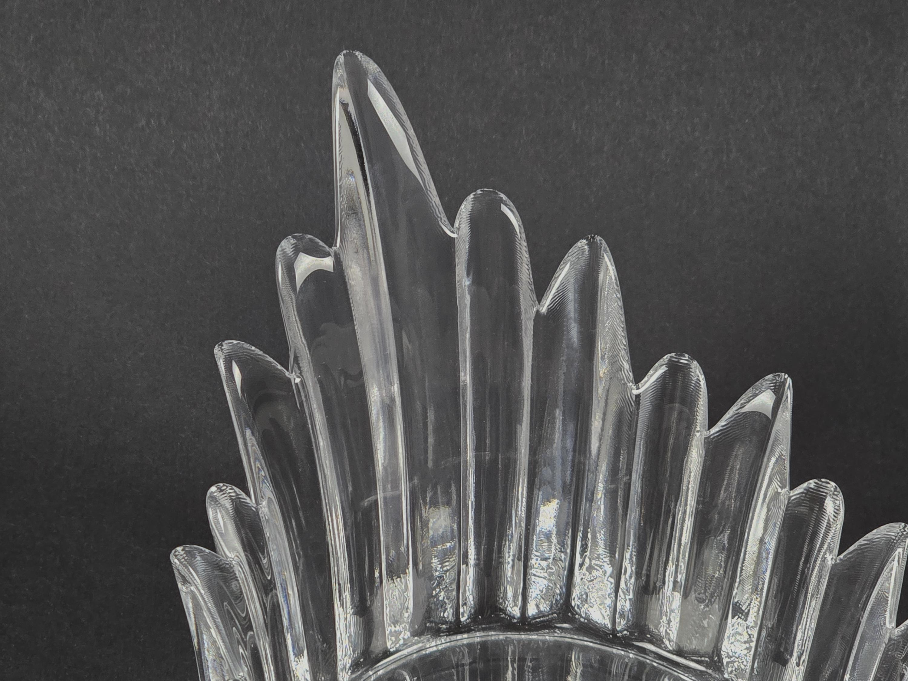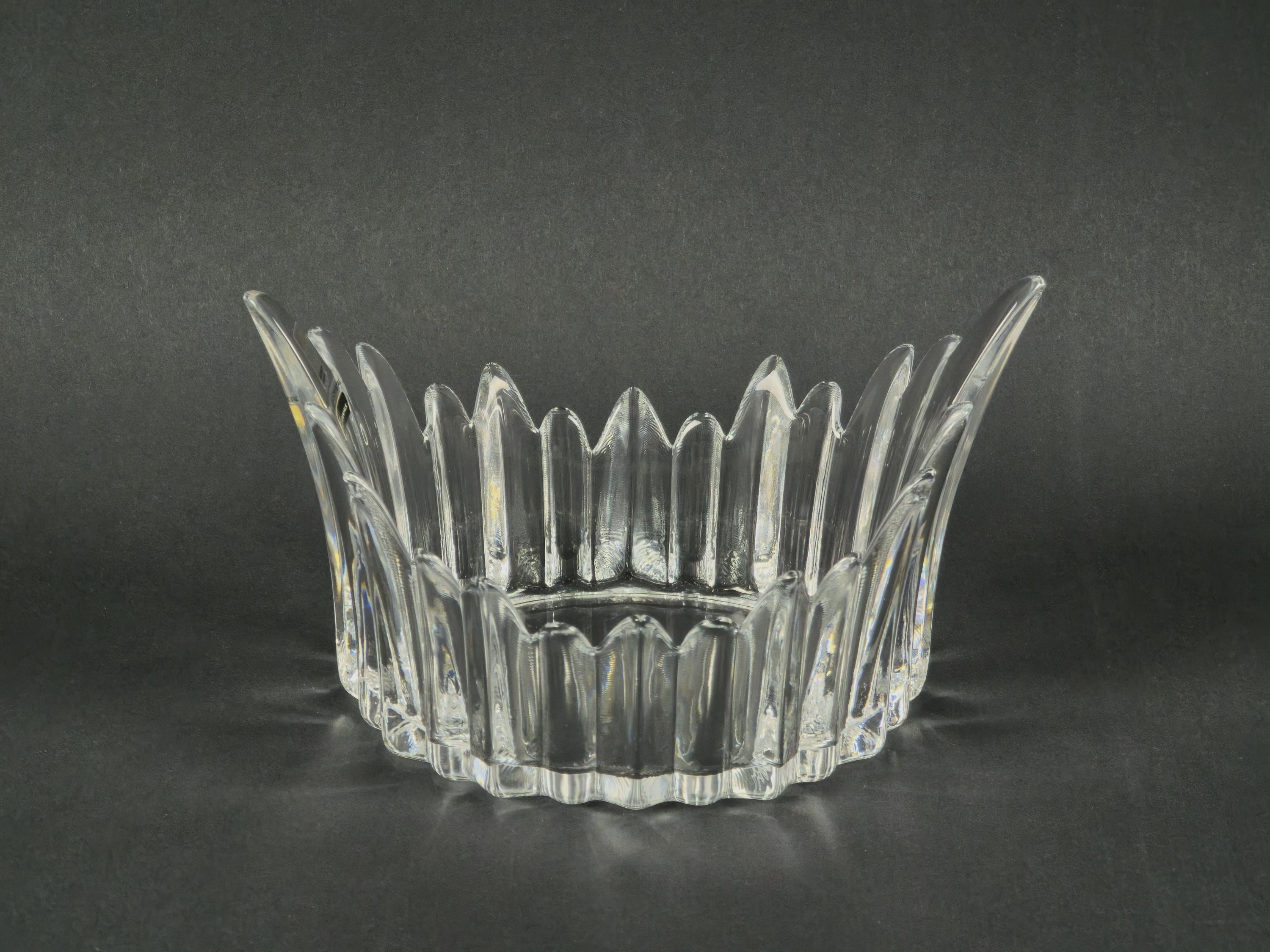 Vintage 1970s Swedish mid-century crystal glass bowl by Bengt Edenfalk for Skruf Glasbruk. It is known as the "Princess" or "Crown" bowl due to its distinctive shape, featuring a heavy, thick-walled base and high, jagged edges that resemble a royal crown. The design is characterized by sharp, geometric facets and deep vertical cuts that effectively catch and refract light.