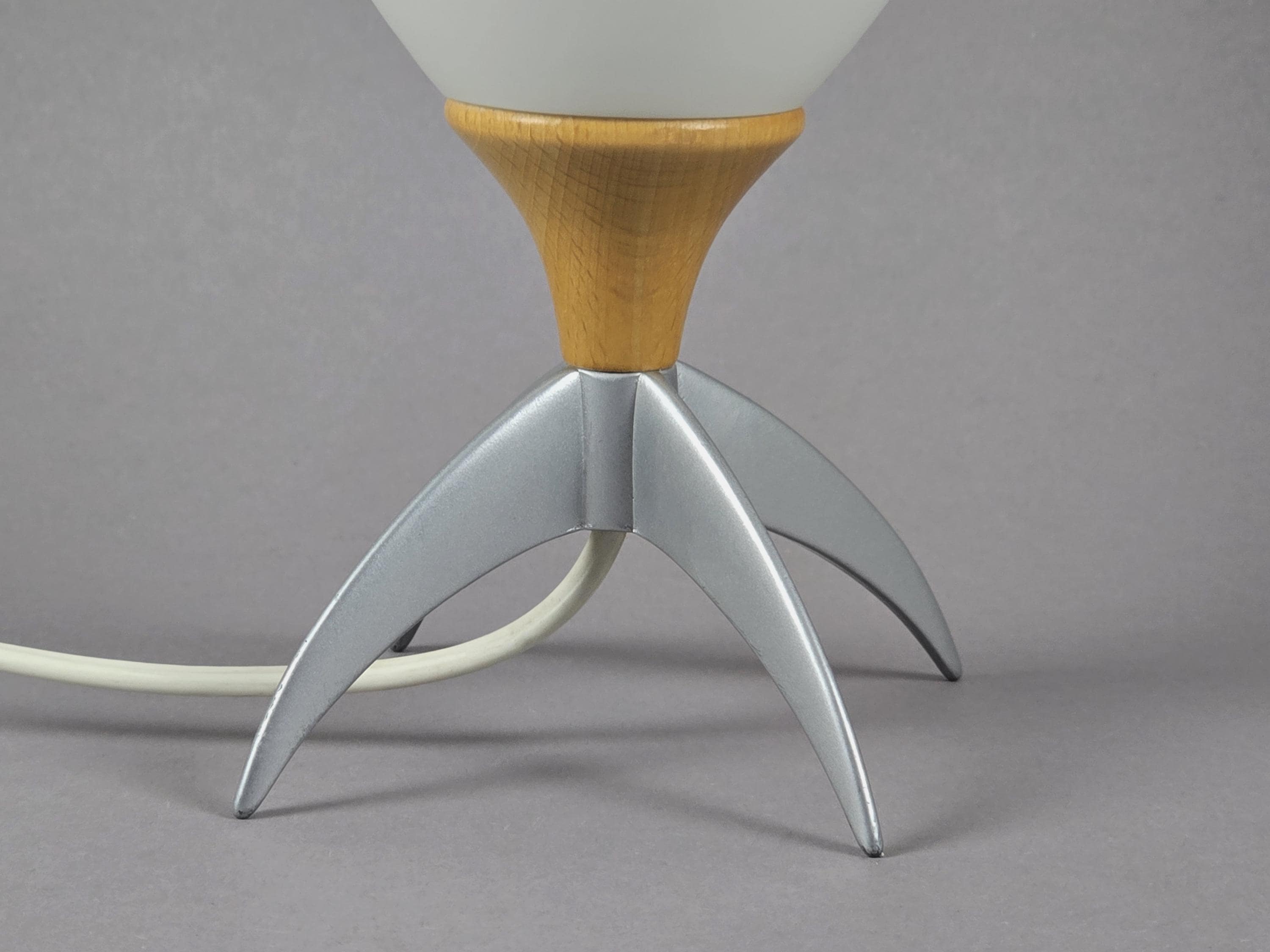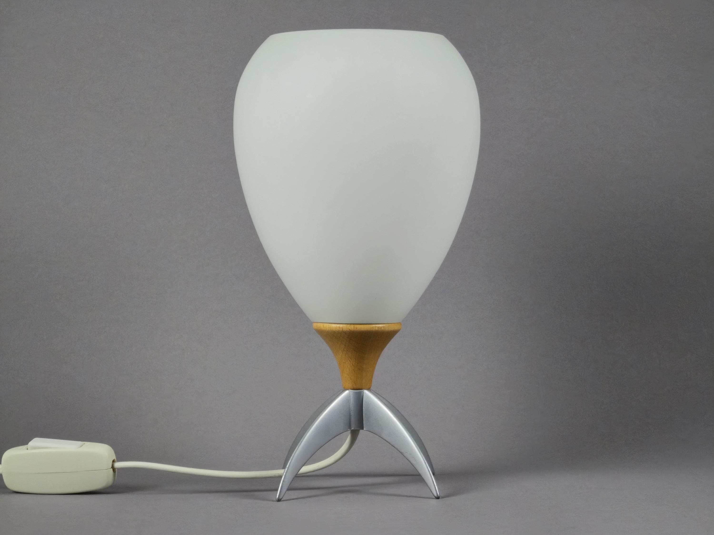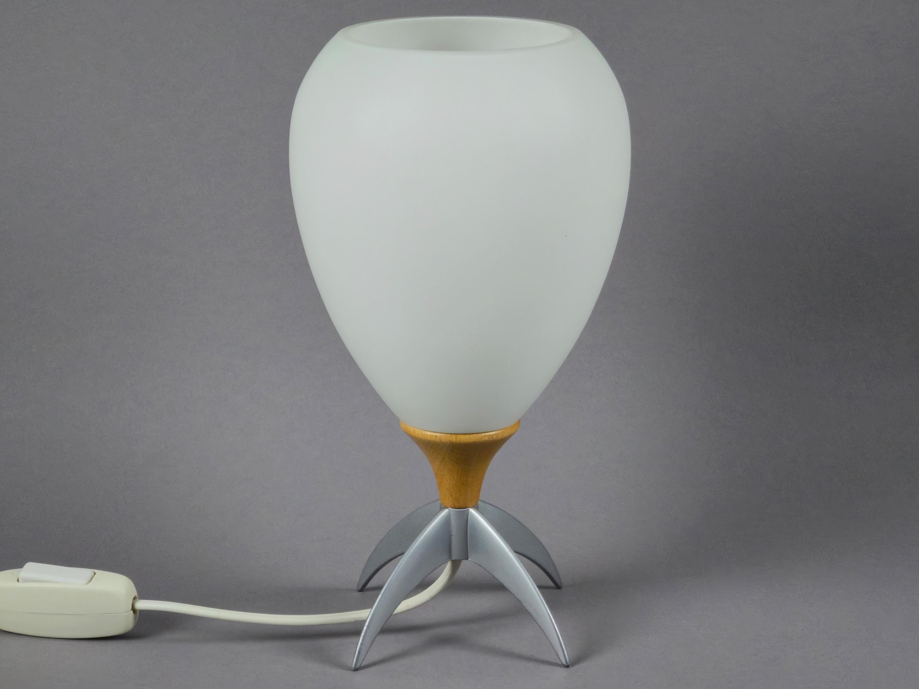 Vintage 1990s postmodern rocket-shaped opaline glass mushroom table lamp. The design is characterized by its space-age aesthetic, combining a white opaline glass shade with a base made of wood and silver coated metal.