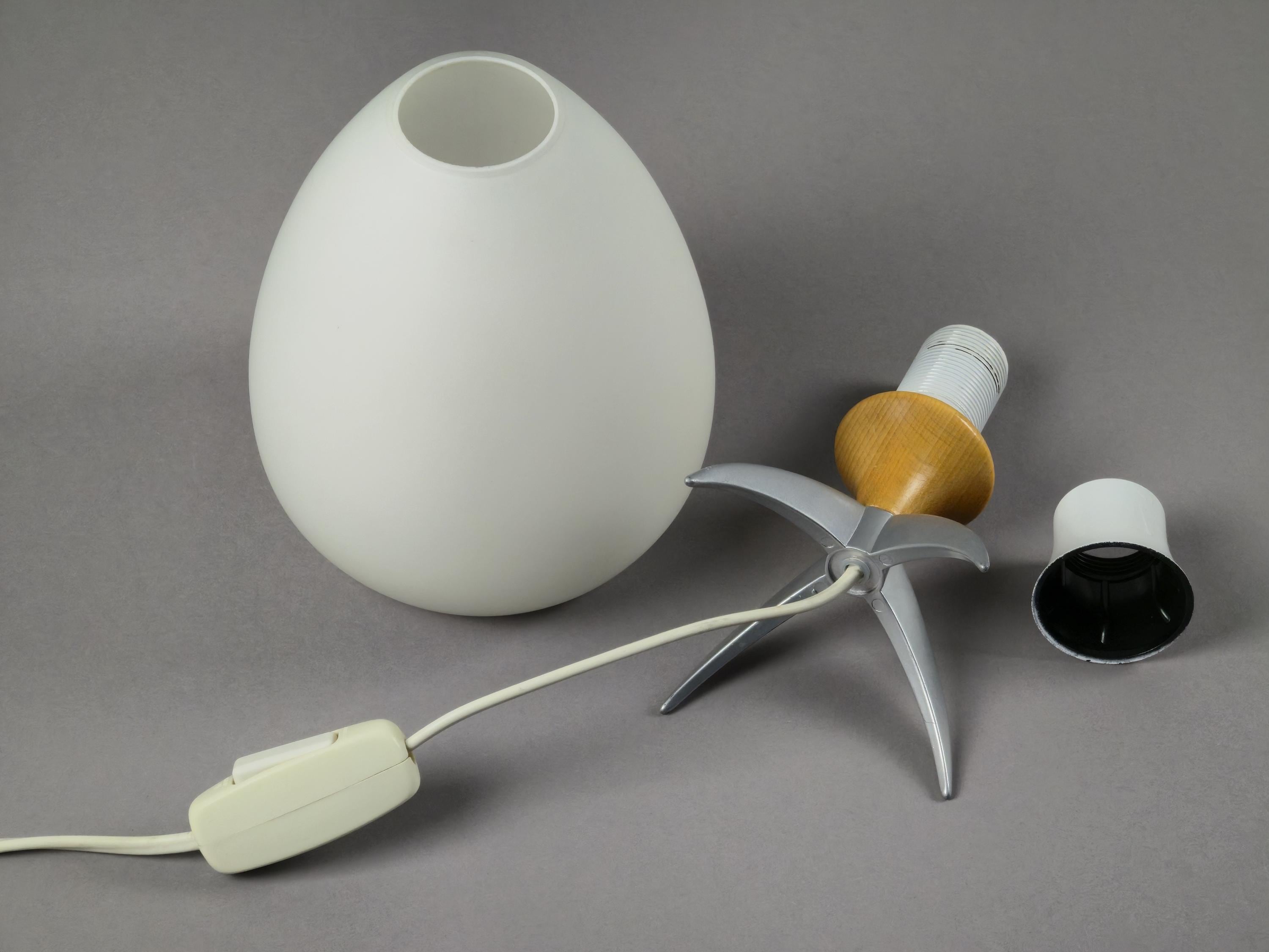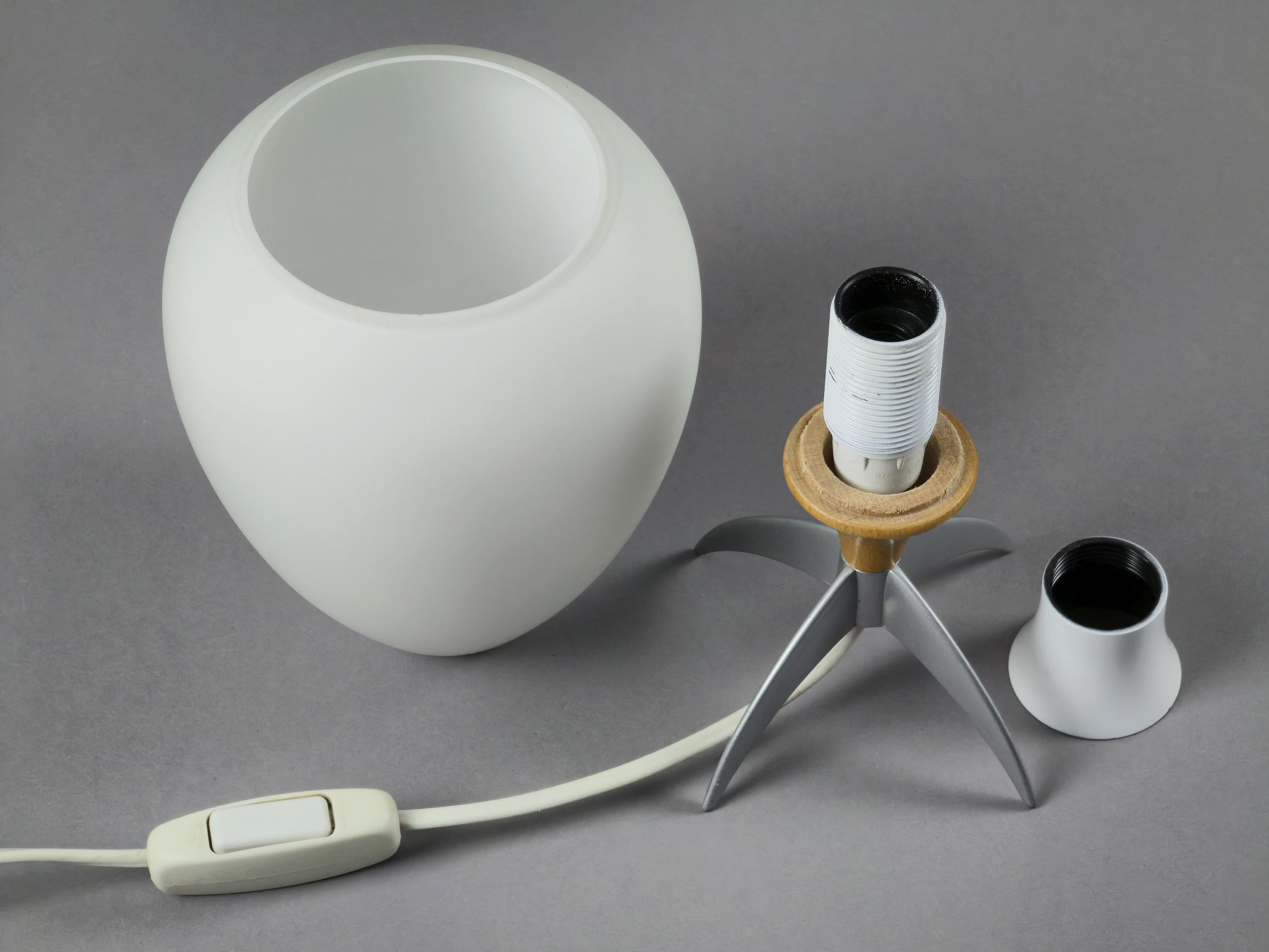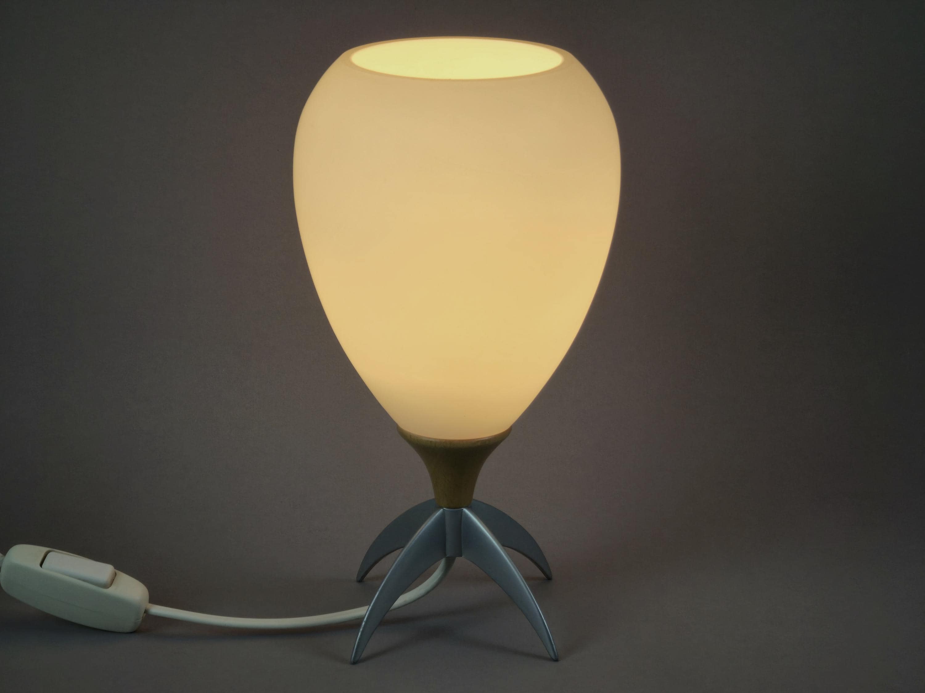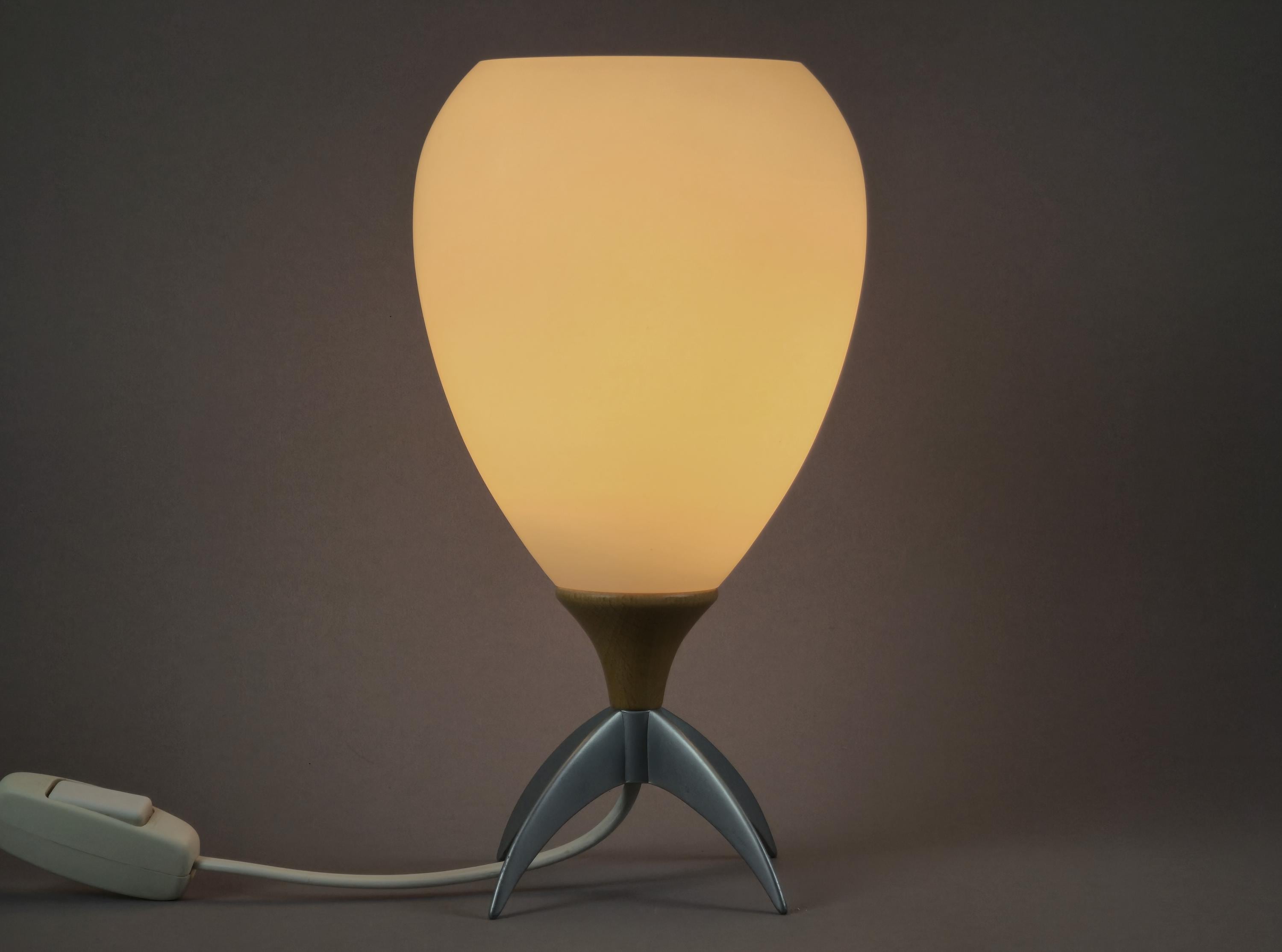 Vintage 1990s postmodern rocket-shaped opaline glass mushroom table lamp. The design is characterized by its space-age aesthetic, combining a white opaline glass shade with a base made of wood and silver coated metal.