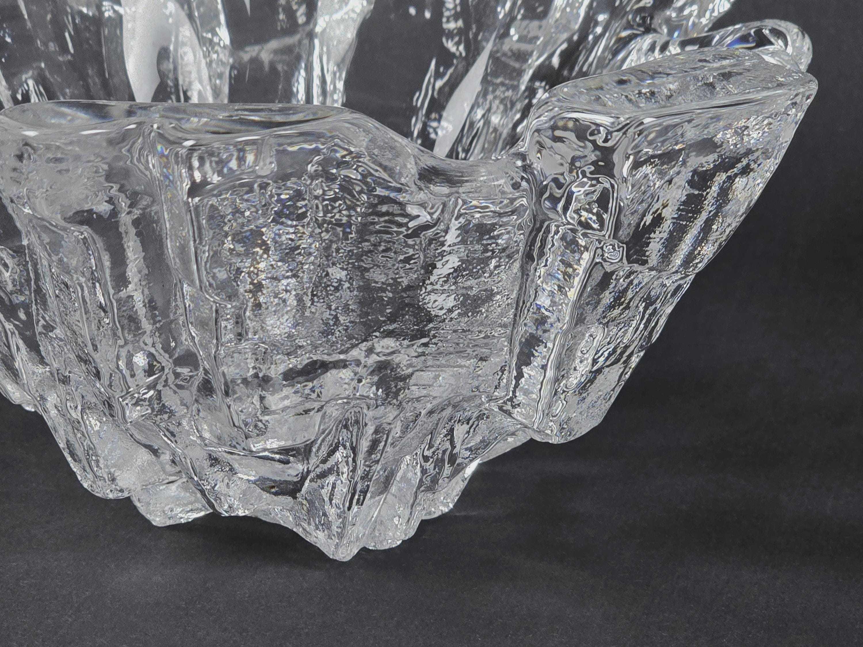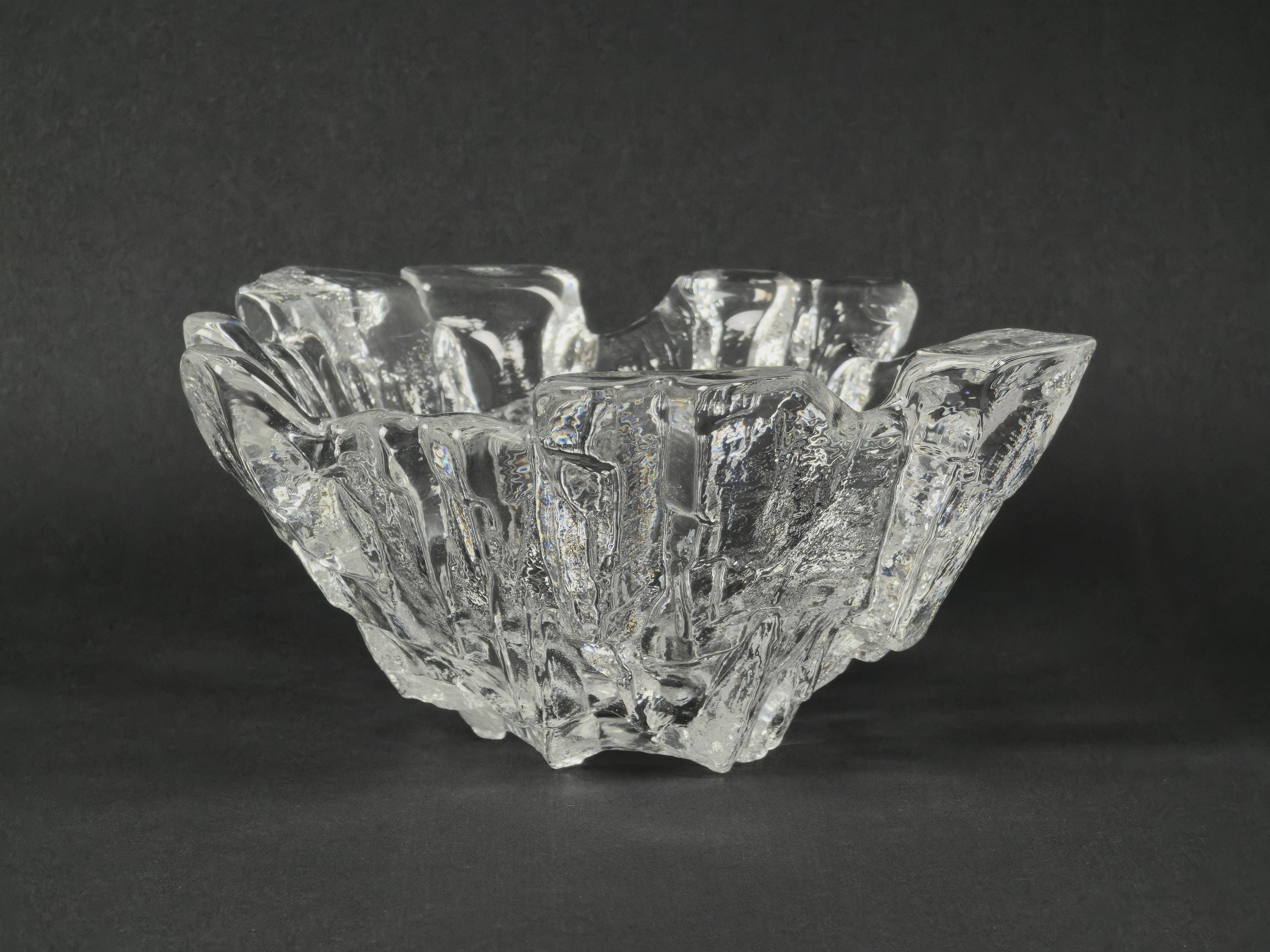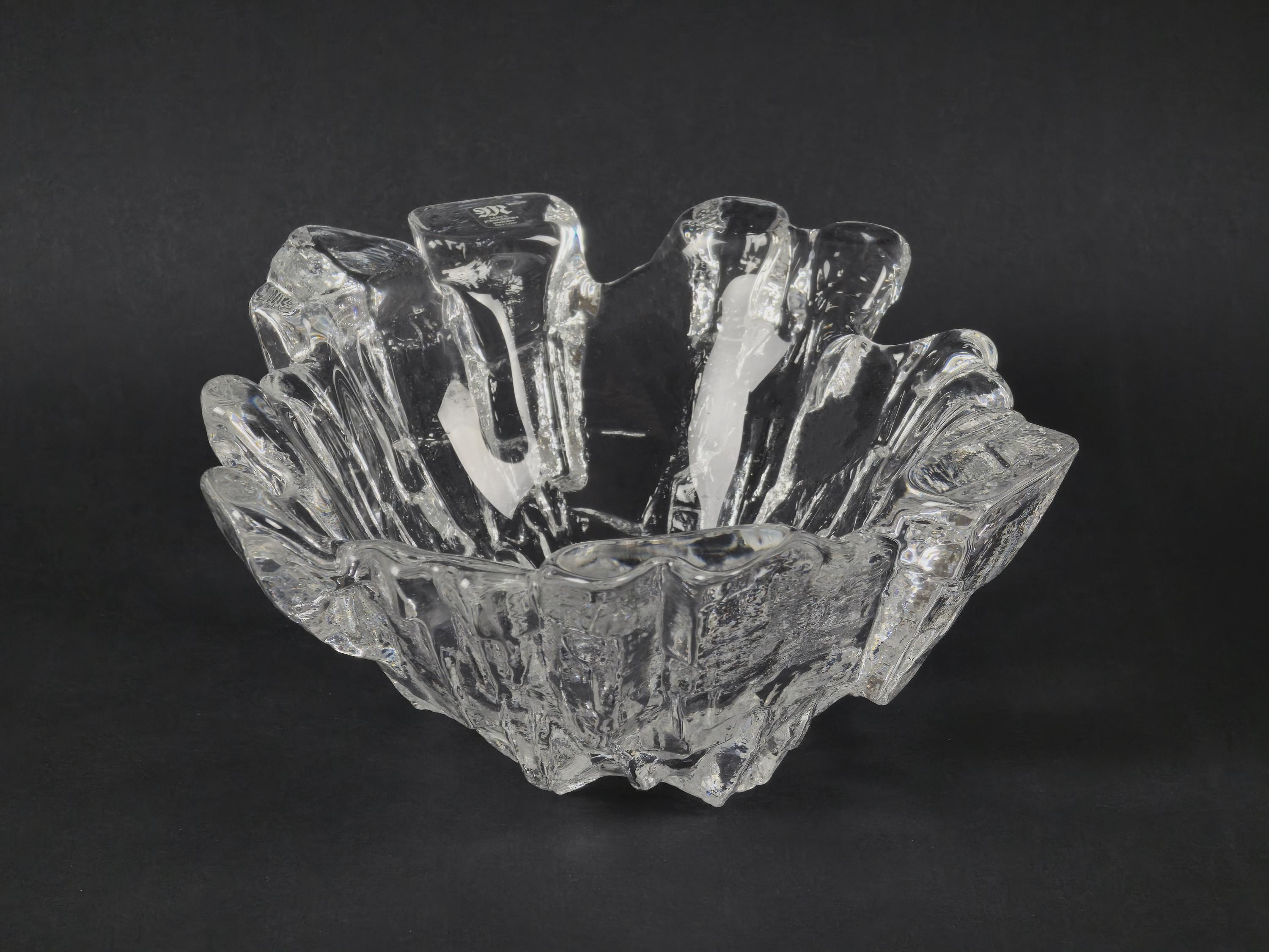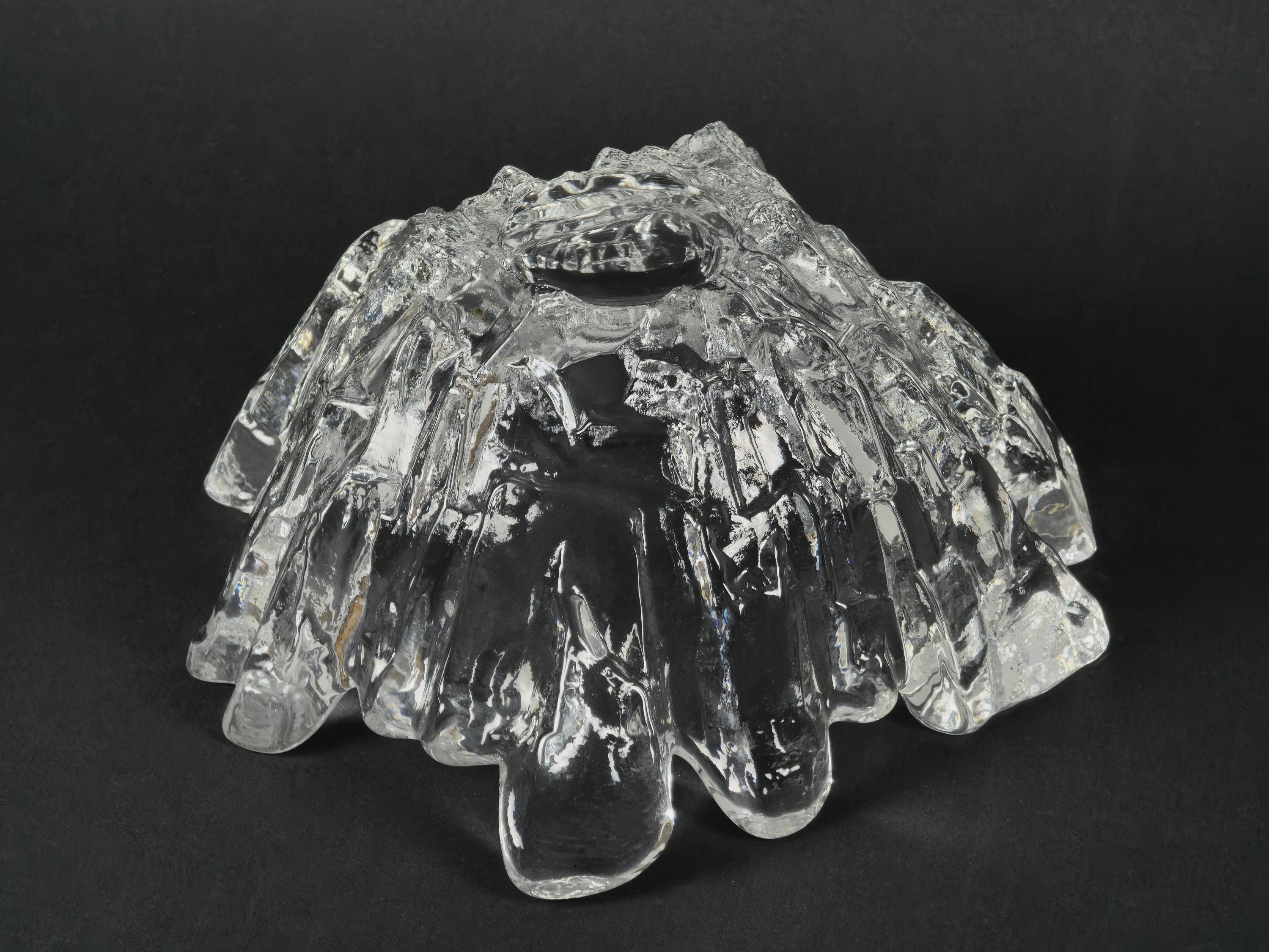 Vintage 1970s Swedish mid-century crystal glass bowl by Mats Jonasson for Målerås Glassworks, Sweden. It is known as the "ISAK" or "Frozen Ice" bowl due to its modernist, abstract design with jagged, textured edges that give it an ice-like appearance. The design is Scandinavian Modernist or Brutalist, known for a heavy, solid feel and an irregular shape.