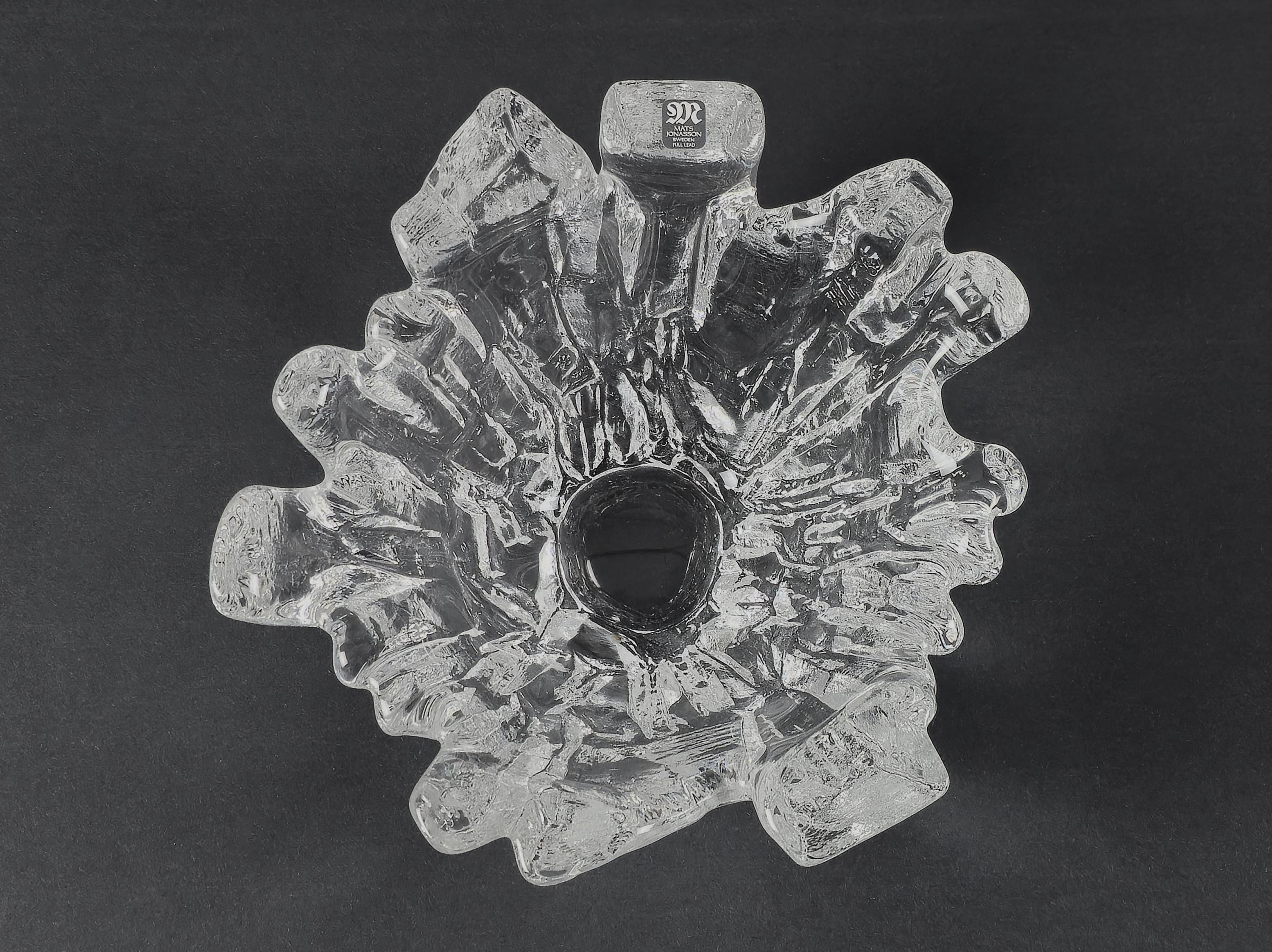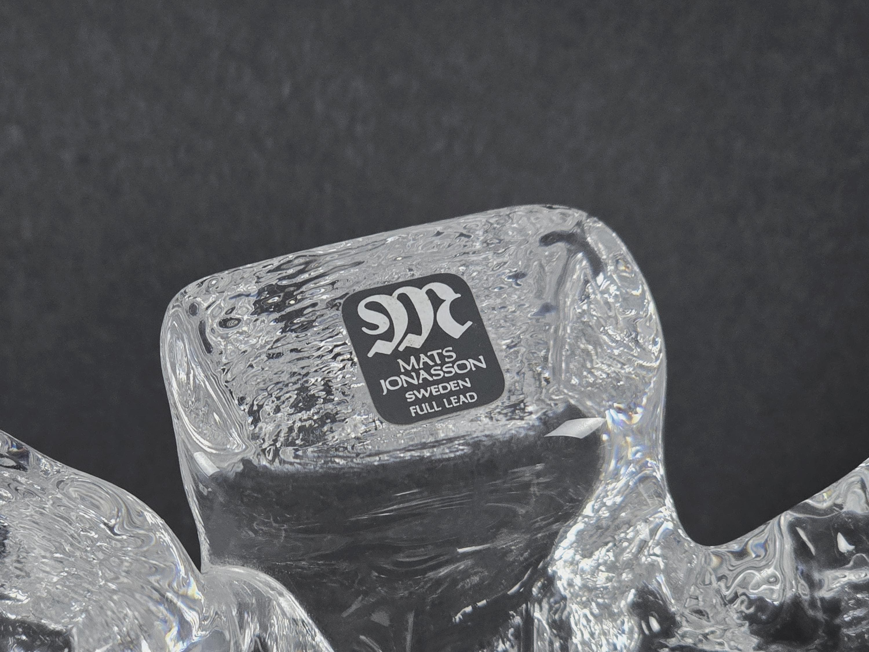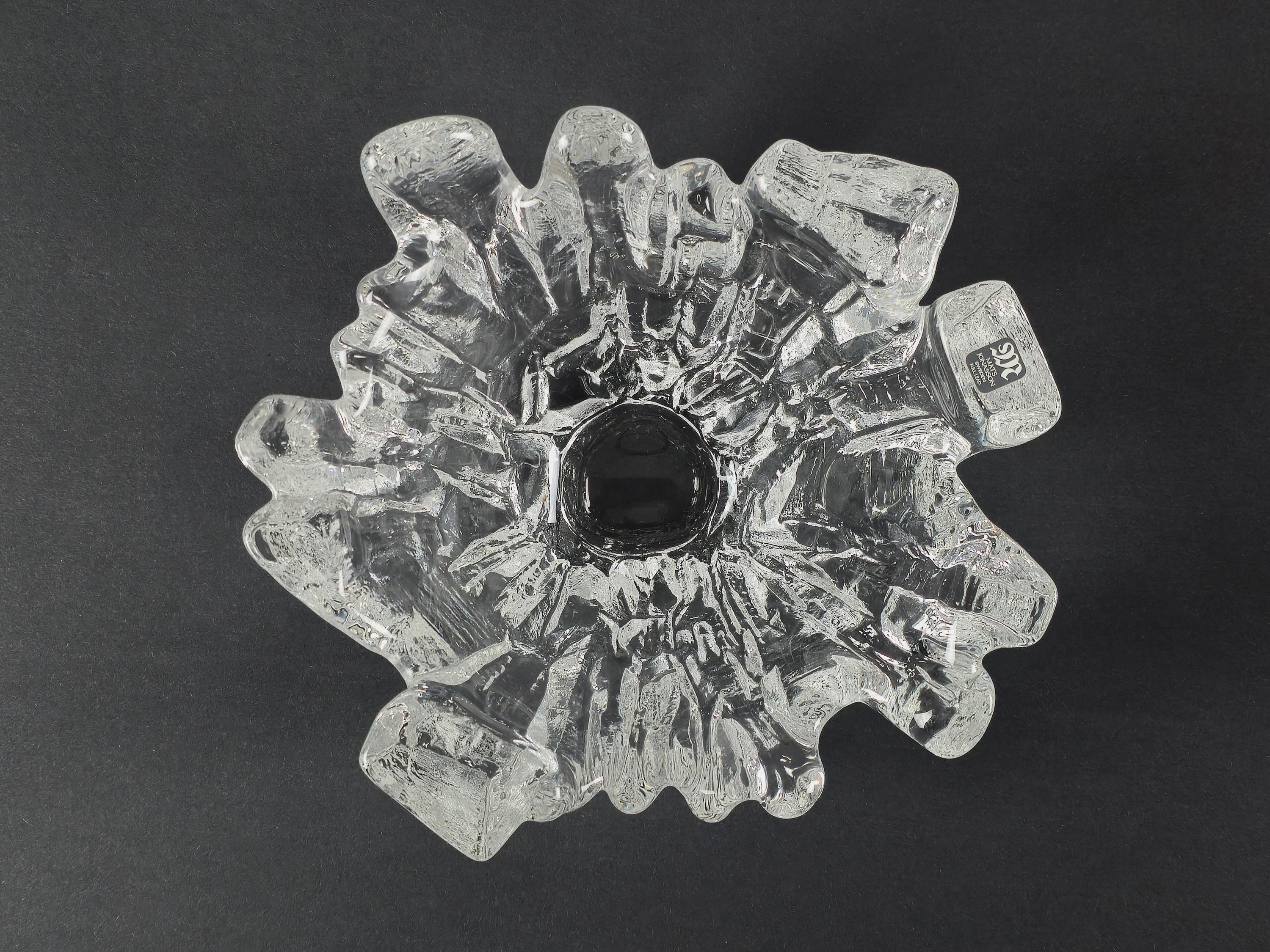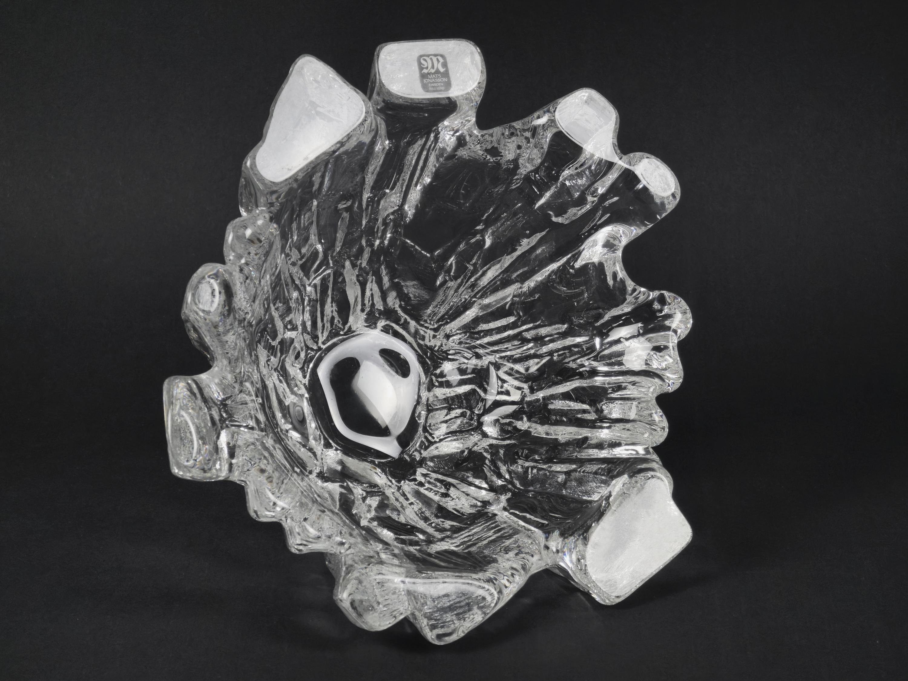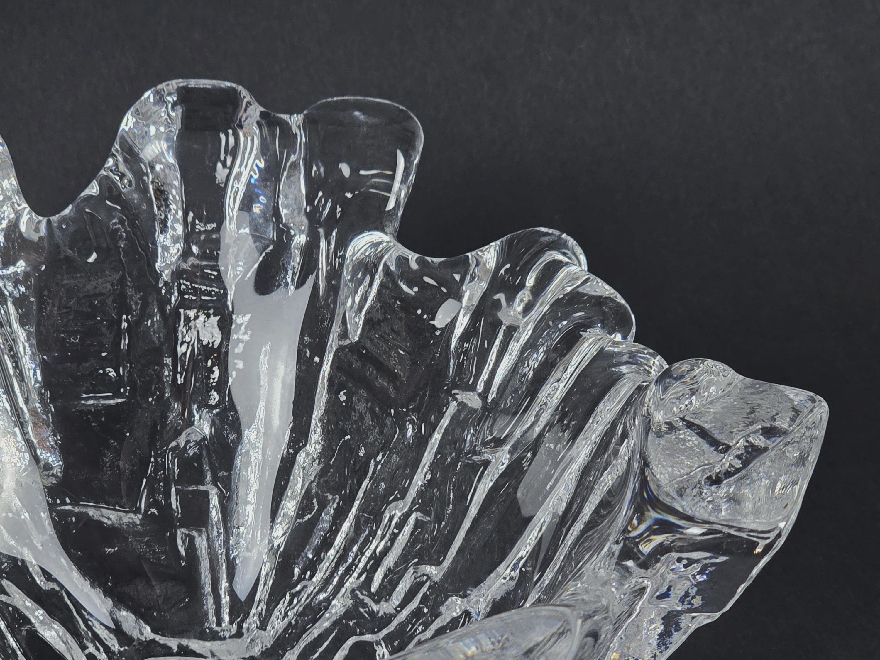 Vintage 1970s Swedish mid-century crystal glass bowl by Mats Jonasson for Målerås Glassworks, Sweden. It is known as the "ISAK" or "Frozen Ice" bowl due to its modernist, abstract design with jagged, textured edges that give it an ice-like appearance. The design is Scandinavian Modernist or Brutalist, known for a heavy, solid feel and an irregular shape.
