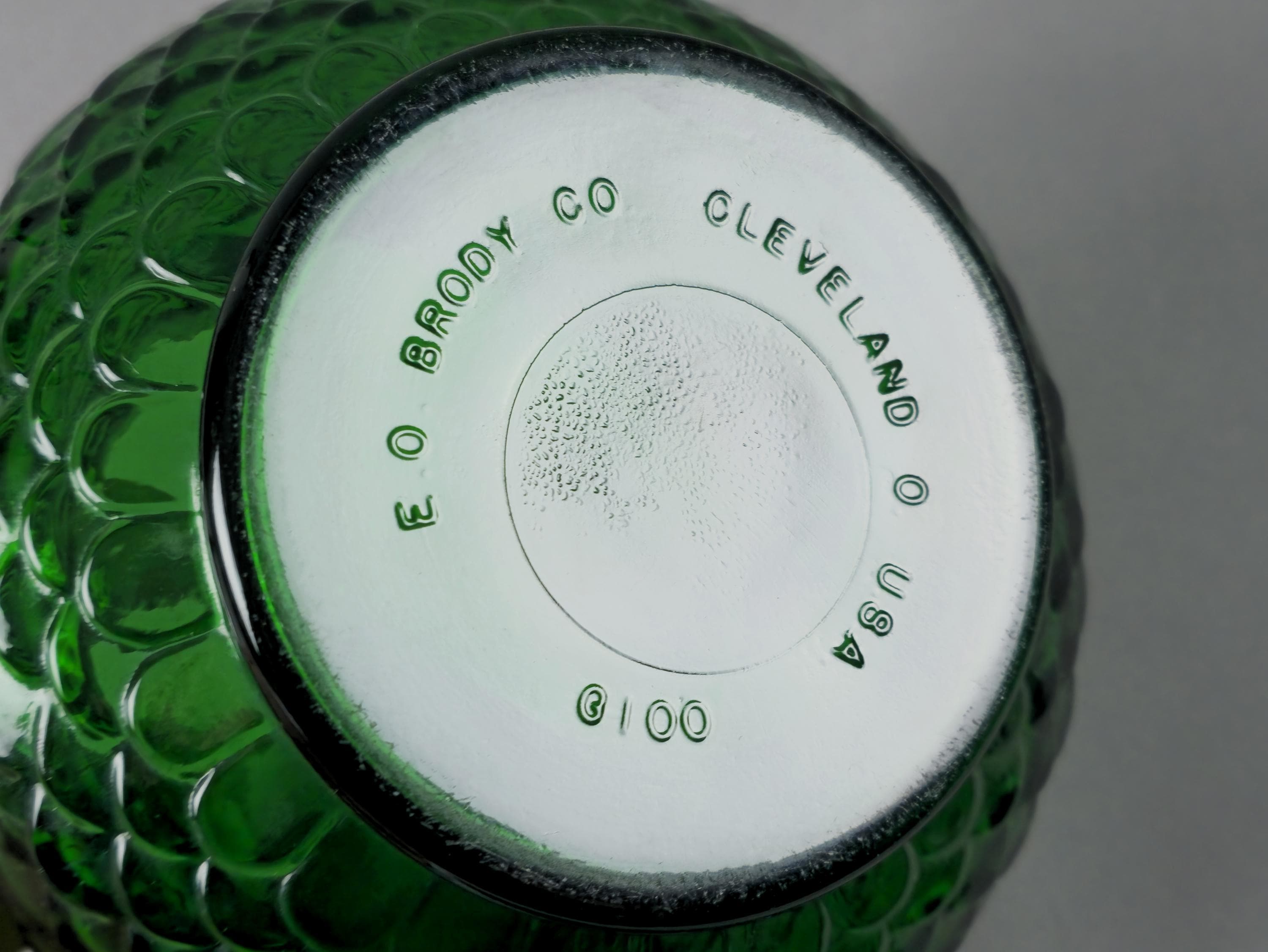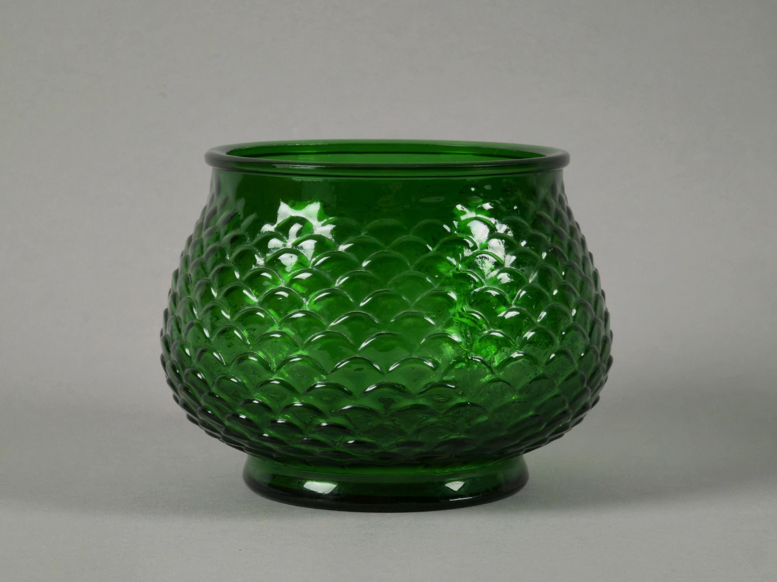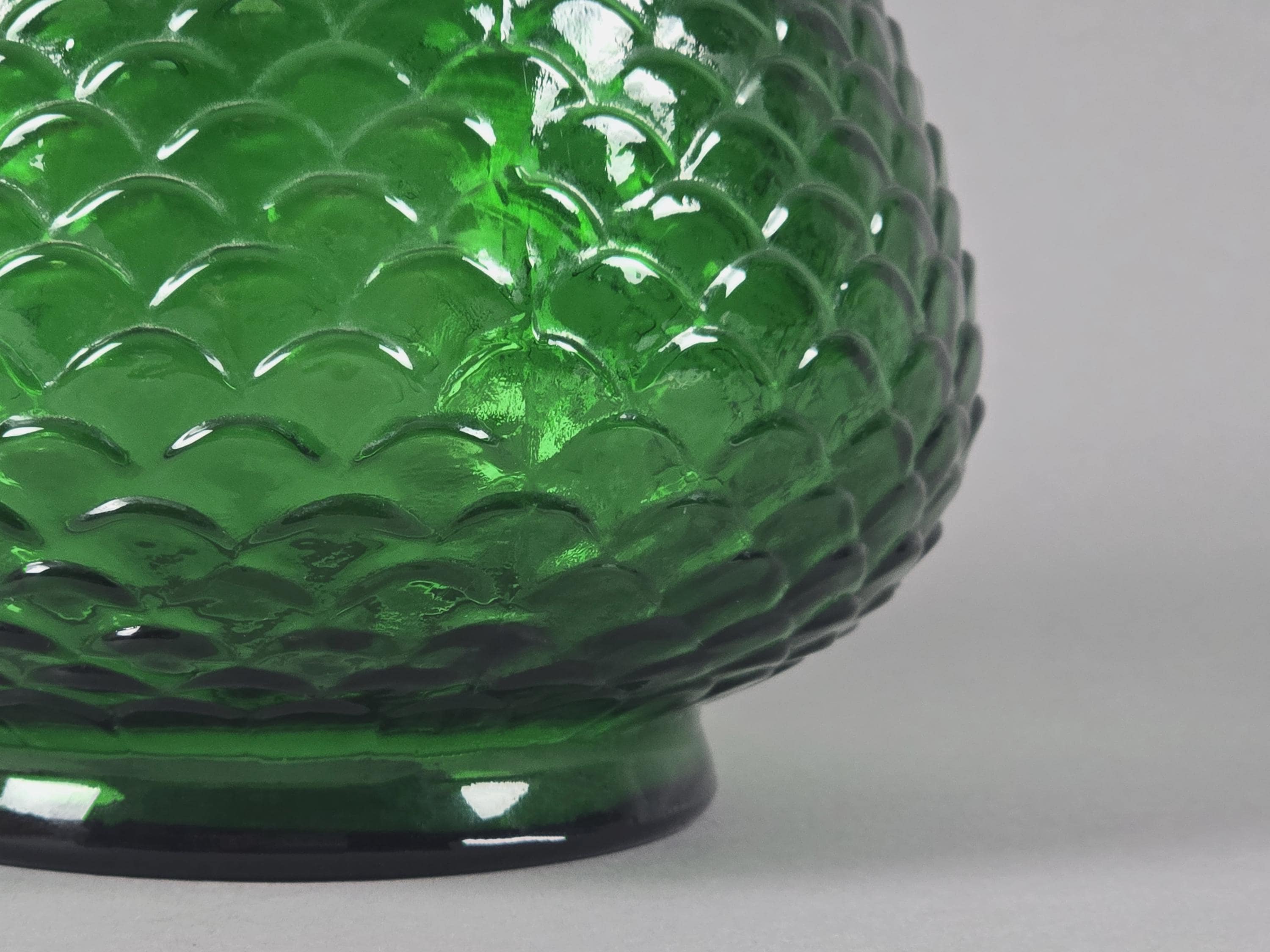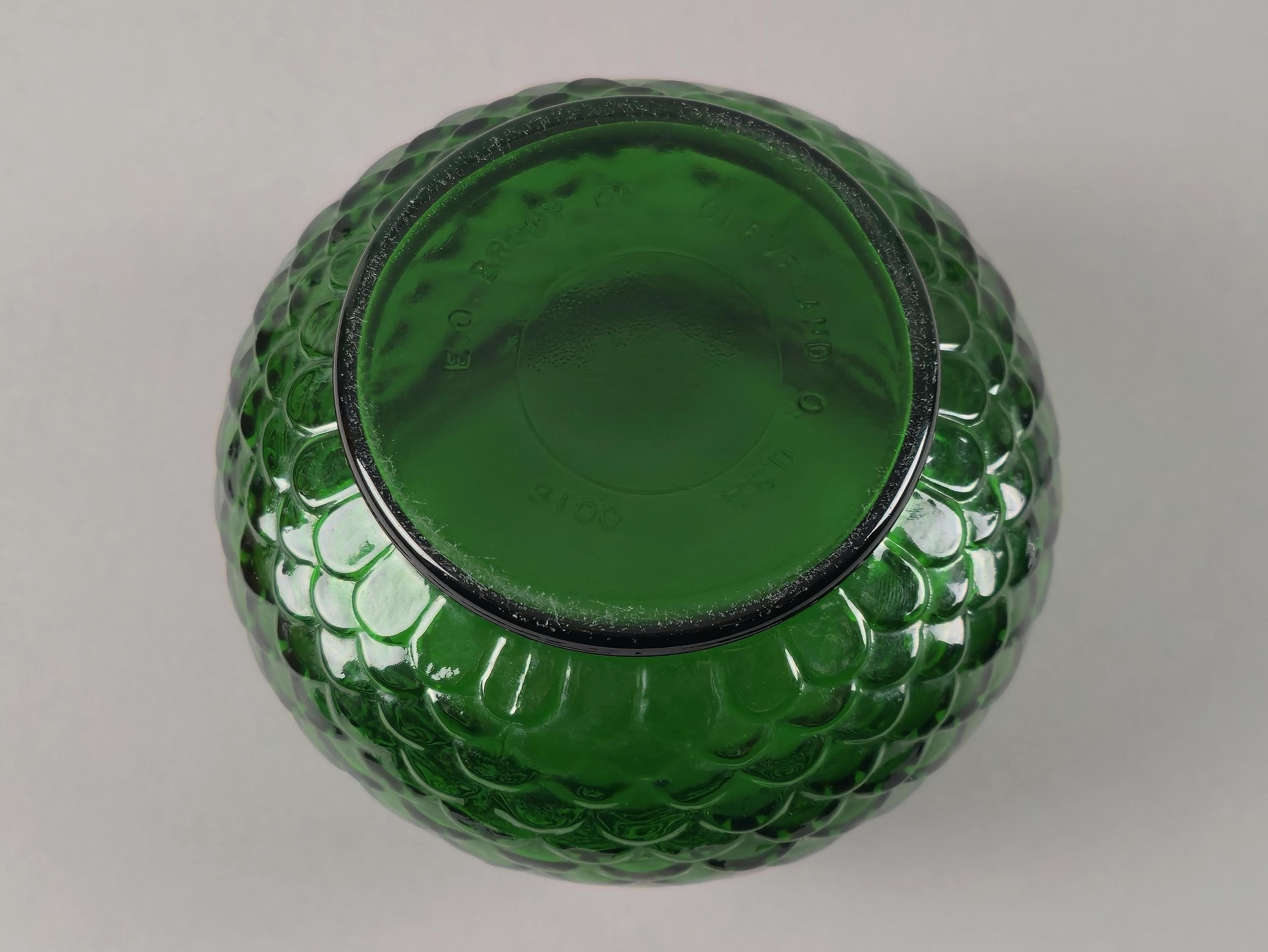 Vintage 1960s emerald-green glass planter vase in a fish scale or scalloped pattern by E. O. Brody Co. Cleveland, Ohio. The deep green color and the textured scalloped design are characteristic of their Mid-Century Modern planters.