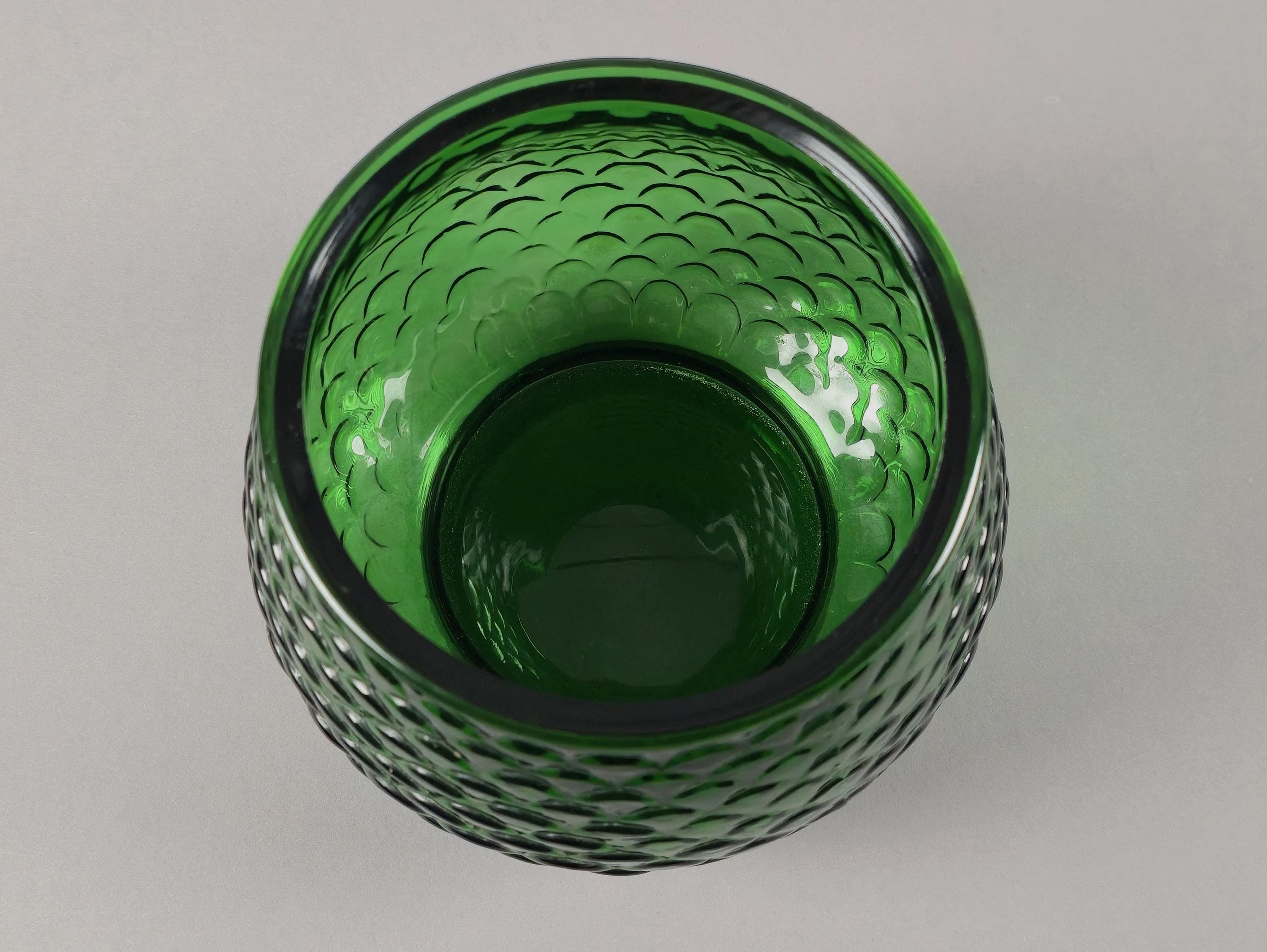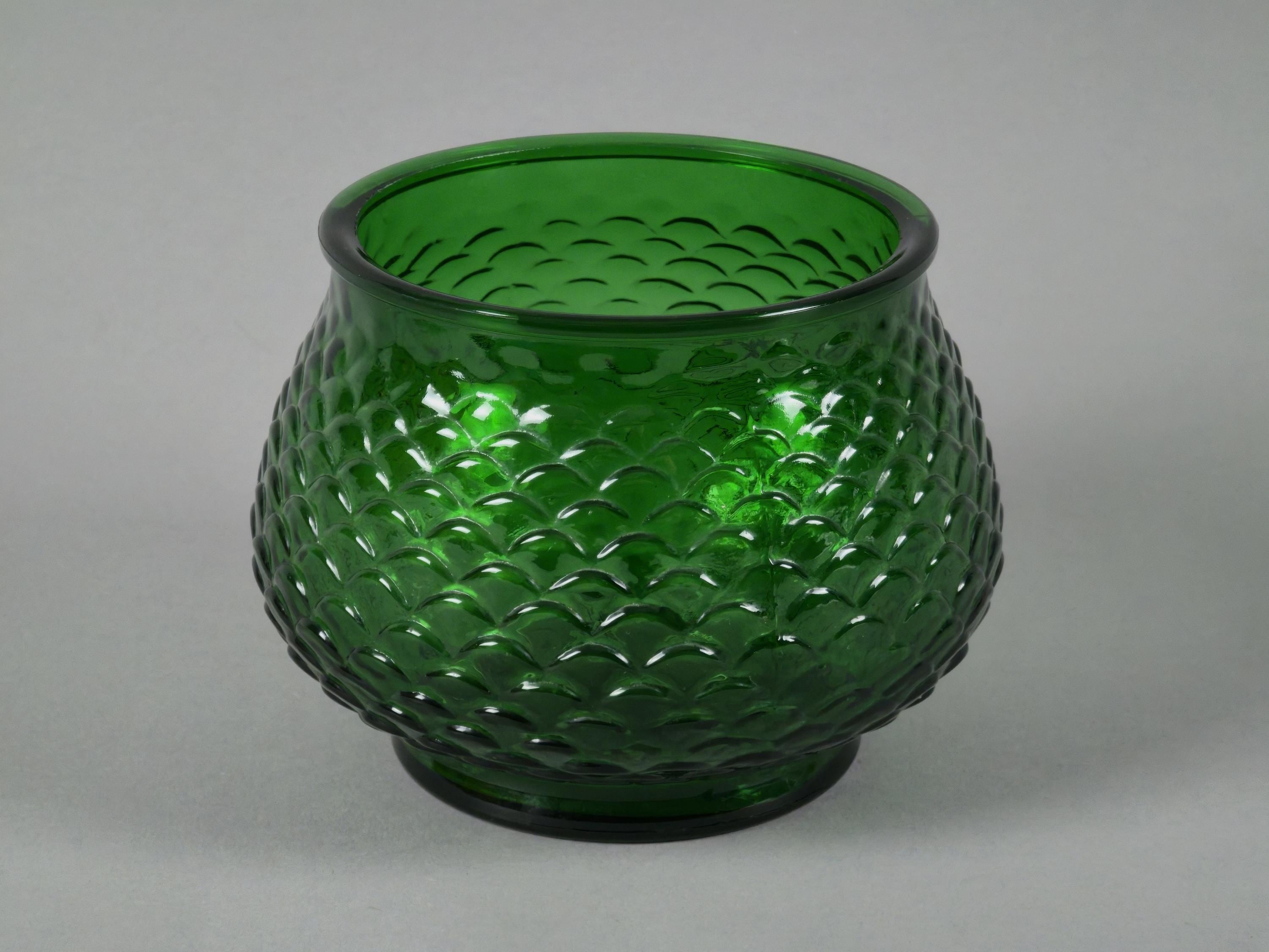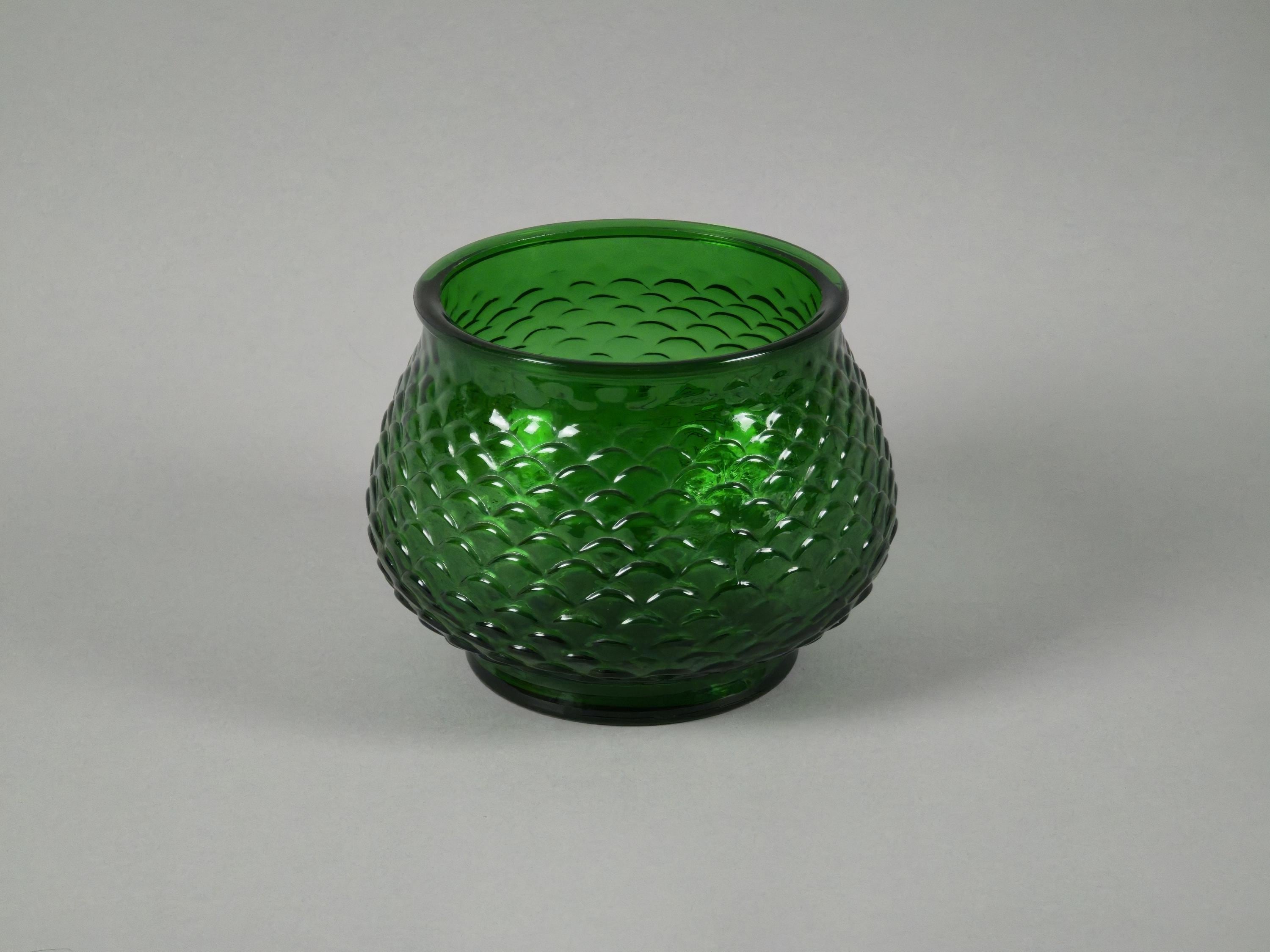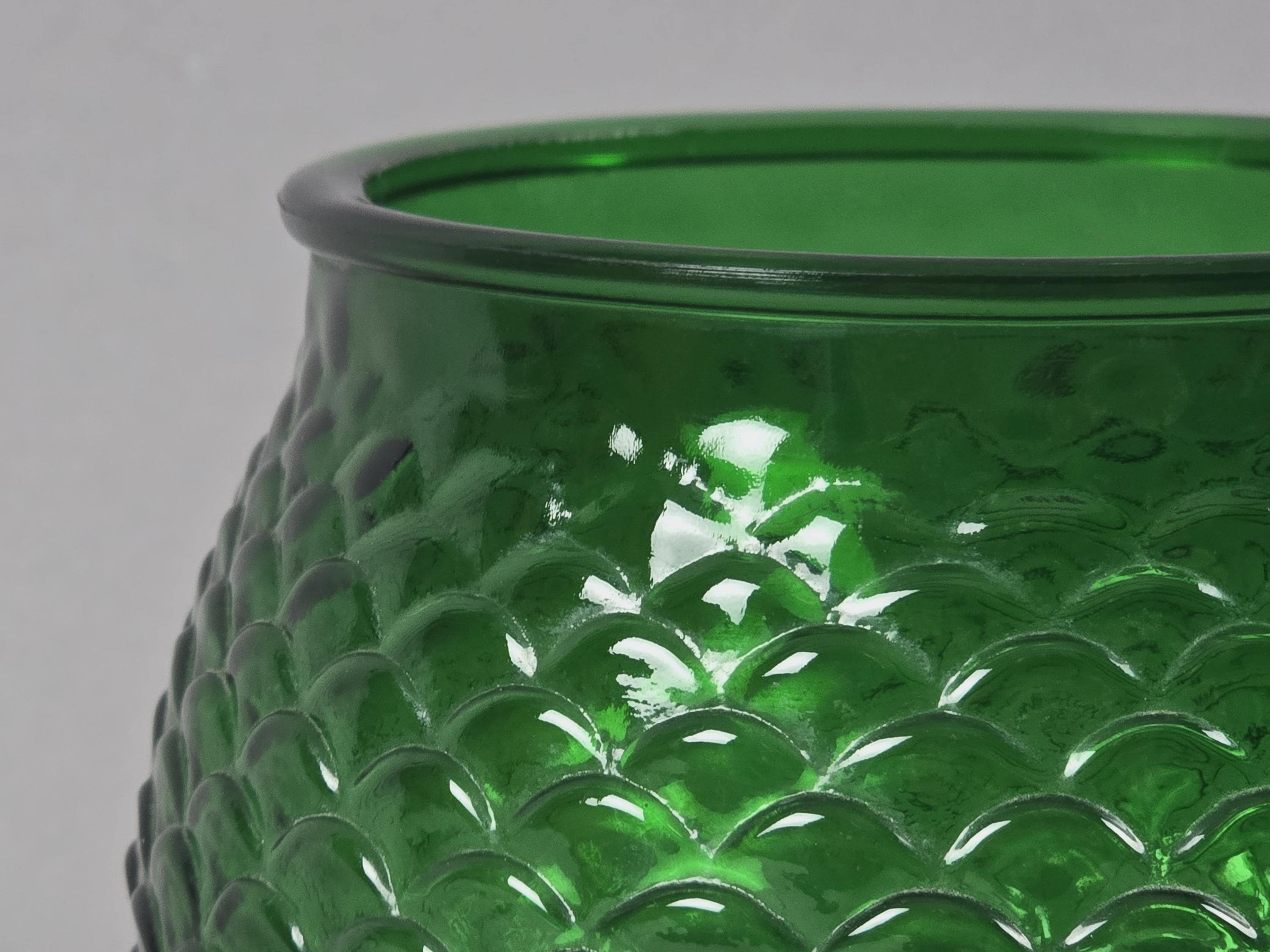 Vintage 1960s emerald-green glass planter vase in a fish scale or scalloped pattern by E. O. Brody Co. Cleveland, Ohio. The deep green color and the textured scalloped design are characteristic of their Mid-Century Modern planters.