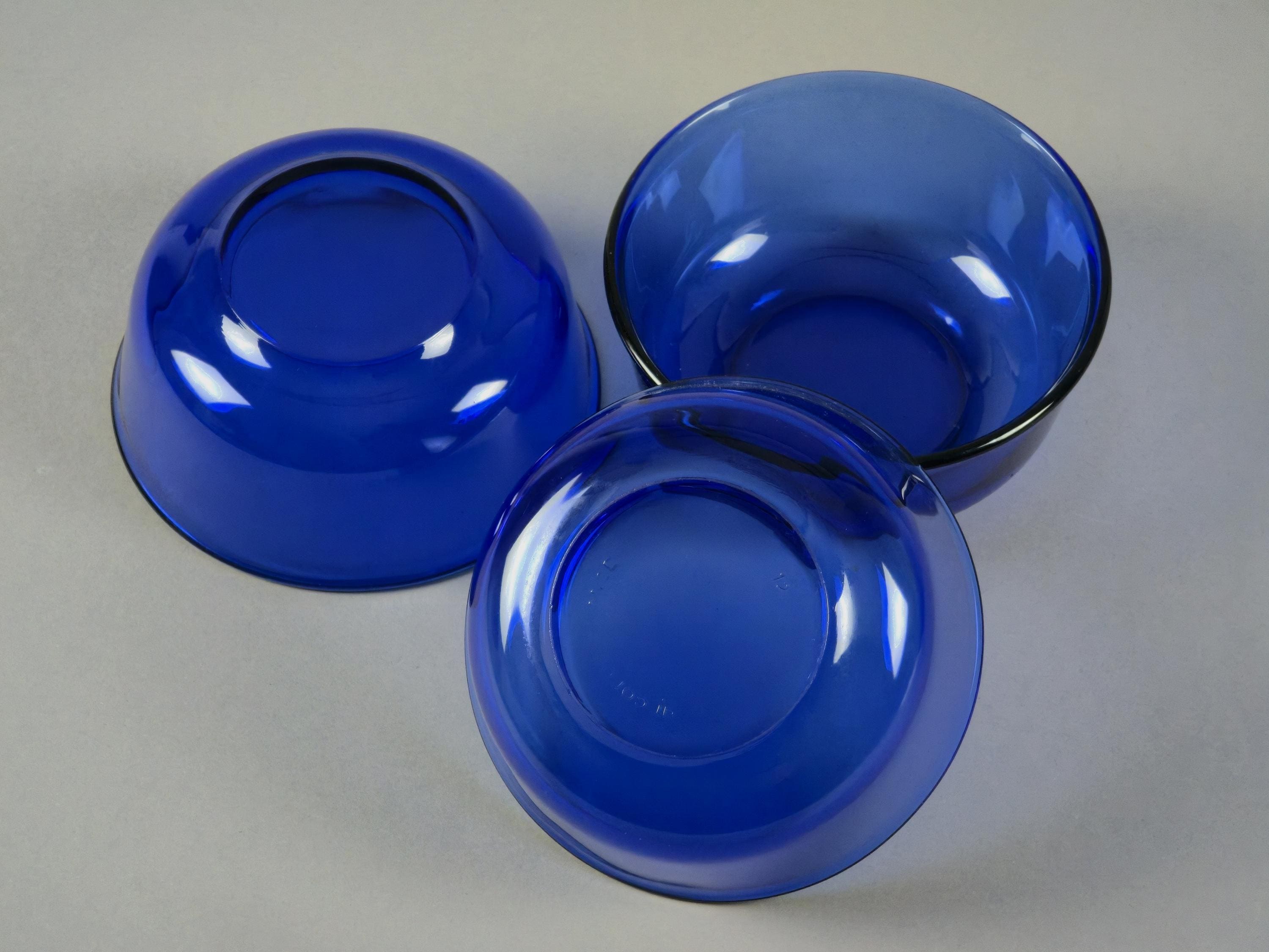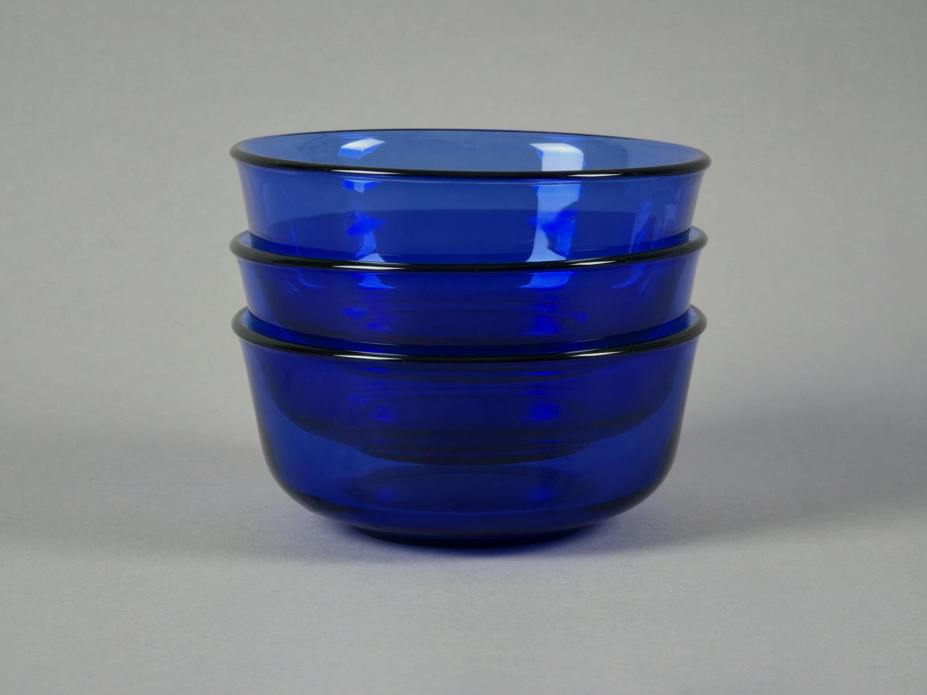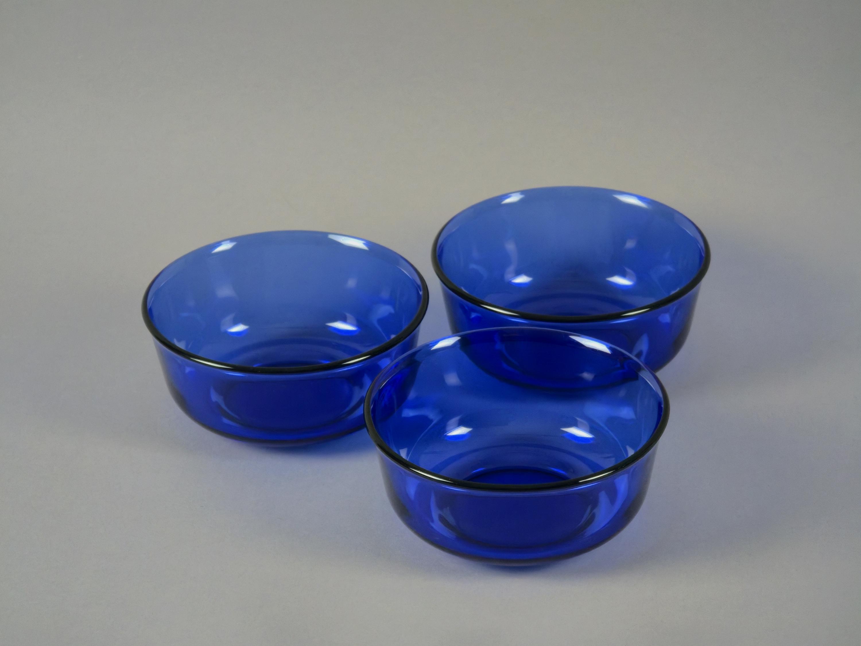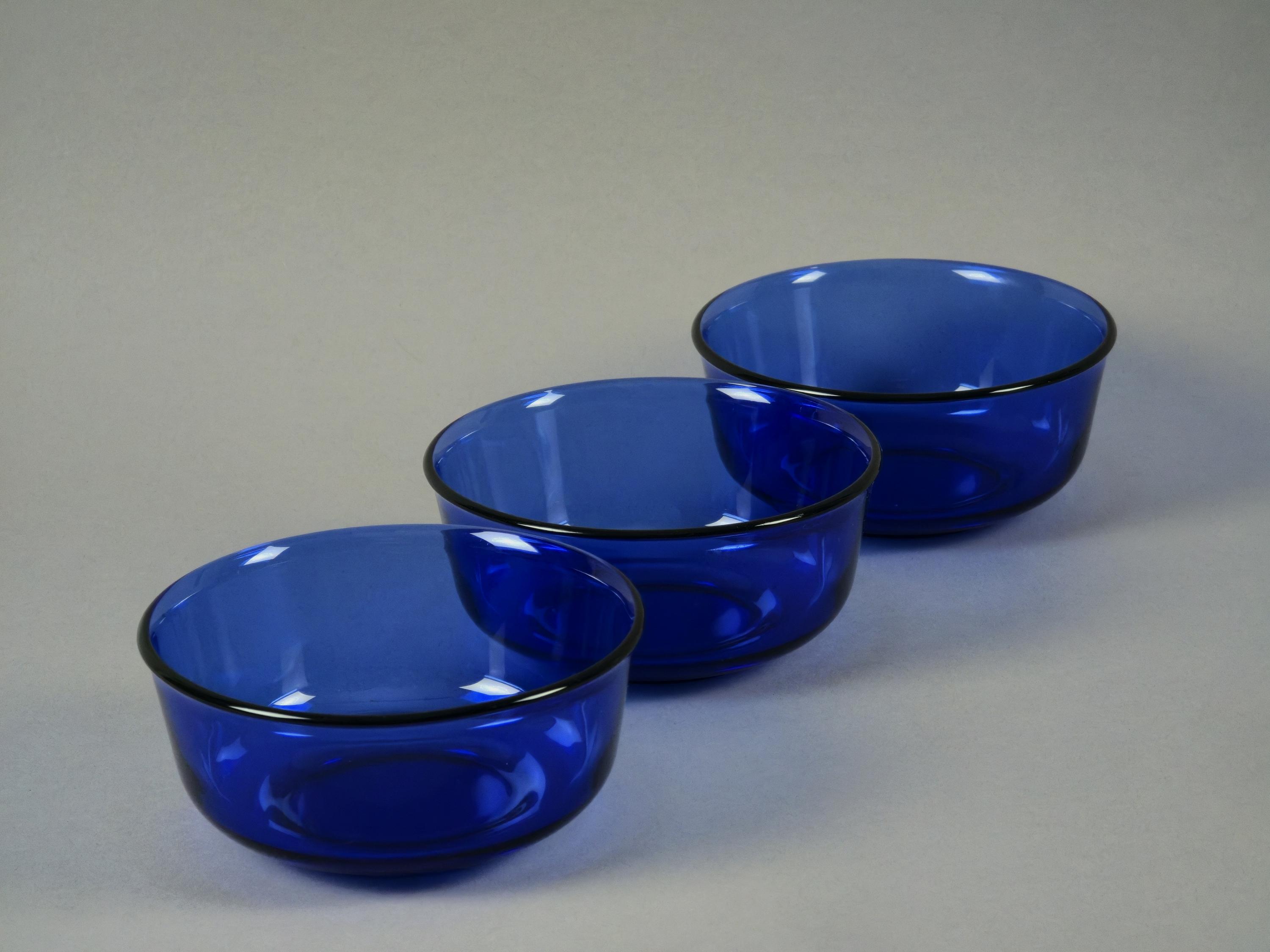 Vintage 1970s Set Of 3 Arcoroc France Cobalt-Blue Stackable Glass Bowls.