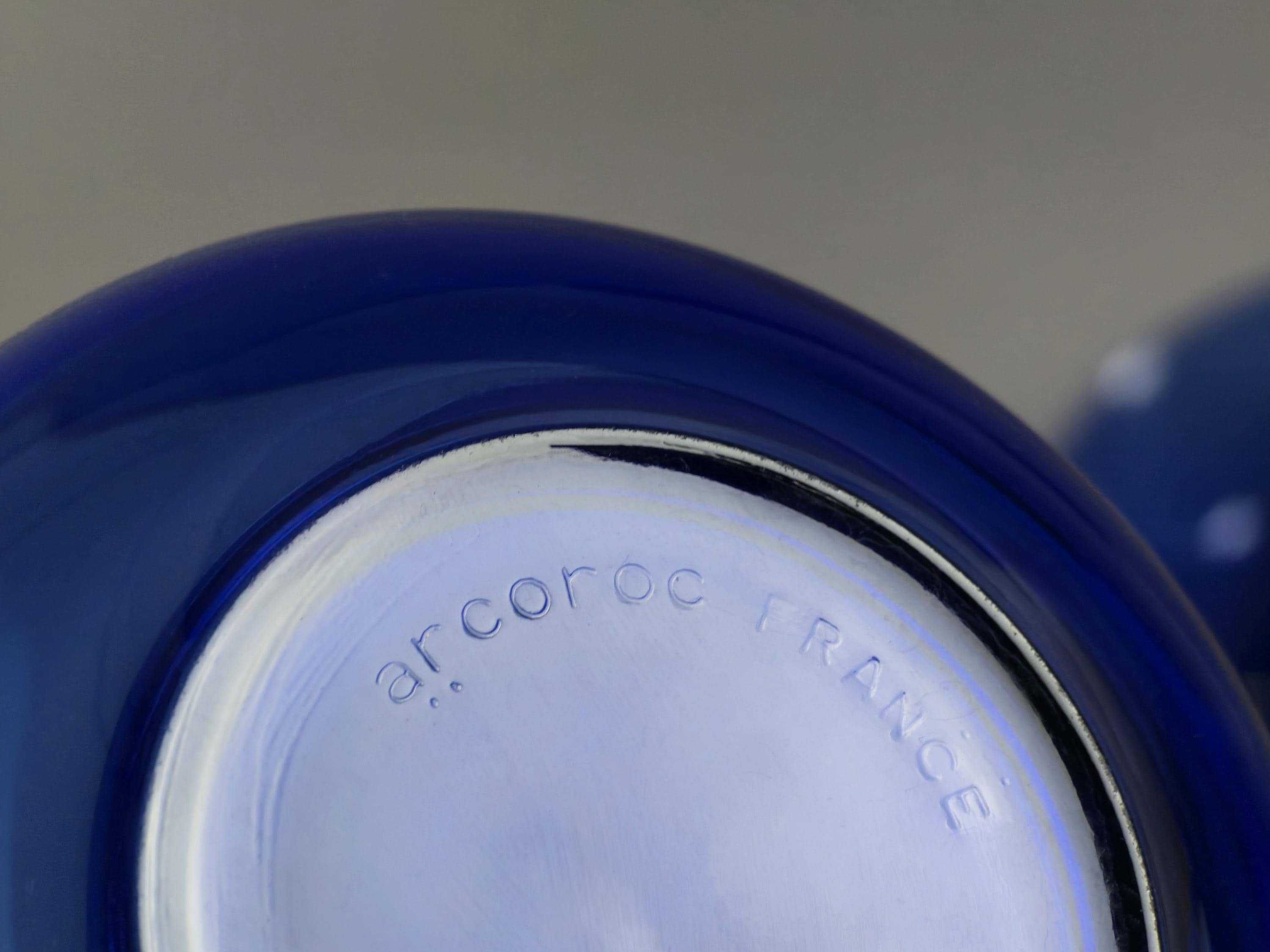 Vintage 1970s set of 3 blue glass tumblers in excellent condition. Arcoroc is known for manufacturing products from tempered glass (also known as fully toughened glass). This process makes the glass highly resistant to thermal shock, chipping, and breakage, making it very durable for everyday use.