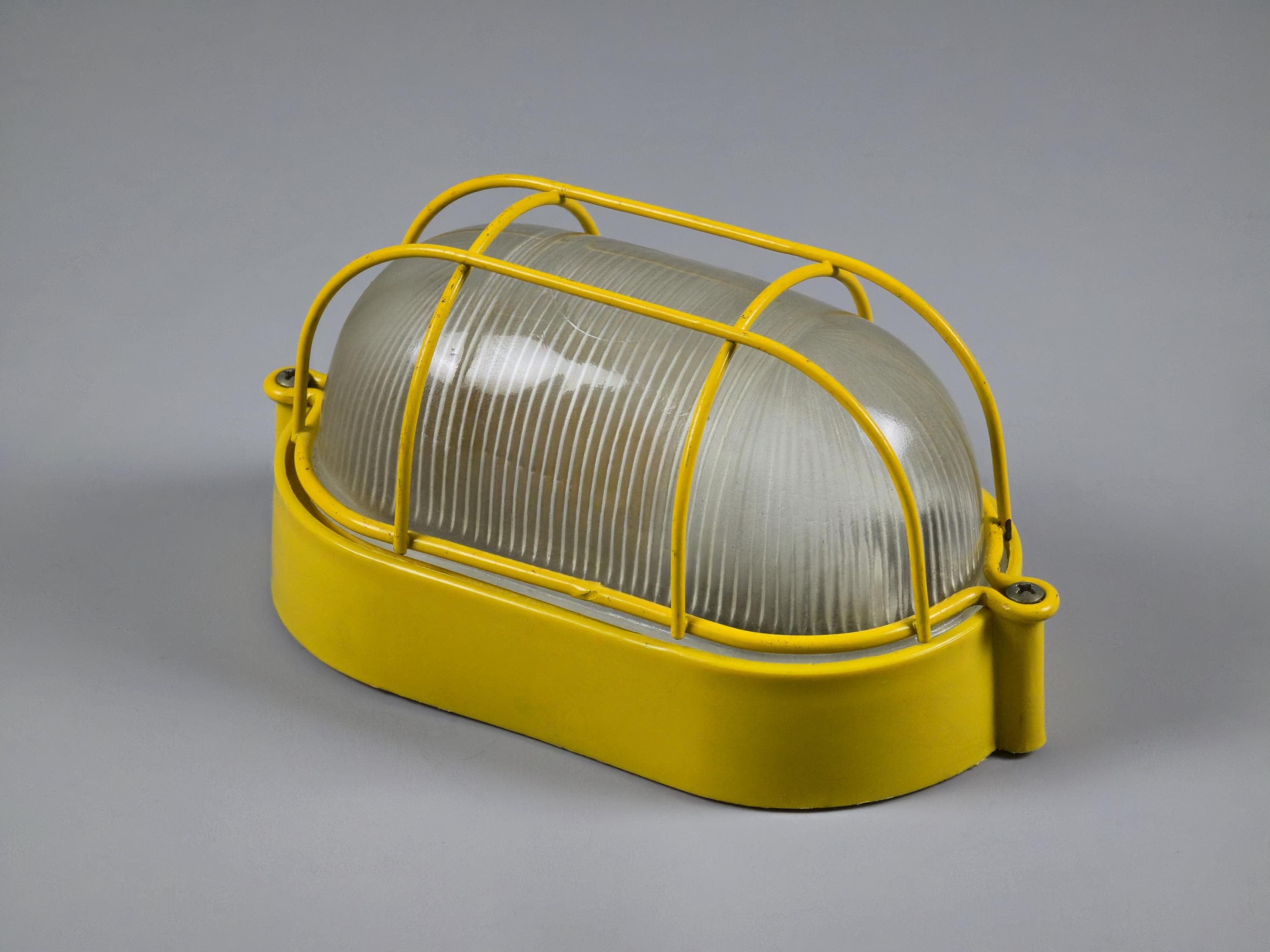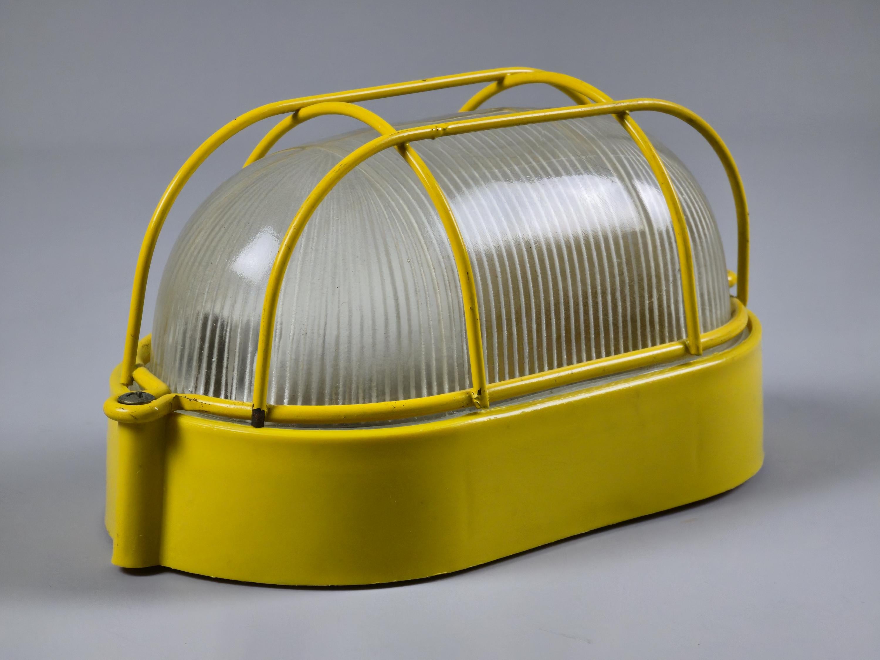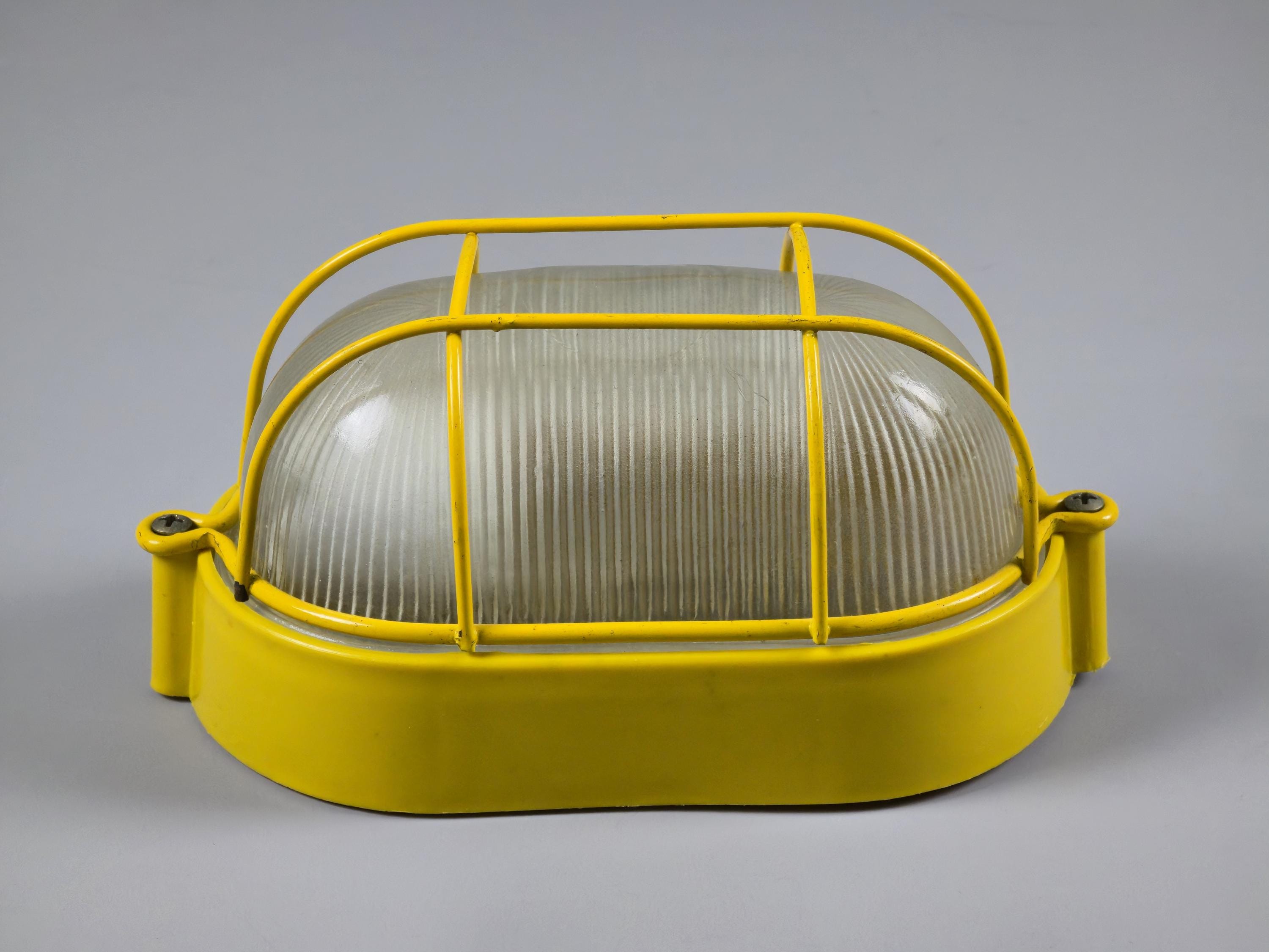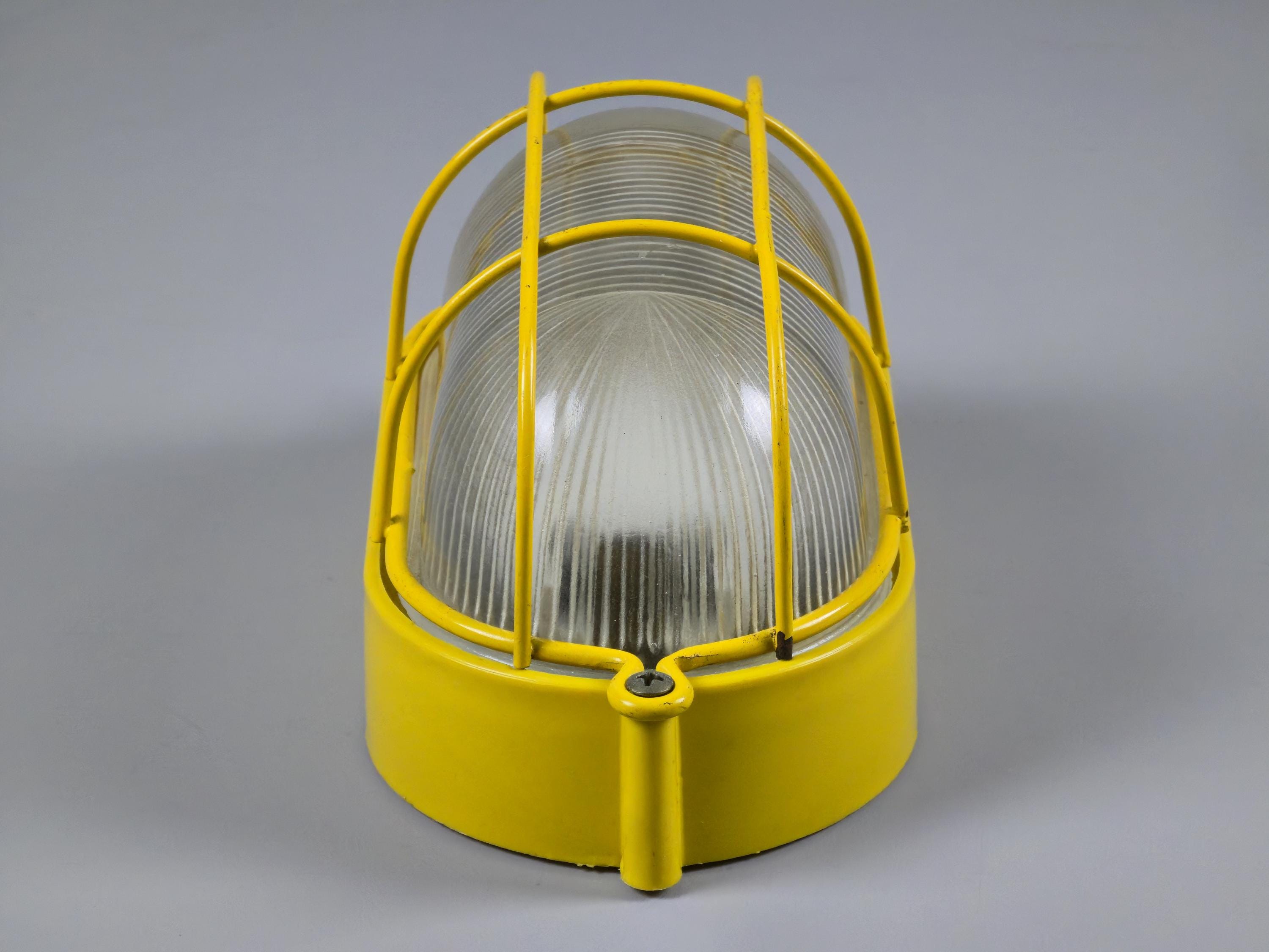 Vintage industrial design bulkhead wall light fixture from the 1980s with a yellow plastic base, metal casing, and a thick, ribbed glass shade.