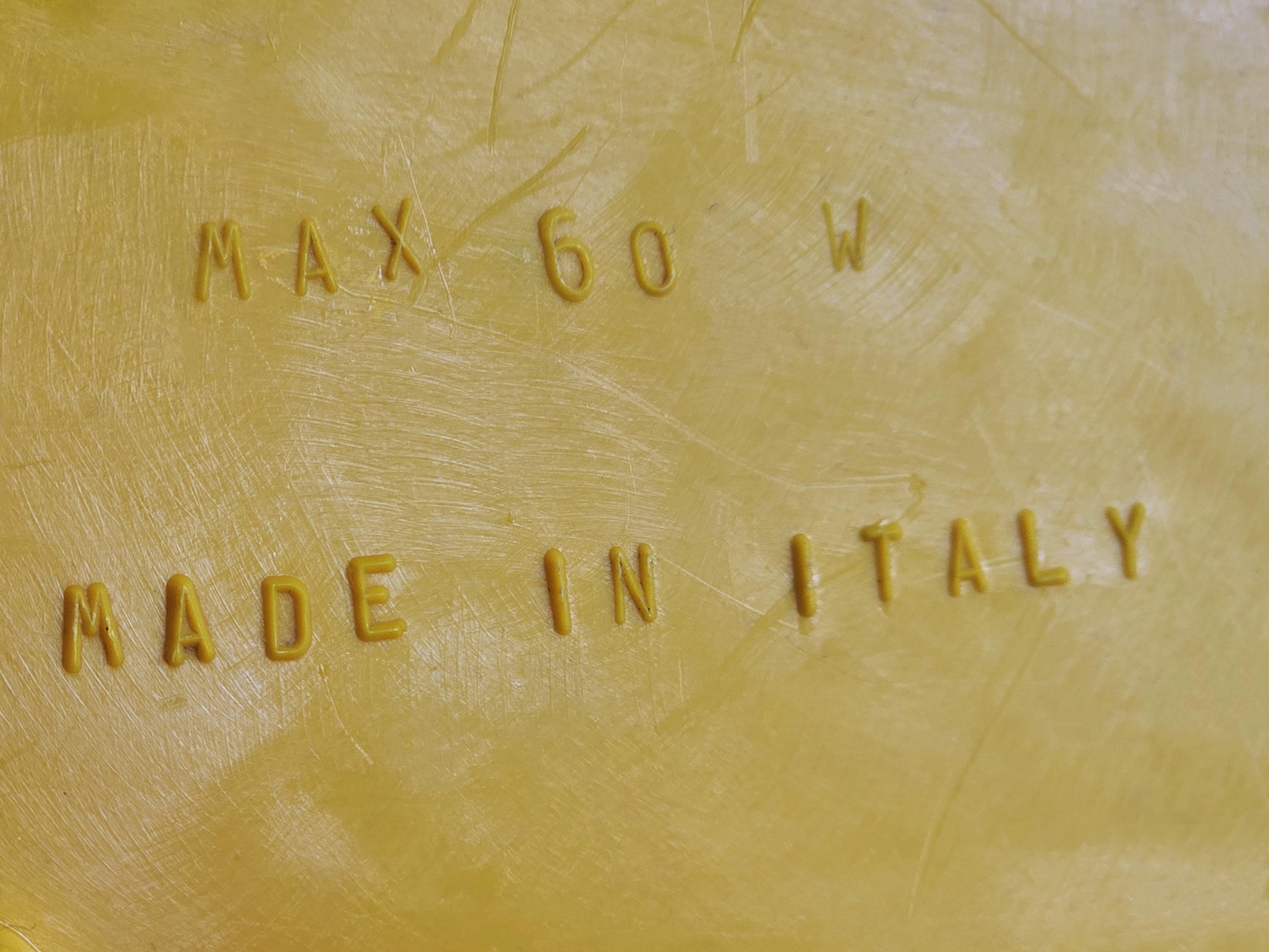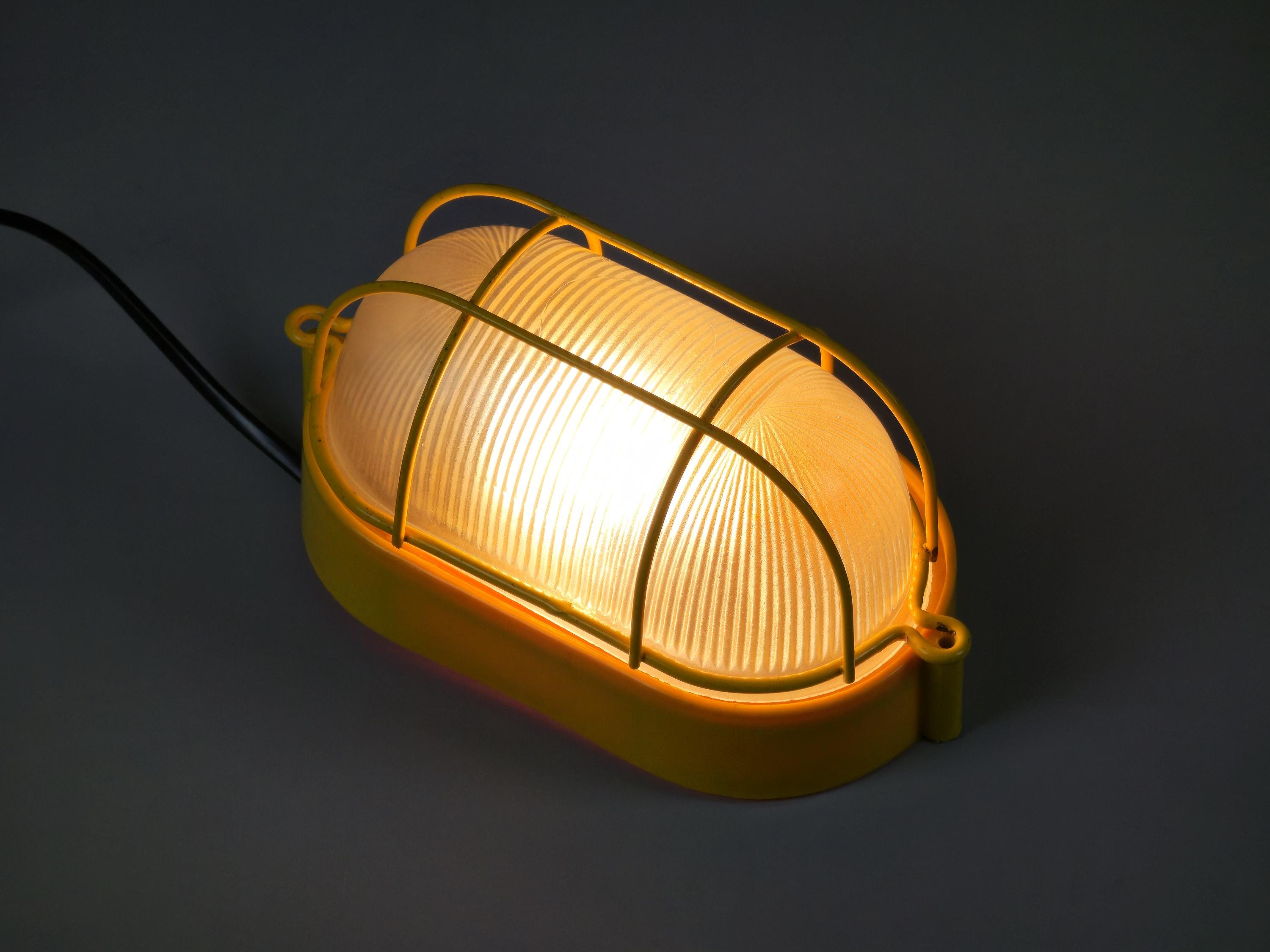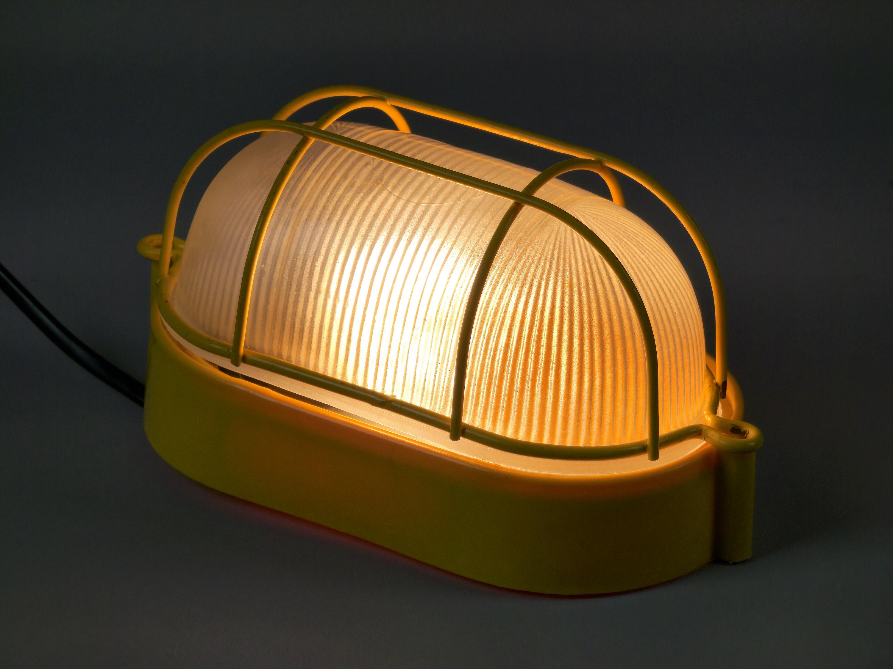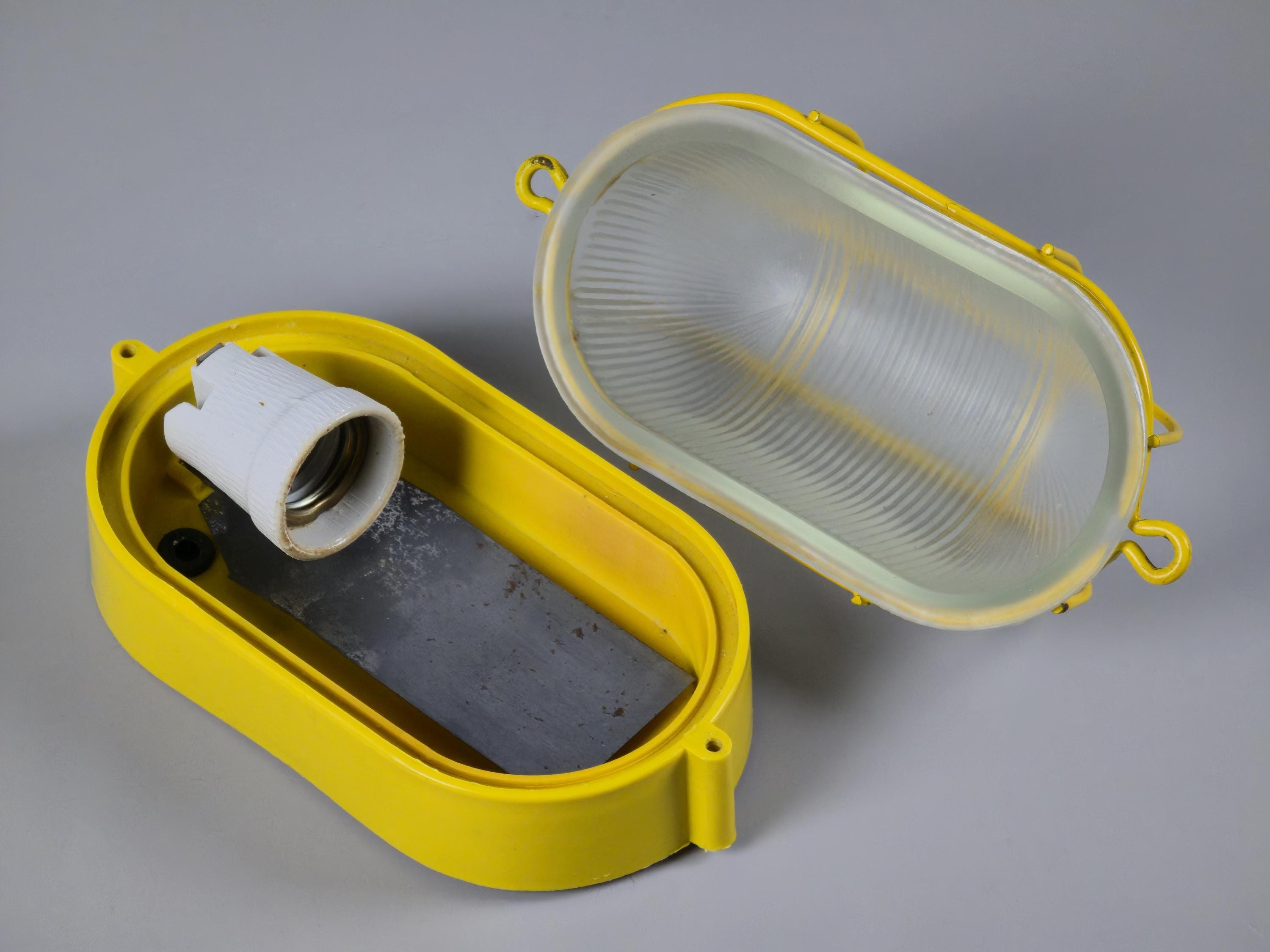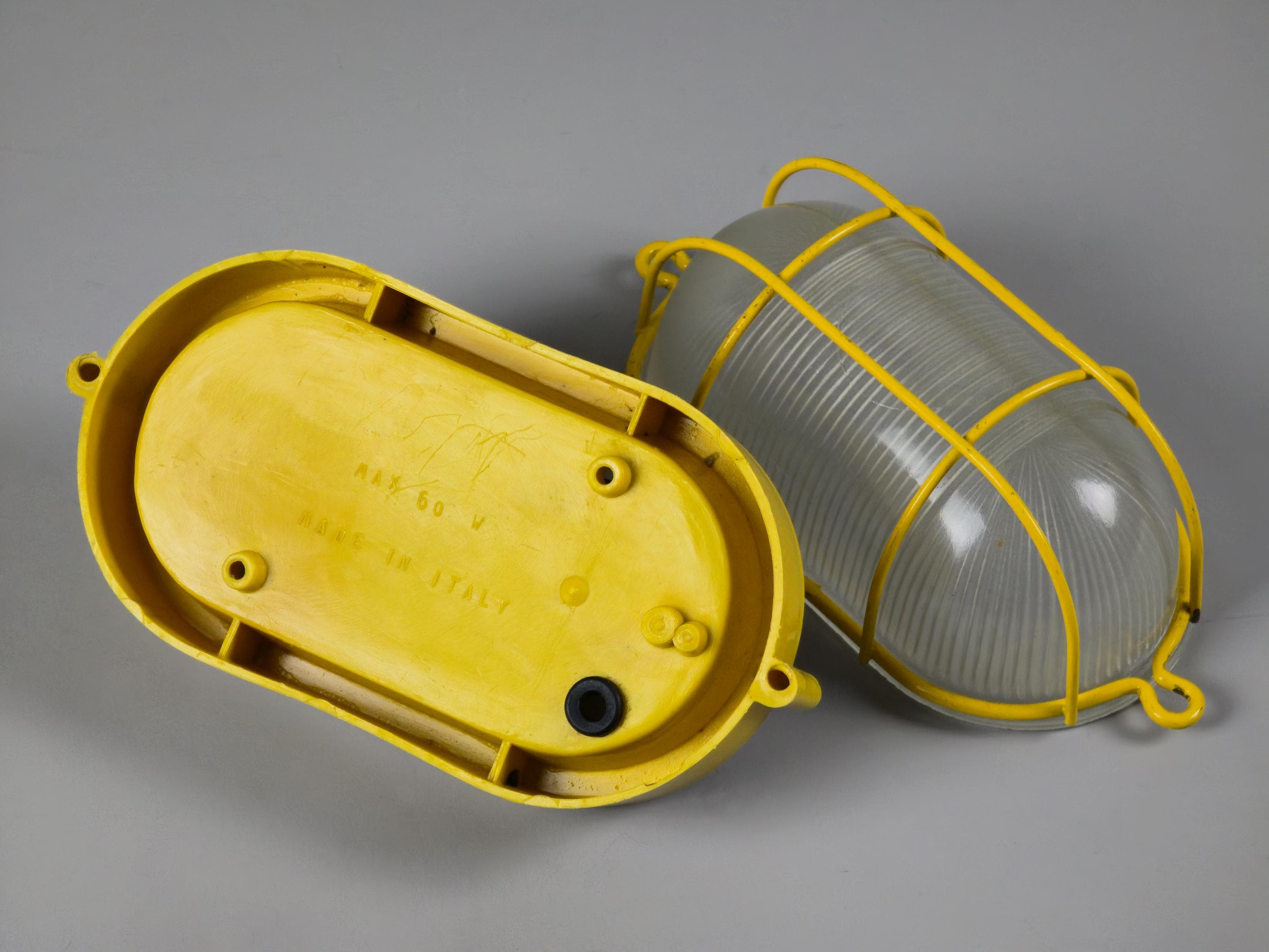 Vintage industrial design bulkhead wall light fixture from the 1980s with a yellow plastic base, metal casing, and a thick, ribbed glass shade.
