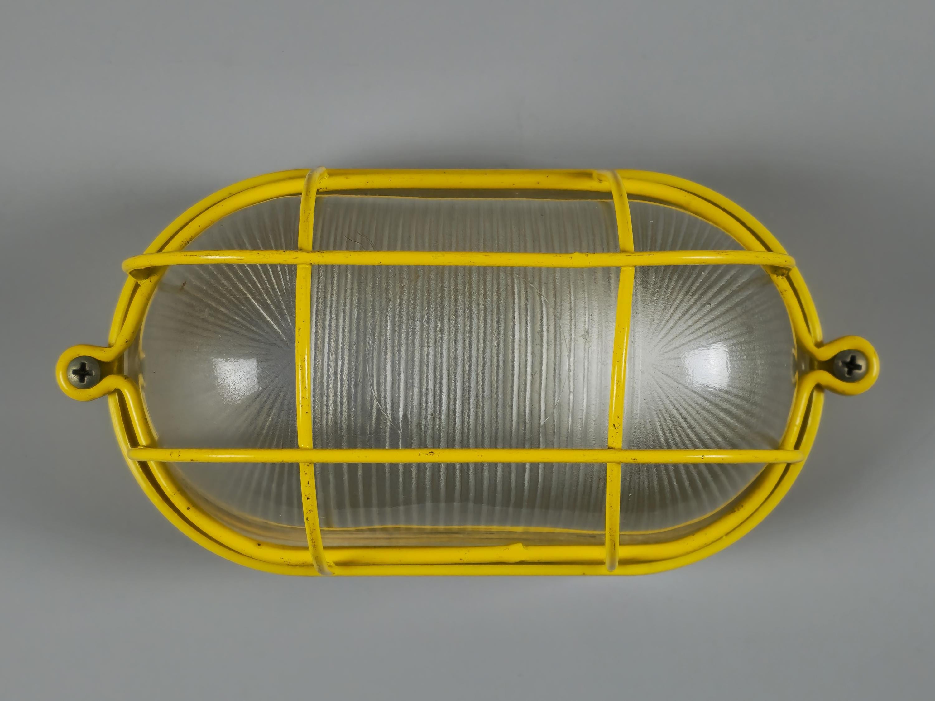 Vintage 1980s Yellow Metal & Glass Industrial Bulkhead Wall Light Fixture.