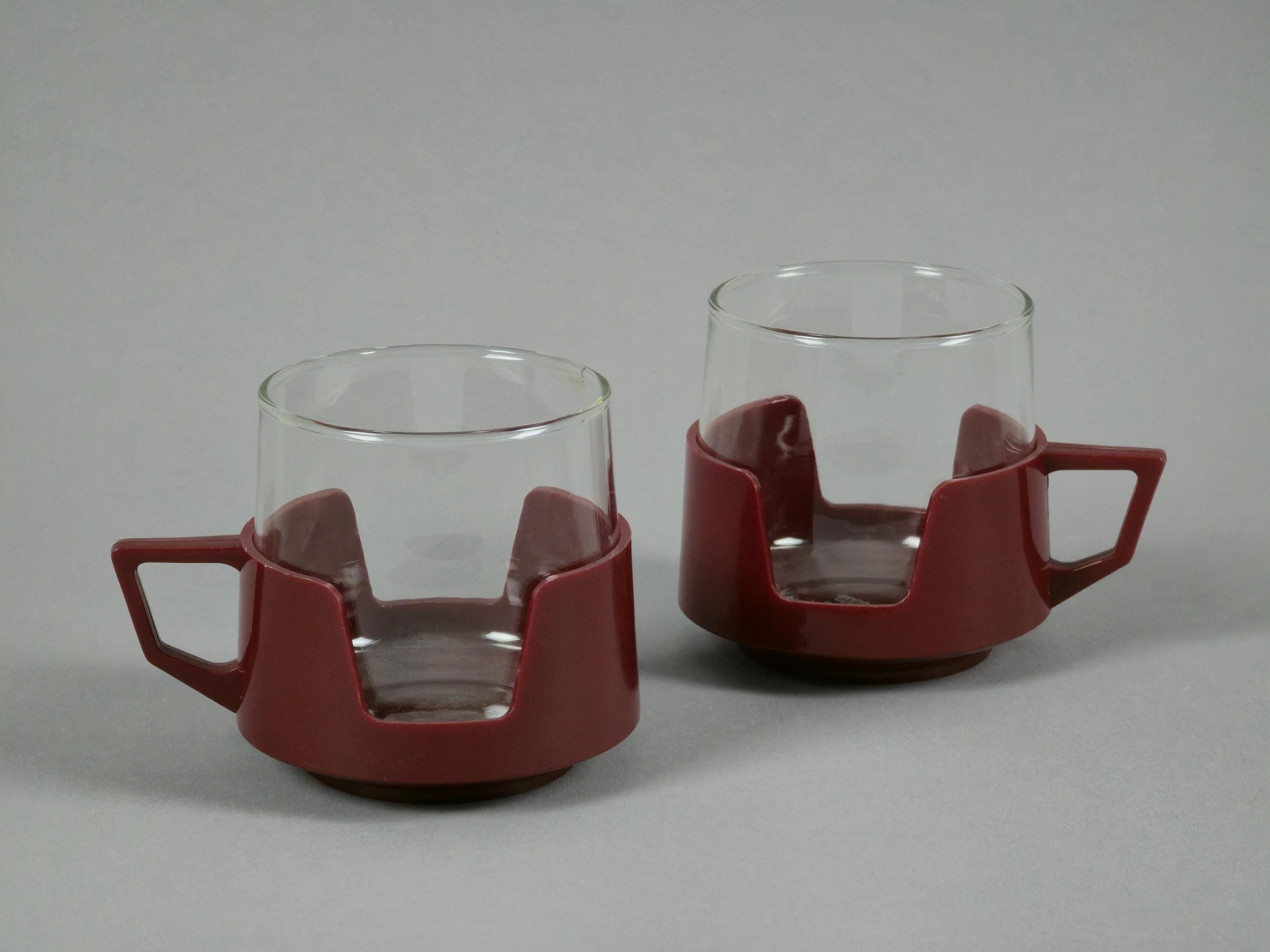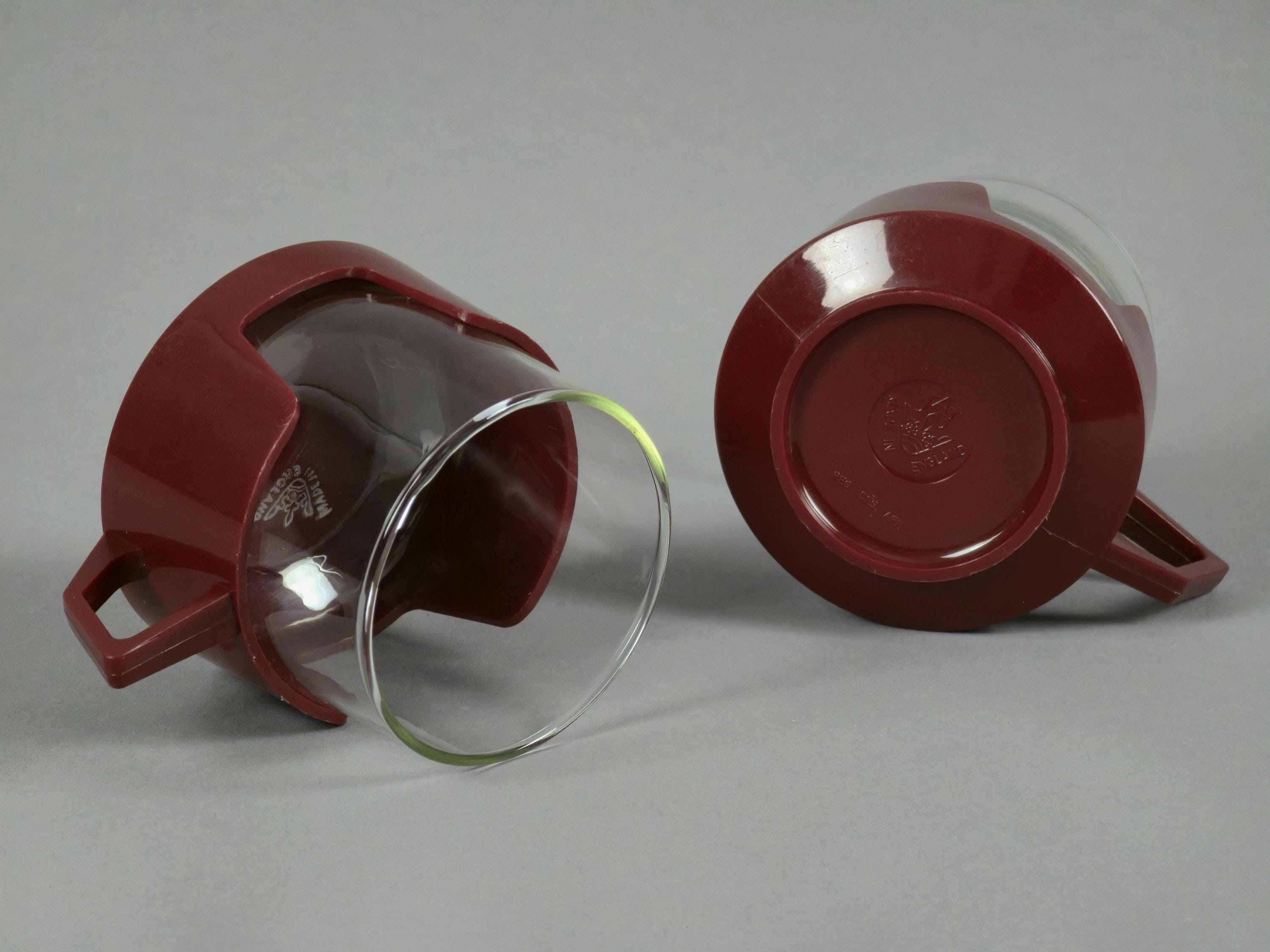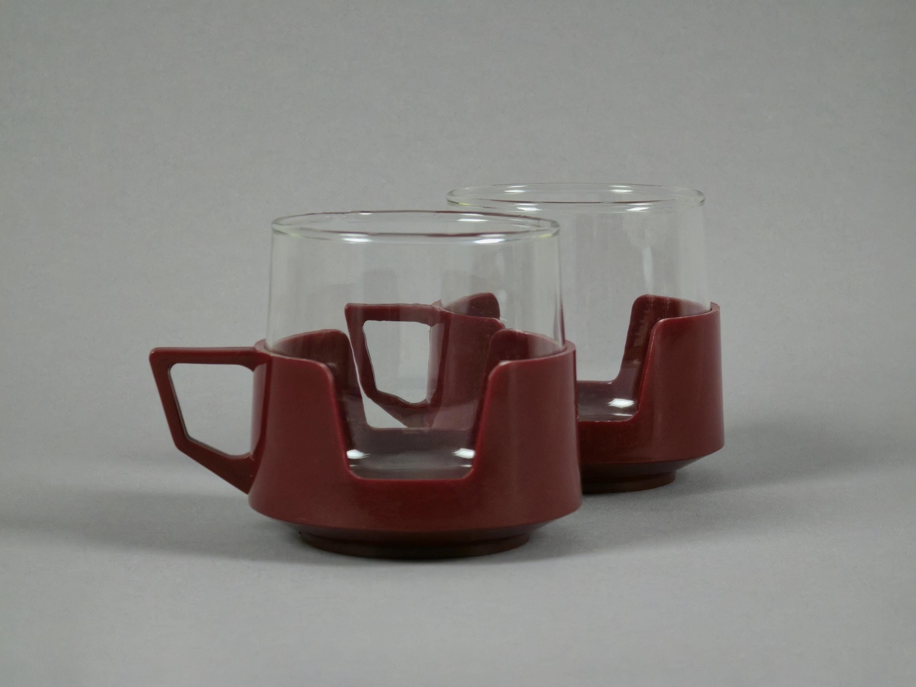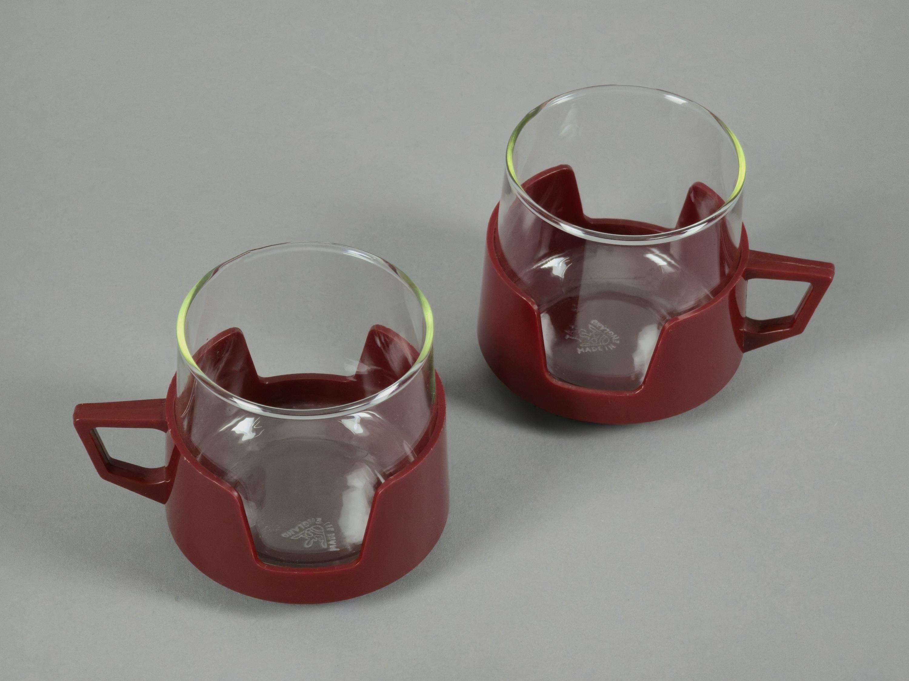 Vintage 1970s pair of 'Drinkups' glass mugs with maroon plastic holders by JAJ Pyrex, England.