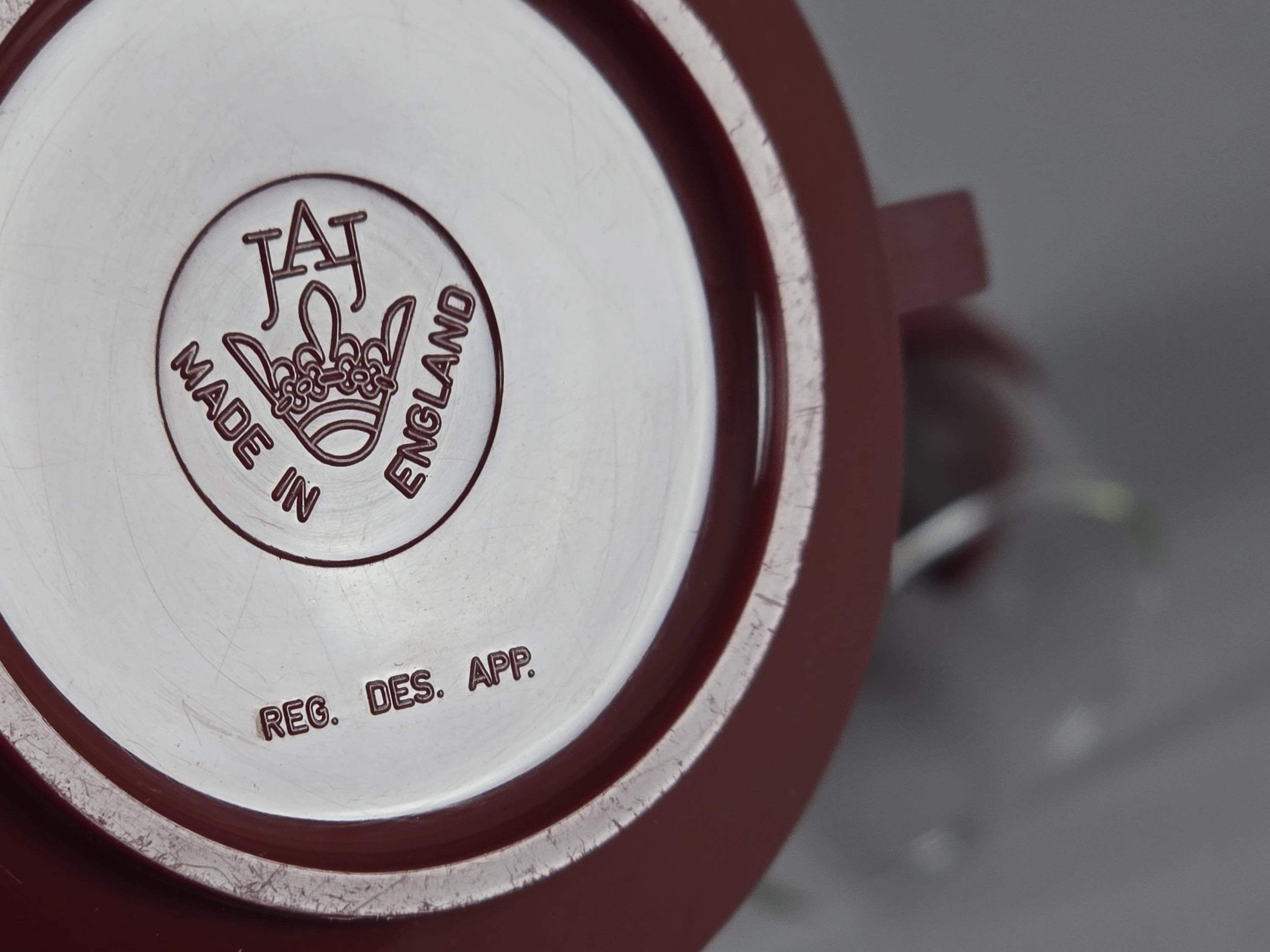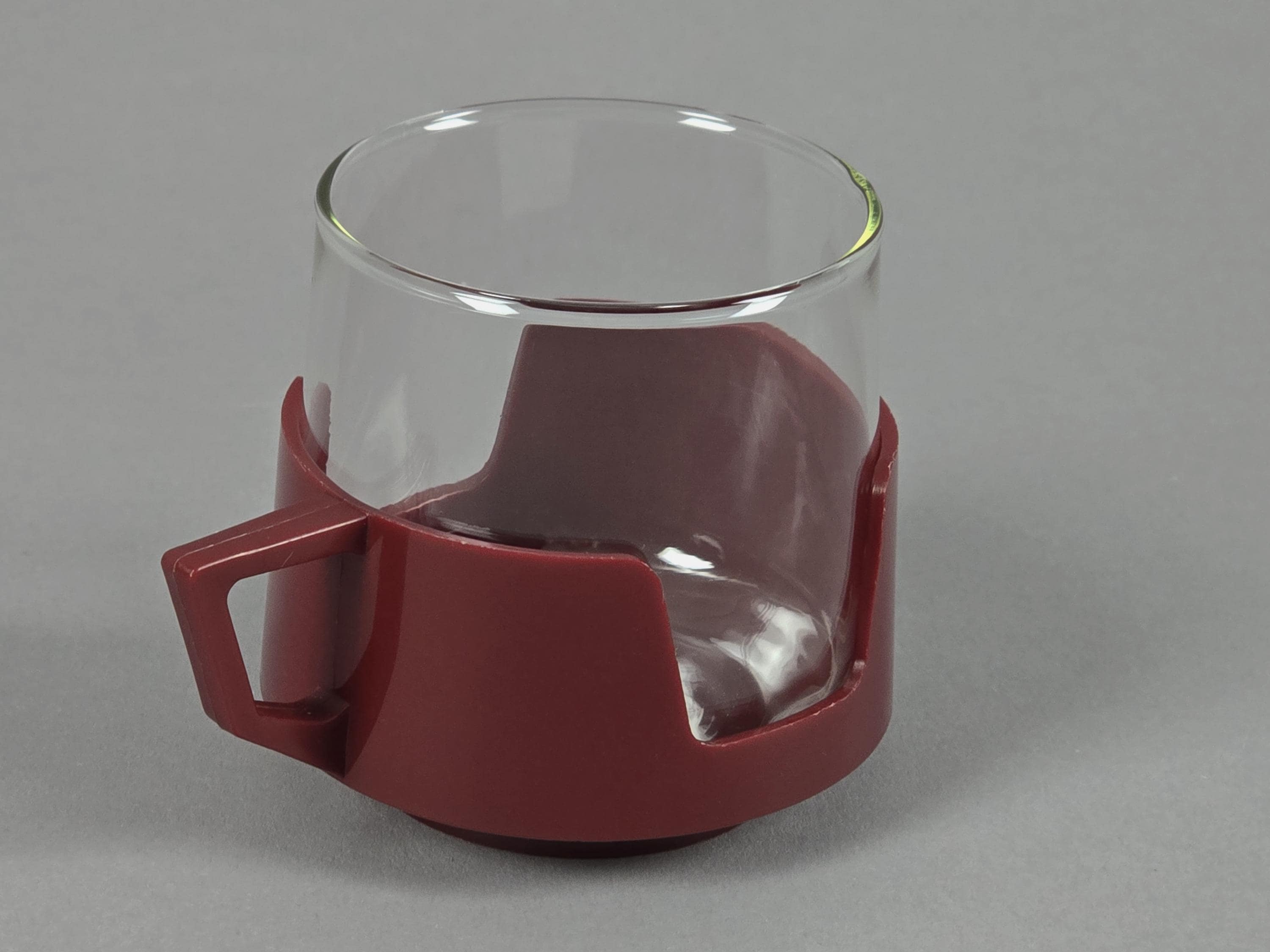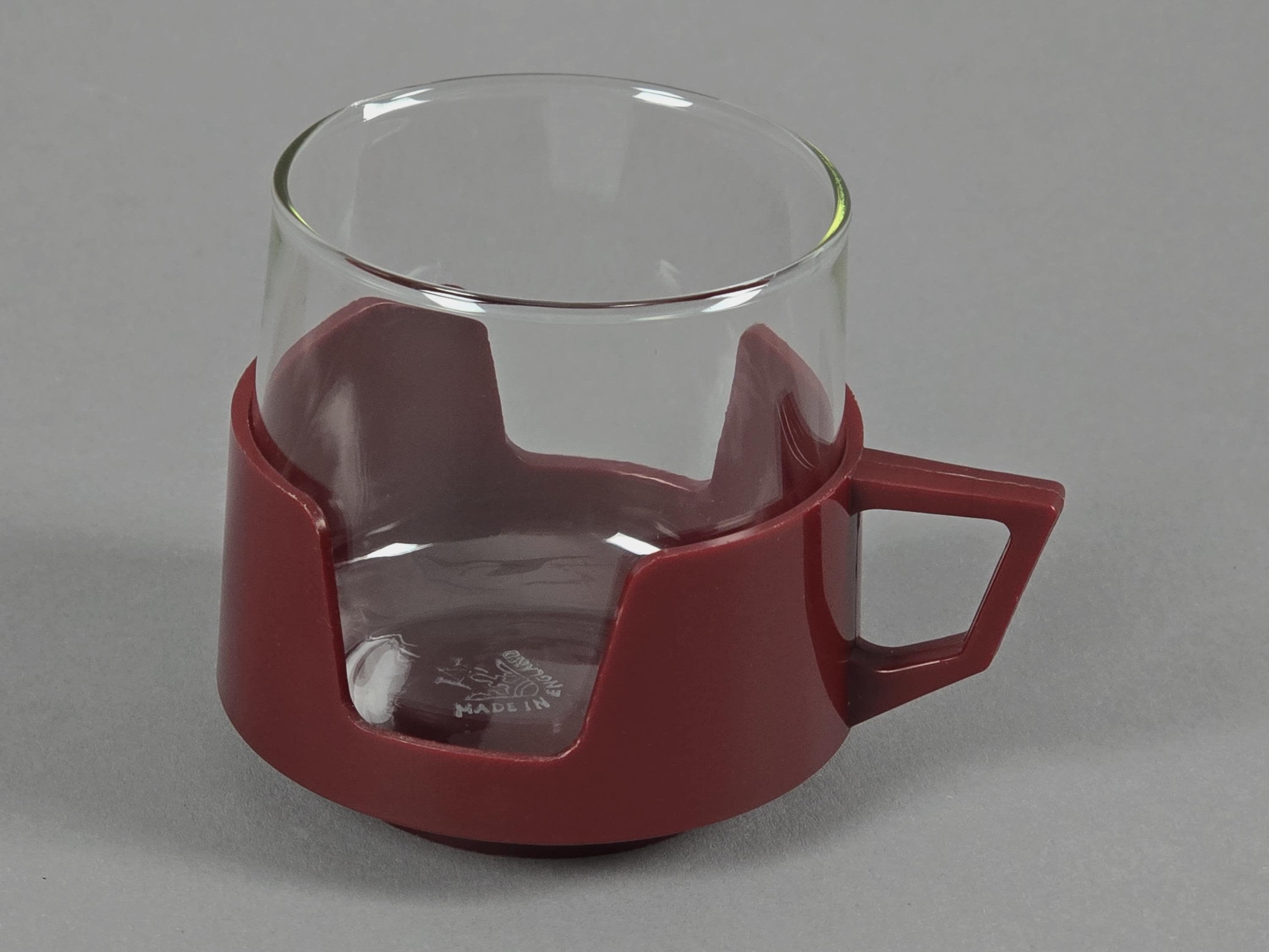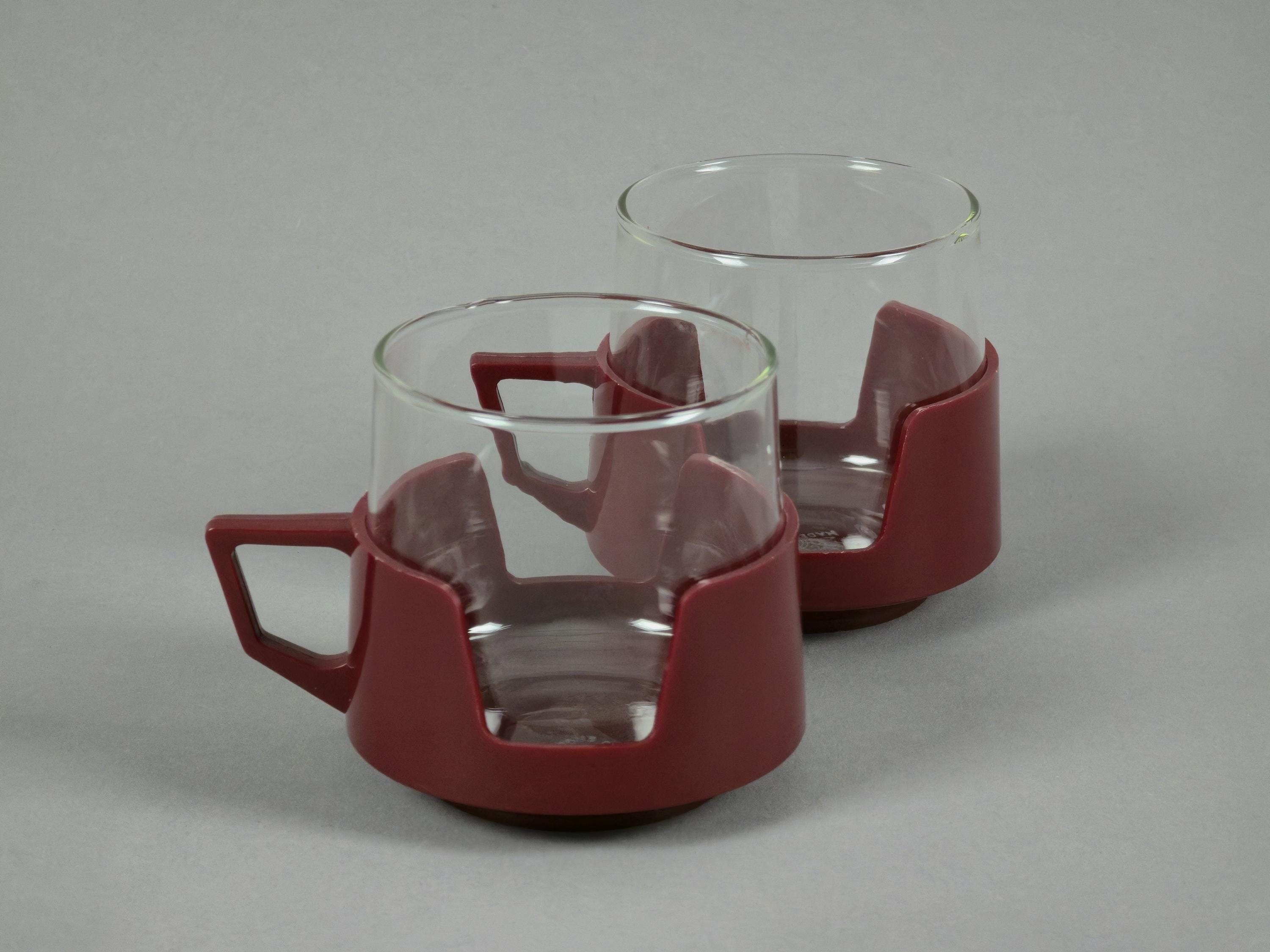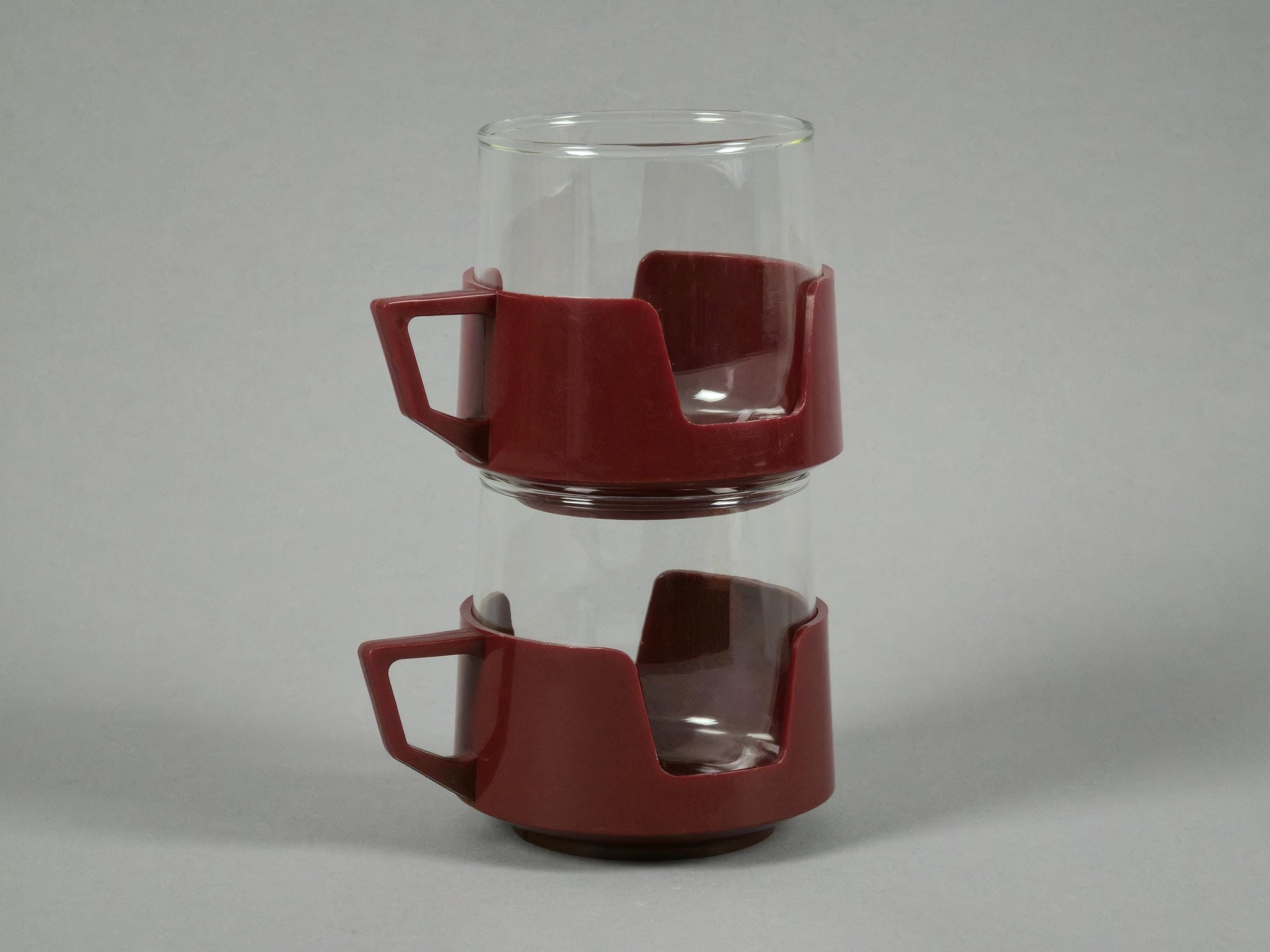 Vintage 1970s pair of 'Drinkups' glass mugs with maroon plastic holders by JAJ Pyrex, England.