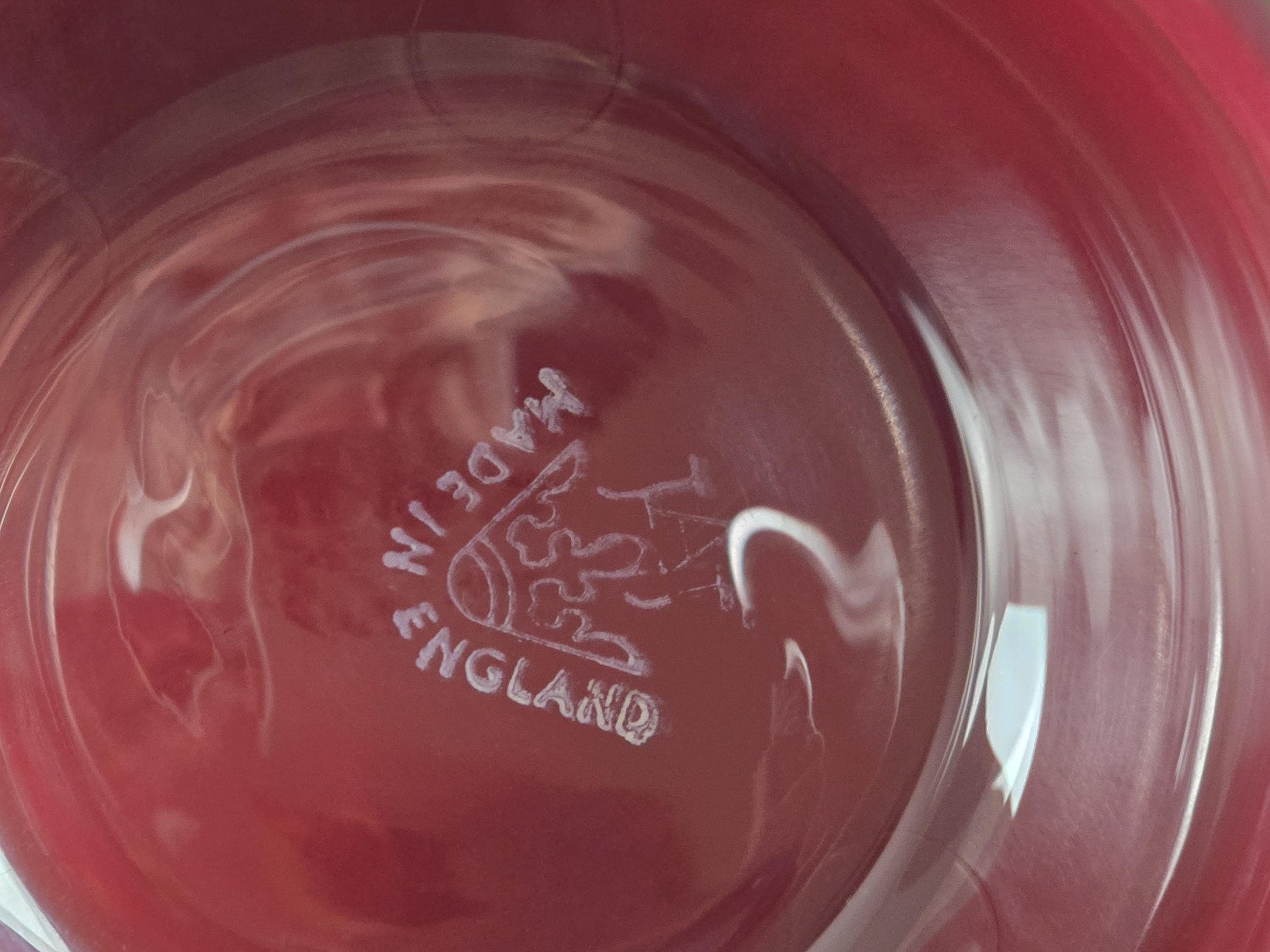 Vintage 1970s Pair Of JAJ Pyrex 'Drinkups' Glass Cups With Maroon Plastic Holders.
