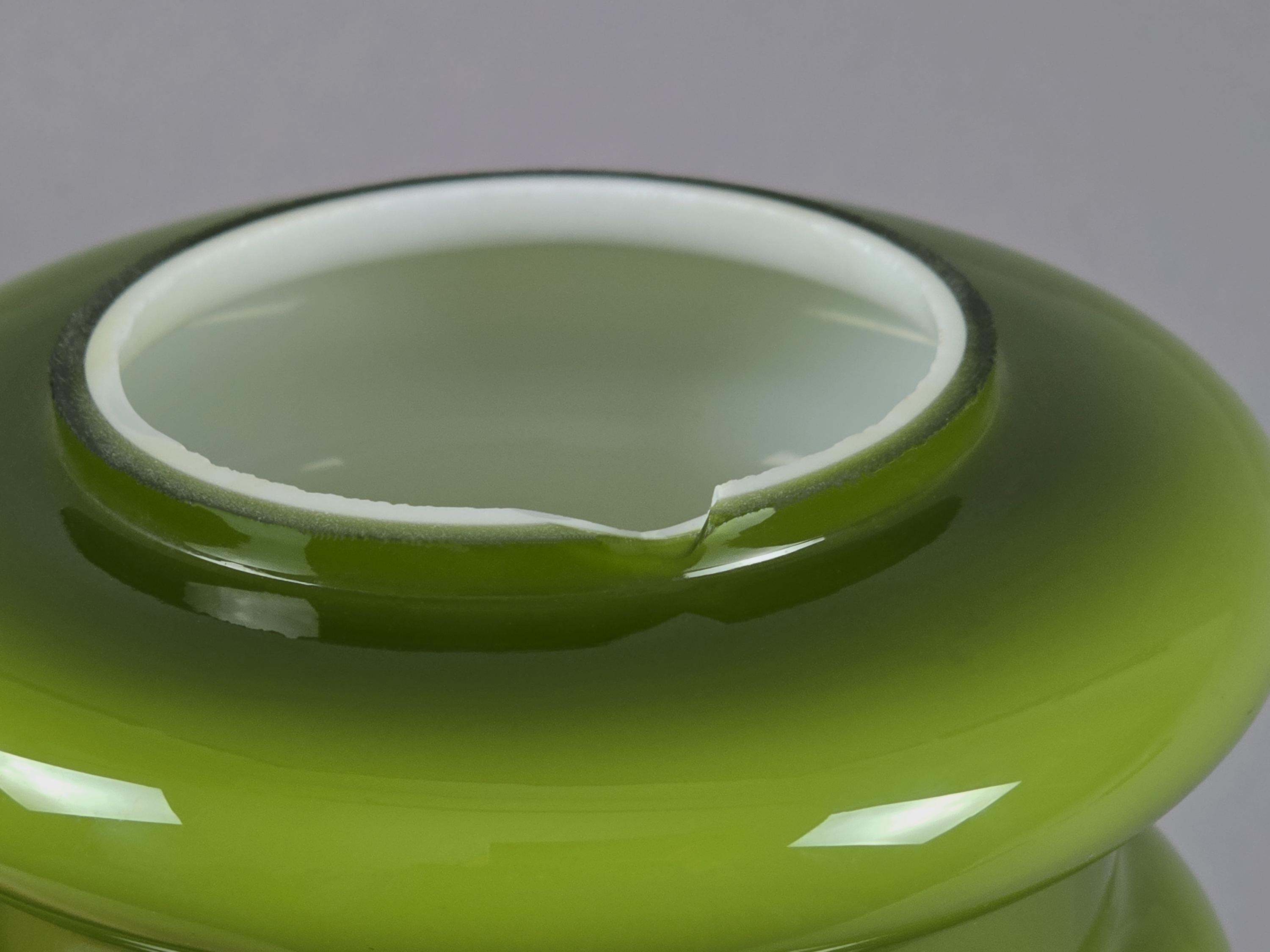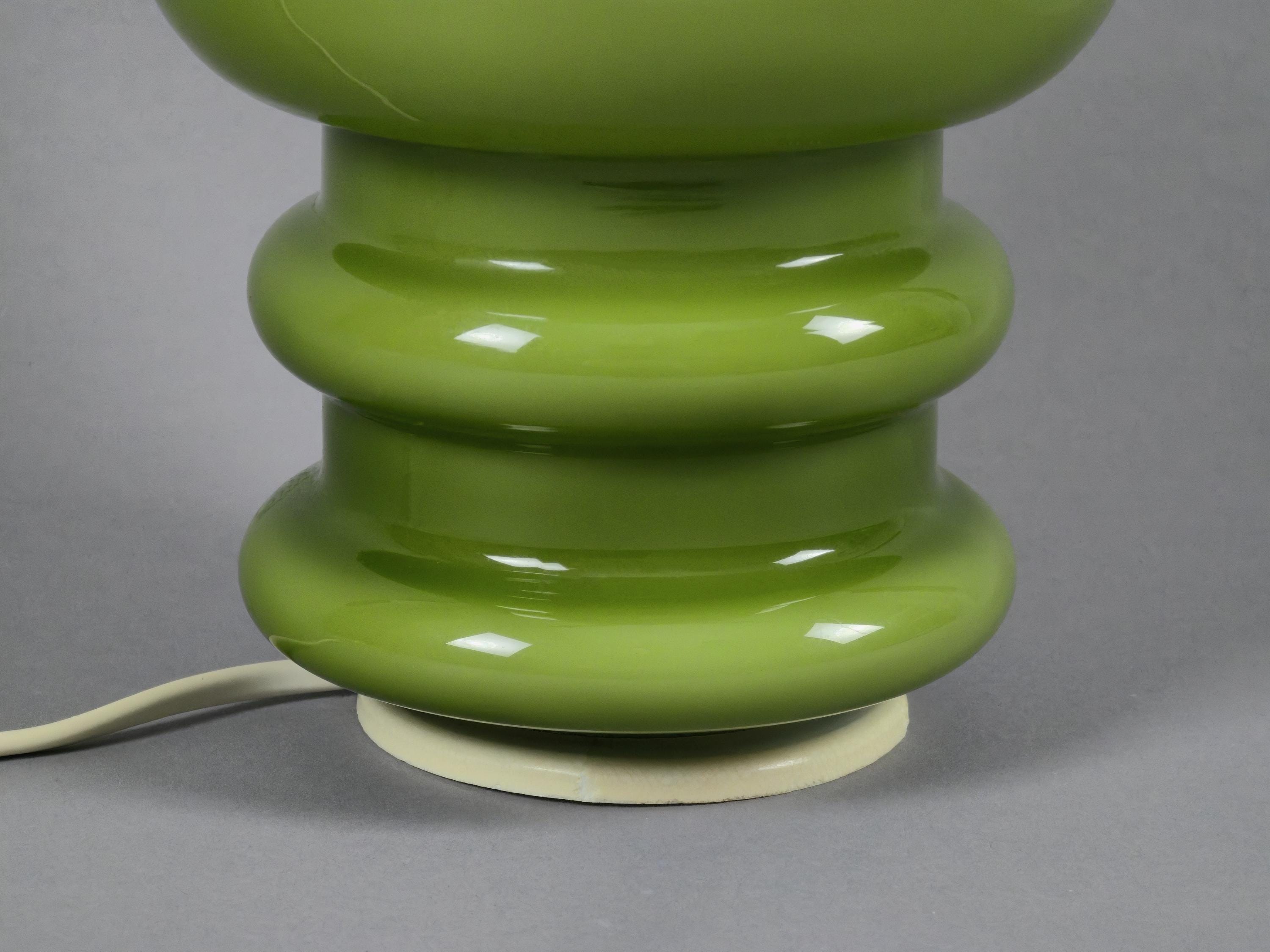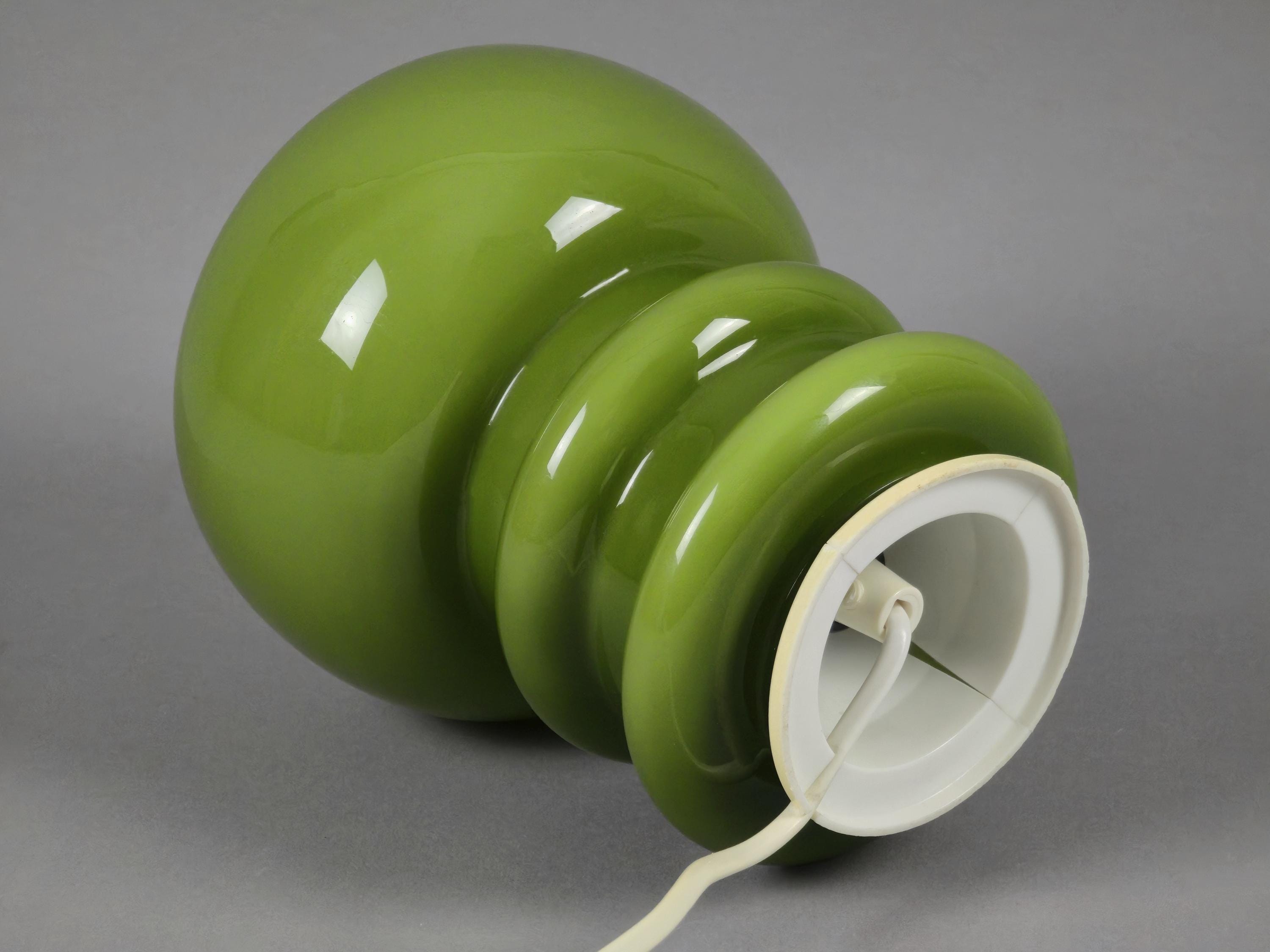 Vintage 1970s green cased-glass mushroom lamp from Sweden. It features vibrant green cased glass, meaning it has an opaque white inner layer that creates a soft, ambient glow when lit.