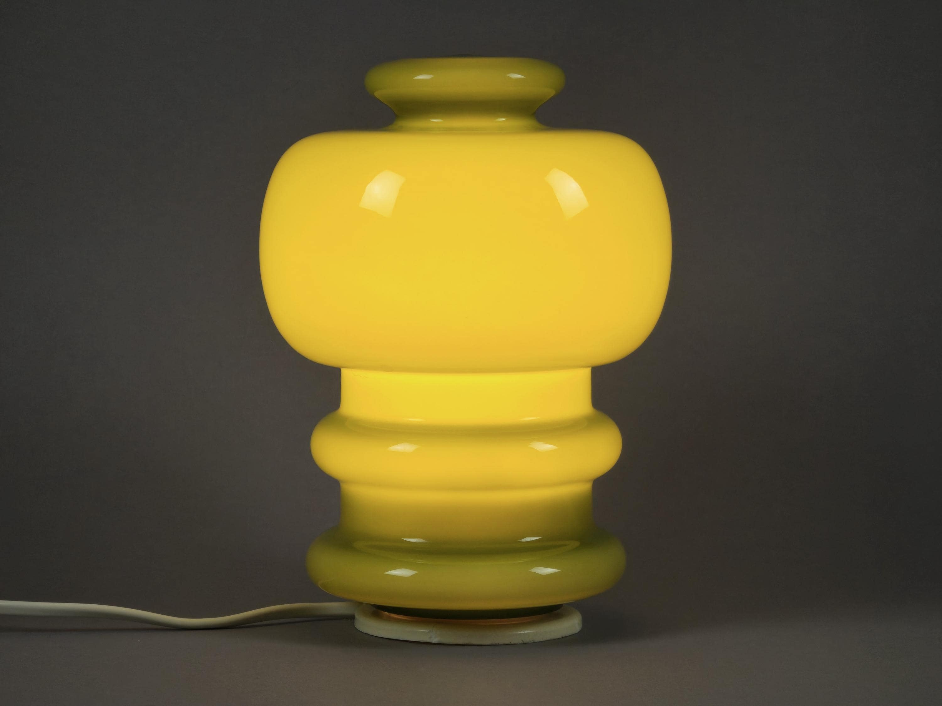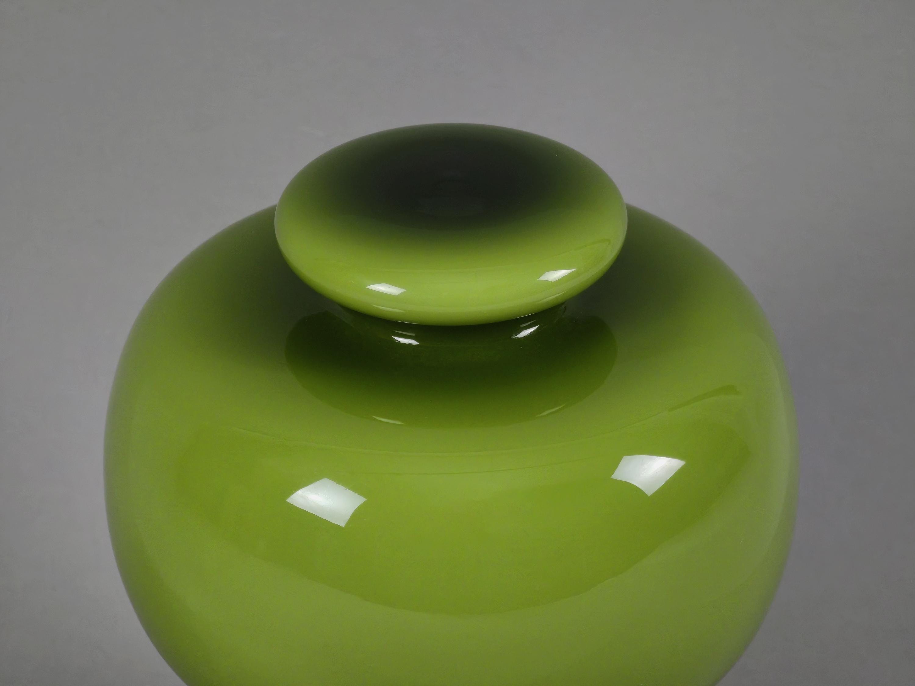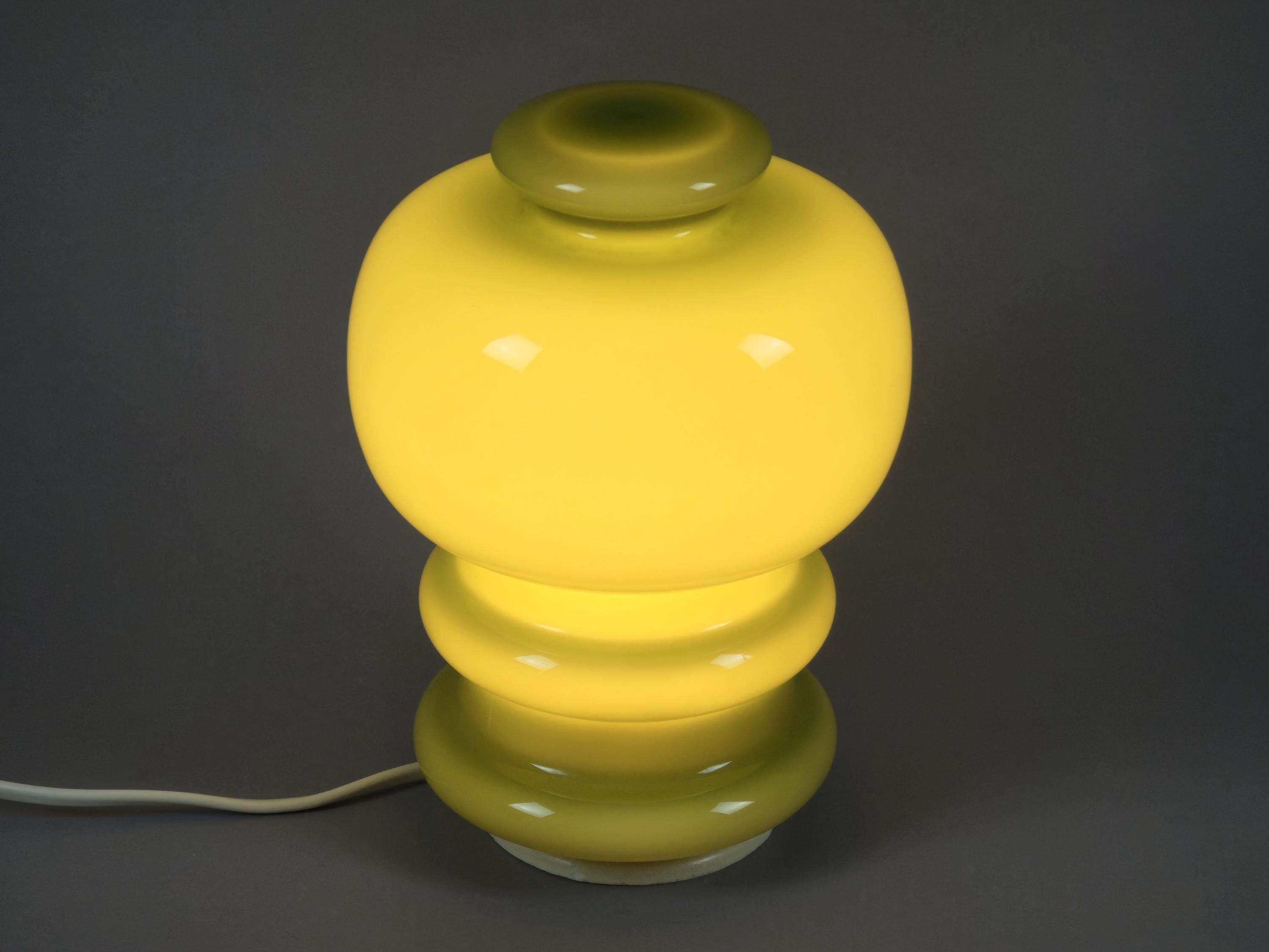 Vintage 1970s green cased-glass mushroom lamp from Sweden. It features vibrant green cased glass, meaning it has an opaque white inner layer that creates a soft, ambient glow when lit.