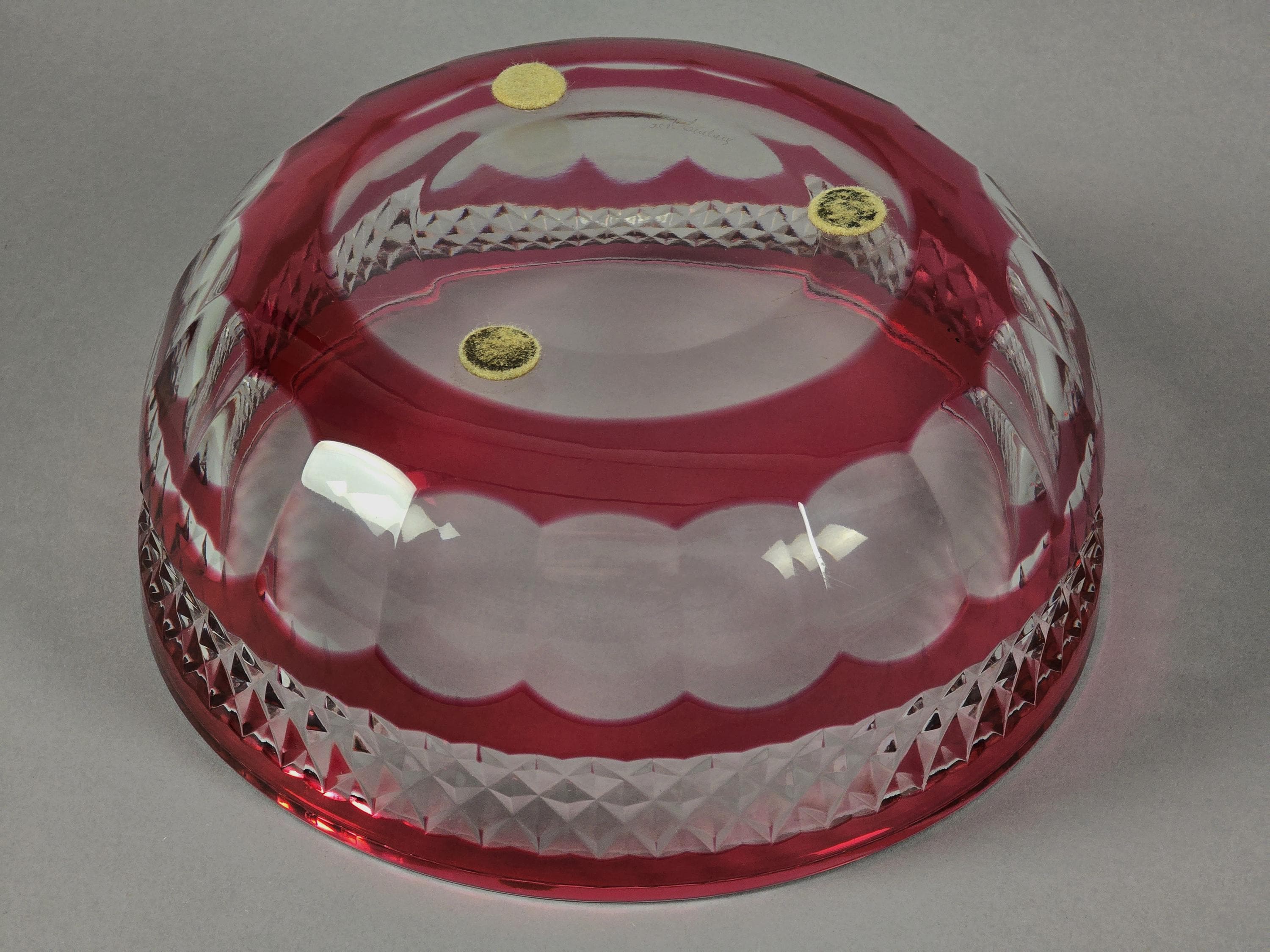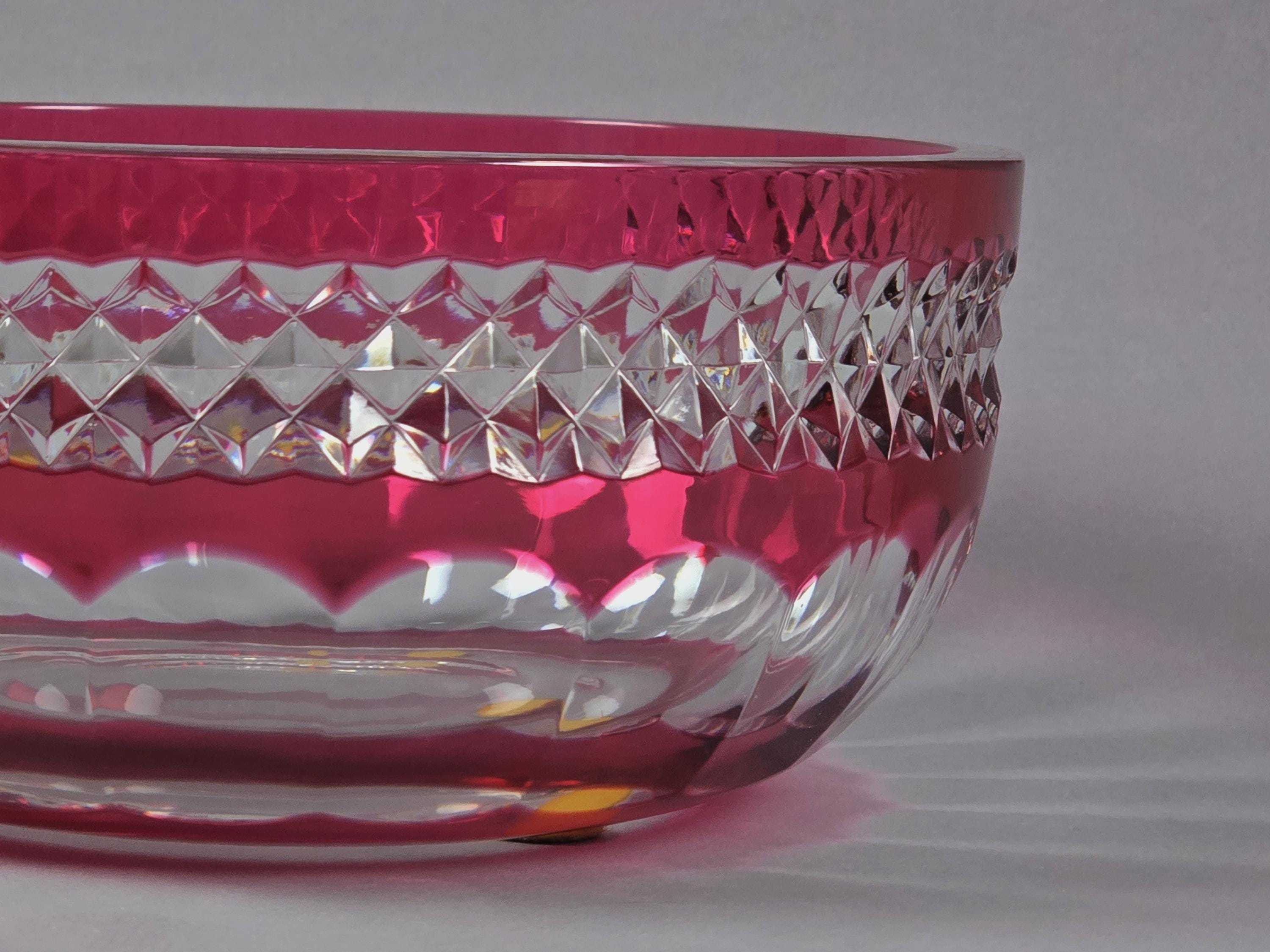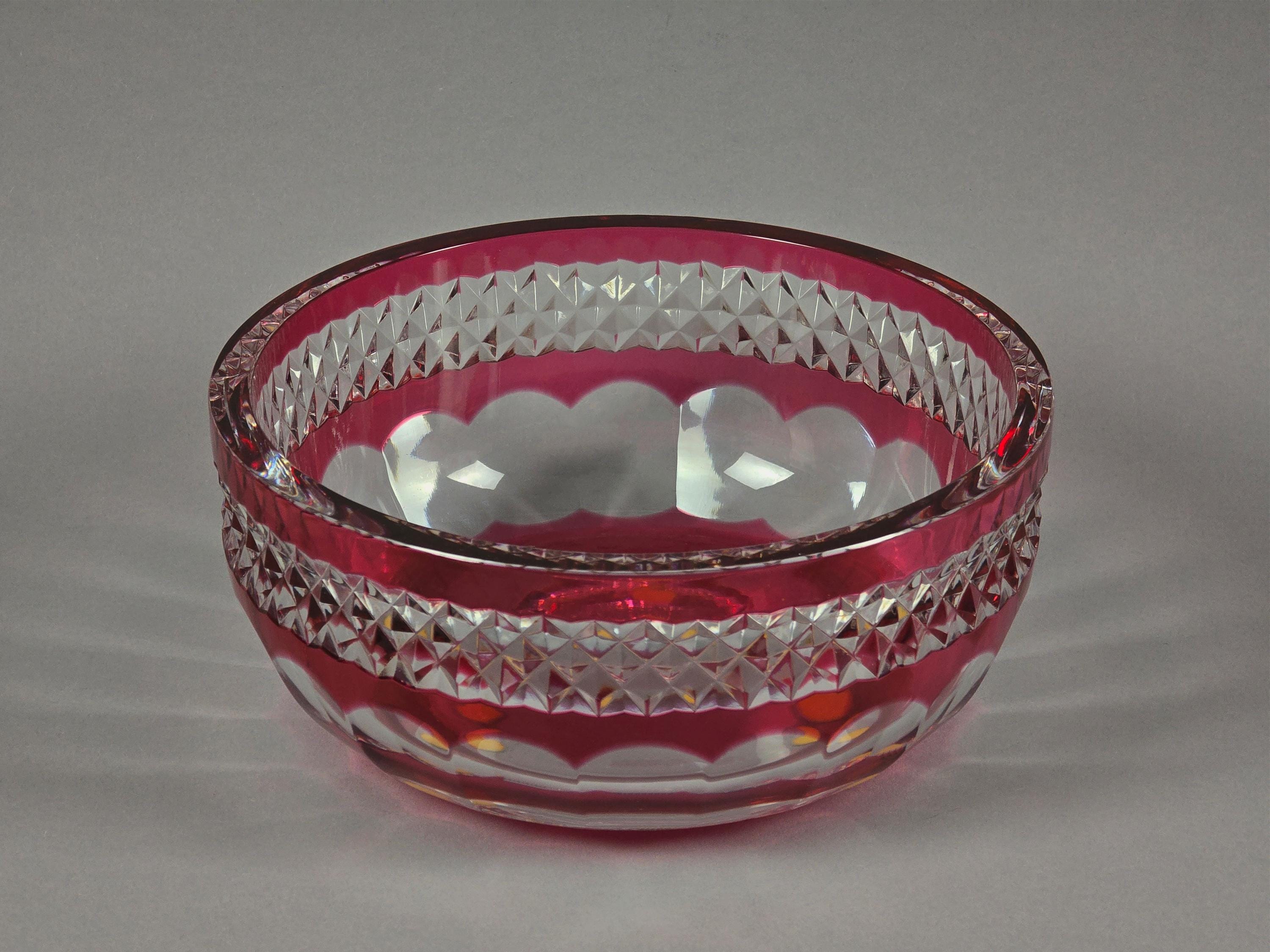 Vintage 1950s Art Deco Style cranberry or ruby cut-to-clear crystal bowl by Val Saint Lambert, Belgium. The pattern includes deep diamond cuts around the upper and lower bands and large, polished thumbprint or oval cuts in the center band.