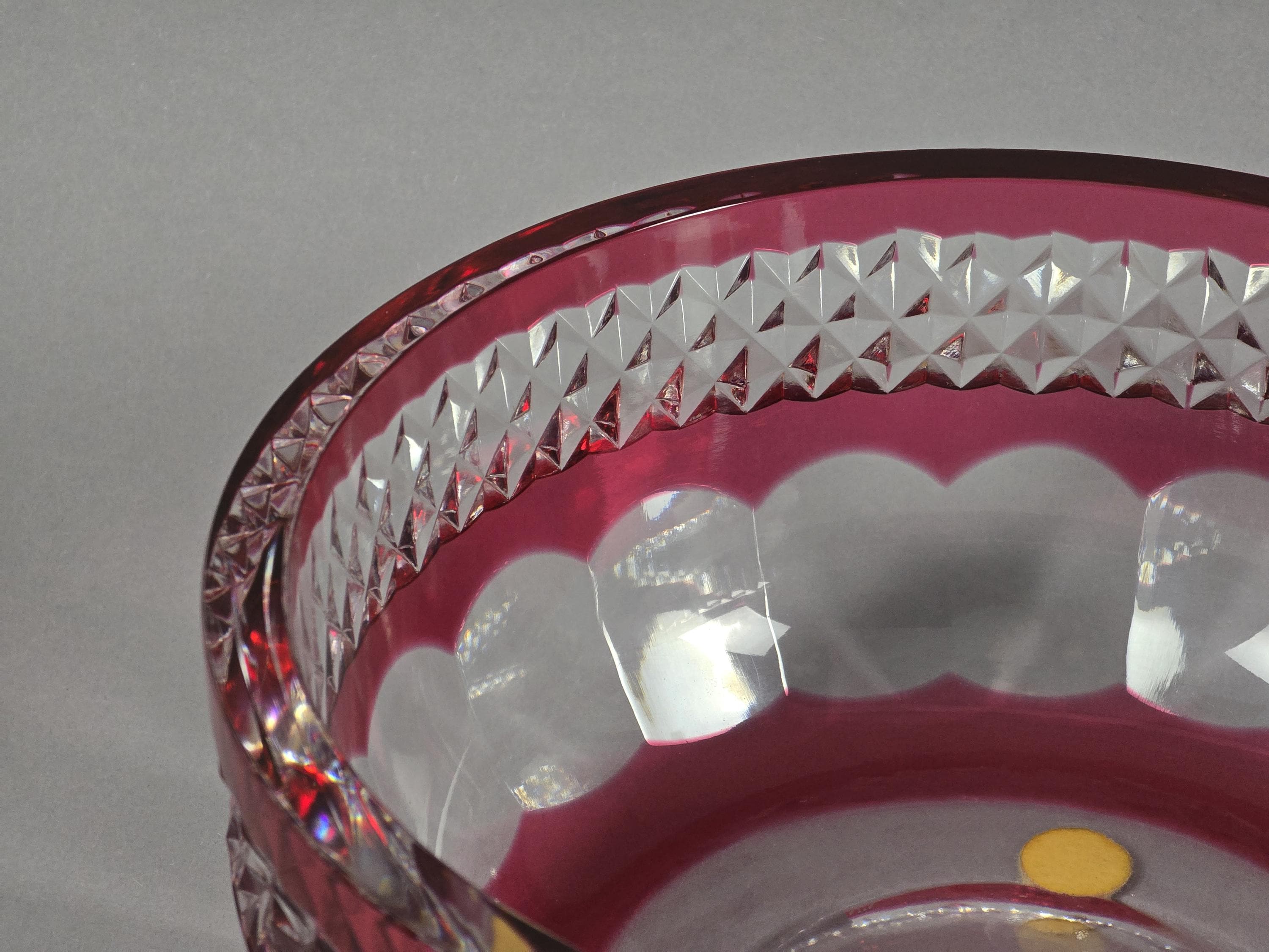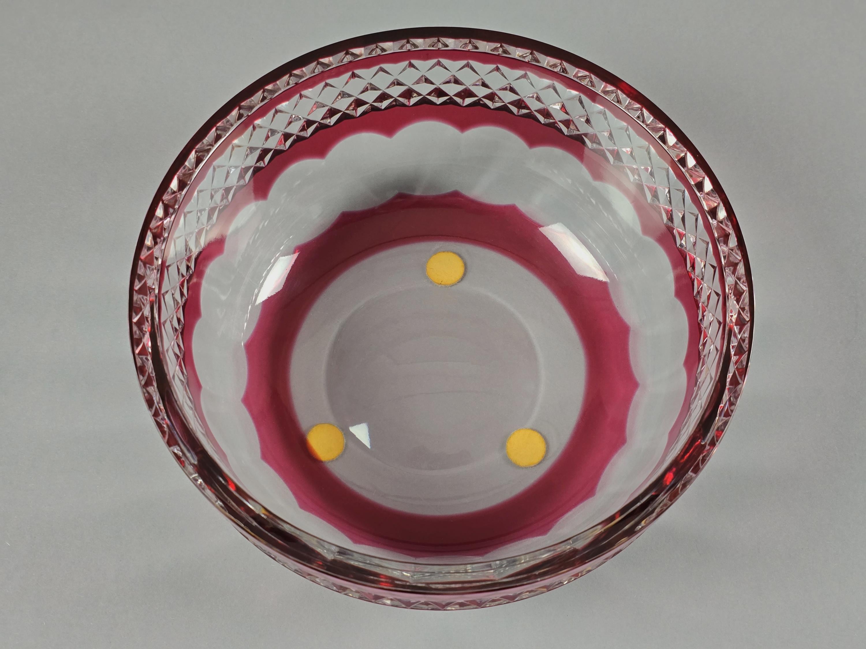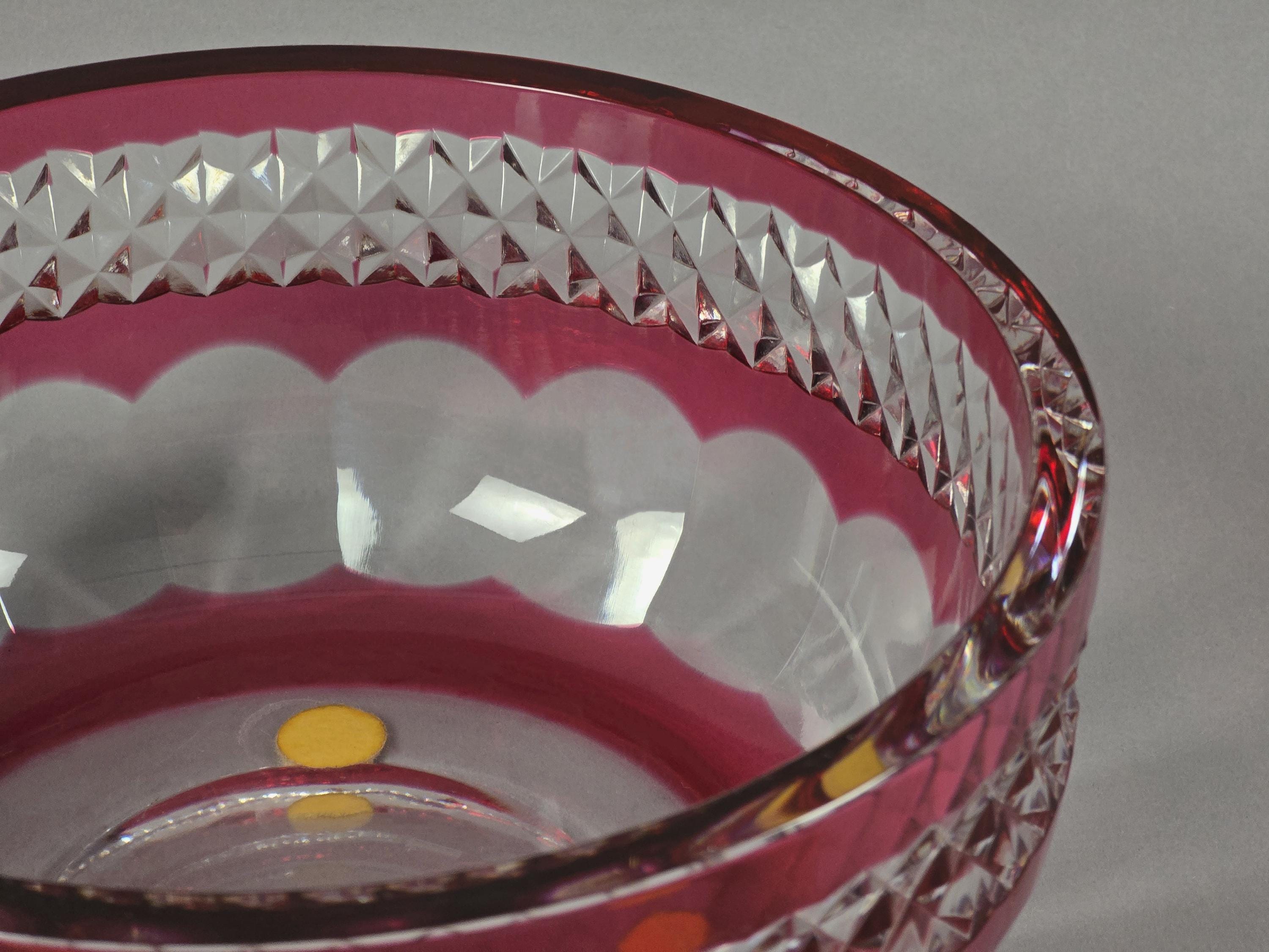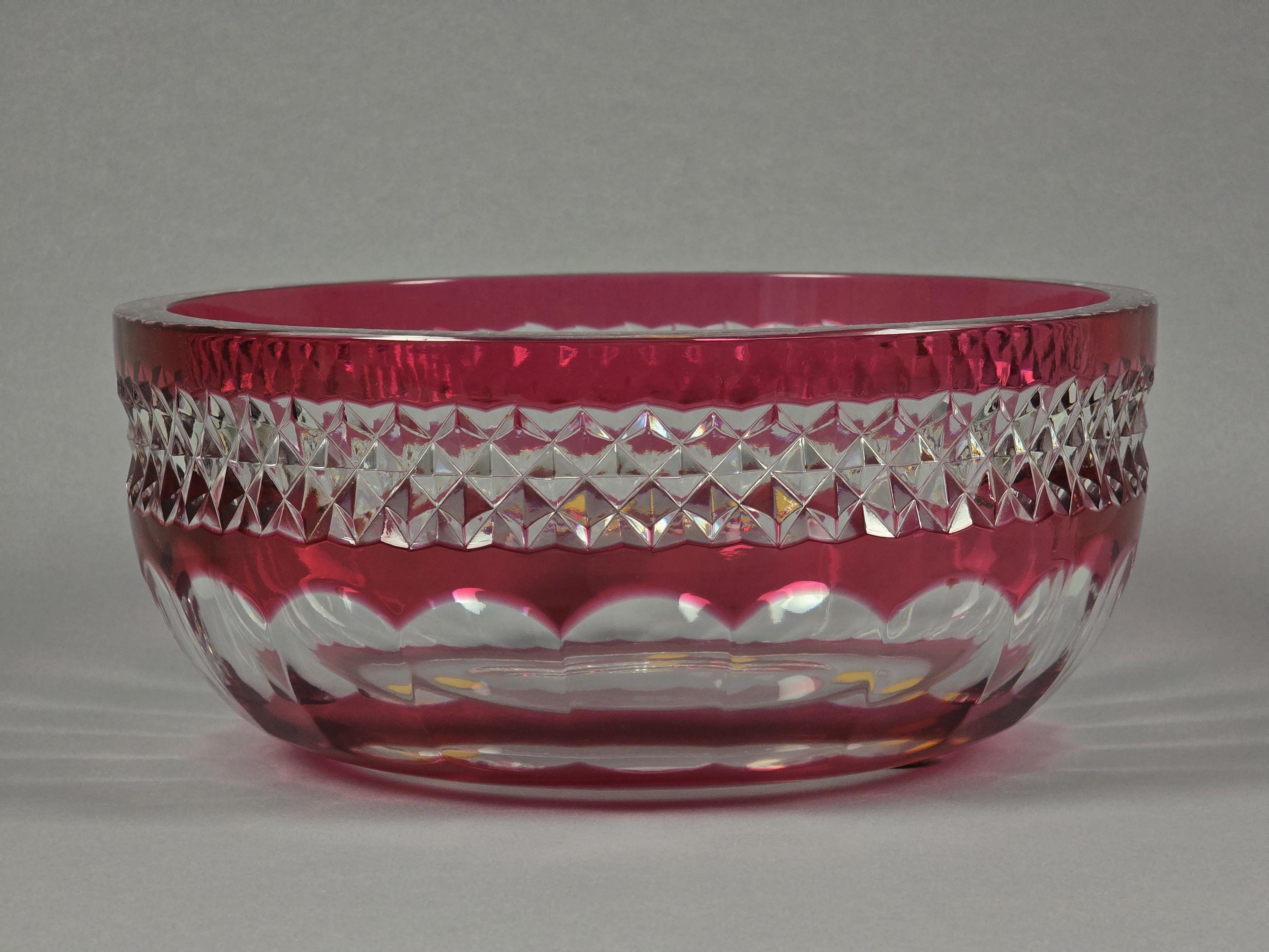 Vintage 1950s Art Deco Style cranberry or ruby cut-to-clear crystal bowl by Val Saint Lambert, Belgium. The pattern includes deep diamond cuts around the upper and lower bands and large, polished thumbprint or oval cuts in the center band.