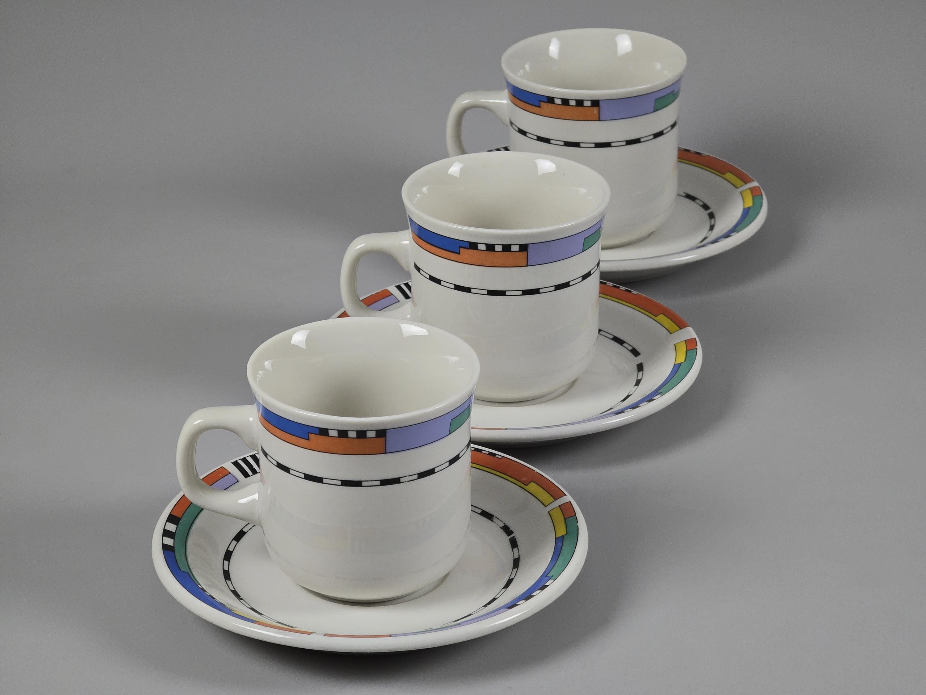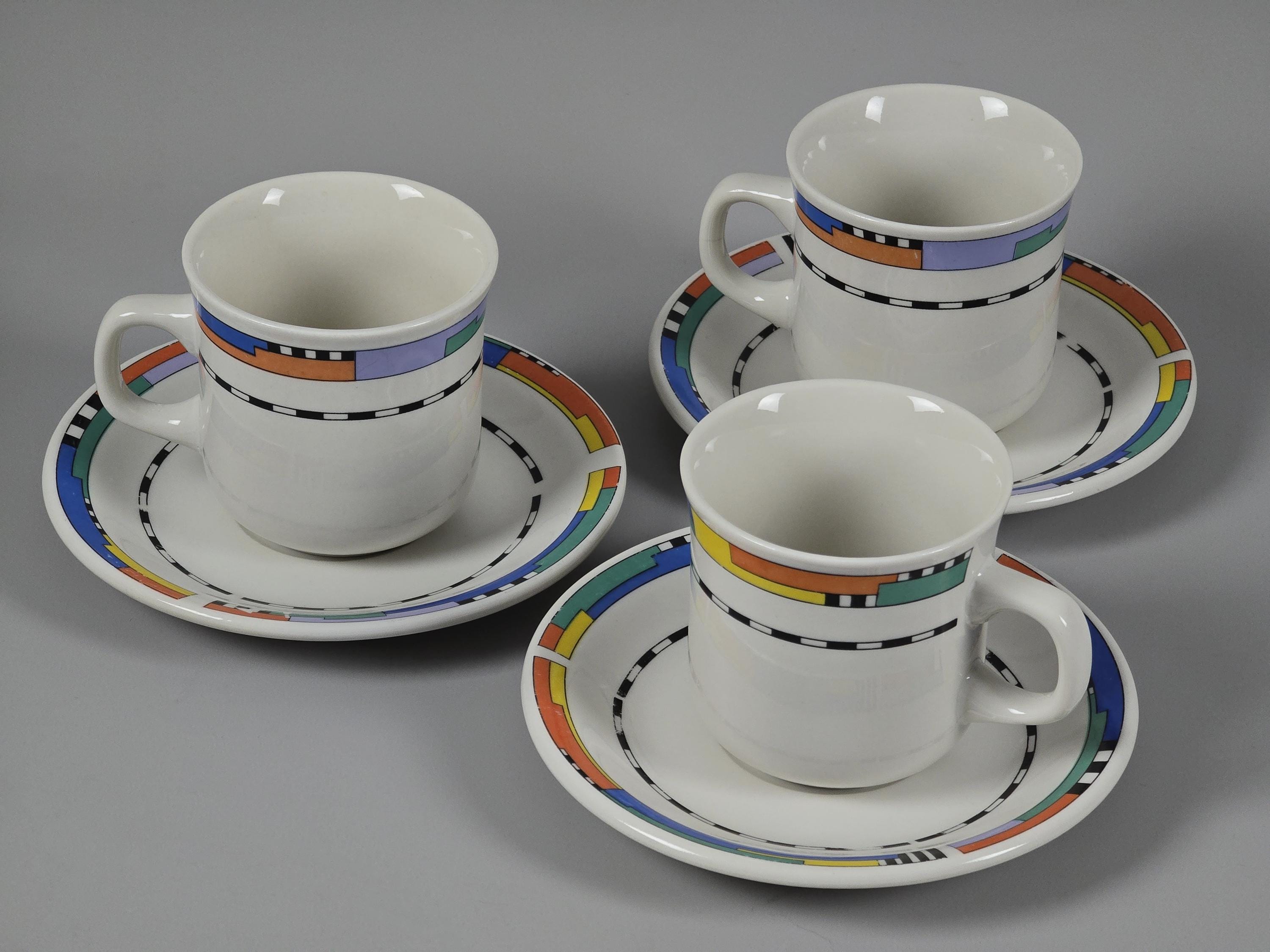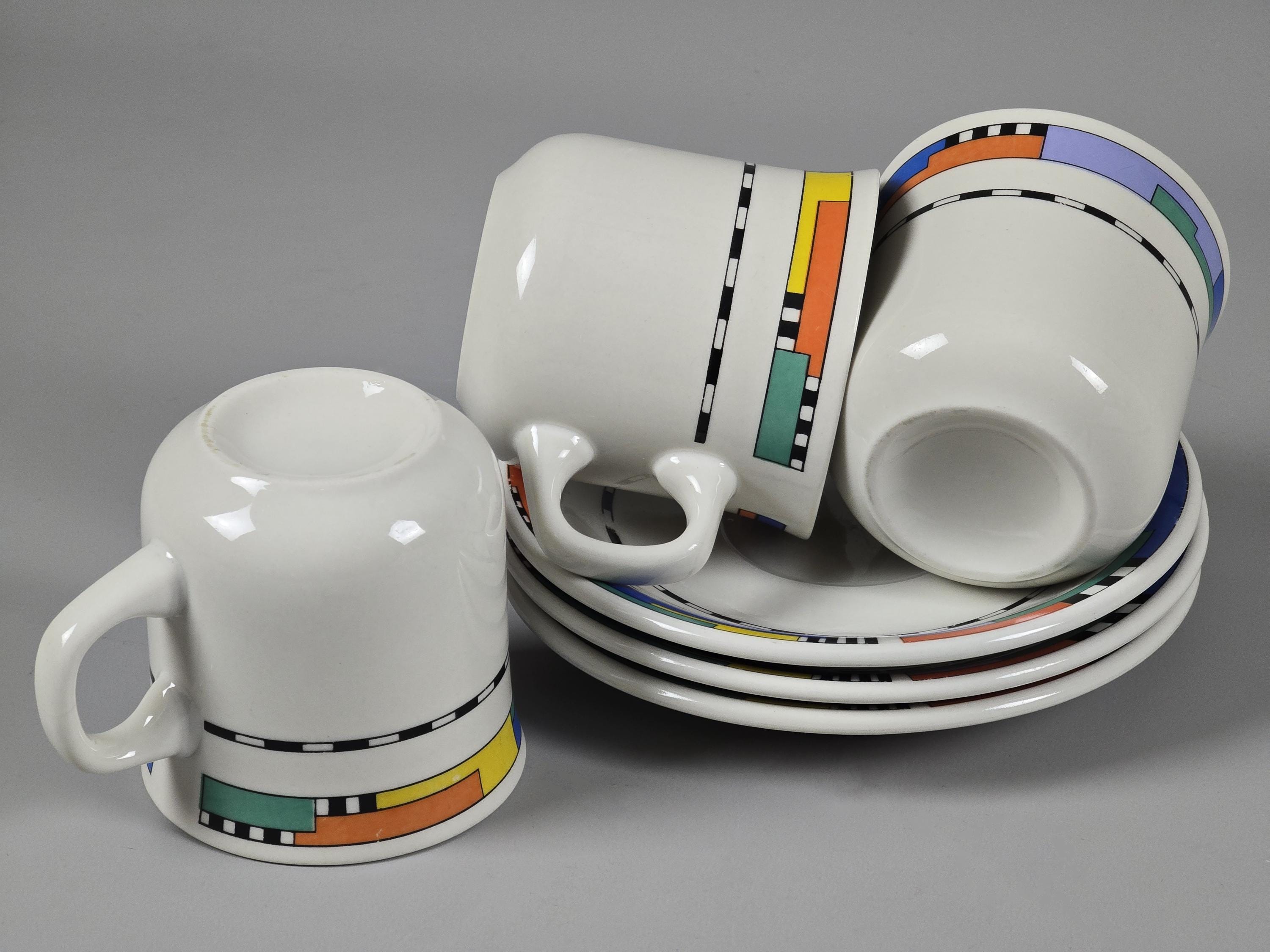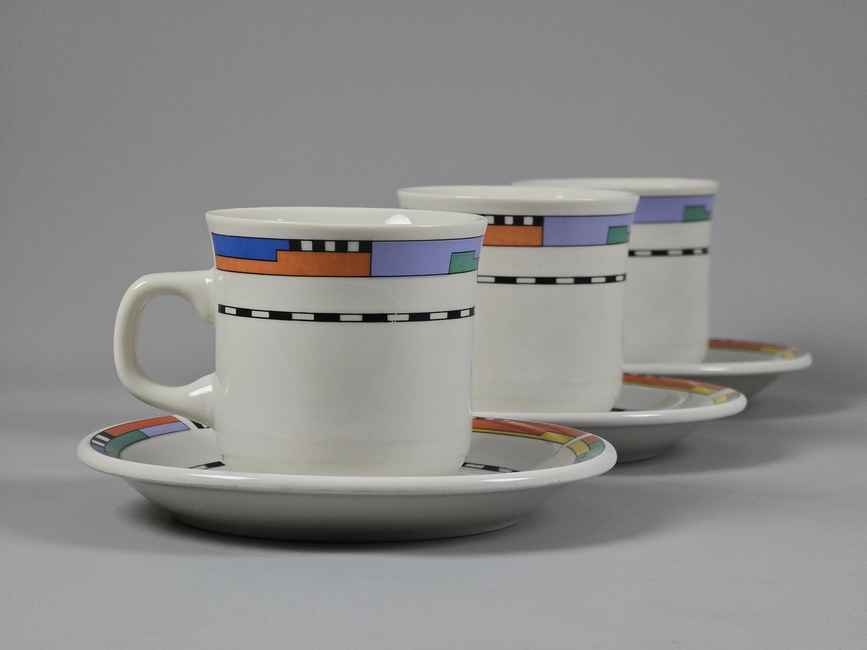Vintage 1980s Set Of 3 Postmodern Cups With Saucers, Memphis Style.