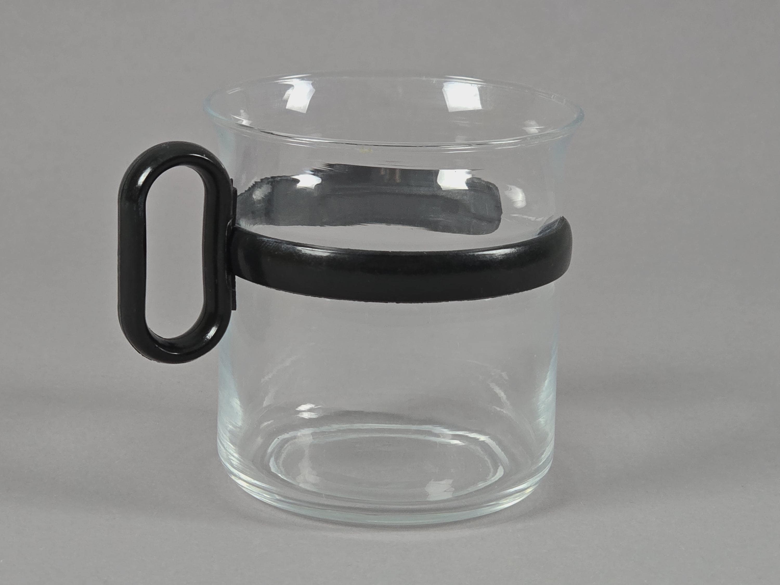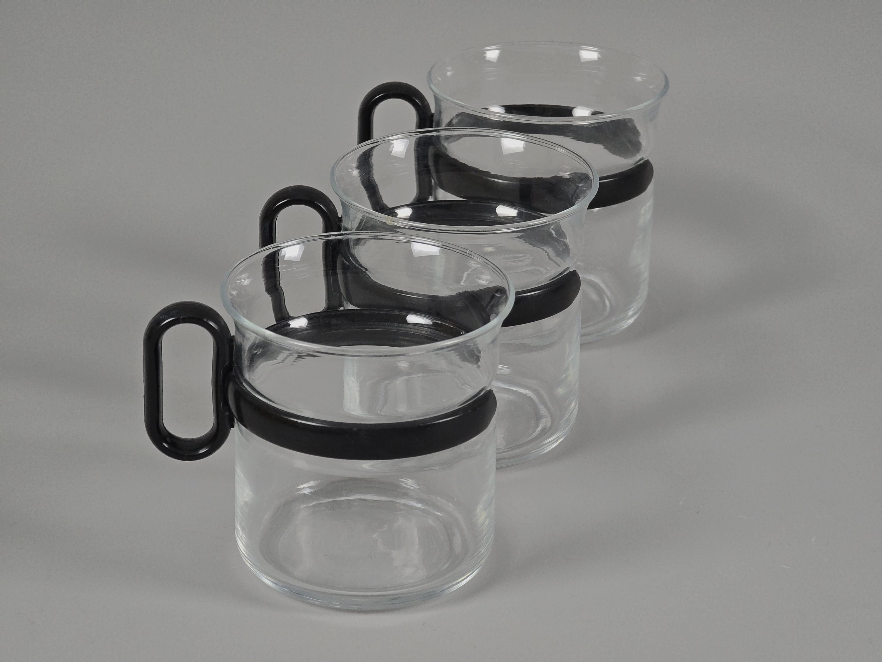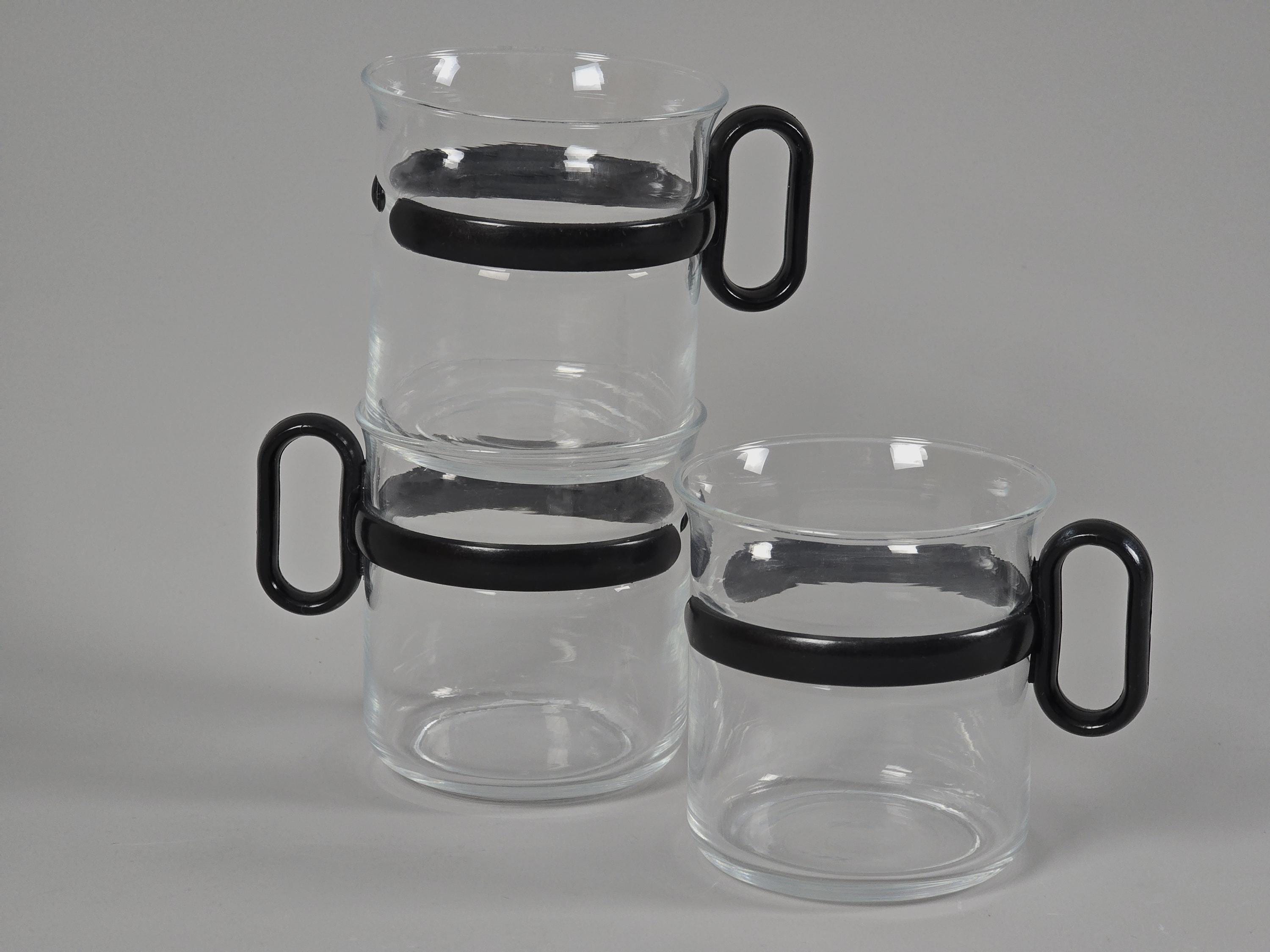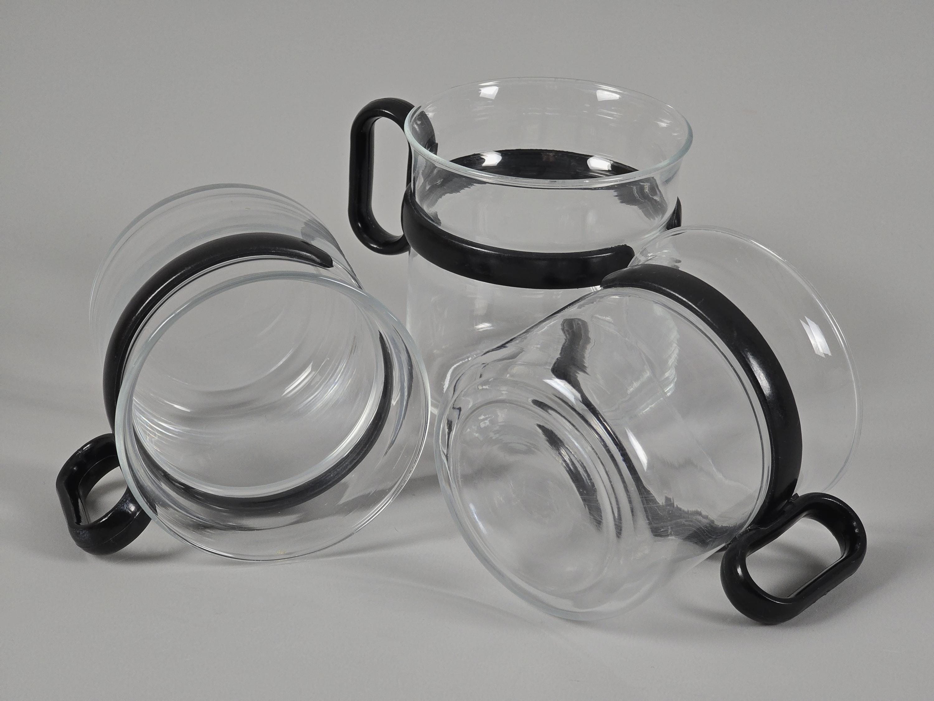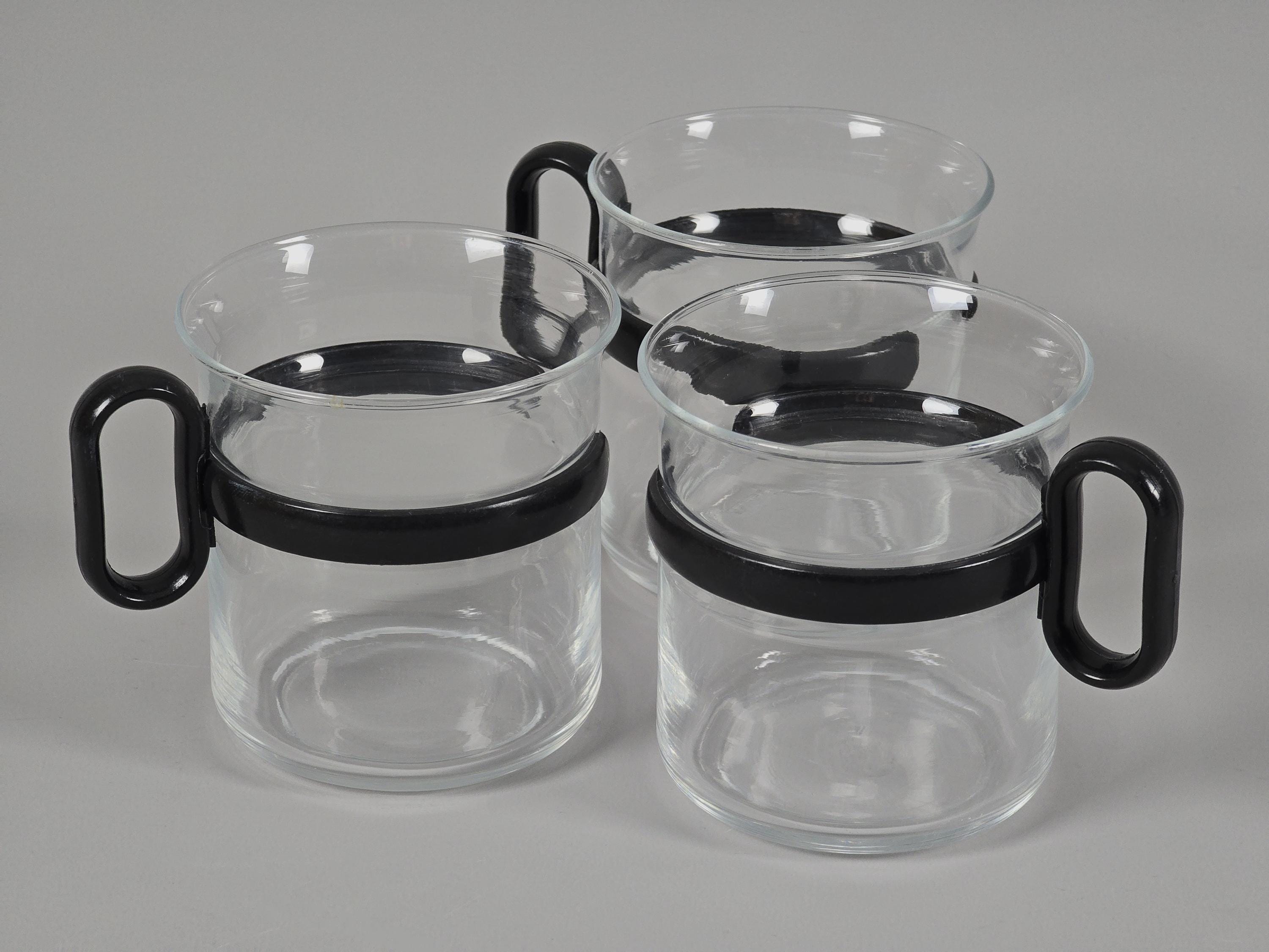 Vintage 1980s set of 3 glass mugs with black plastic holders.