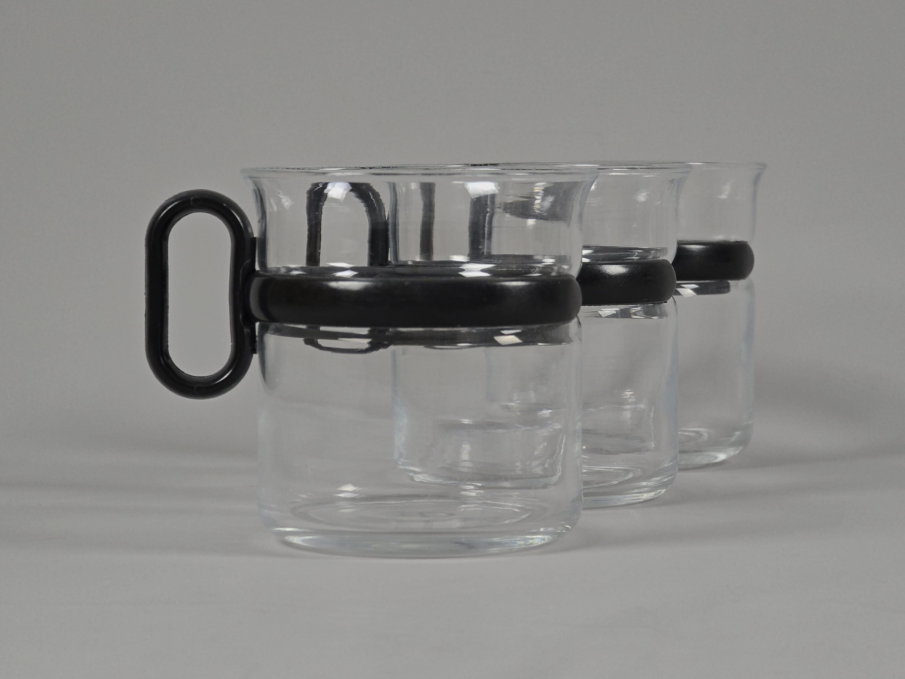 Vintage 1980s Set Of 3 Glass Cups With Black Plastic Holders.