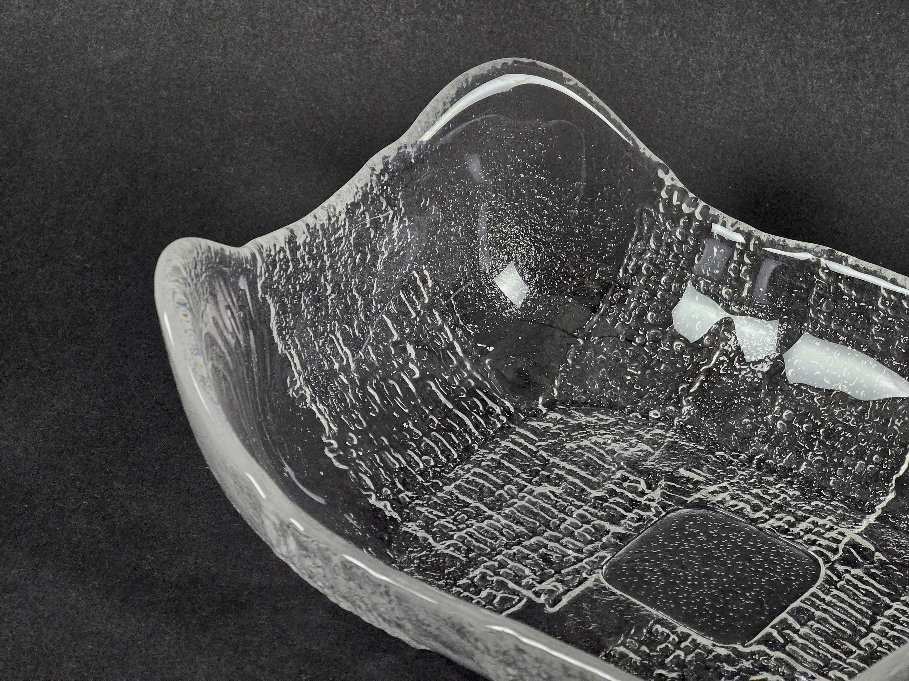 Vintage 1970s Swedish design glass bowl By Christer Sjögren for Lindshammar Glasbruk, a prominent Swedish glassworks company. It features a distinctive "Brutalist" design with a heavy, thick clear glass construction and a wavy, organic shape.