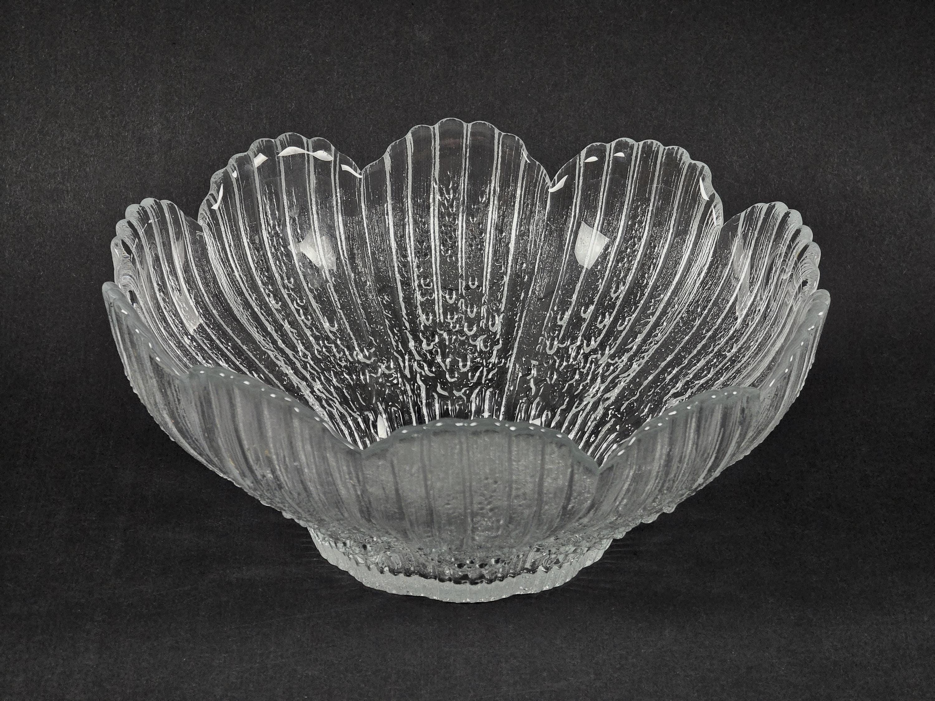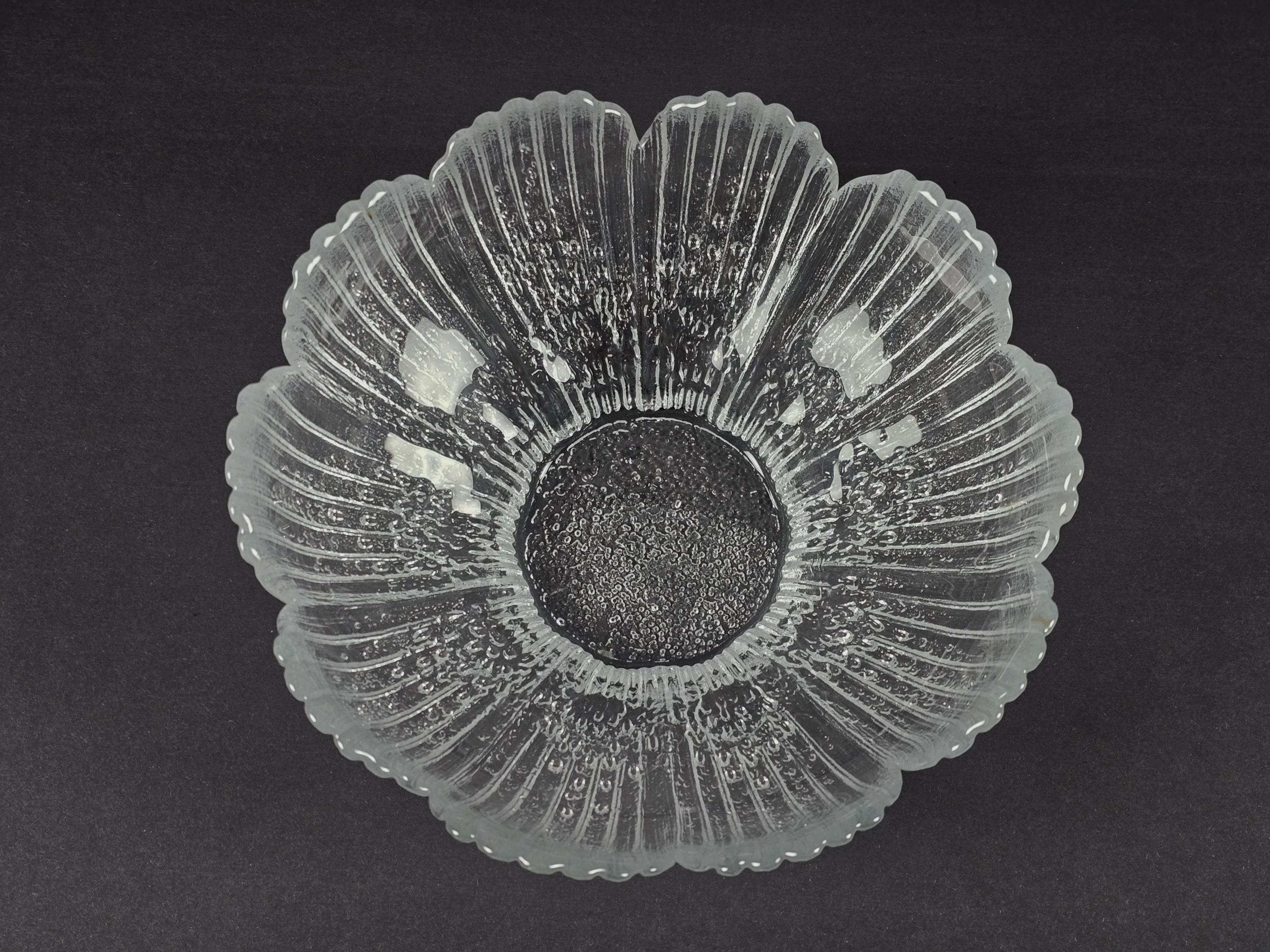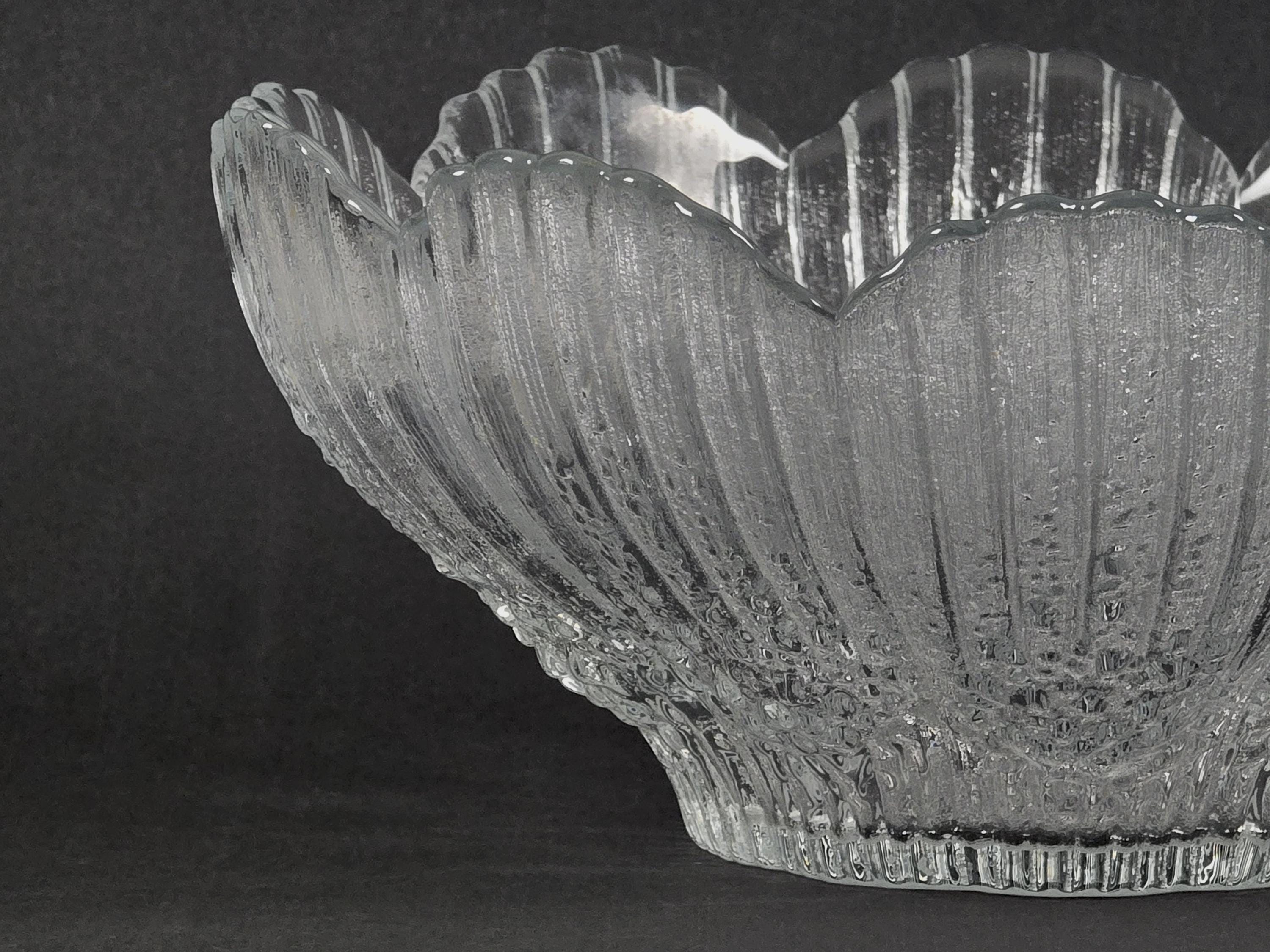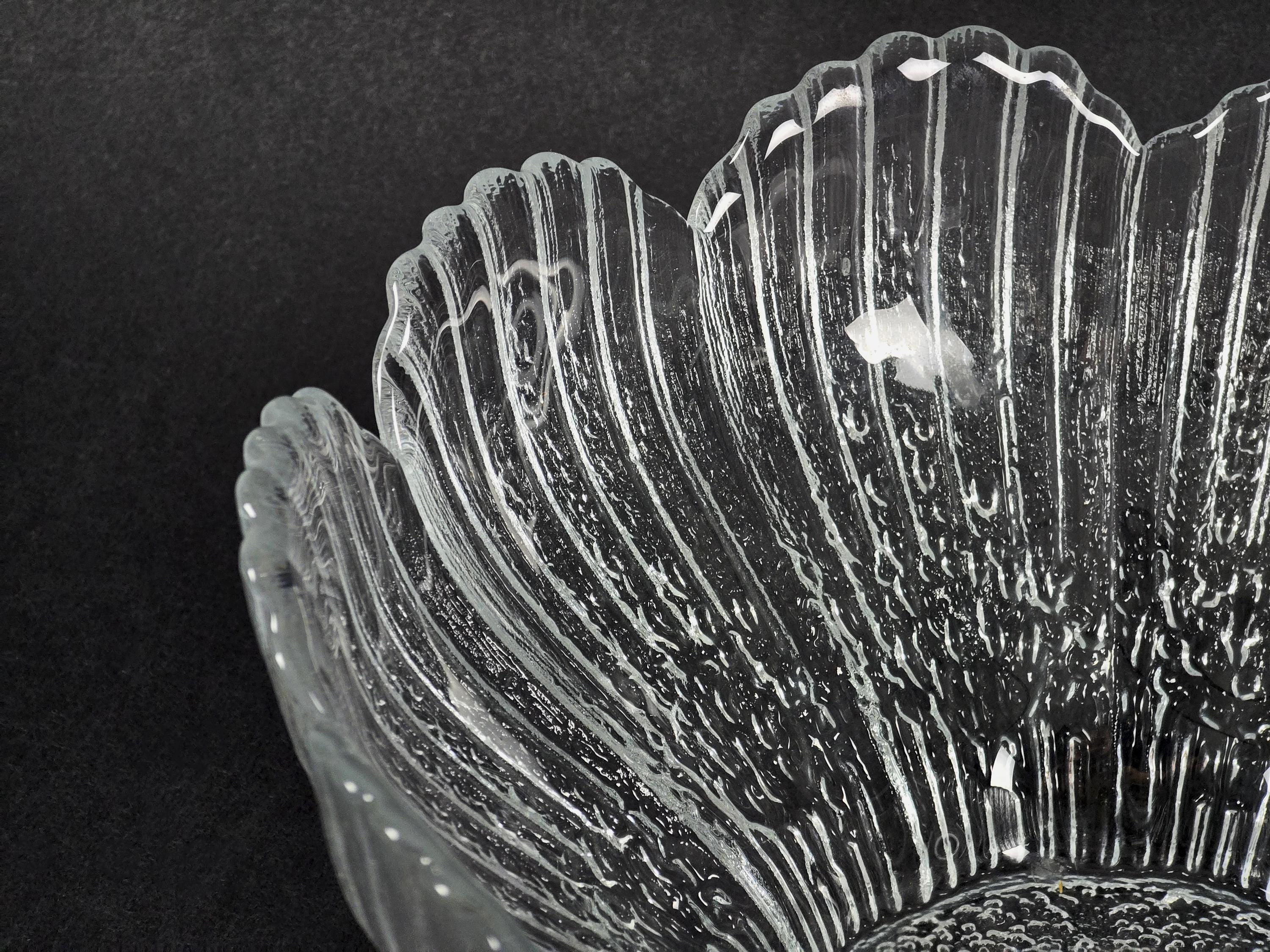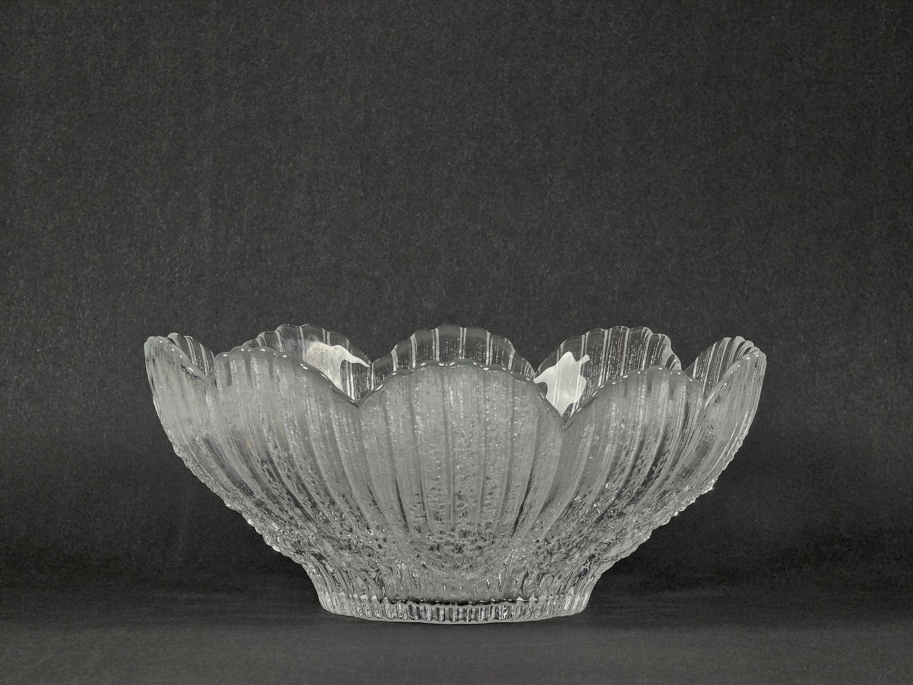 Vintage 1970s Finnish design glass bowl 'Hillankukka (Cloudberry Flower)' By Pertti Kallioinen For Humppila Lasi (Humppila Glass), a prominent Finnish glassworks company. The bowl features a textured, ice-like surface and a scalloped rim that resembles flower petals. It can be used as a serving bowl, fruit bowl, or a votive candle holder (malja/tuikku).