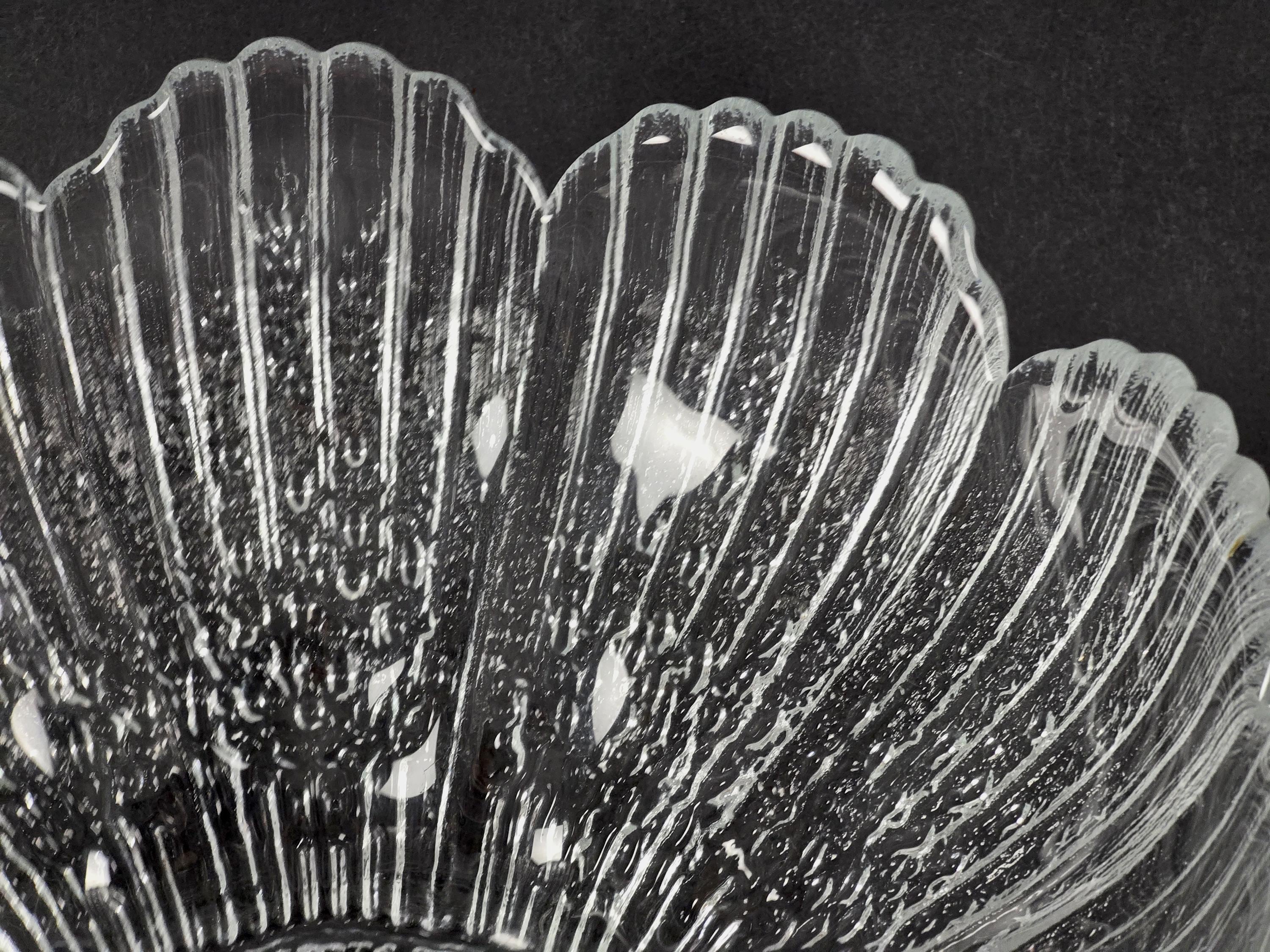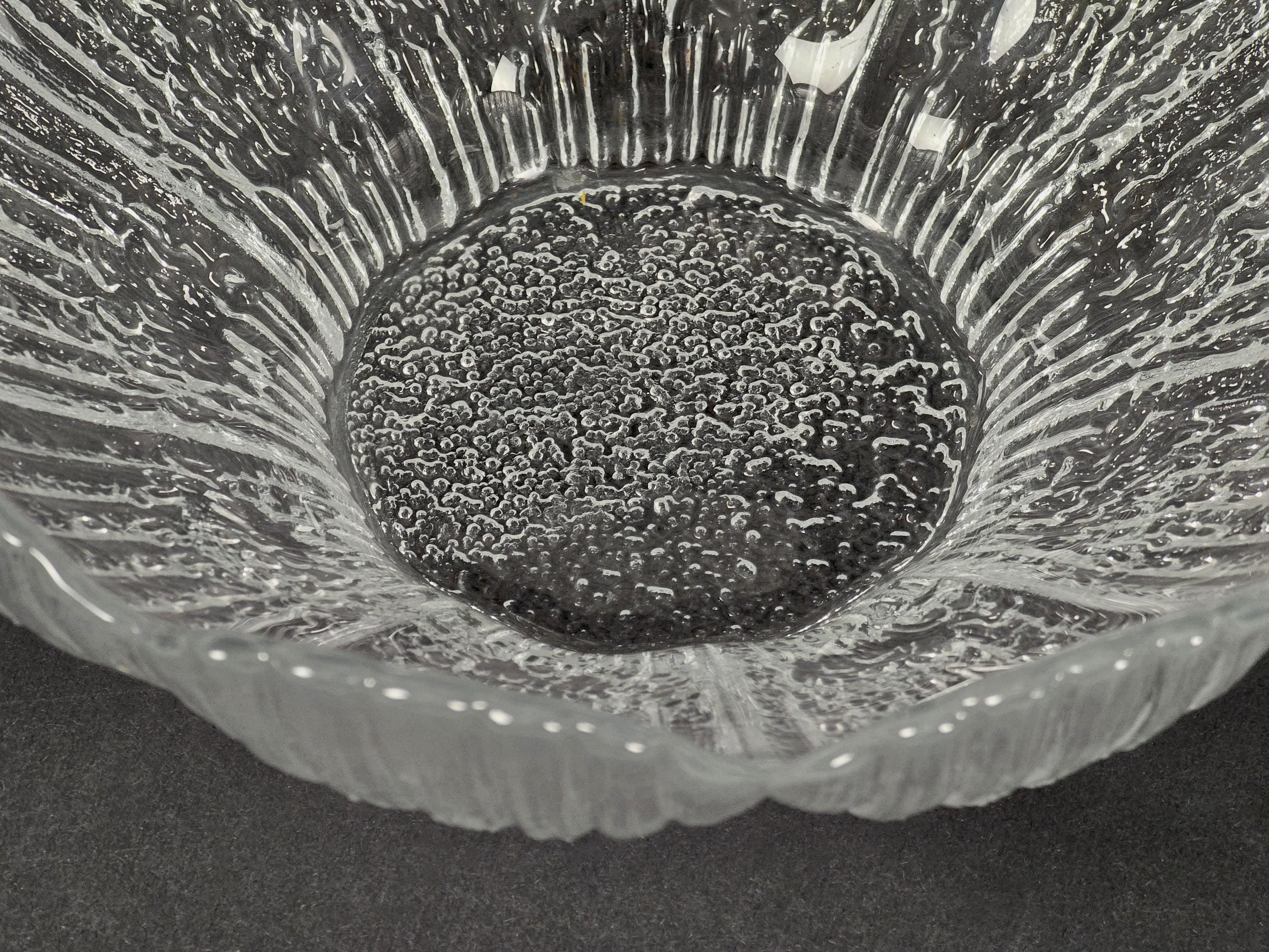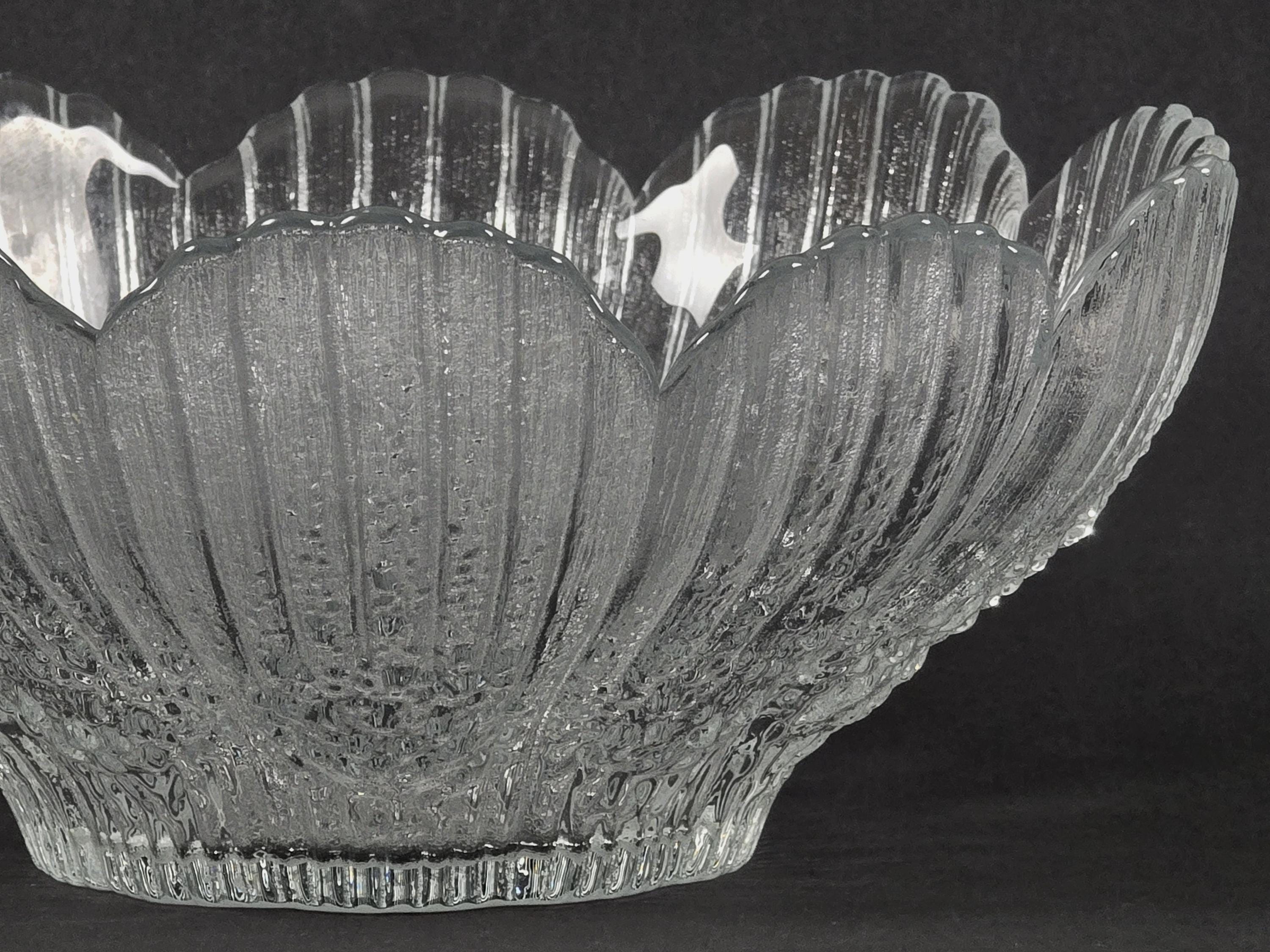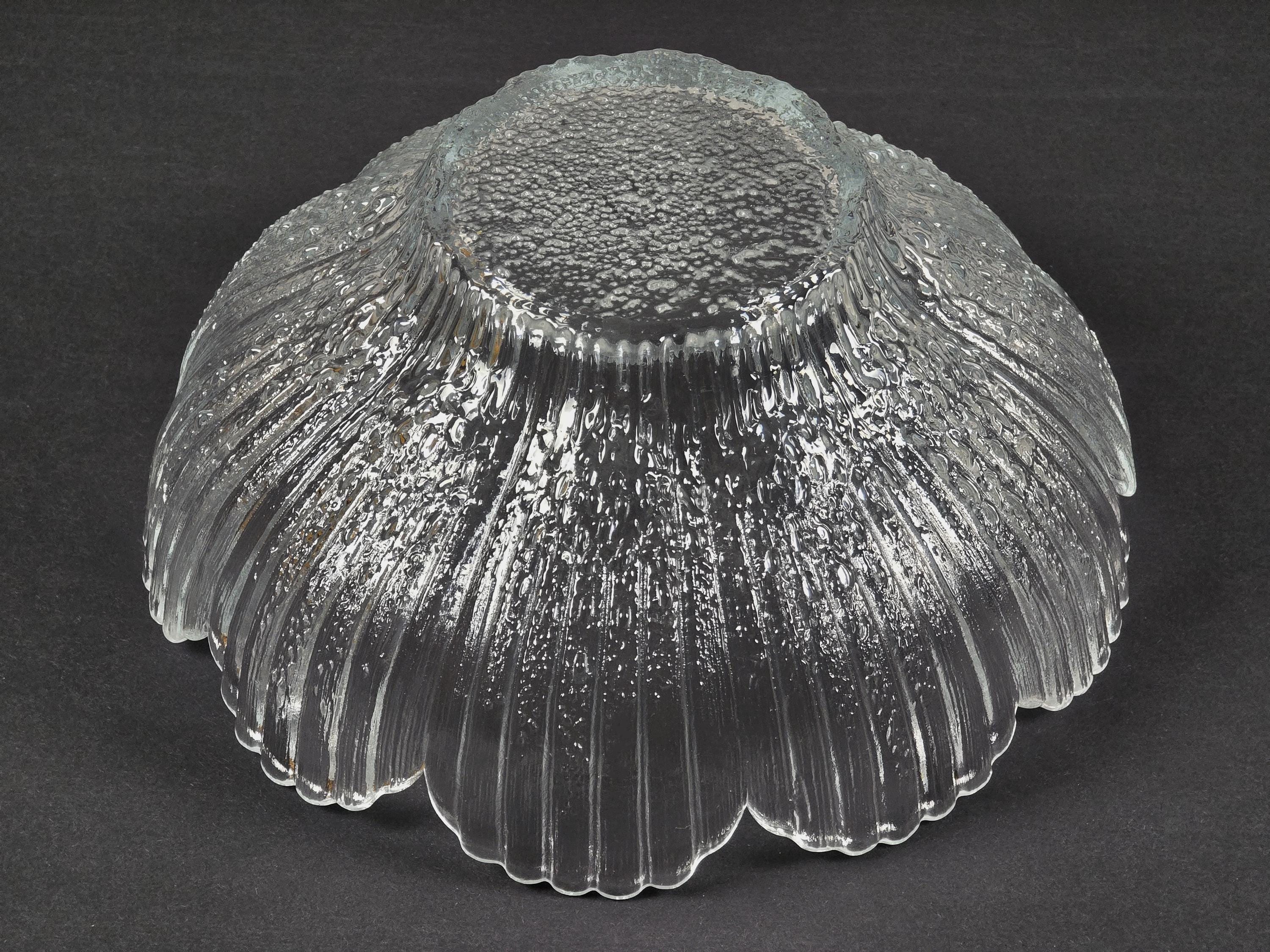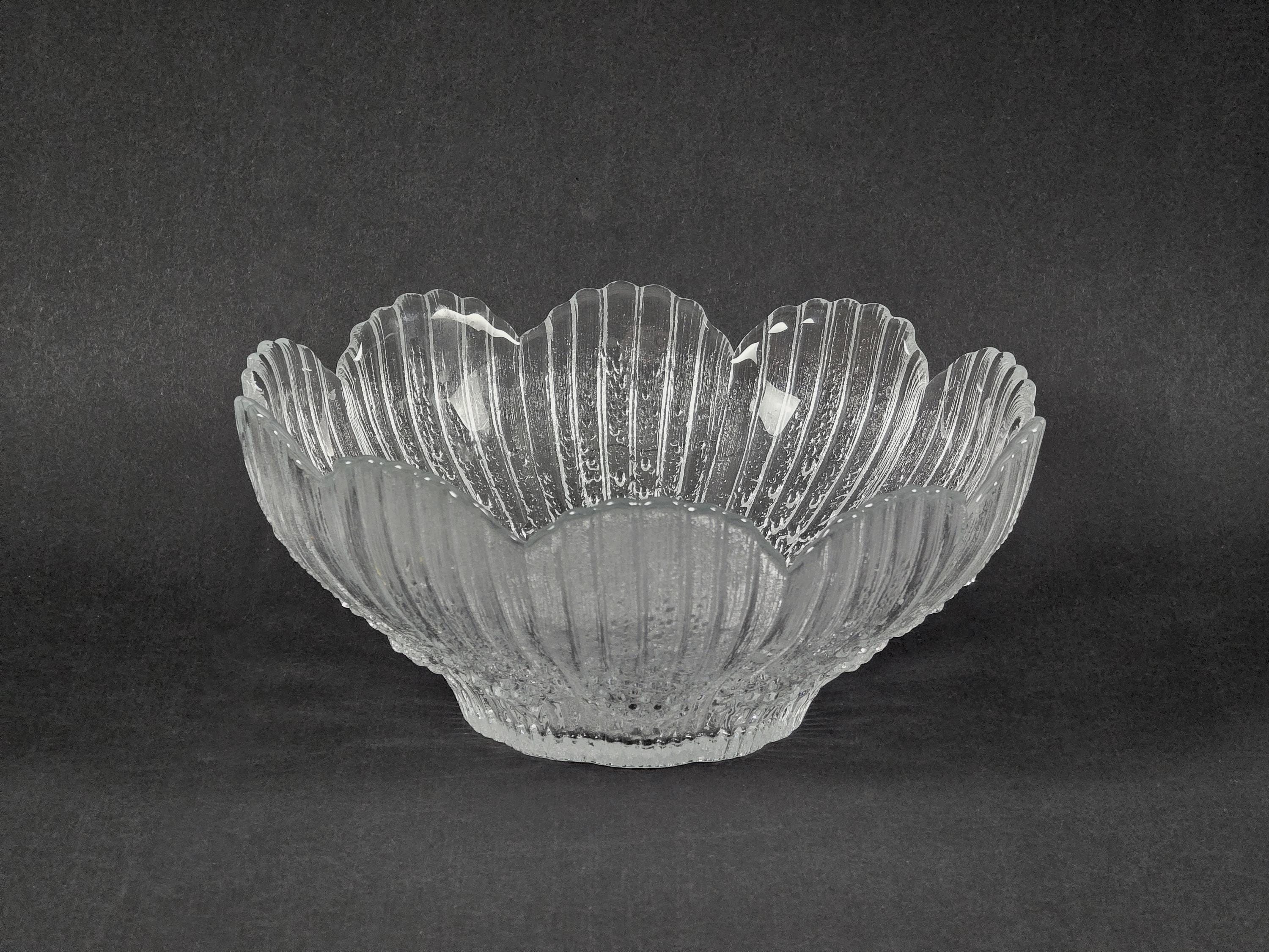 Vintage 1970s Finnish design glass bowl 'Hillankukka (Cloudberry Flower)' By Pertti Kallioinen For Humppila Lasi (Humppila Glass), a prominent Finnish glassworks company. The bowl features a textured, ice-like surface and a scalloped rim that resembles flower petals. It can be used as a serving bowl, fruit bowl, or a votive candle holder (malja/tuikku).