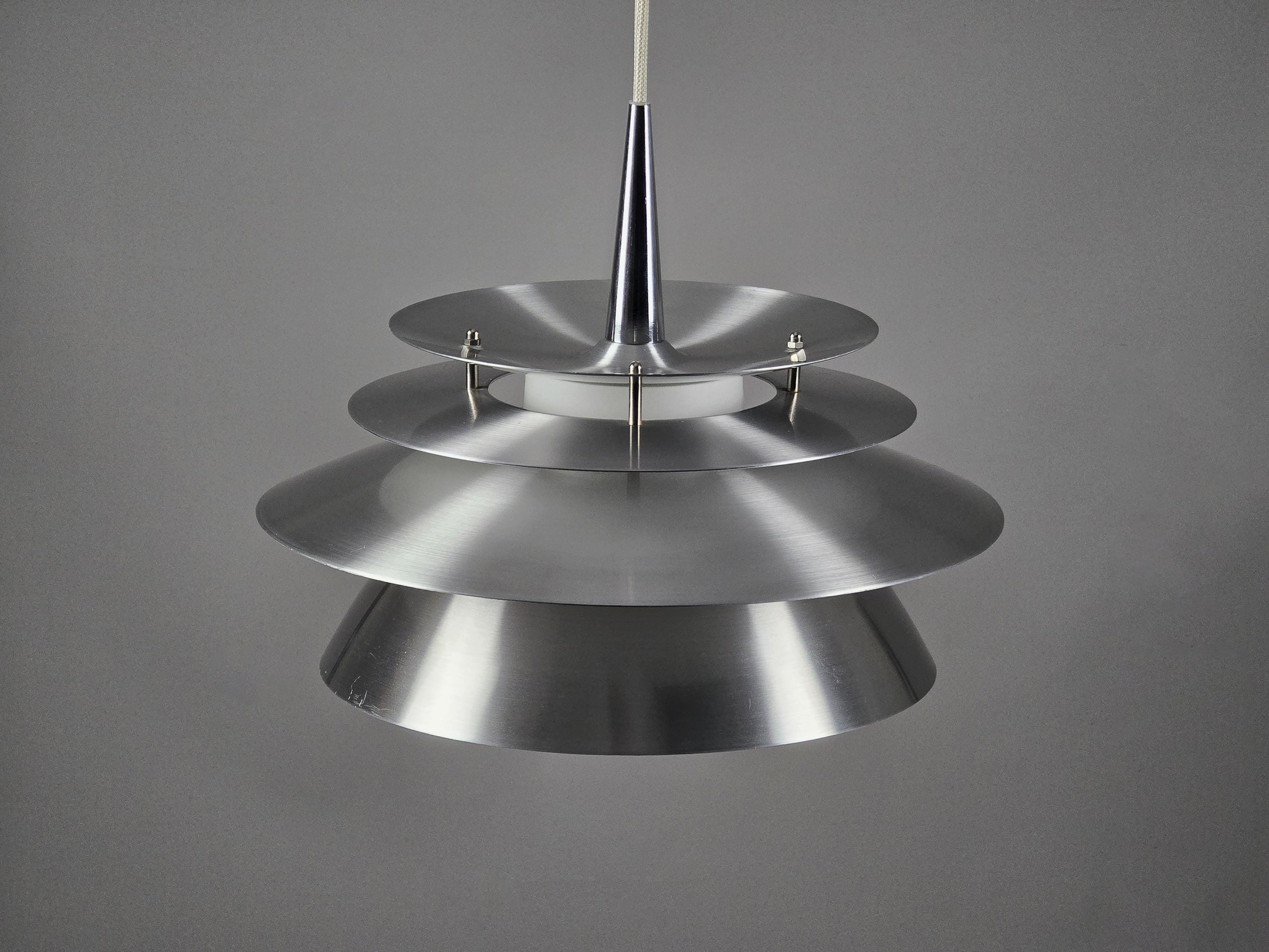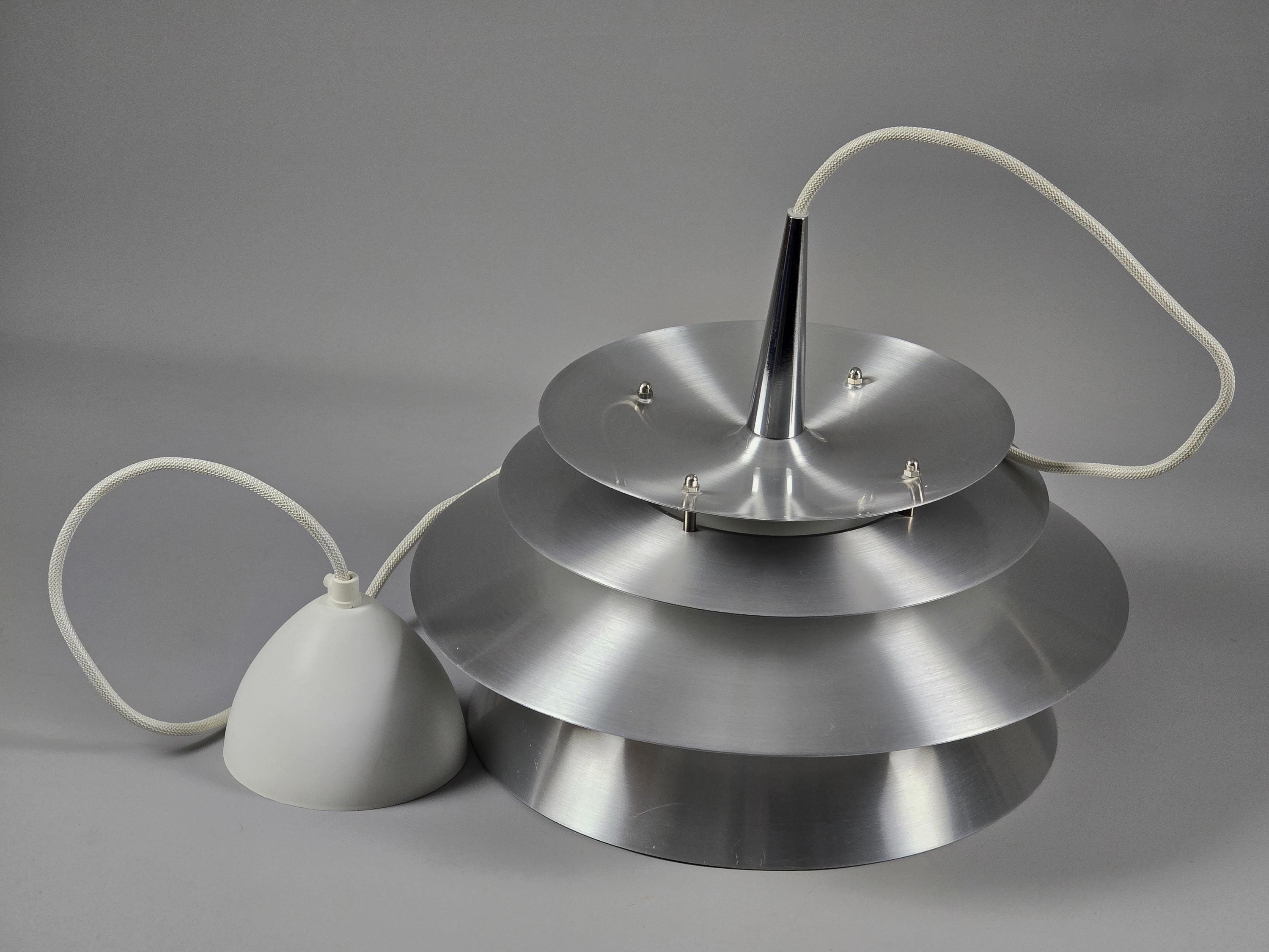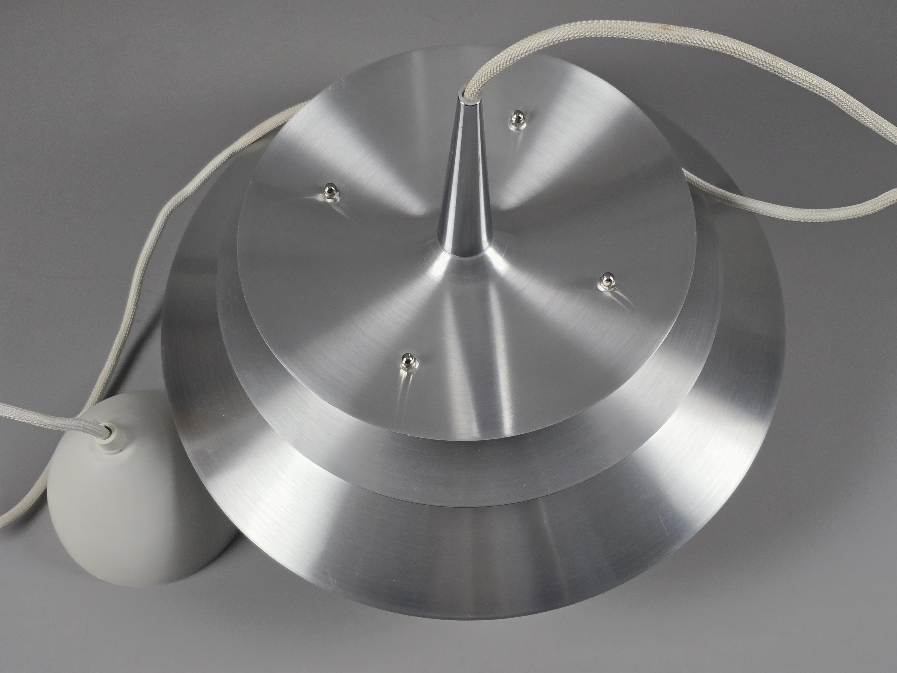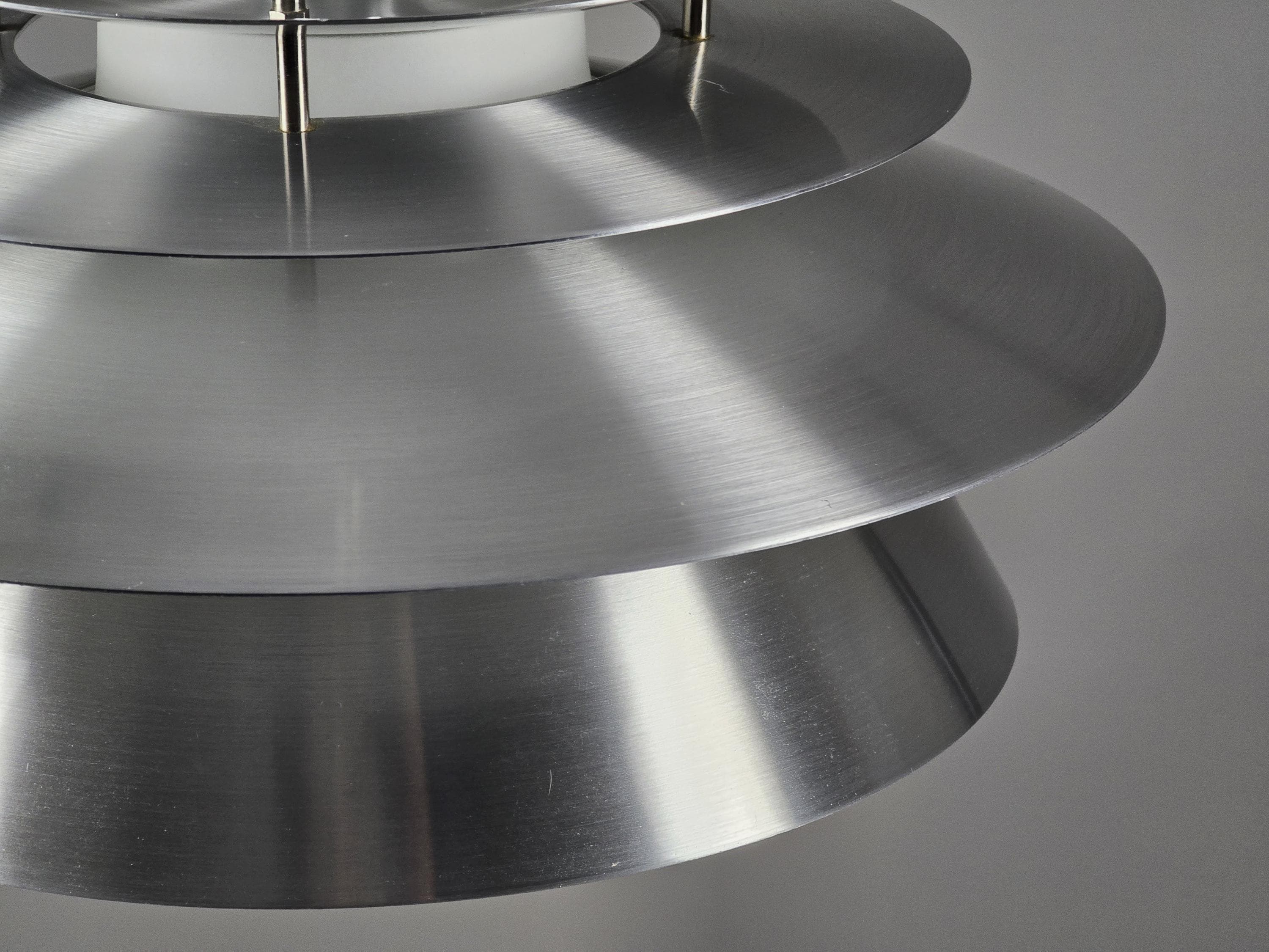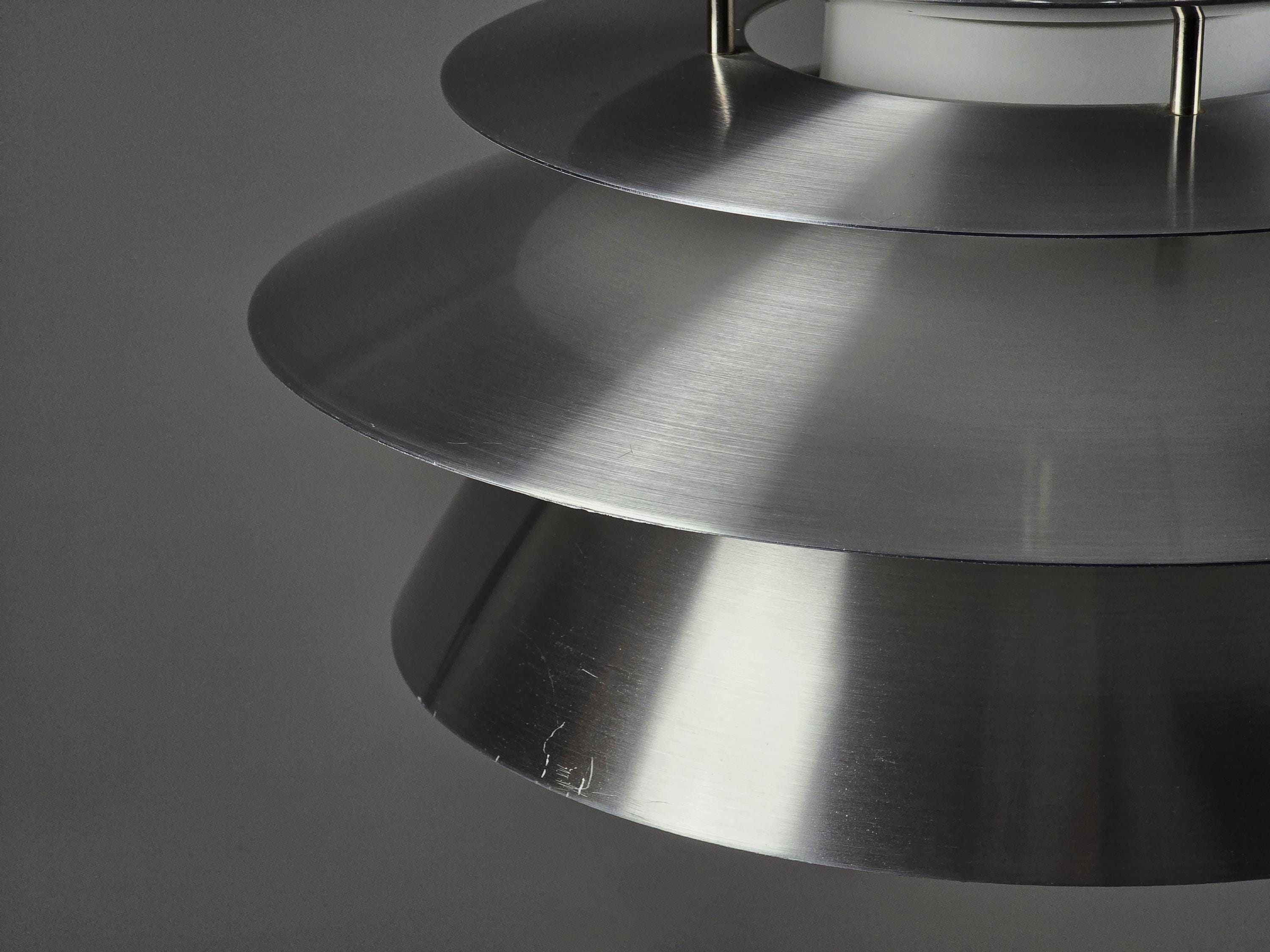 Vintage 1990s Scandinavian pendant lamp type T1193 in brushed aluminium by Belid Sweden. It features a classic Mid-Century Modern design with multiple tiered, reflective metal shades that diffuse light to be 100% glare-free.The interior of the shades is white-lacquered to enhance light reflection.