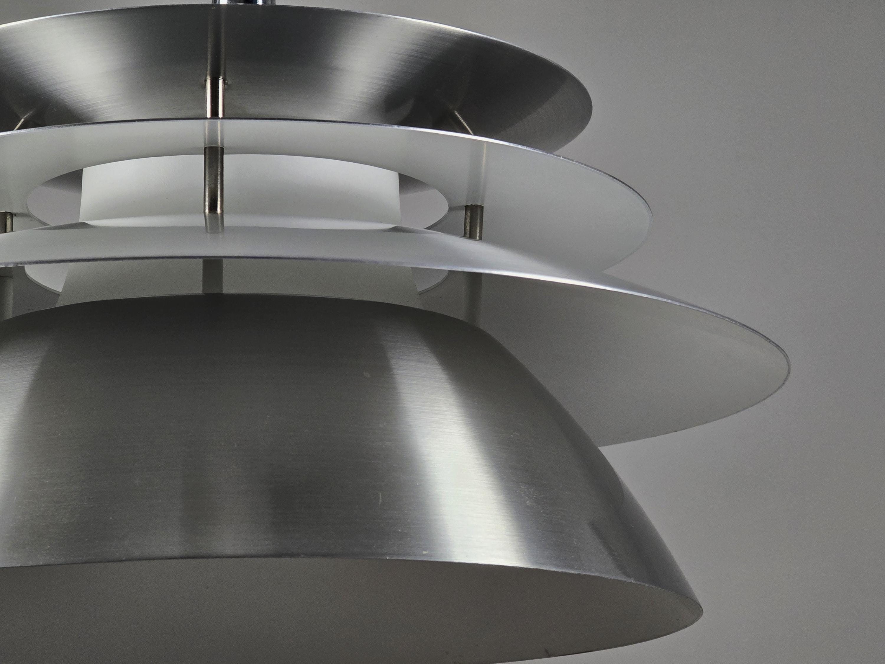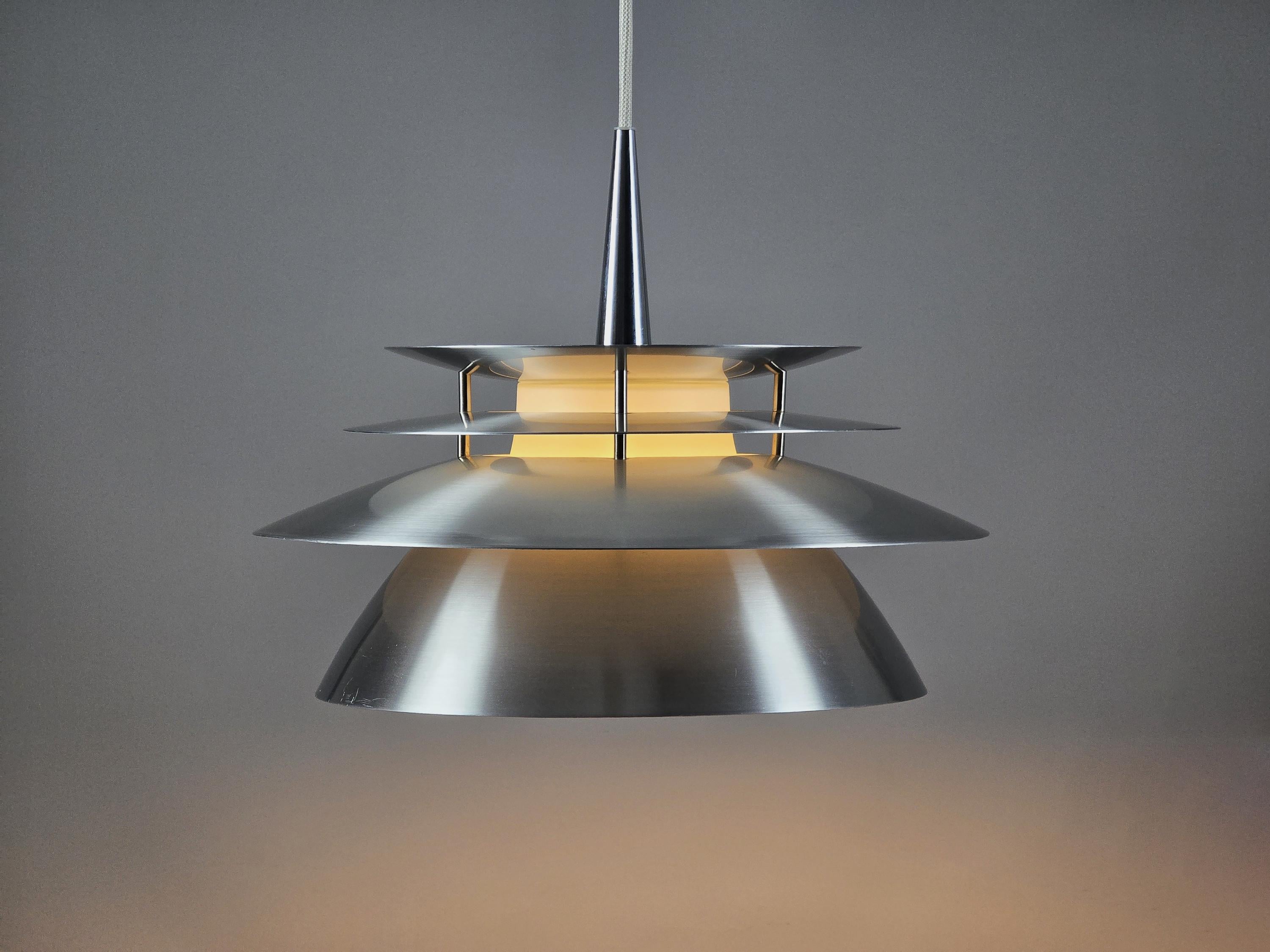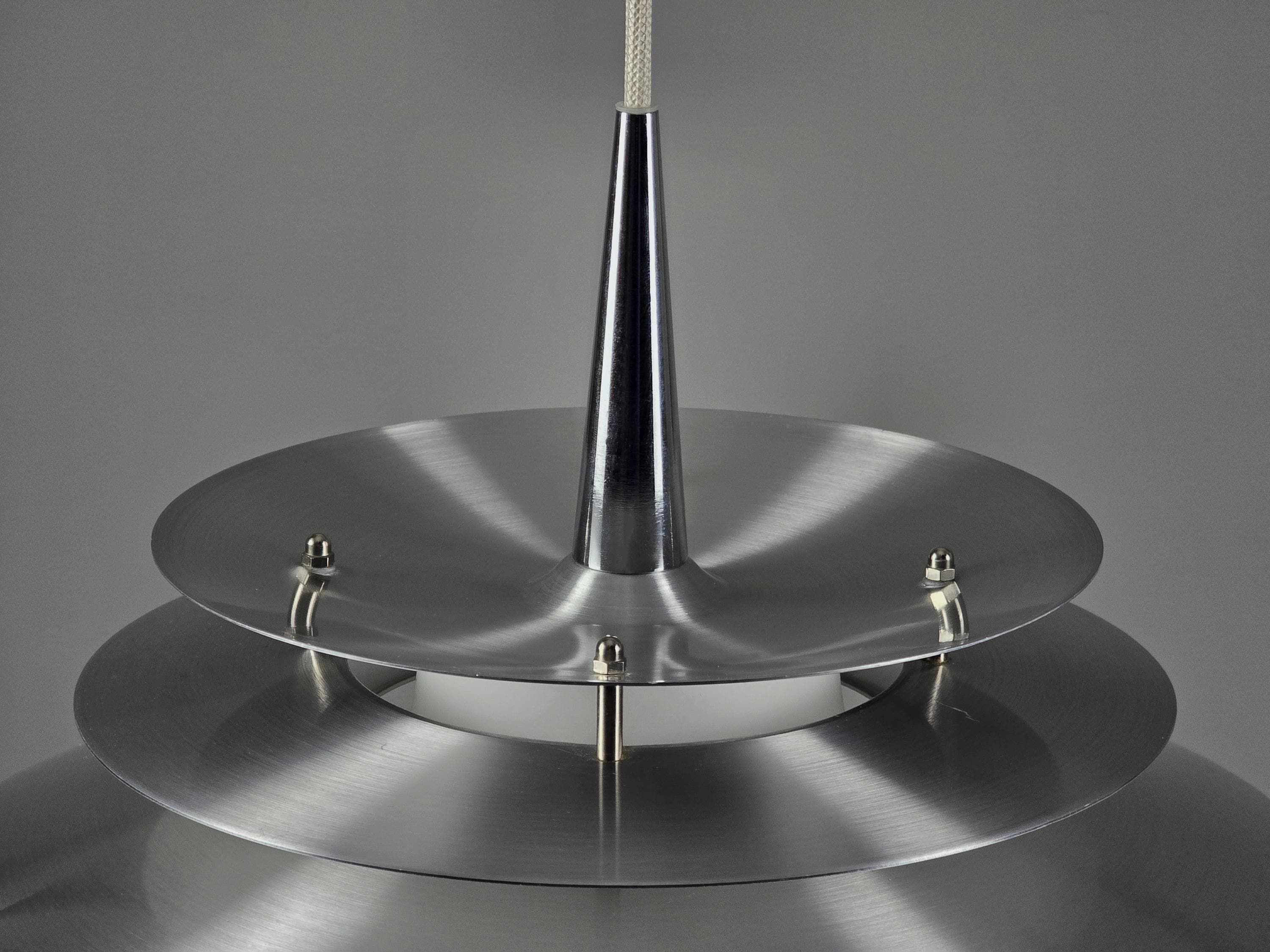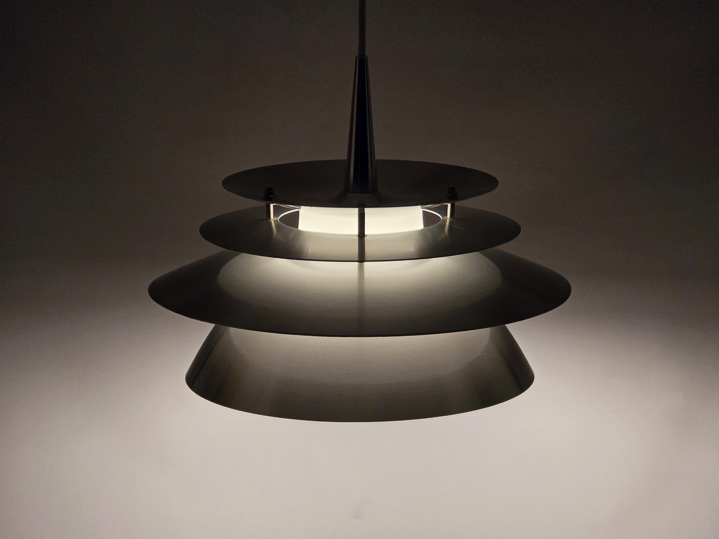 Vintage 1990s Scandinavian pendant lamp type T1193 in brushed aluminium by Belid Sweden. It features a classic Mid-Century Modern design with multiple tiered, reflective metal shades that diffuse light to be 100% glare-free.The interior of the shades is white-lacquered to enhance light reflection.