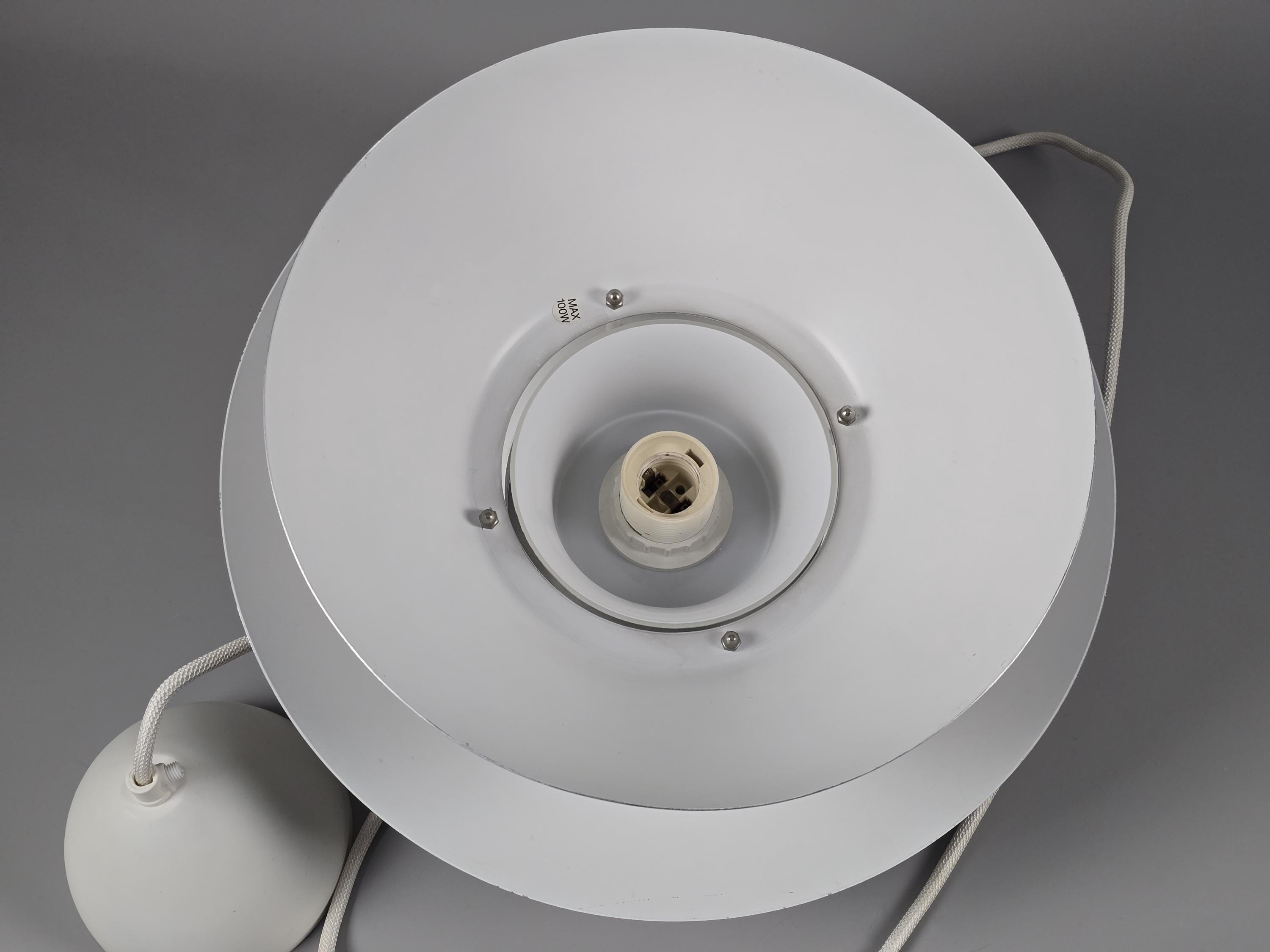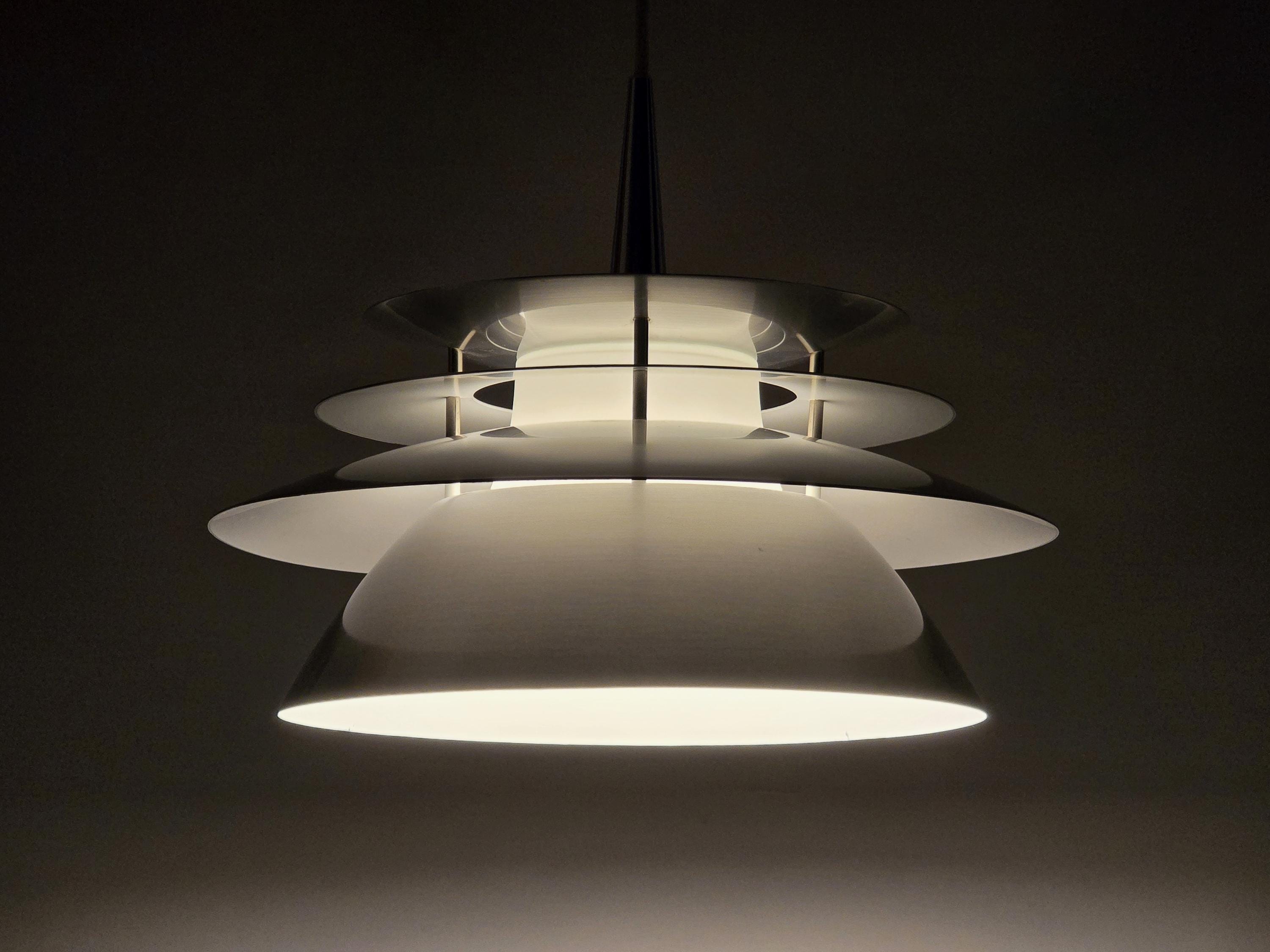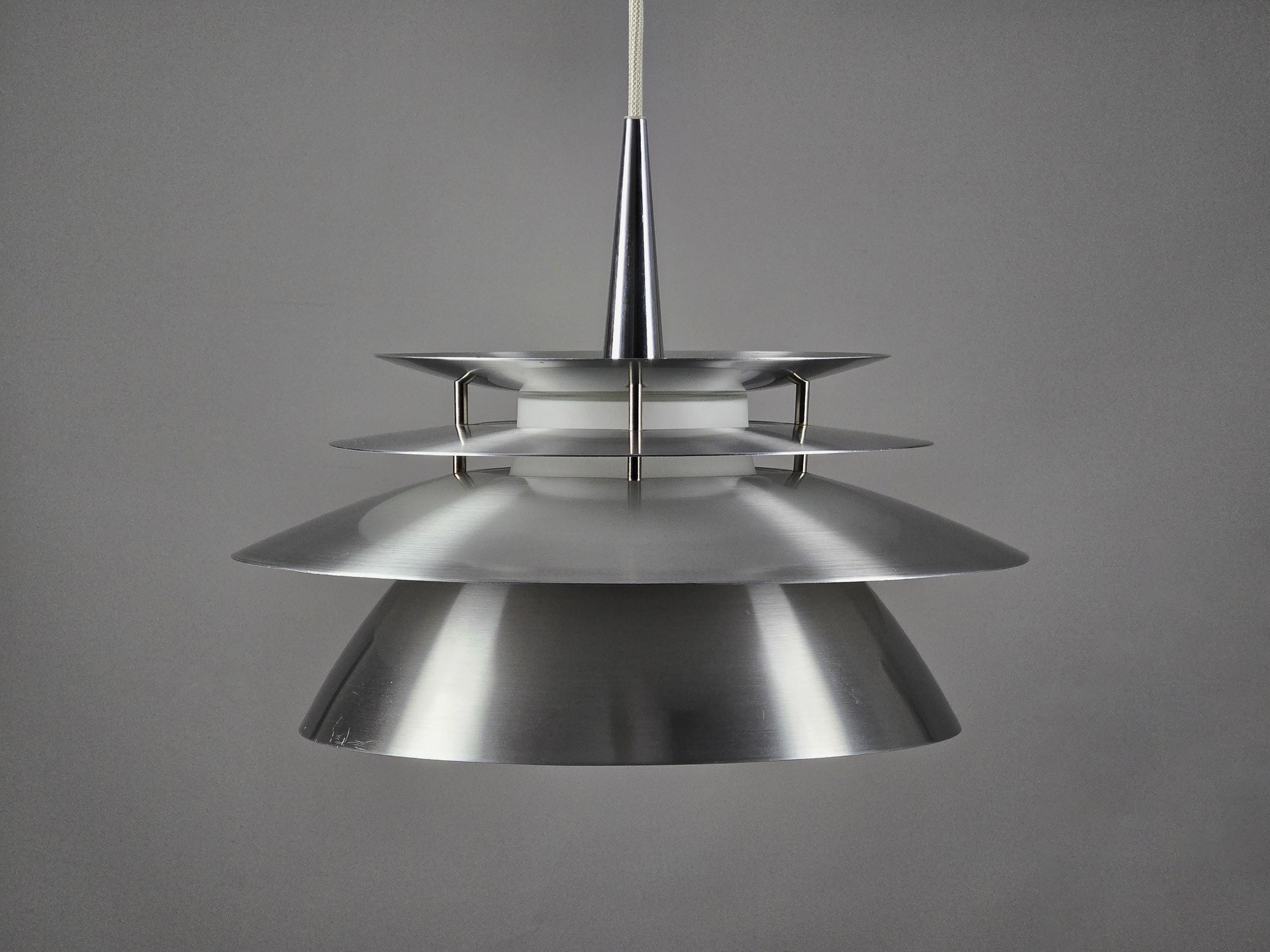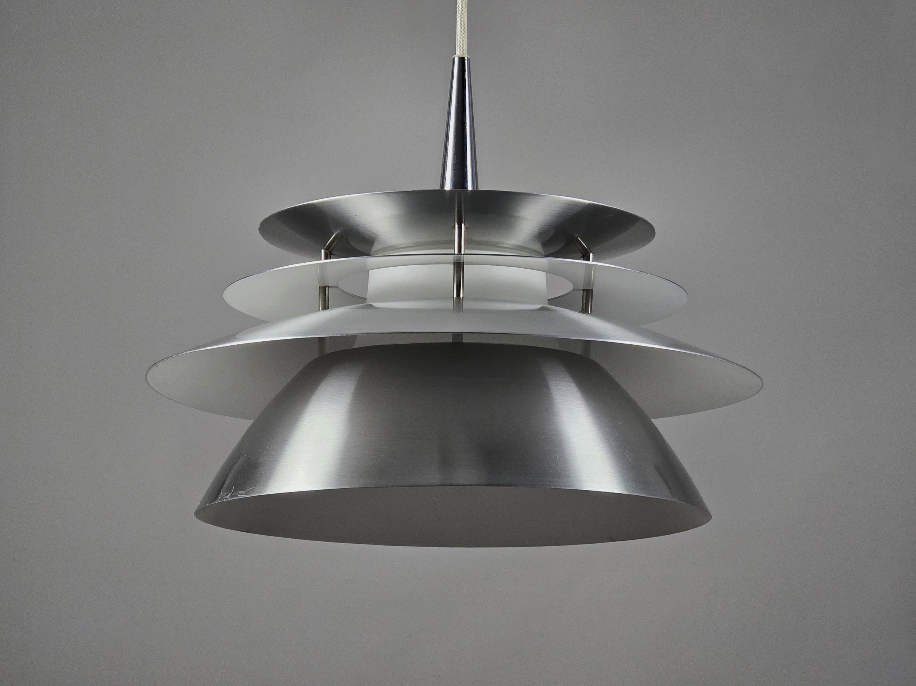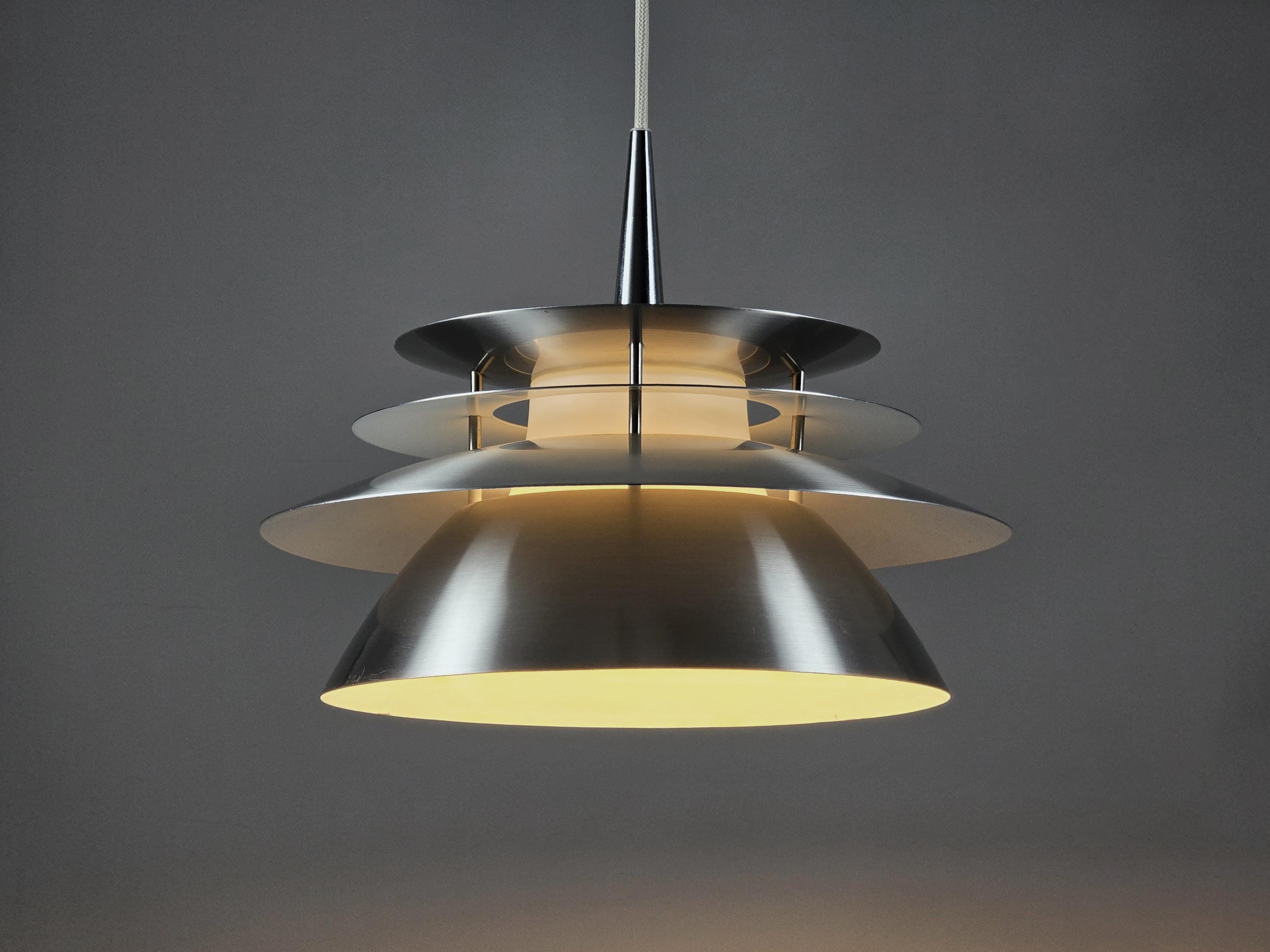 Vintage 1990s Scandinavian pendant lamp type T1193 in brushed aluminium by Belid Sweden. It features a classic Mid-Century Modern design with multiple tiered, reflective metal shades that diffuse light to be 100% glare-free.The interior of the shades is white-lacquered to enhance light reflection.