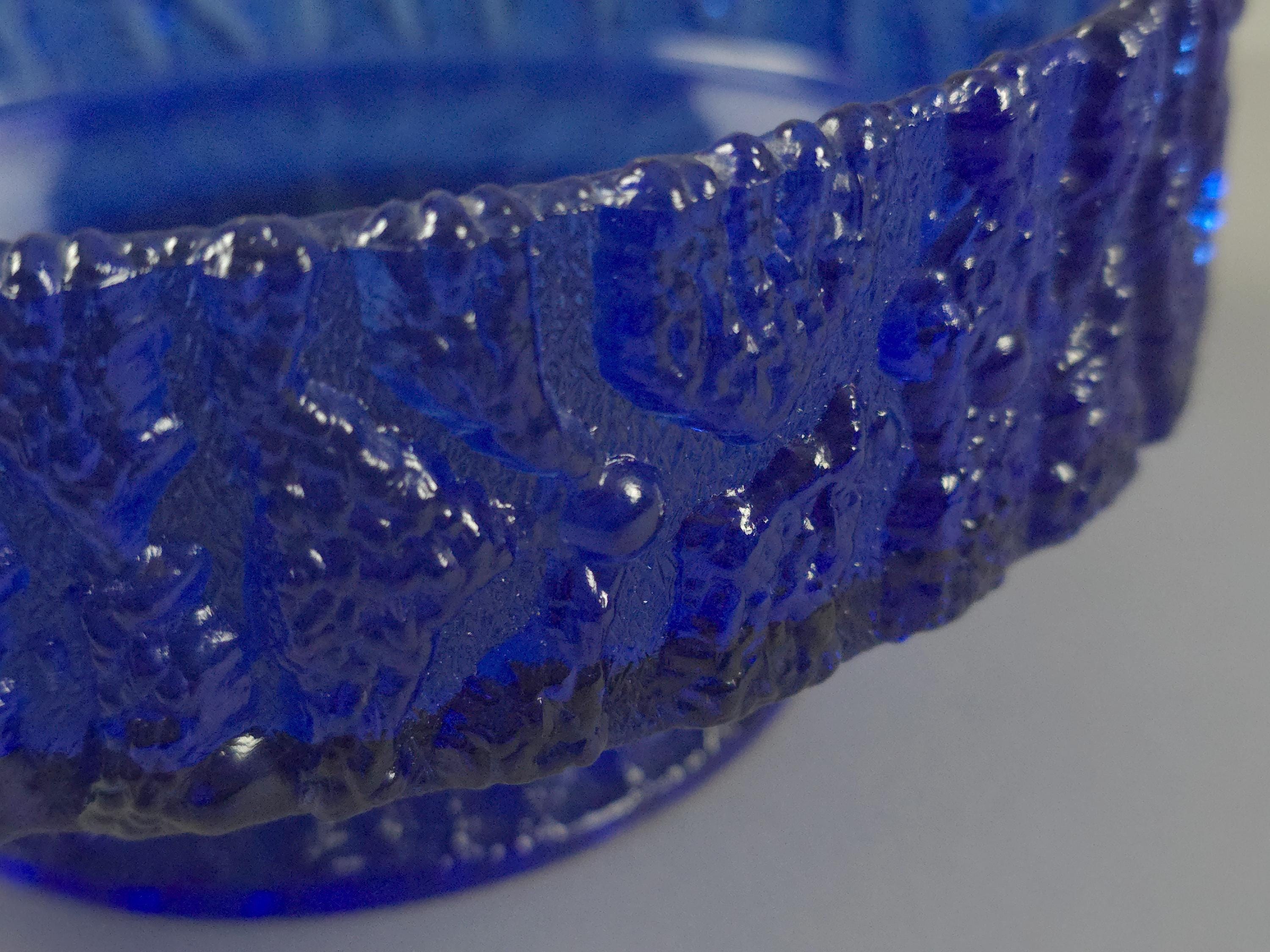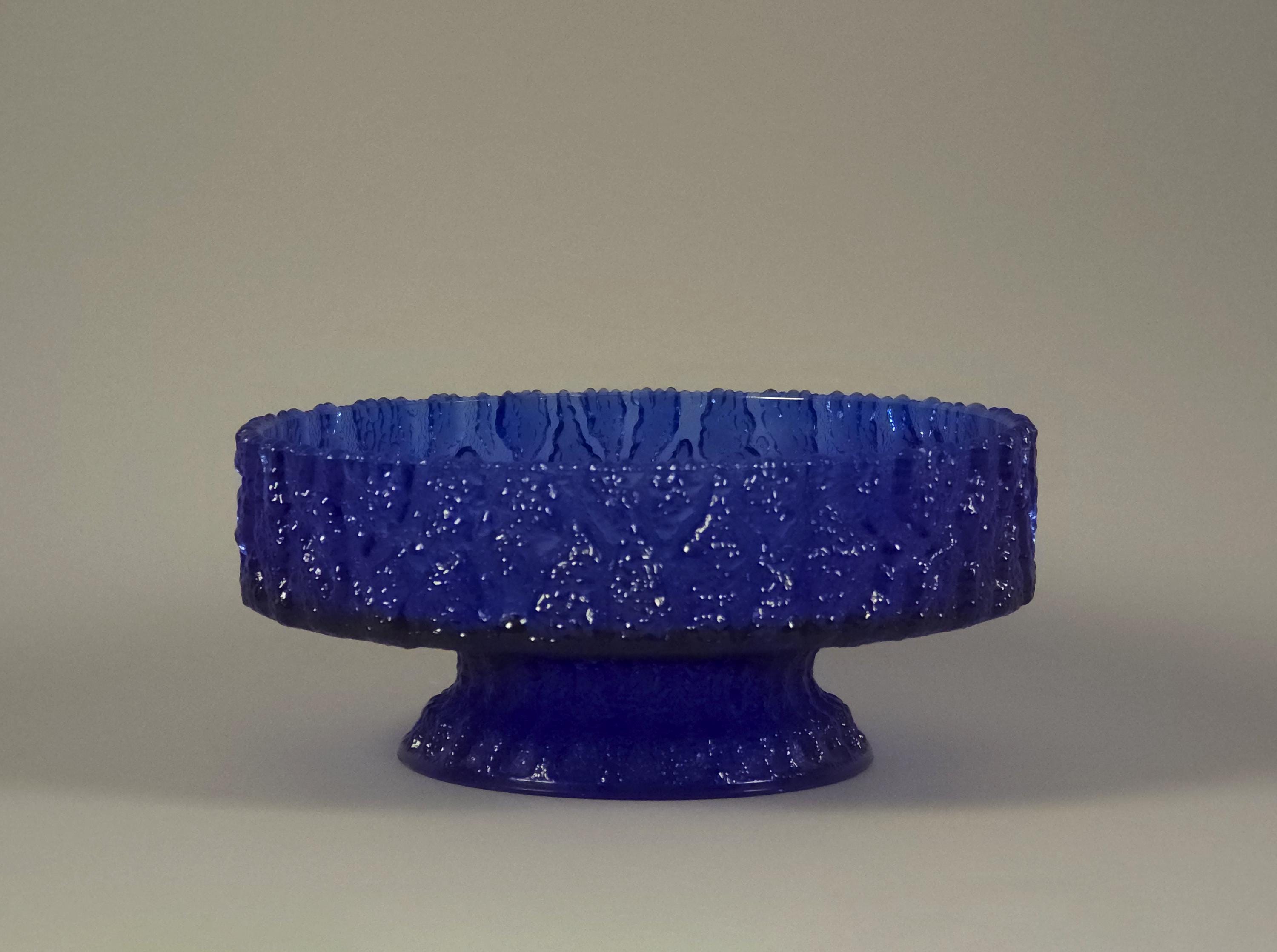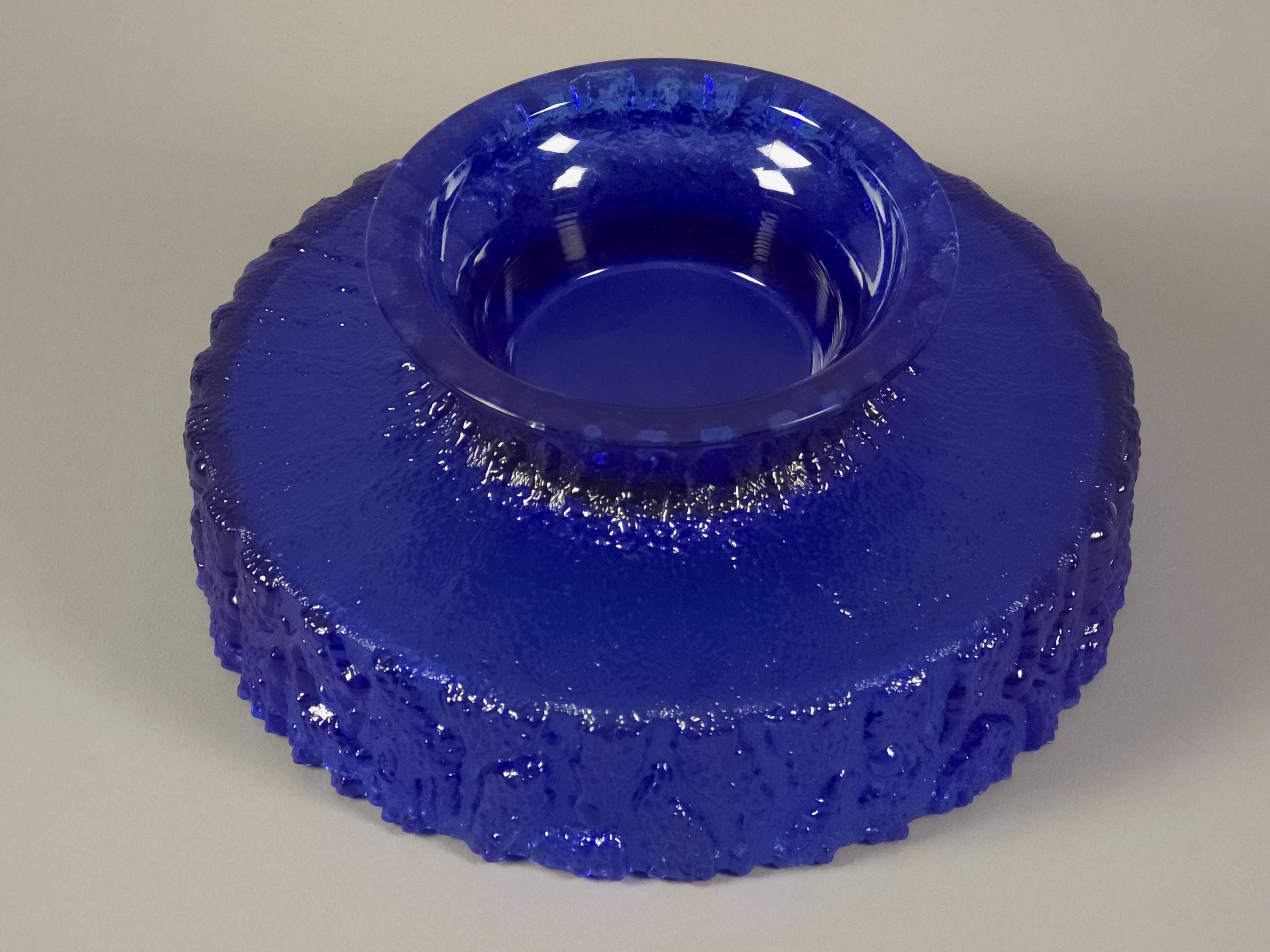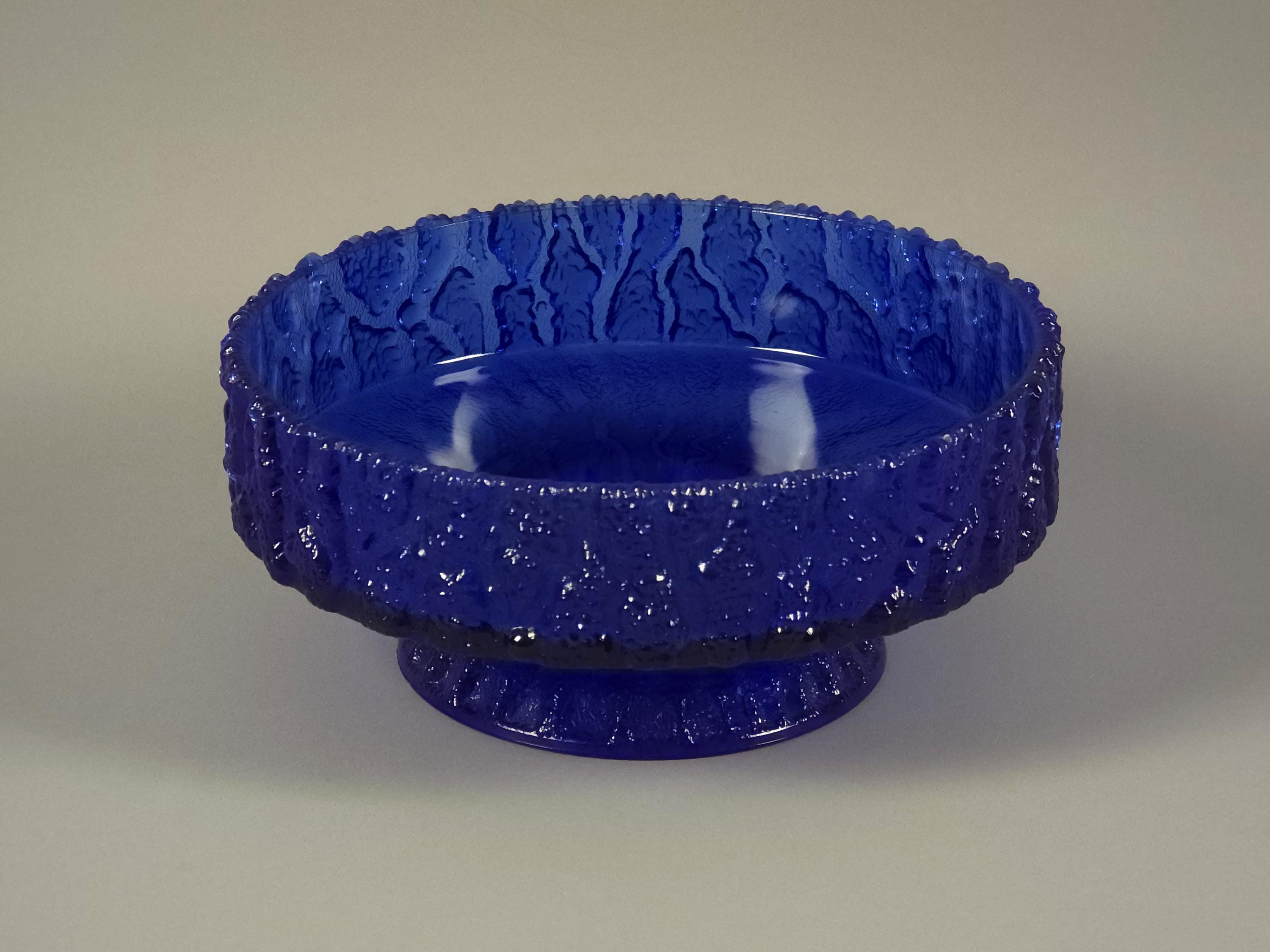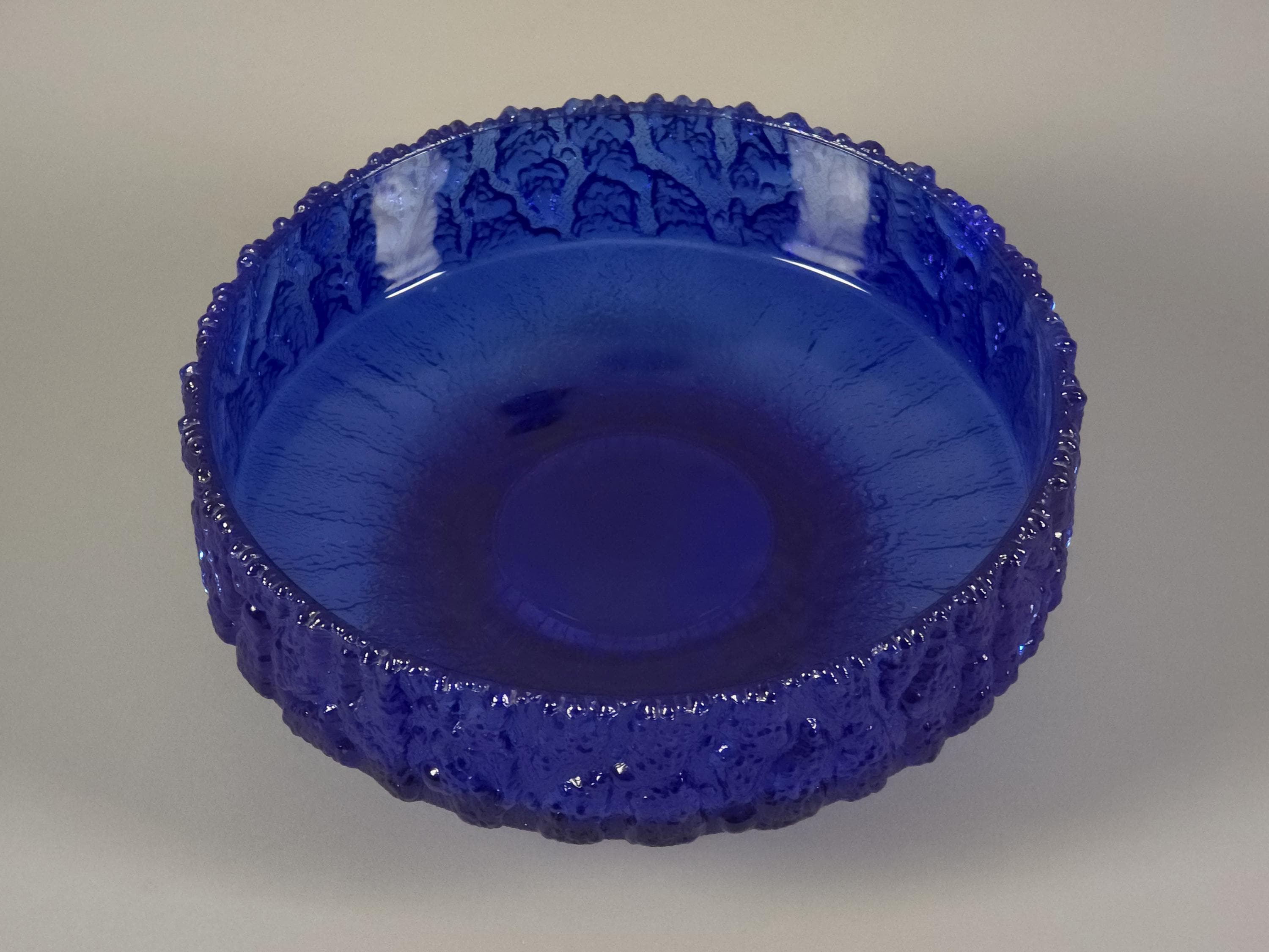 Vintage 1960s Kingfisher-Blue 'Bark' glass bowl by Geoffrey Baxter for Whitefriars. These pieces, part of the "Textured Range" designed by Geoffrey Baxter in the 1960s and 70s, feature a distinctive, brutalist tree bark-inspired texture.
