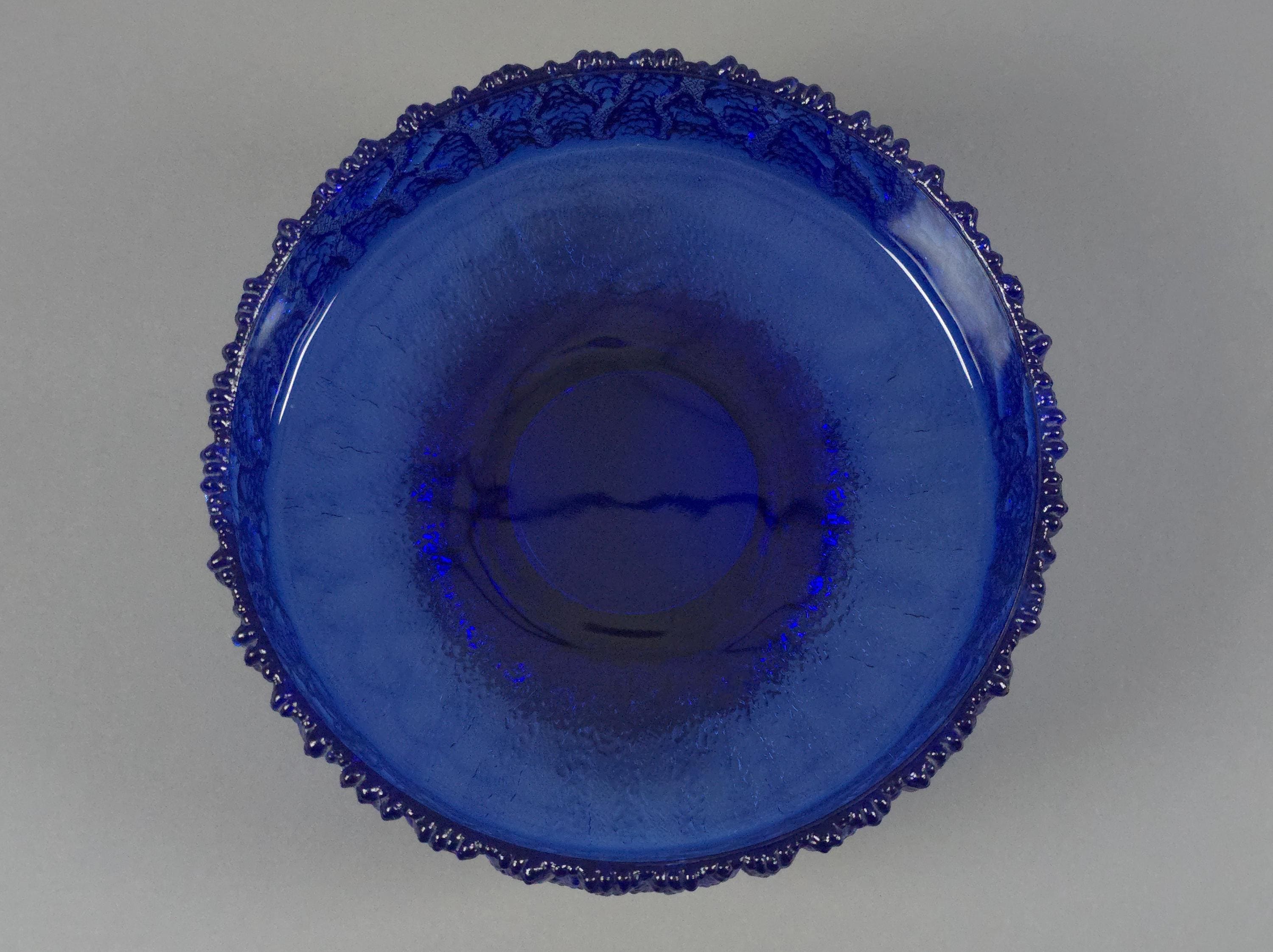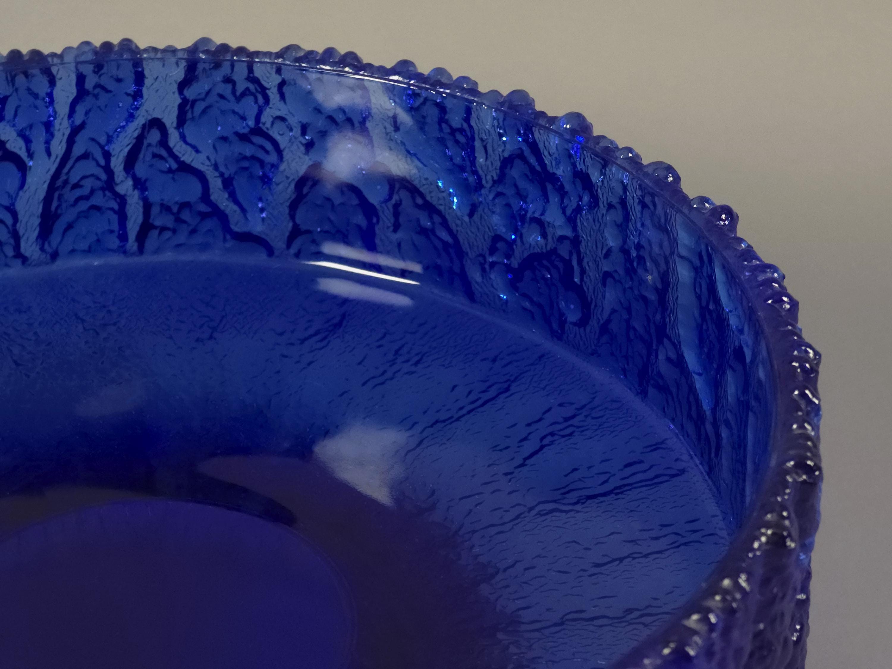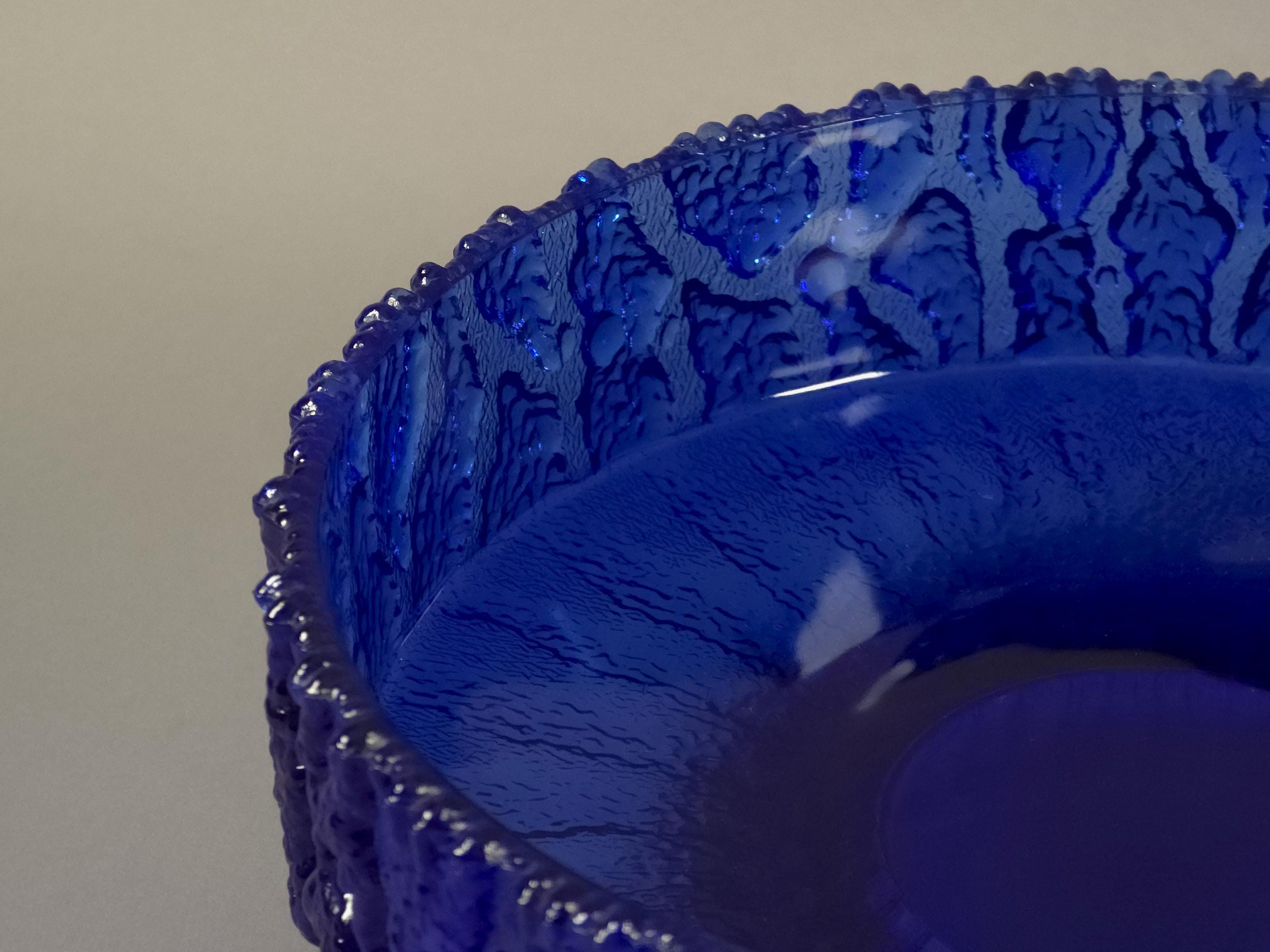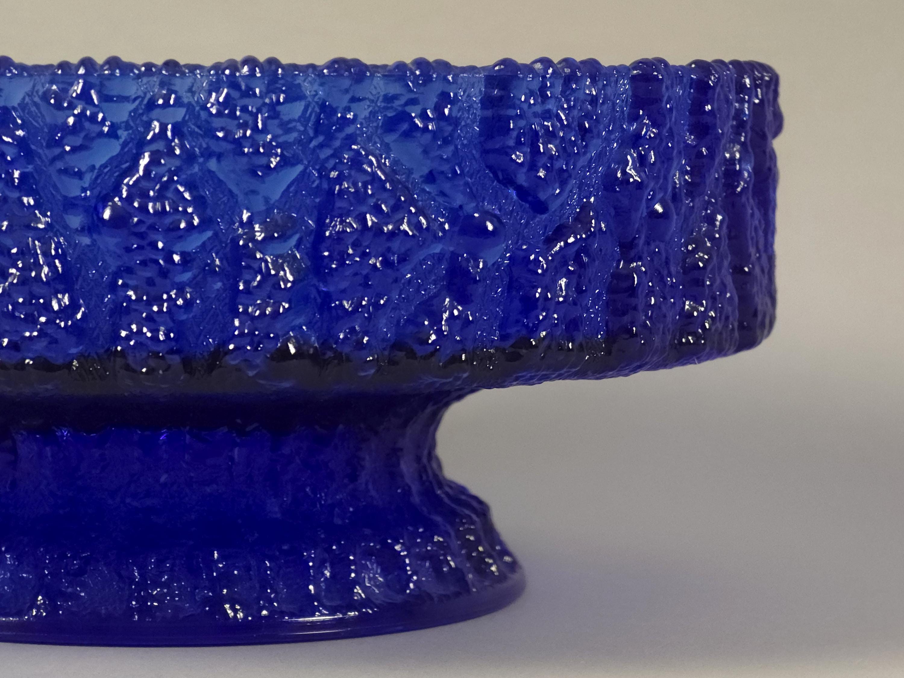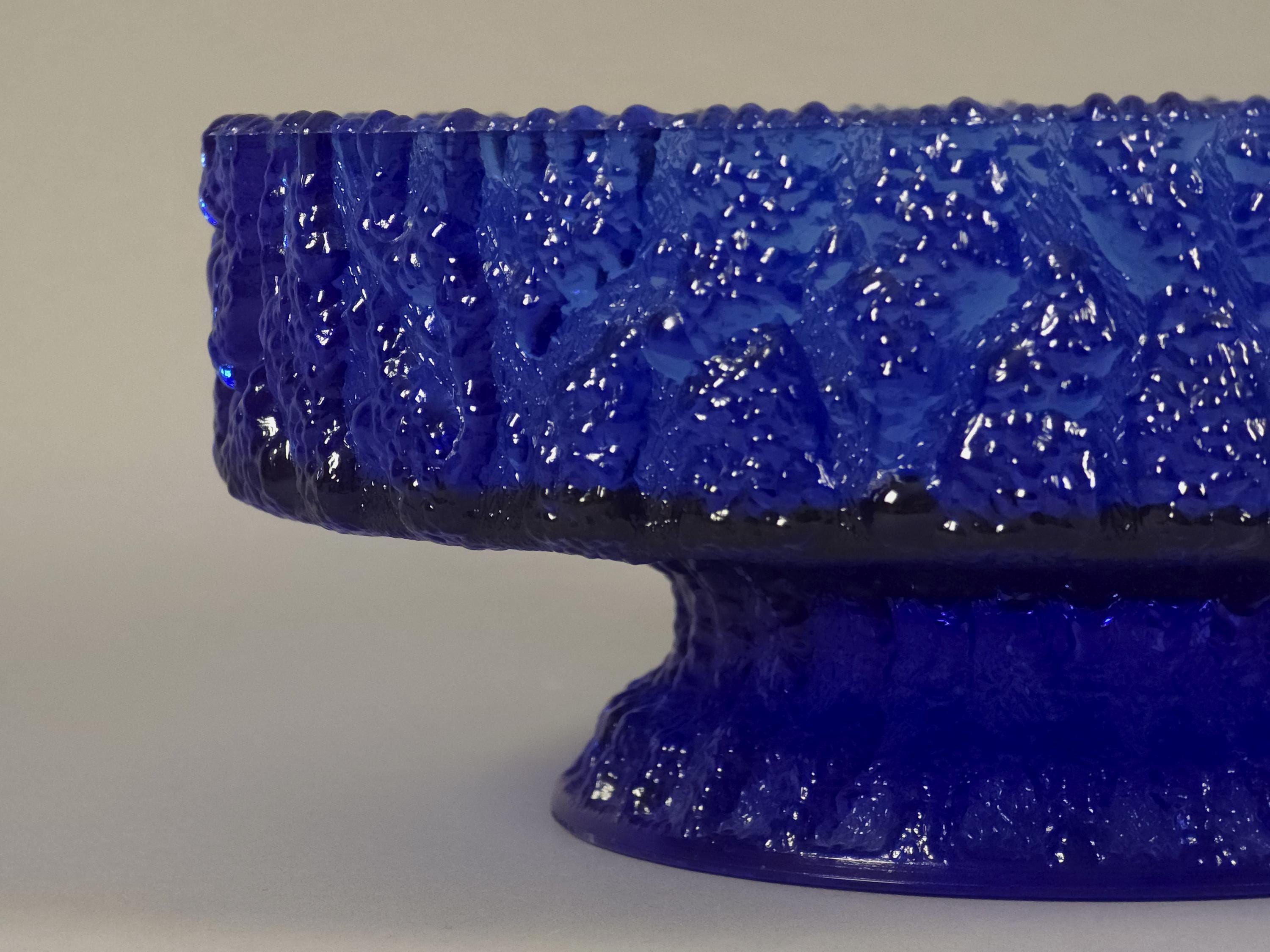Vintage 1960s Kingfisher-Blue 'Bark' glass bowl by Geoffrey Baxter for Whitefriars. These pieces, part of the "Textured Range" designed by Geoffrey Baxter in the 1960s and 70s, feature a distinctive, brutalist tree bark-inspired texture.