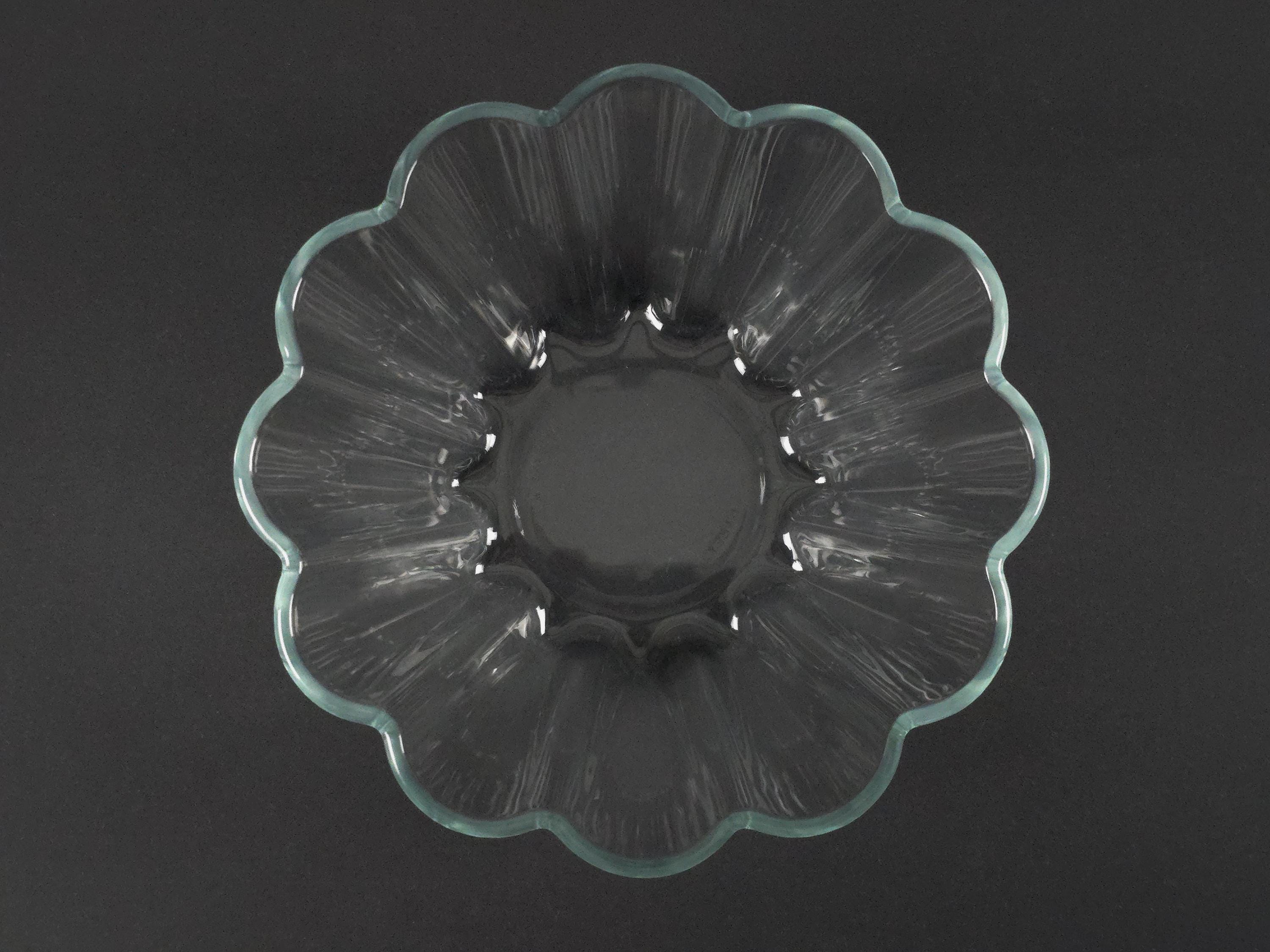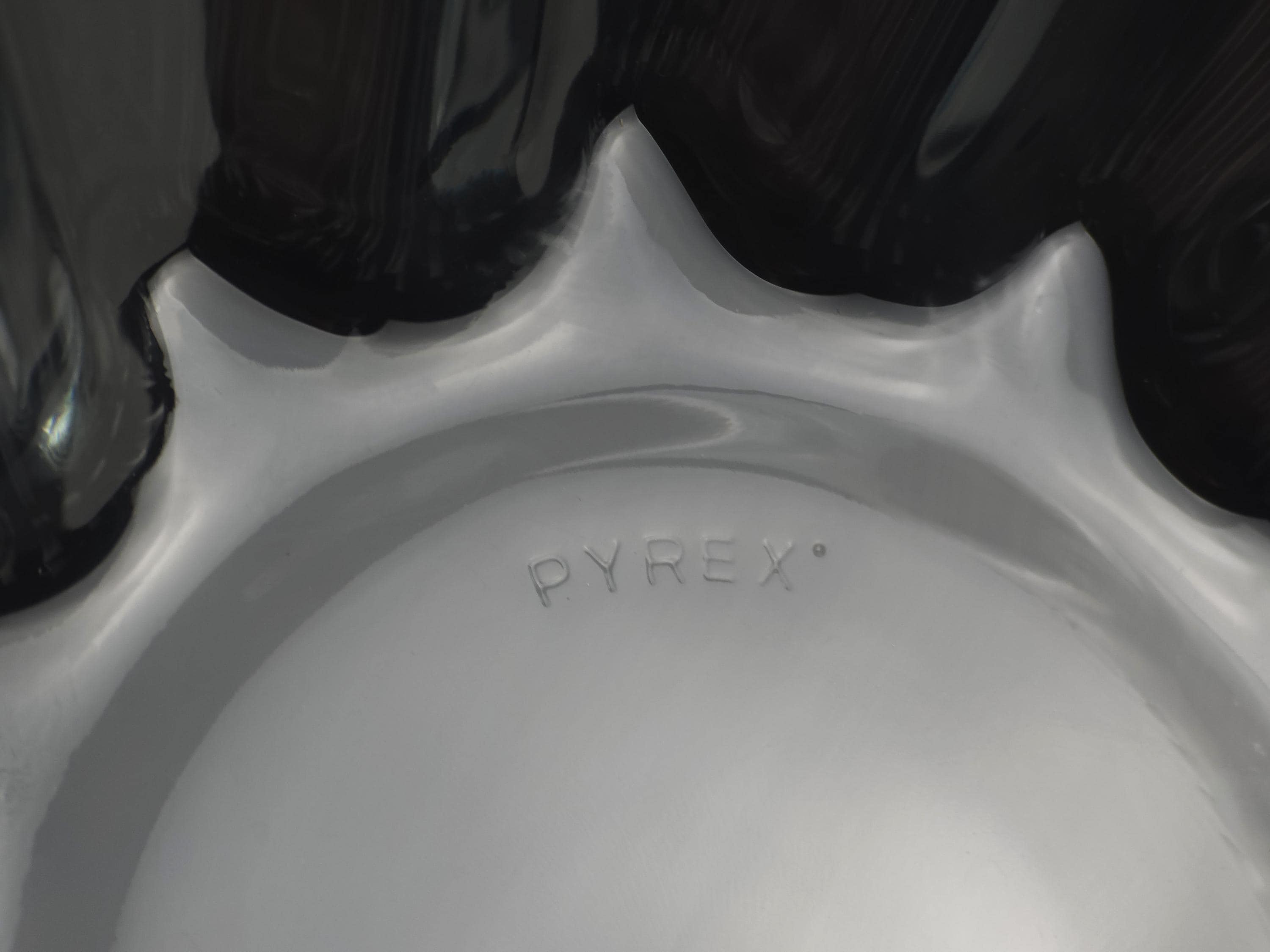 Vintage 1980s Pyrex 824 glass bowl with a distinct scalloped or 'ruffled' rim.
