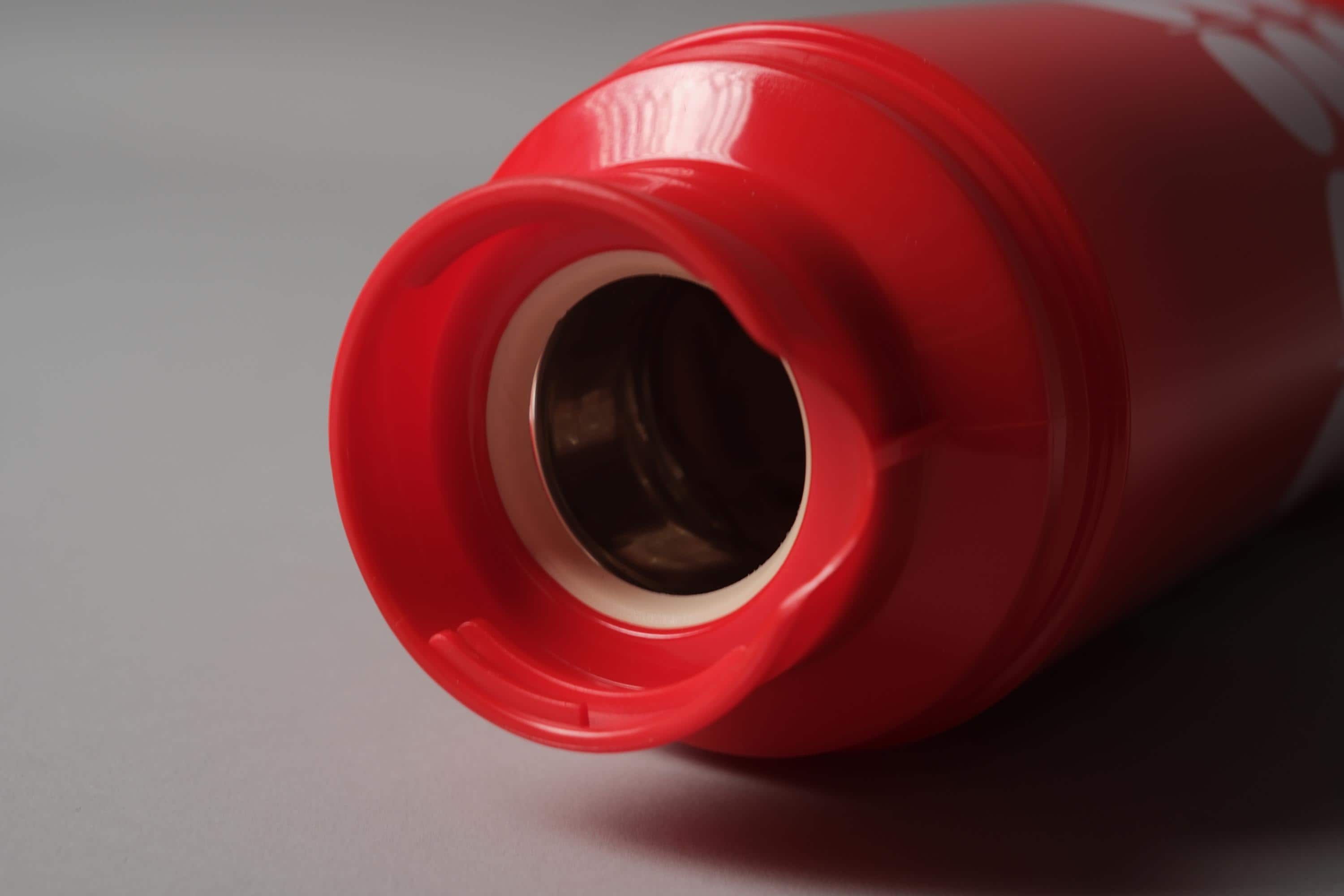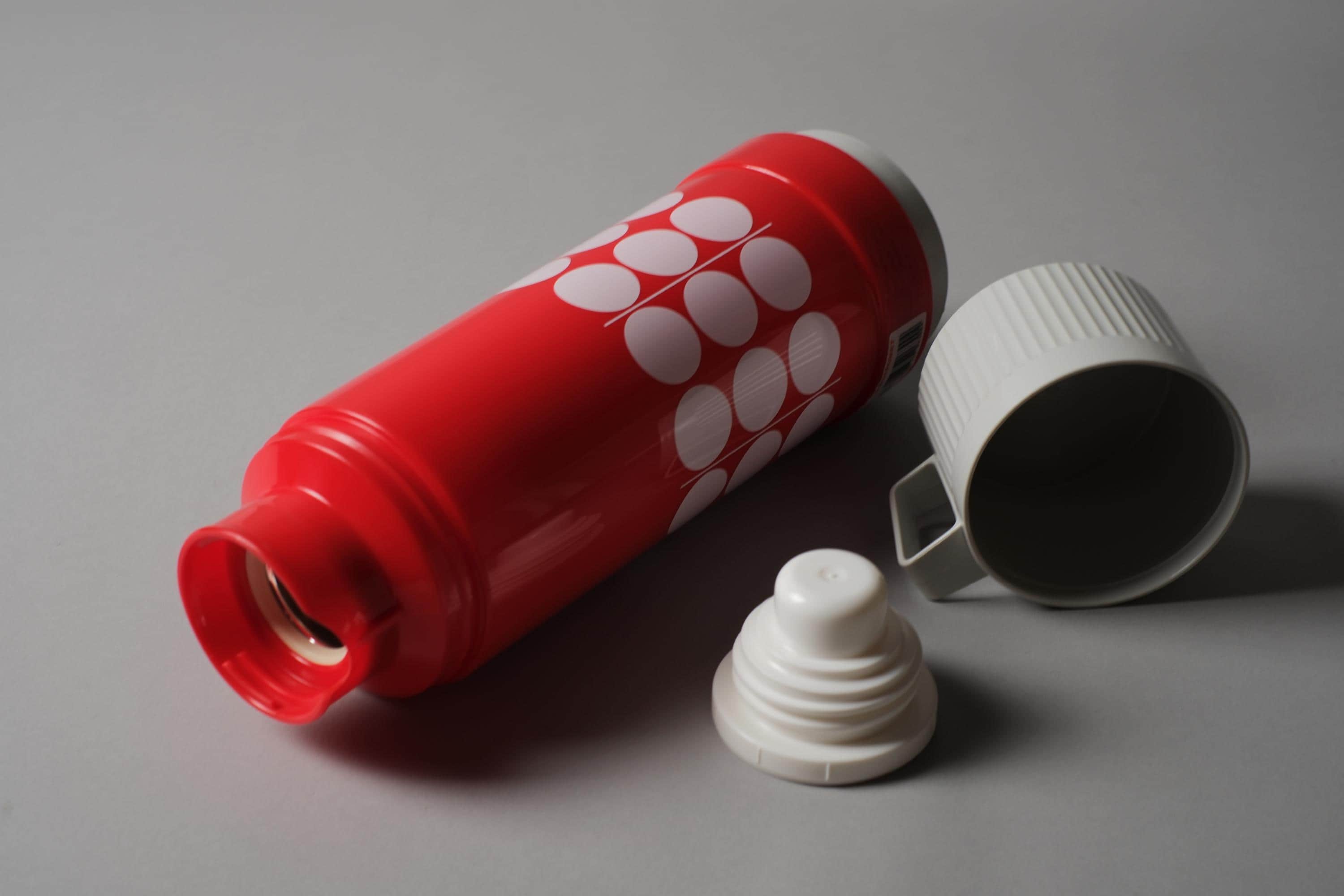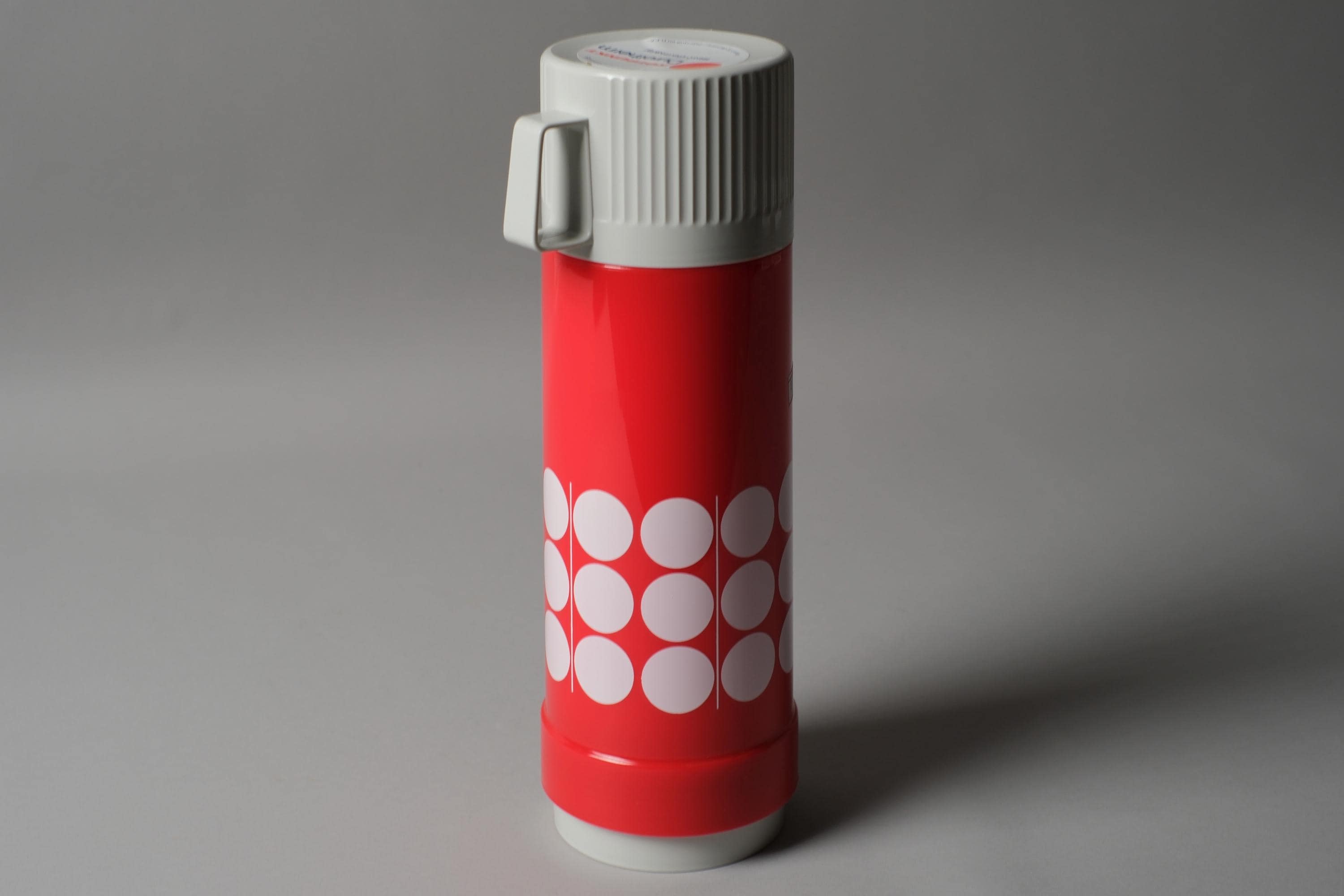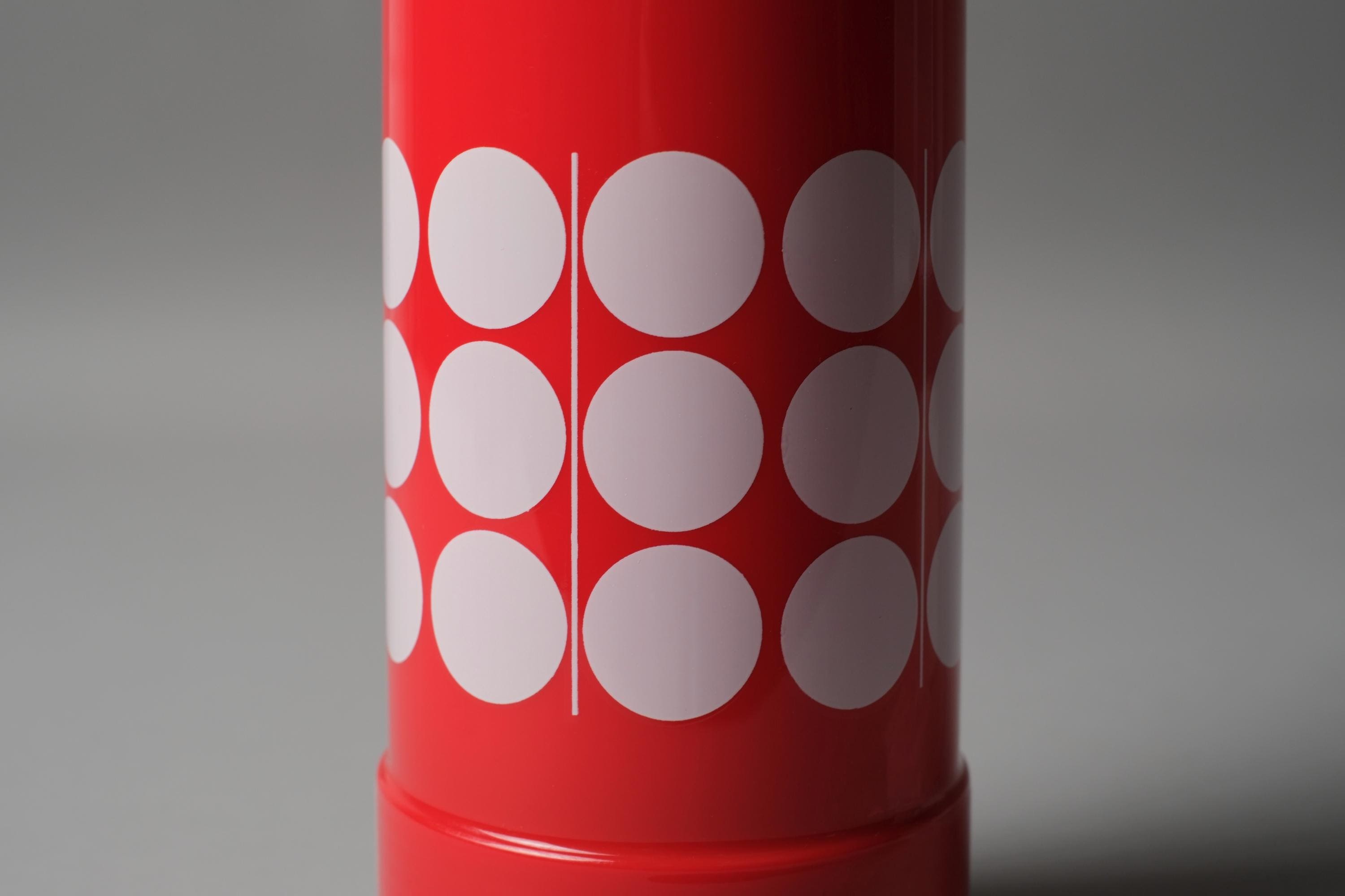 Vintage Space Age vacuum flask by Rotpunkt Dr Zimmermann, West Germany, new old stock with original user manual, the iconic polka dot pattern on red ABS as crisp and immediate as the day it left the factory.