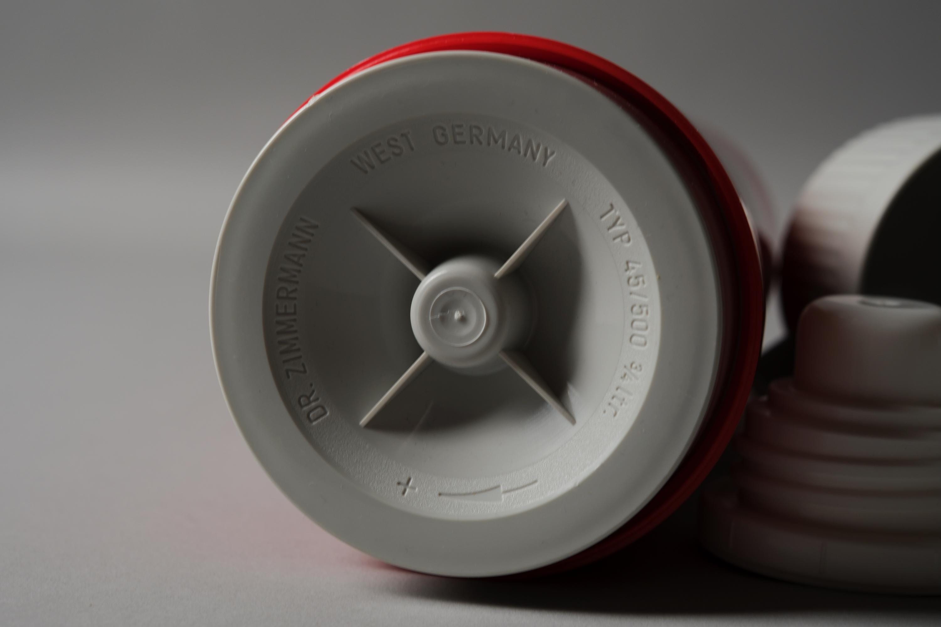 Rotpunkt's vacuum flasks are among the most graphically confident functional objects of the 1970s, the white polka dot grid on signal red ABS a design language that sits as comfortably in a design collection as it does on a kitchen shelf. Dr Zimmermann's West German production is consistently well-made, the double-wall vacuum construction and tight-sealing lid as functional today as when new.
