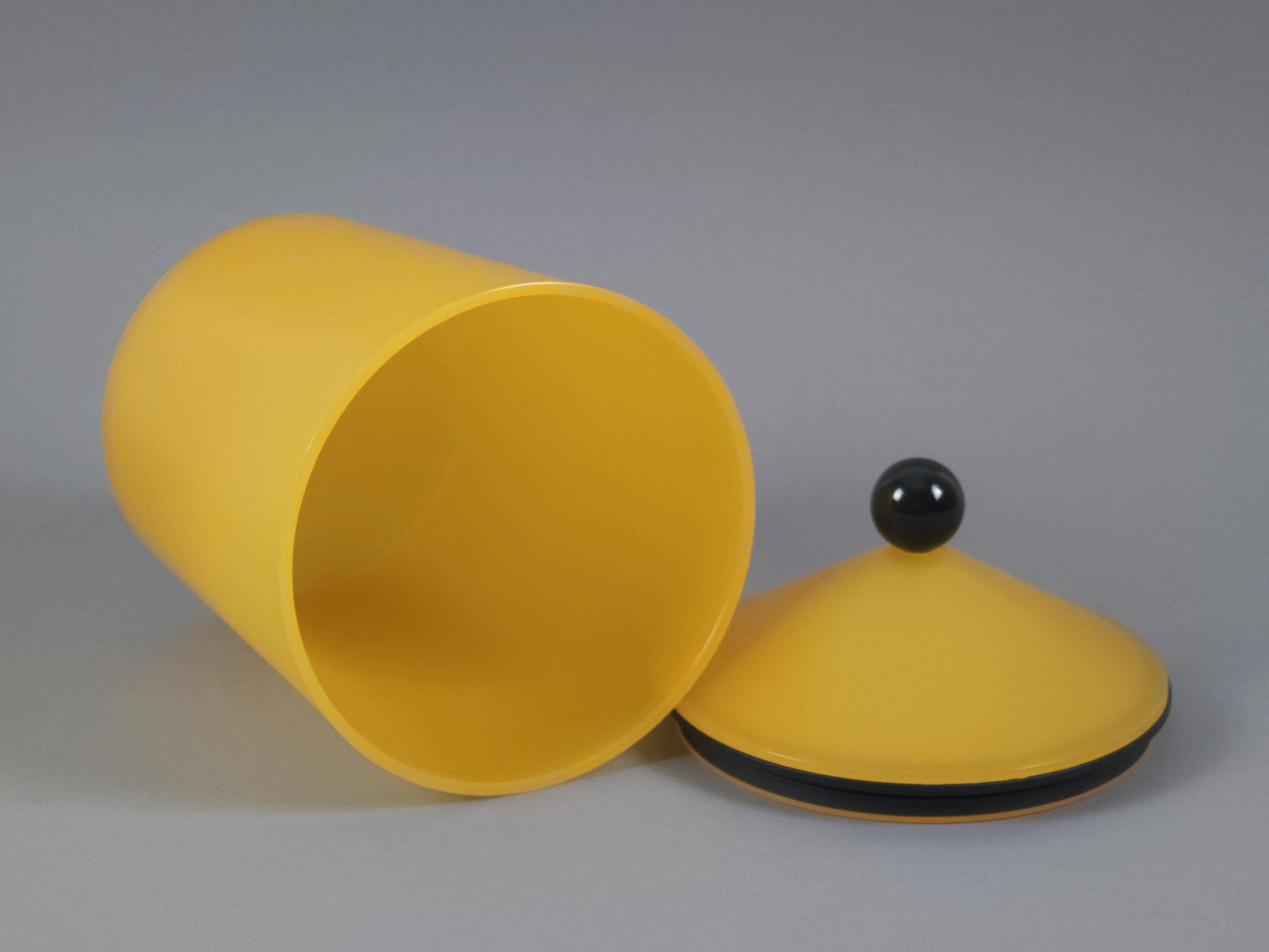 Vintage 1980s postmodern airtight canister in yellow plastic by Mepal-Rosti. Designed for airtight food storage, suitable for items like biscuits, coffee, or tea. The lid provides a press-and-seal closure.