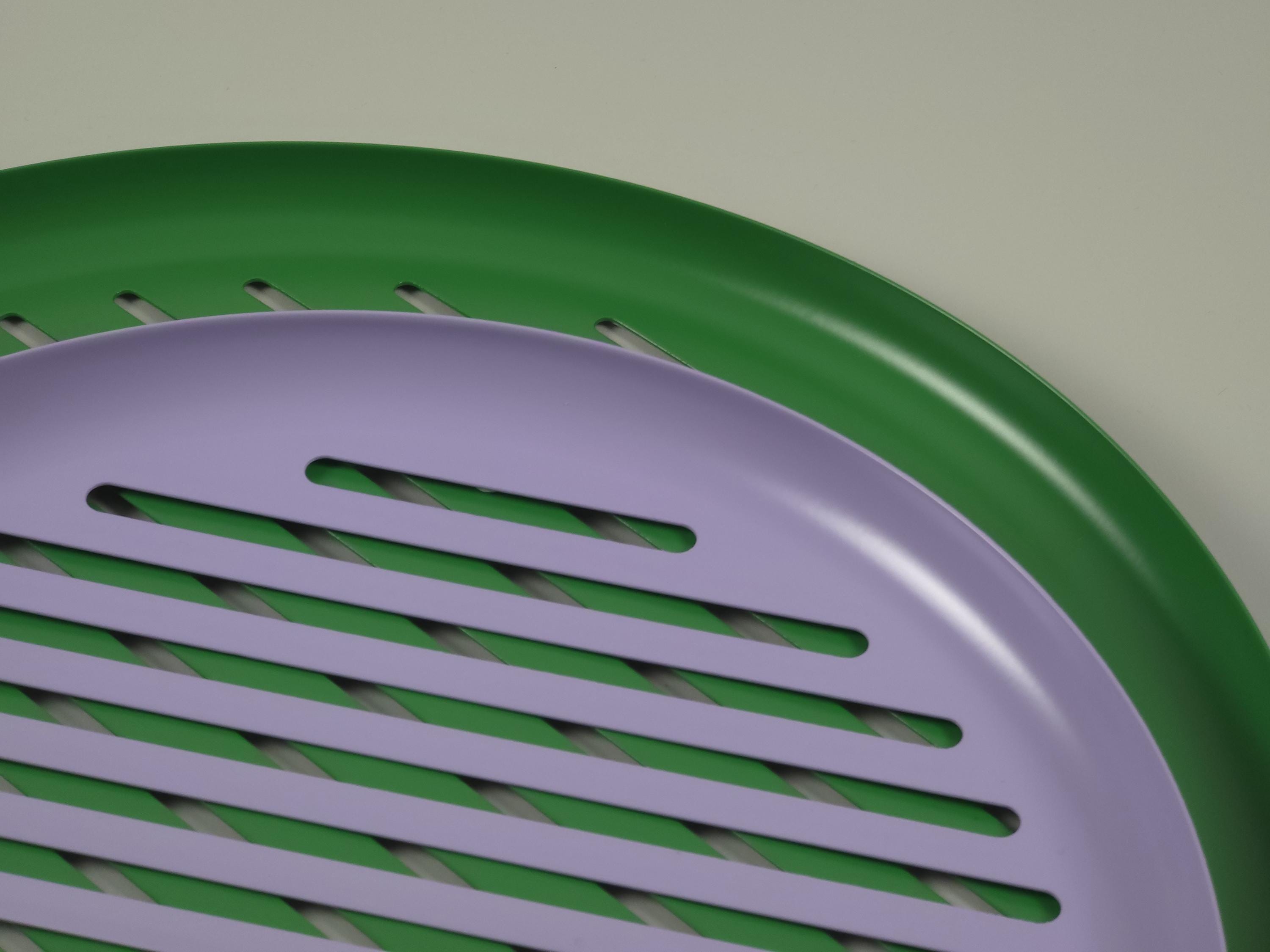 New in box pair of TESAMMANS trays from a limited-edition IKEA collection, designed in collaboration with the Dutch studio Raw Color. The set includes one green and one lilac round steel serving trays. The set features a unique slatted/striped base design that creates a beautiful graphic effect.