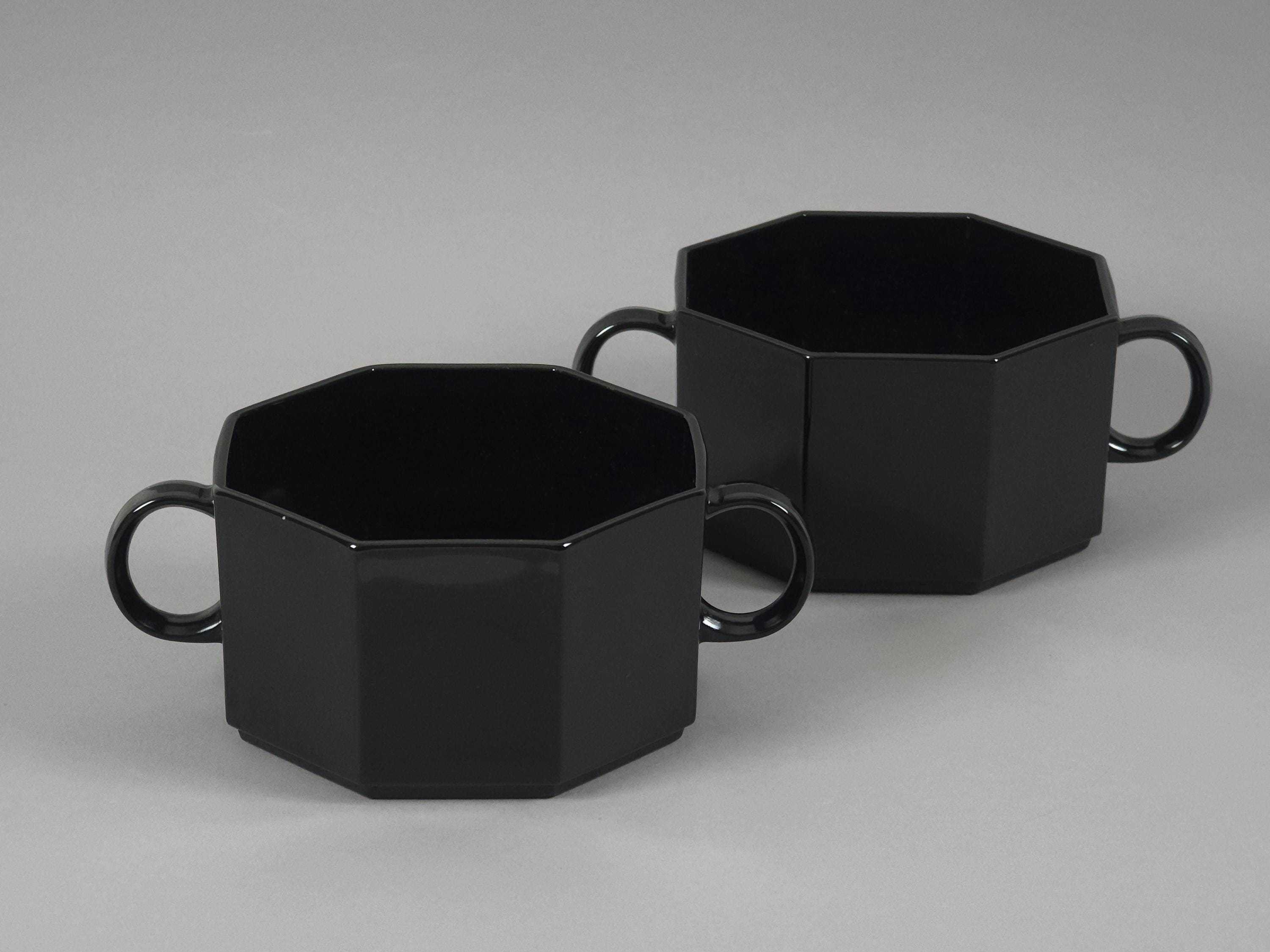 Vintage 1980s postmodern pair of black ceramic octagonal bowls 'Octime' by Arcoroc France. The "Octime" line is famous for its crisp, architectural lines. These bowls feature the signature 8-sided (octagonal) shape crafted from durable, tempered opalware.
