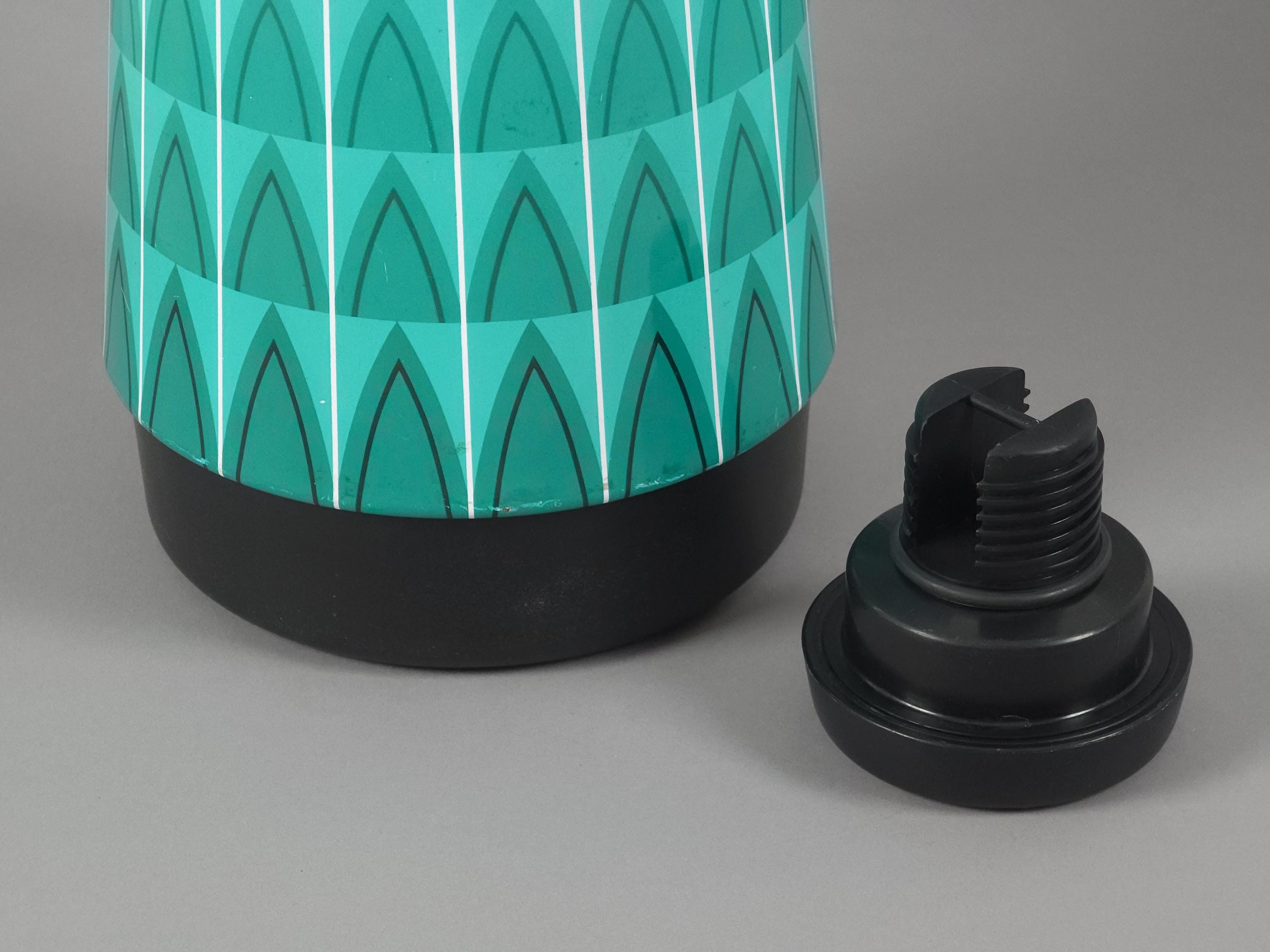 Vintage 1970s thermos flask by Zojirushi "Elephant Brand". It is decorated with a sophisticated, multi-tonal teal and turquoise geometric pattern that creates a beautiful gradient effect
